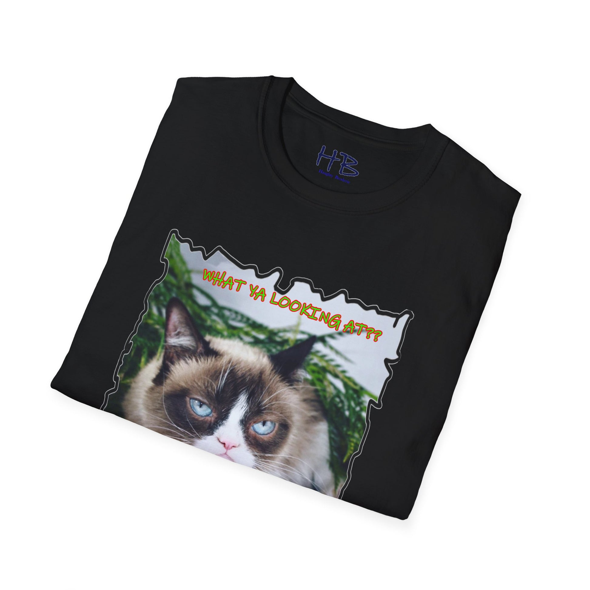 The focal point of this tee shirt is the enchanting pair of azure eyes, which effortlessly draw attention and spark intrigue. The cat's fur, meticulously illustrated with a myriad of subtle shades, adds depth and texture to the design. The accompanying caption, boldly proclaiming "What ya looking at??" in a playful font, serves as a lighthearted invitation to engage with the wearer.