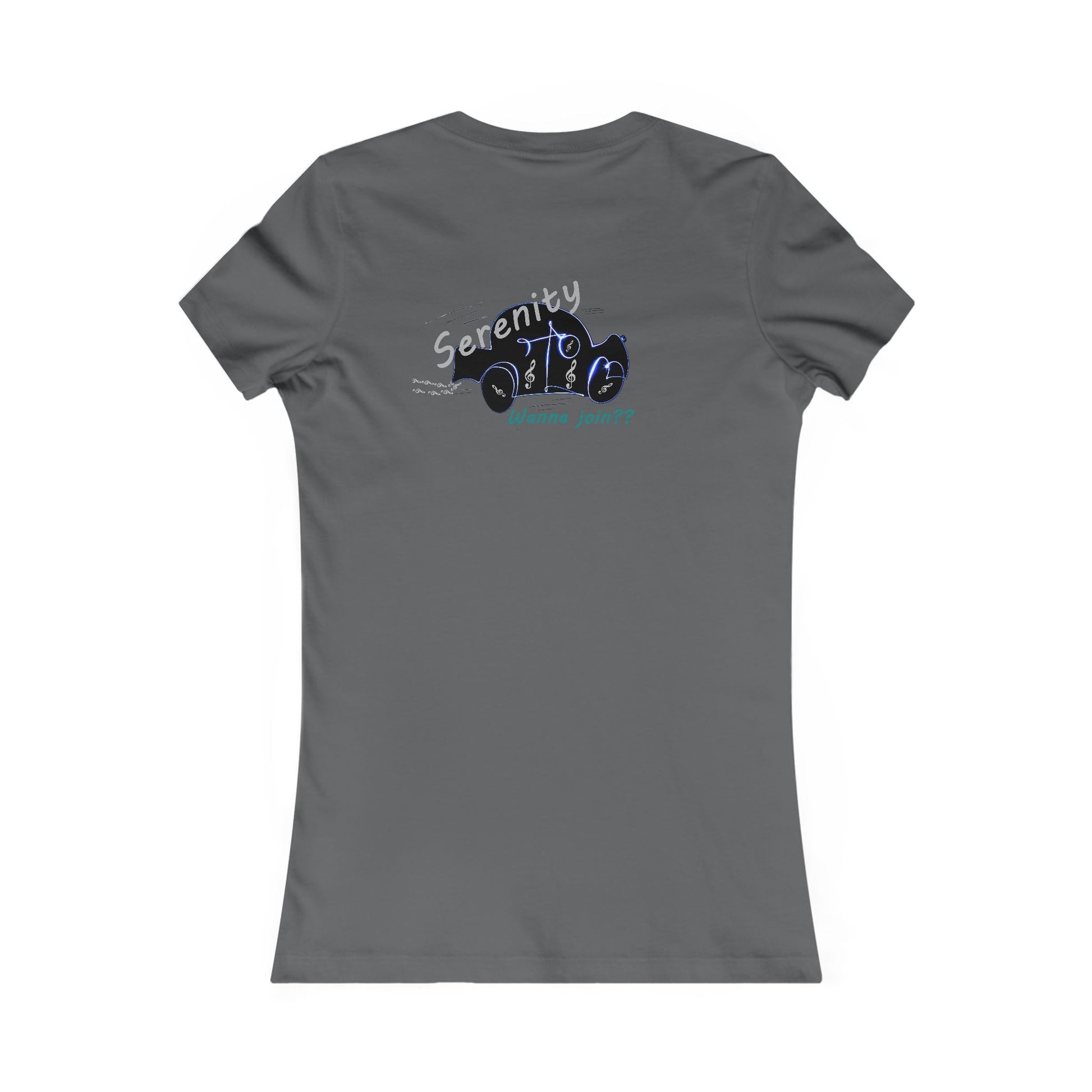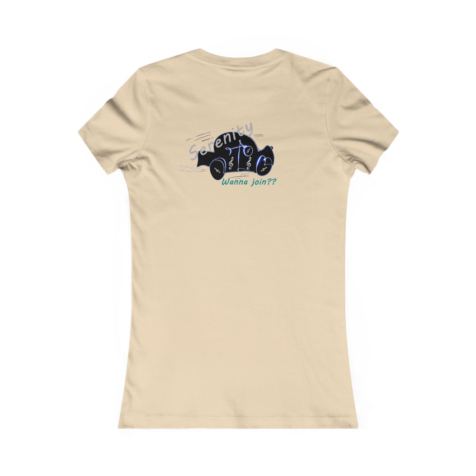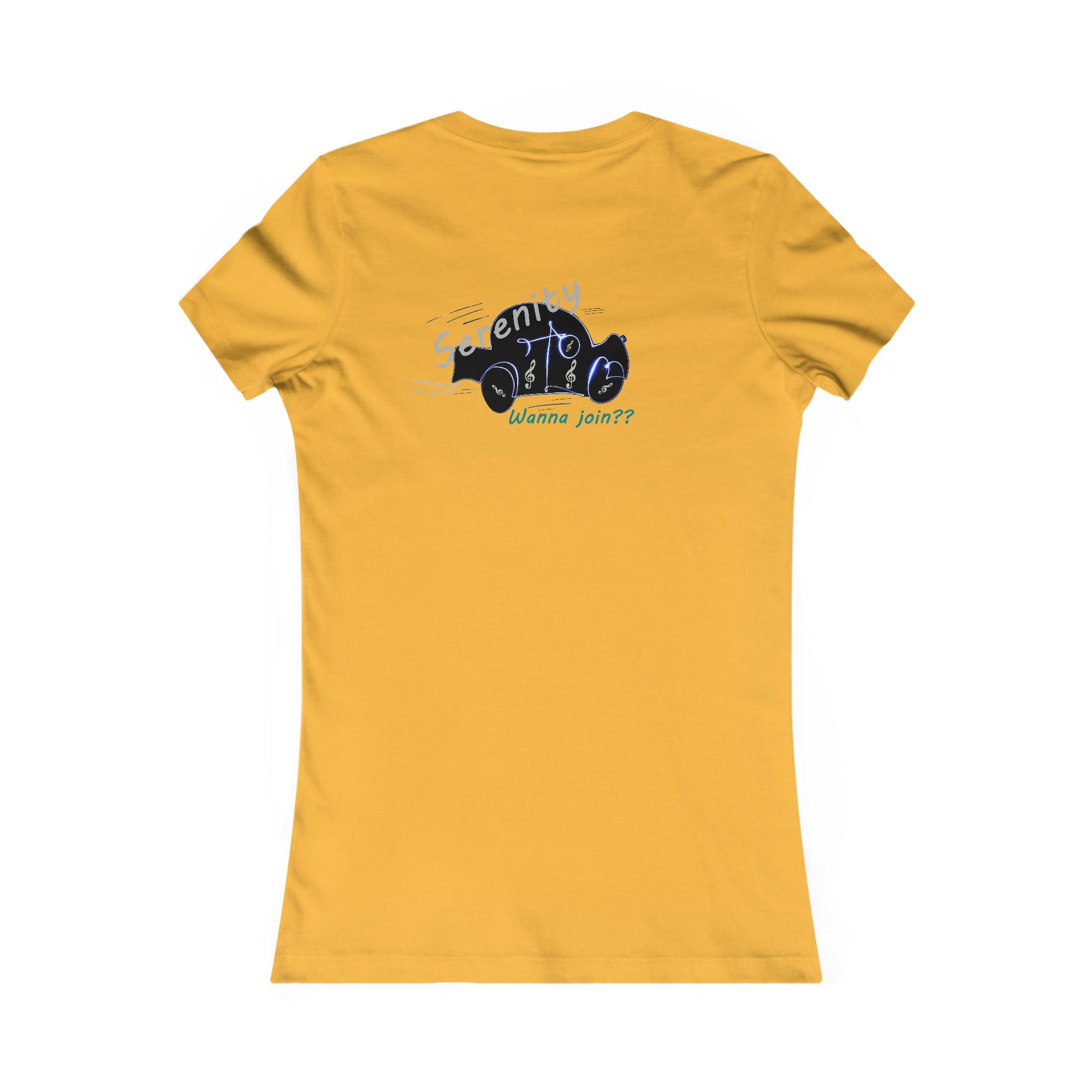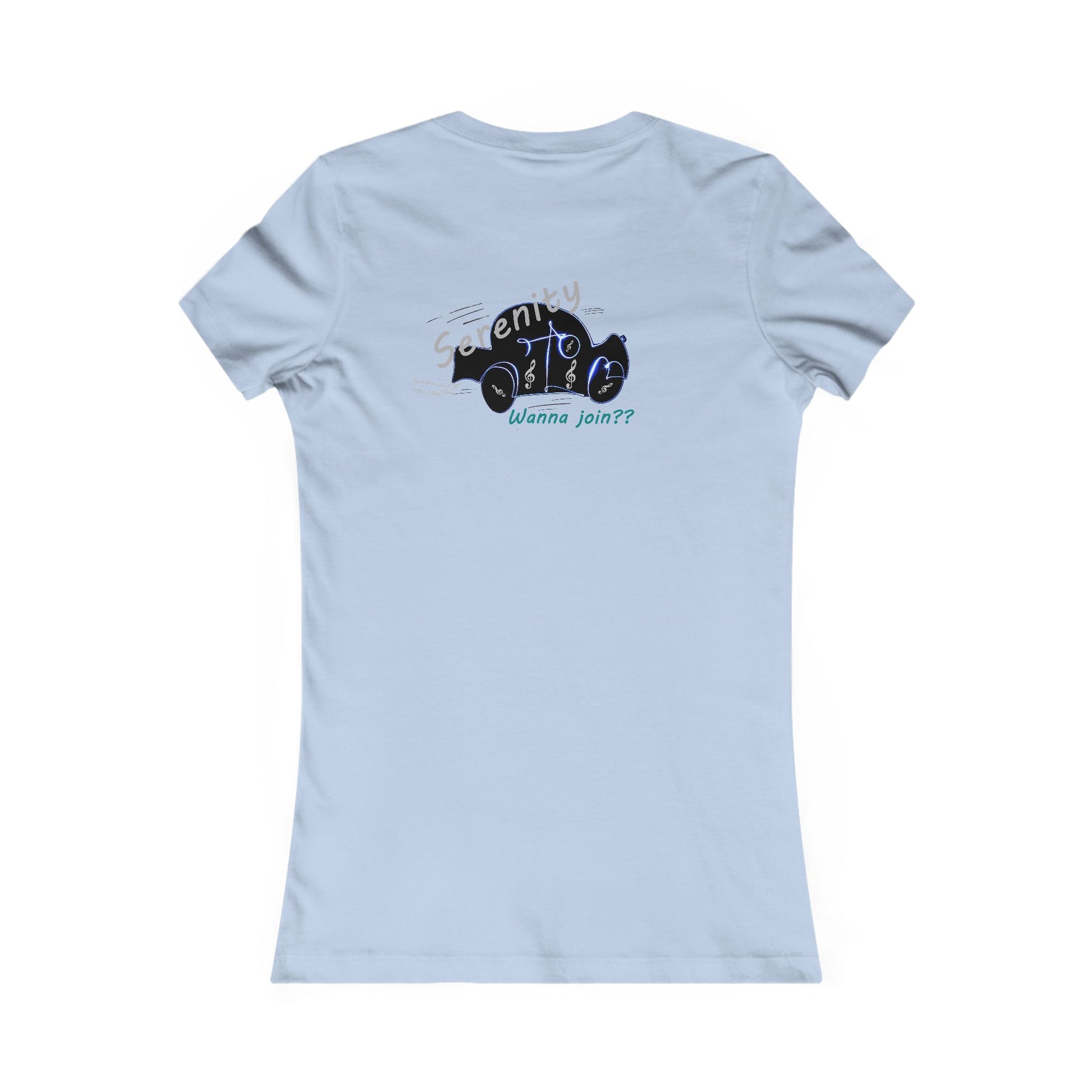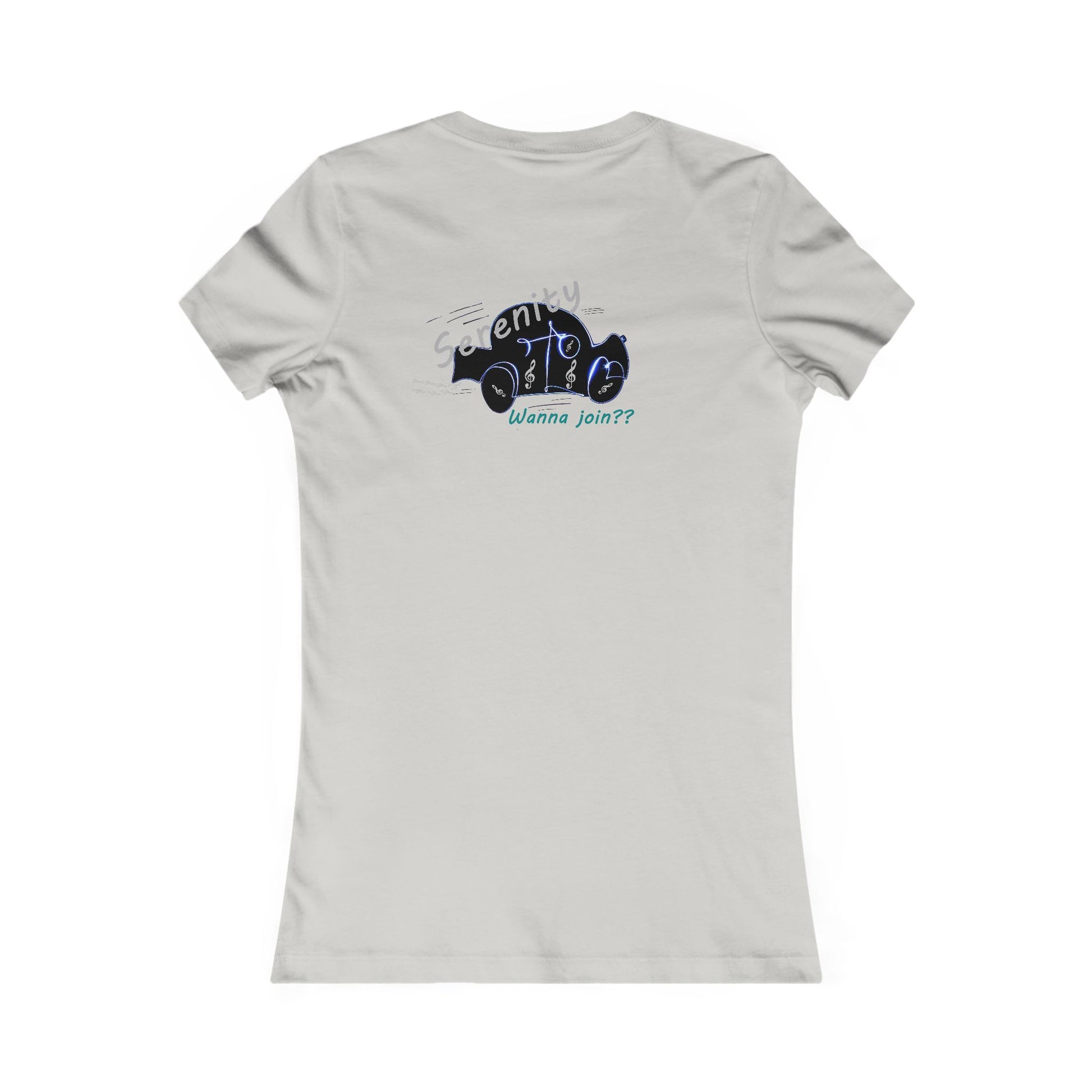The back of the shirt showcases a charming illustration of a car, accompanied by a music key and the word "Serenity". And if you're feeling sociable, the shirt asks the question "Wanna join??".