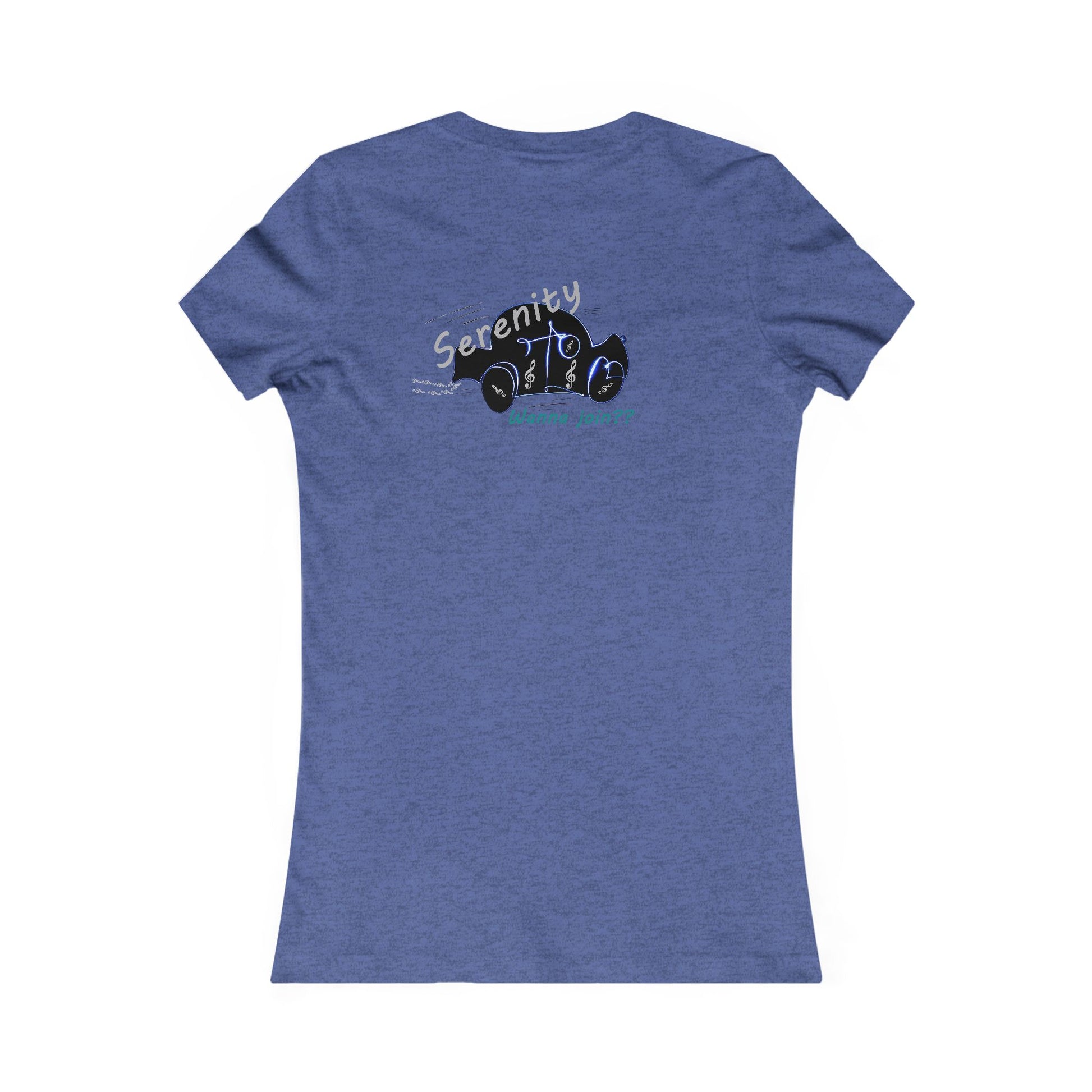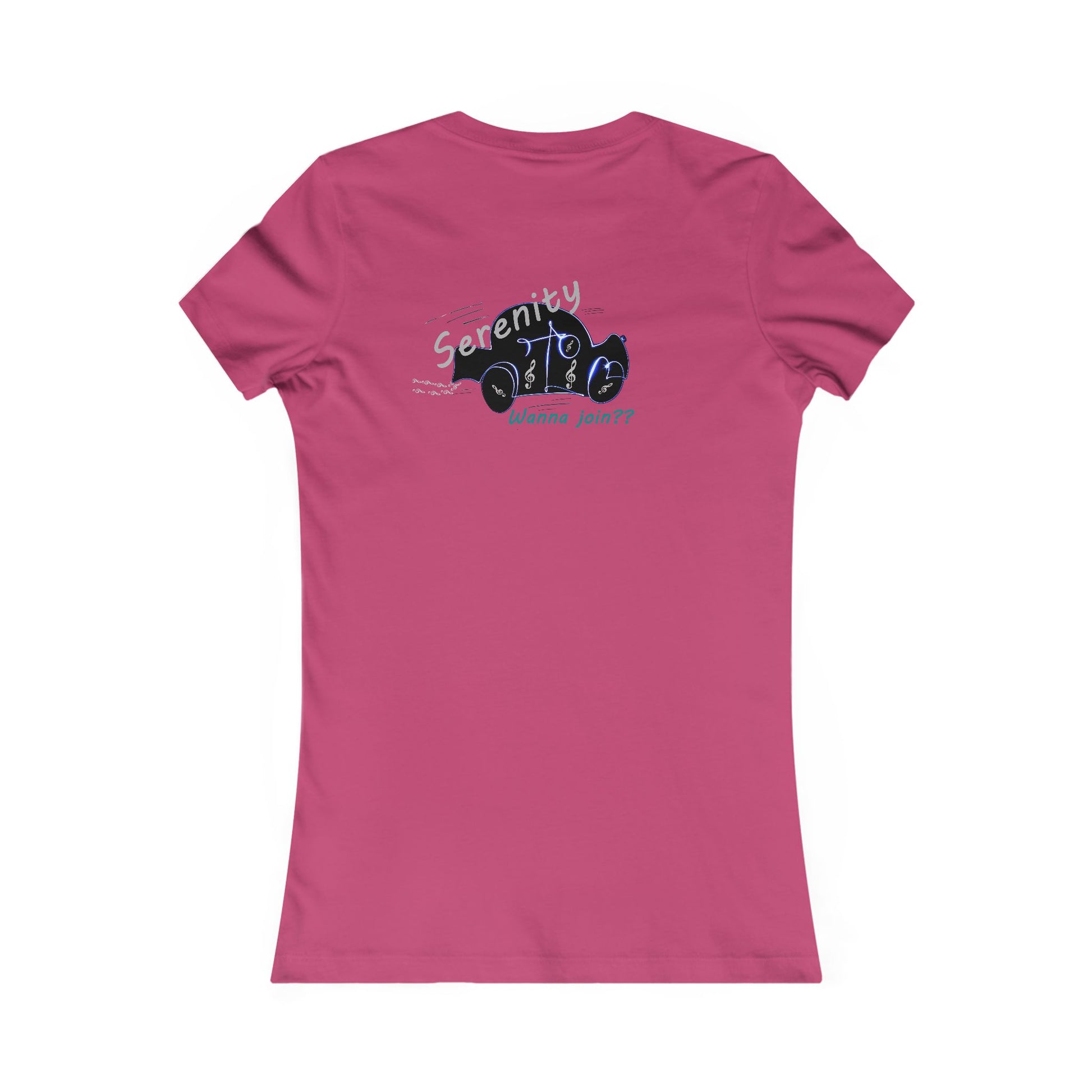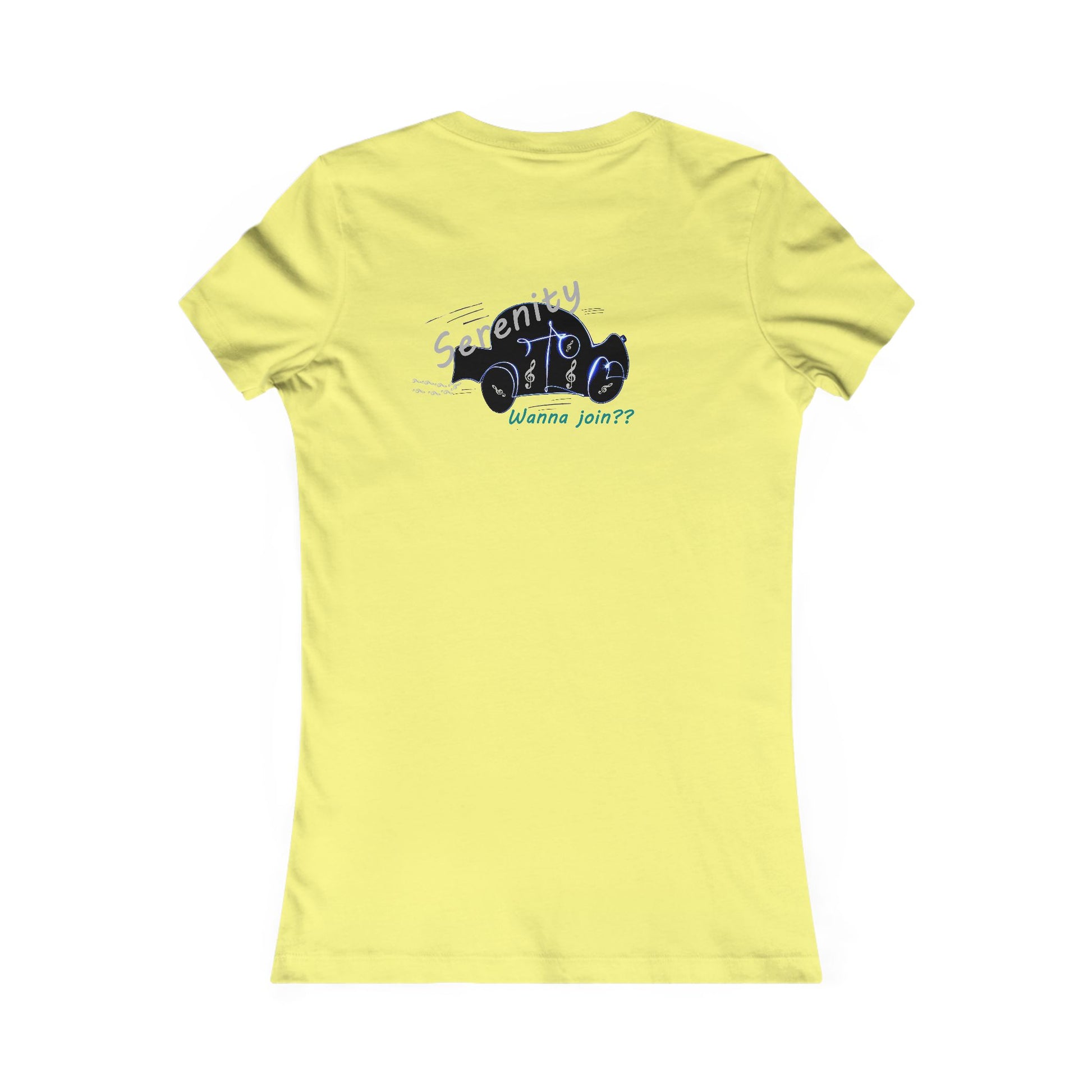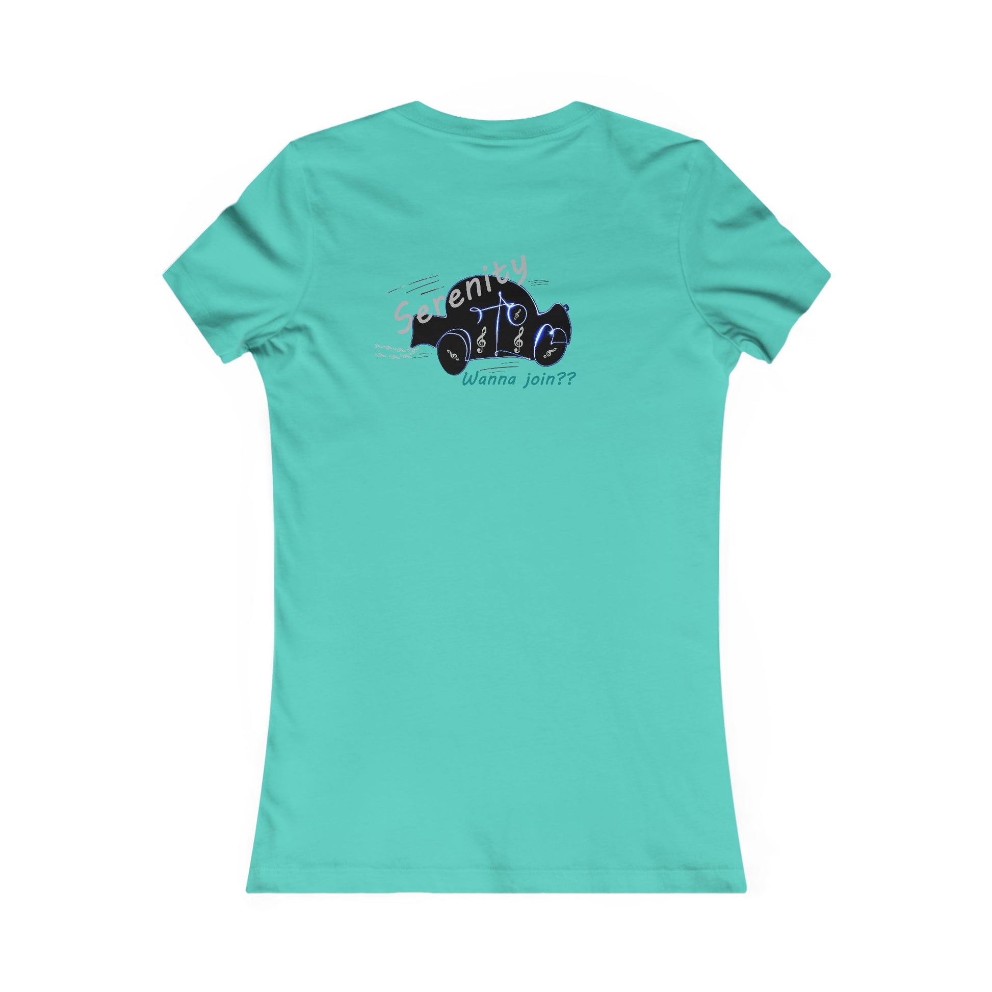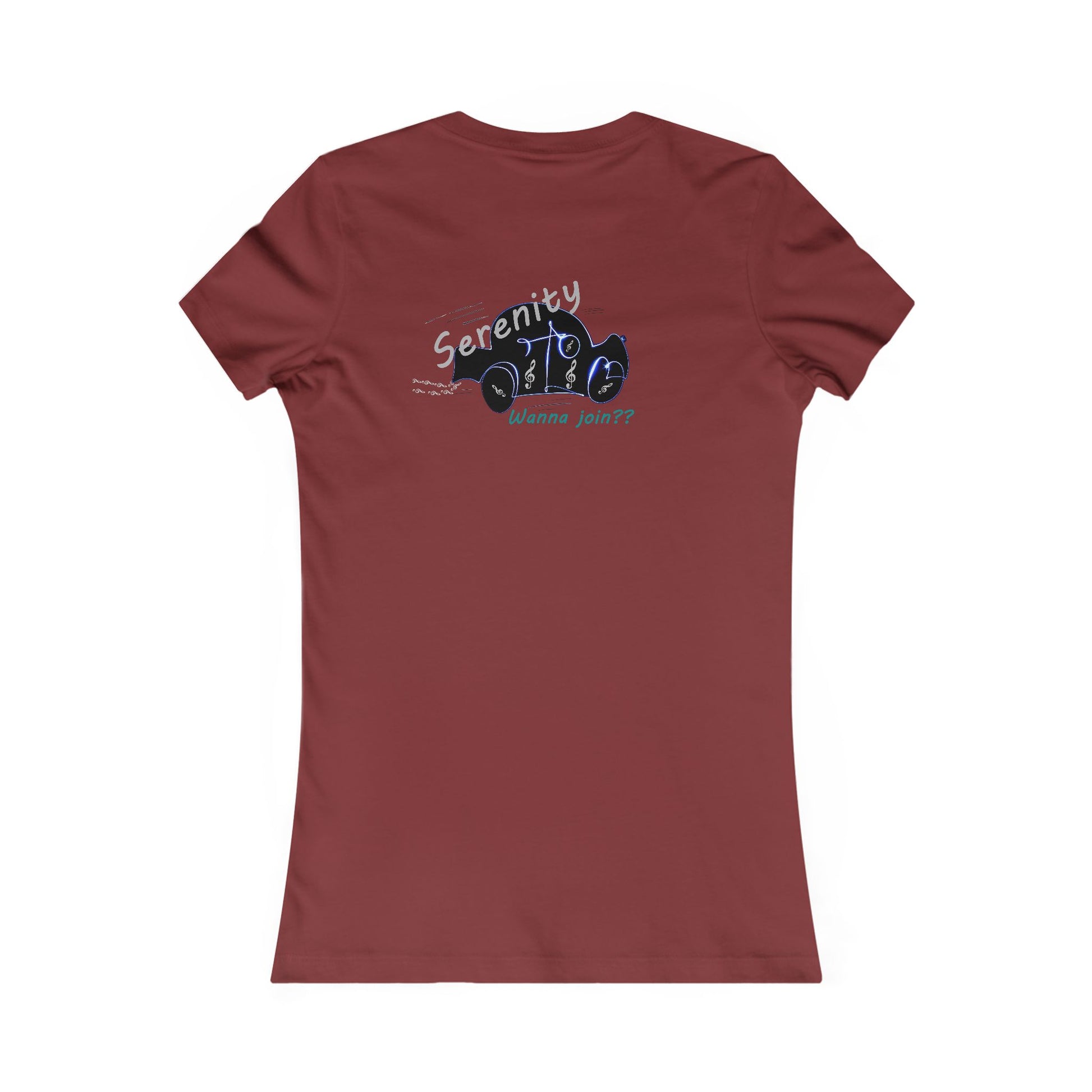 The back of the shirt showcases a charming illustration of a car, accompanied by a music key and the word "Serenity". And if you're feeling sociable, the shirt asks the question "Wanna join??".