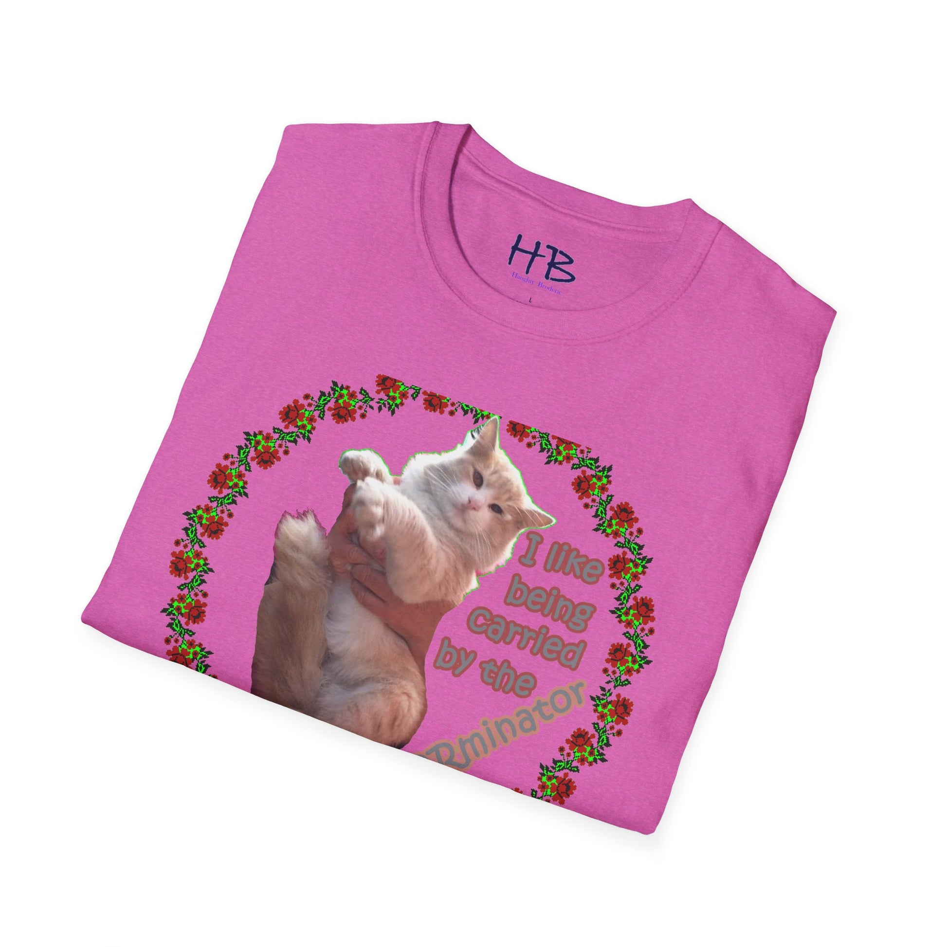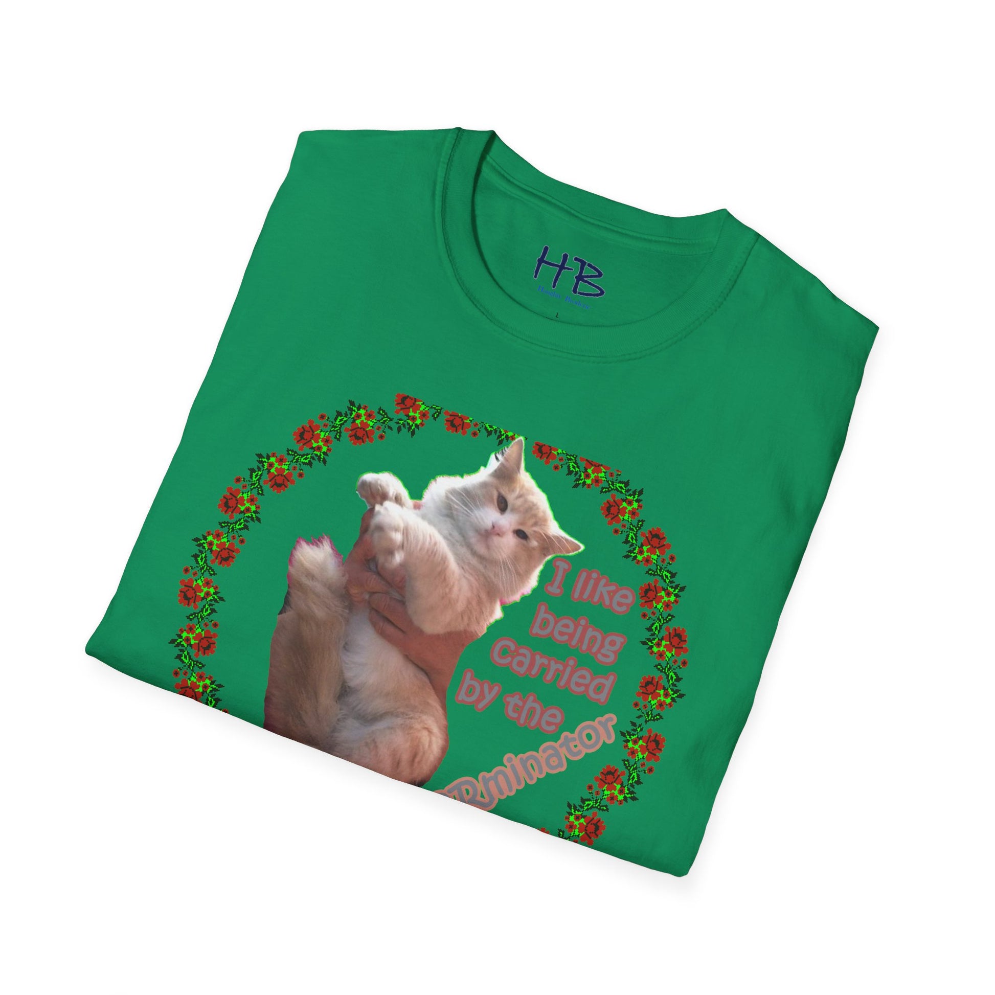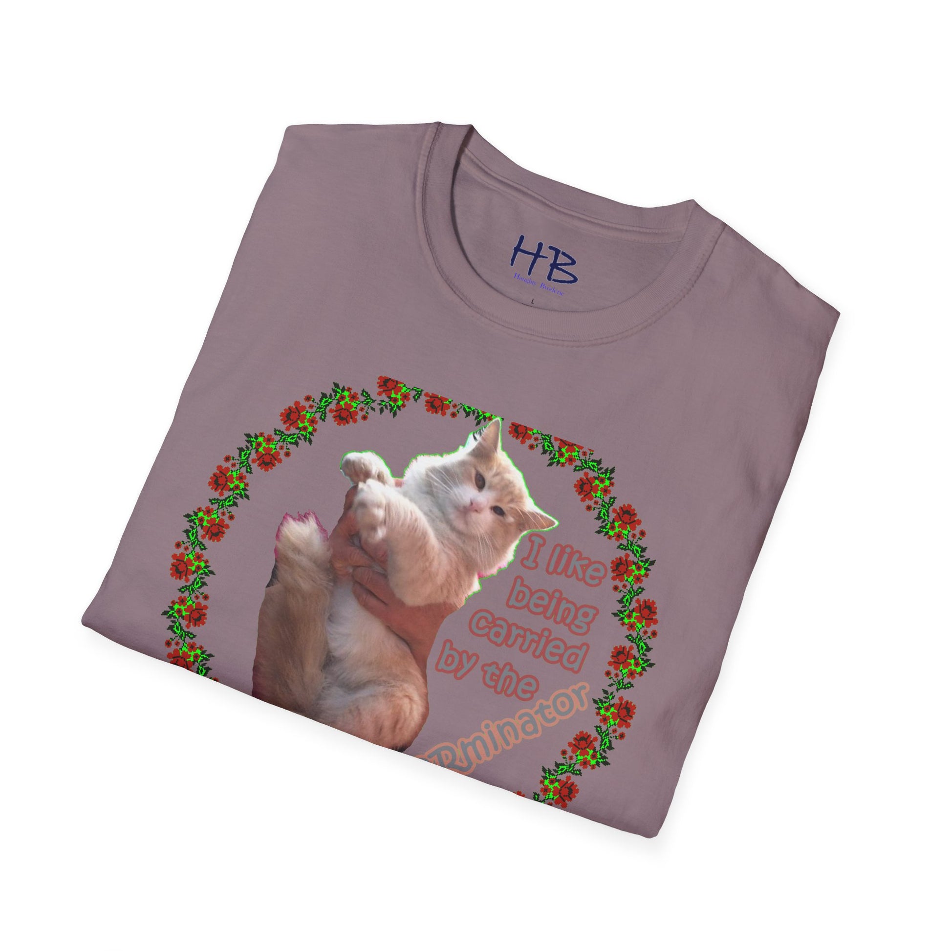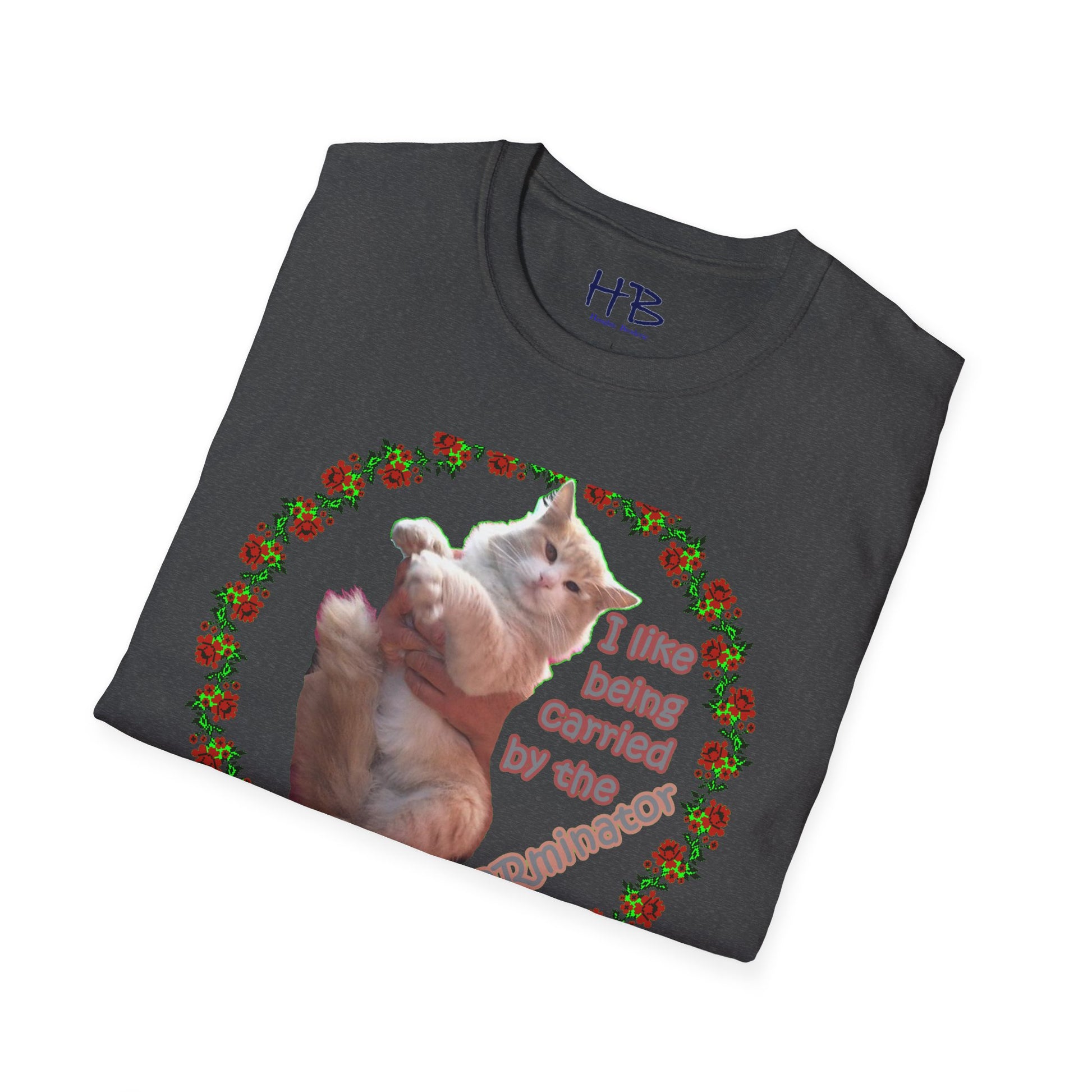 Emblazoned across the tee is the text that boldly proclaims, "I like being carried by the PURRminator." Notice the intentional absence of possessive pronouns—this subtle twist highlights the feline belief that humans are mere objects, existing solely to fulfill their desires and whims.