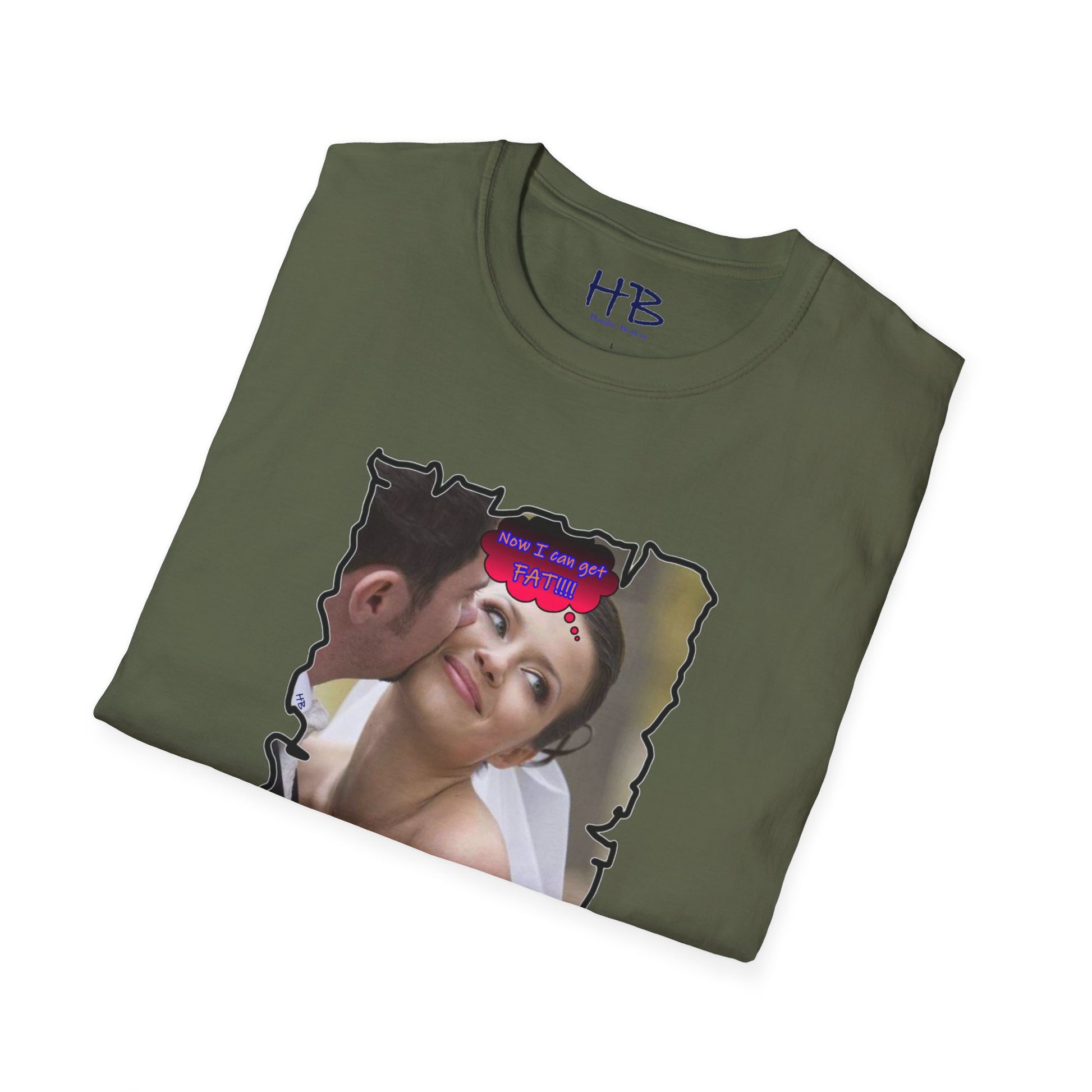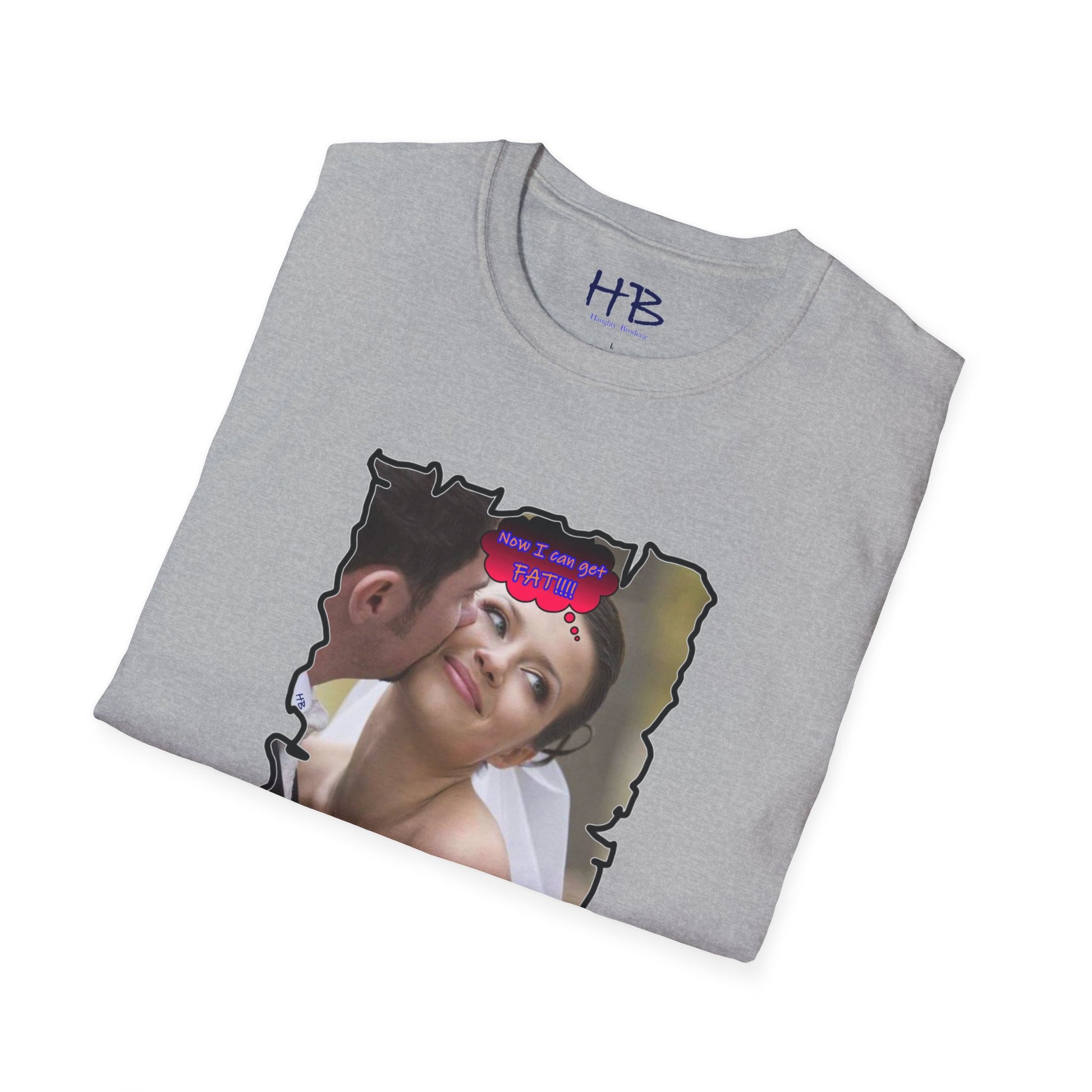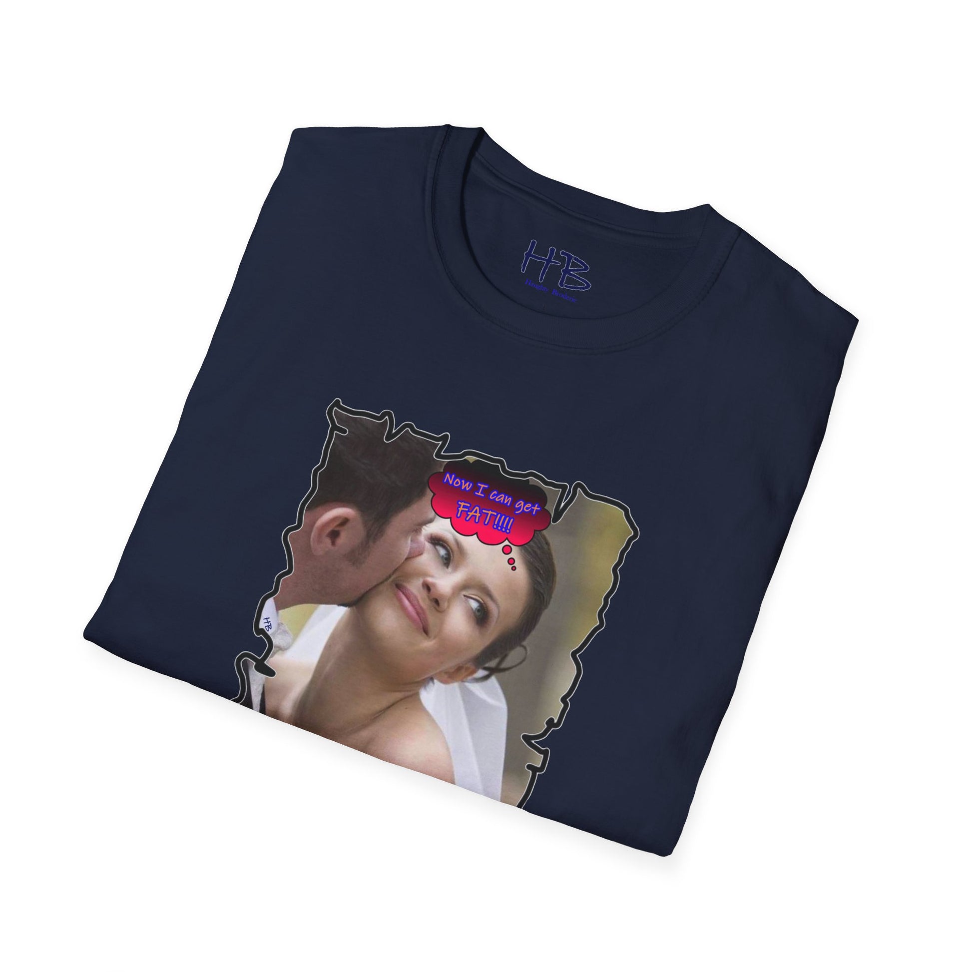 Within the image, you'll find a thought bubble emerging from the wife's heart, bearing the words, "Now I can get FAT!!!!!!" This amusing detail adds a humorous touch to the image, reflecting the inner joy and contentment that comes with finding true love.