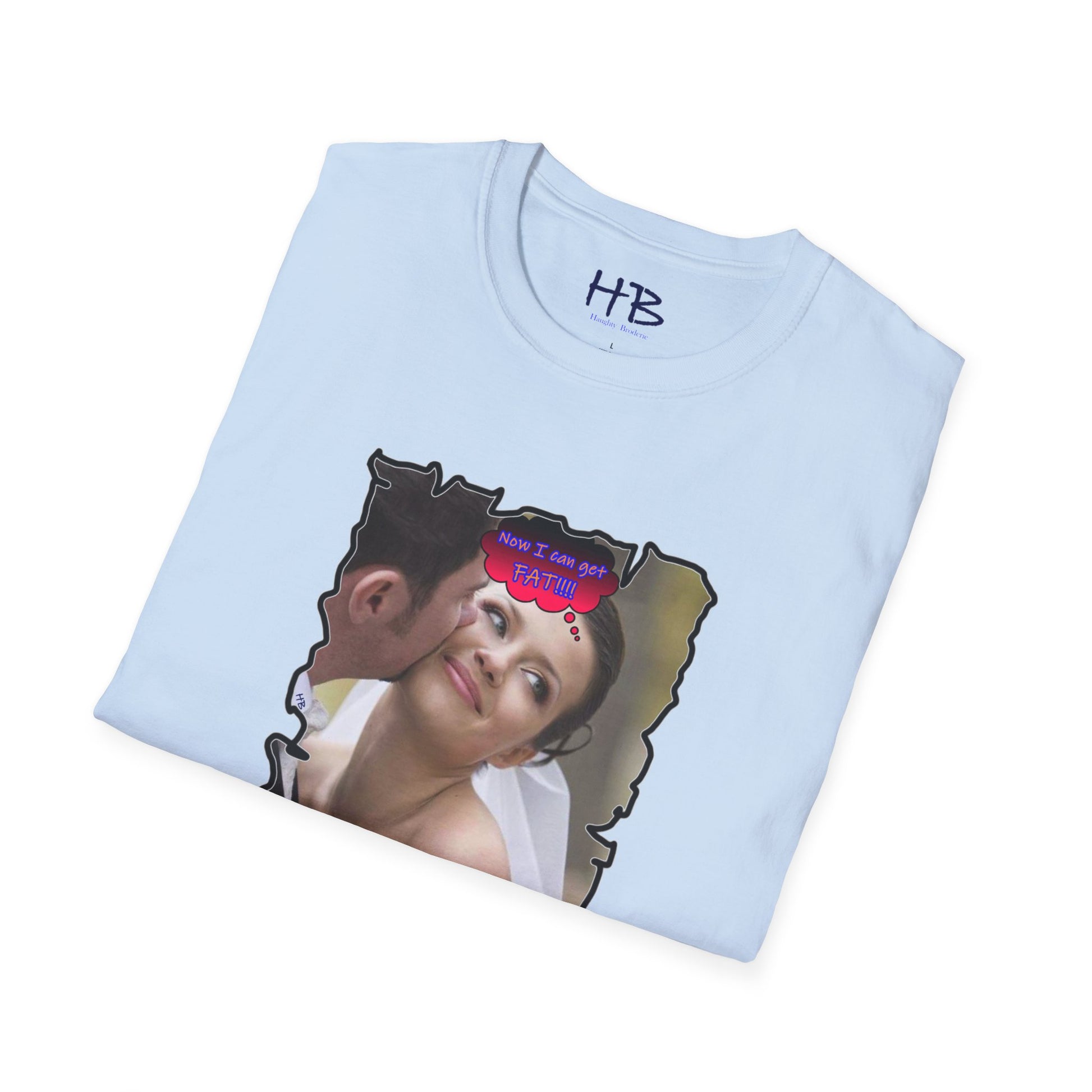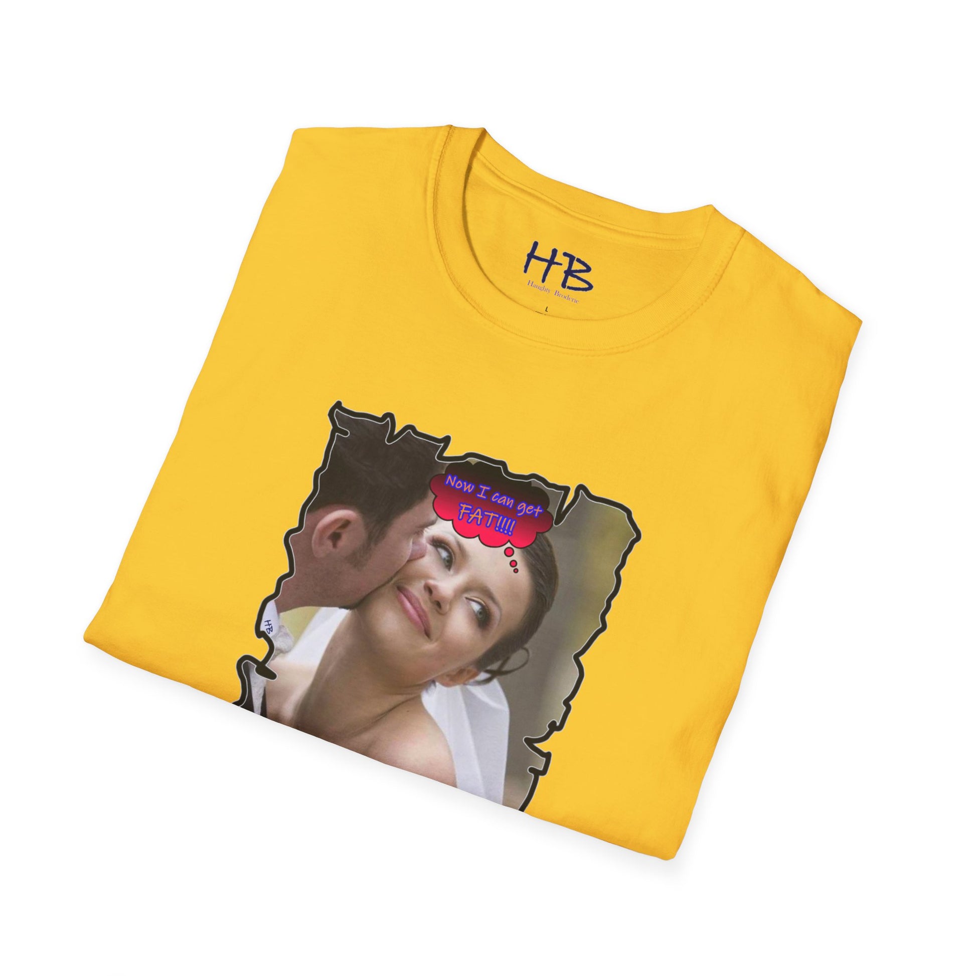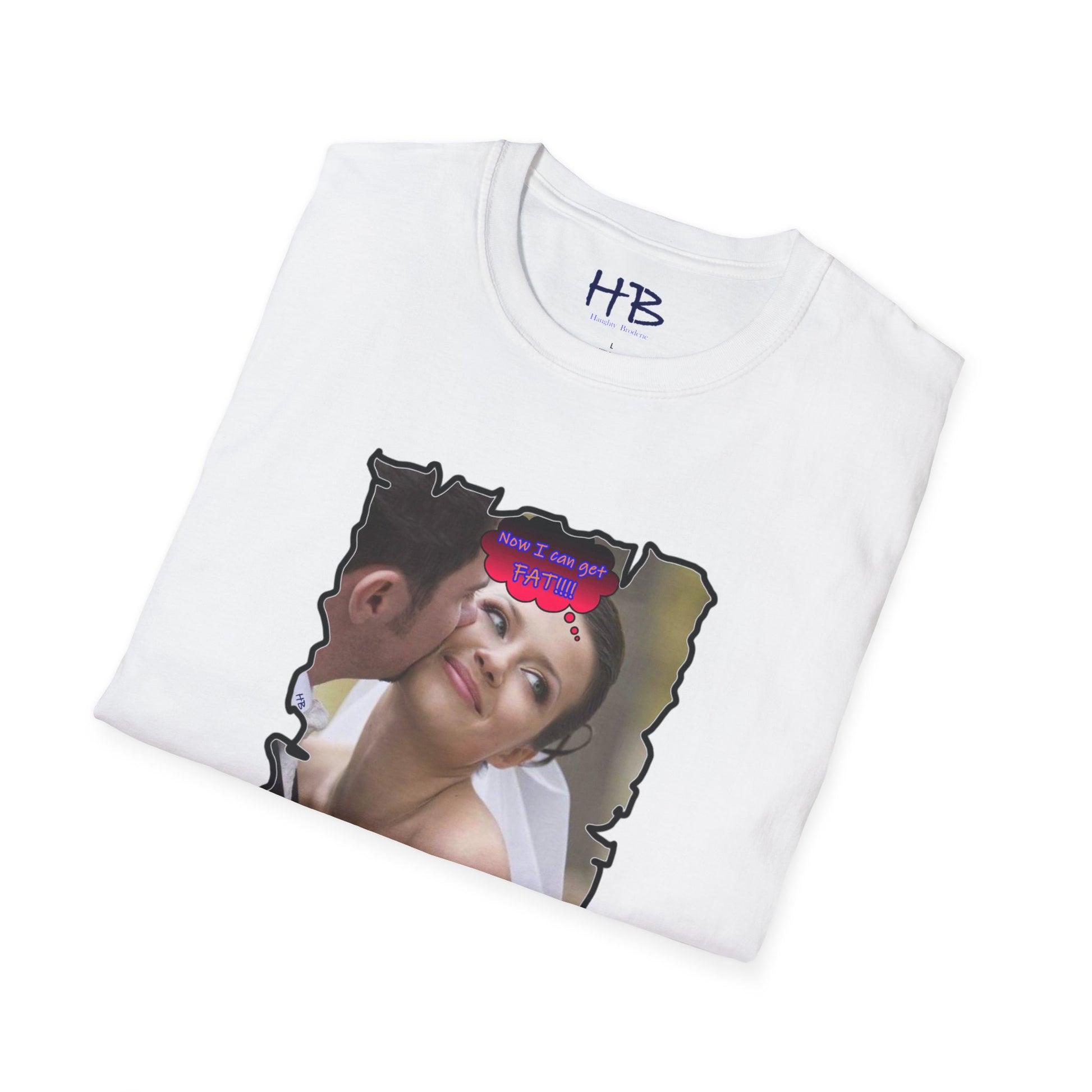 Within the image, you'll find a thought bubble emerging from the wife's heart, bearing the words, "Now I can get FAT!!!!!!" This amusing detail adds a humorous touch to the image, reflecting the inner joy and contentment that comes with finding true love.
