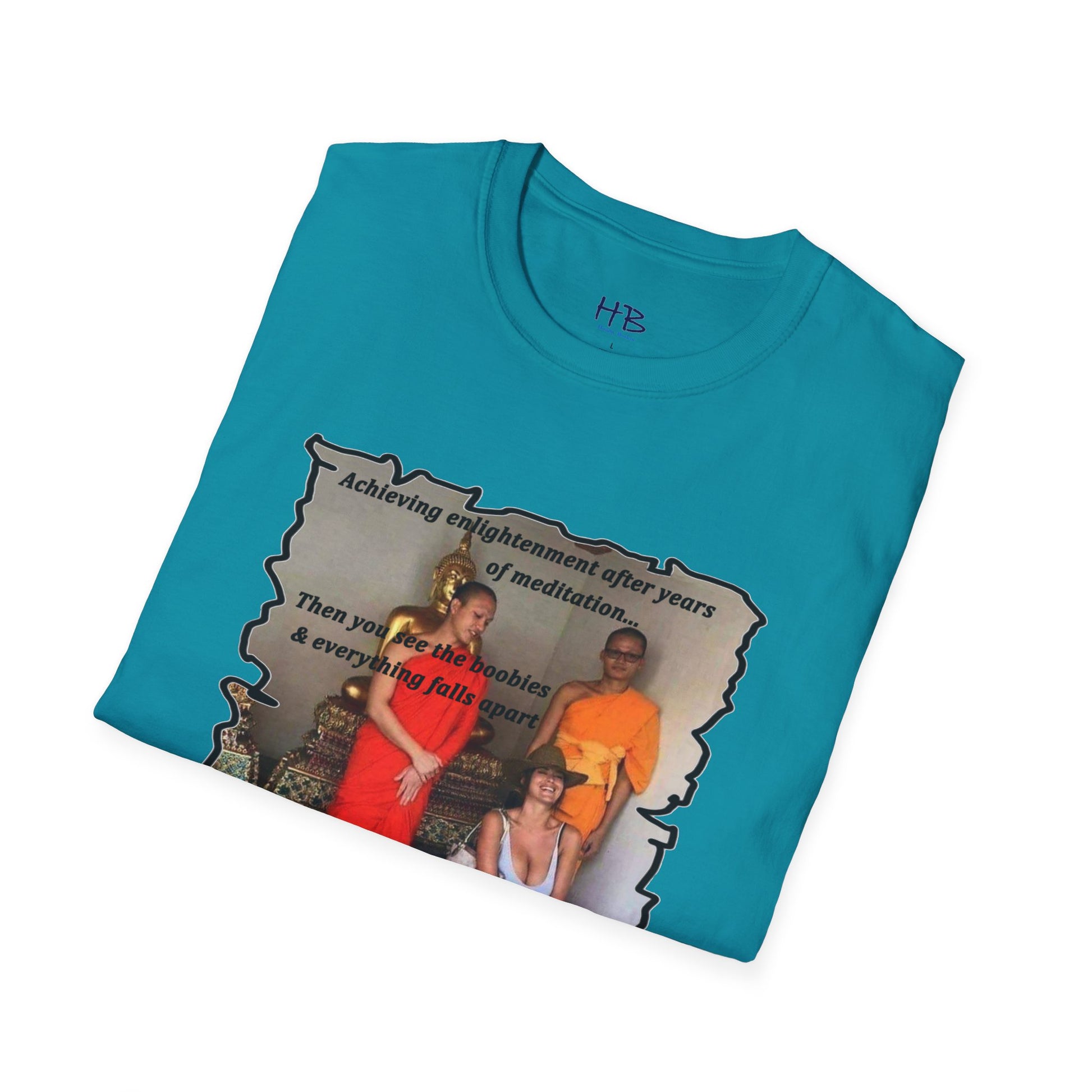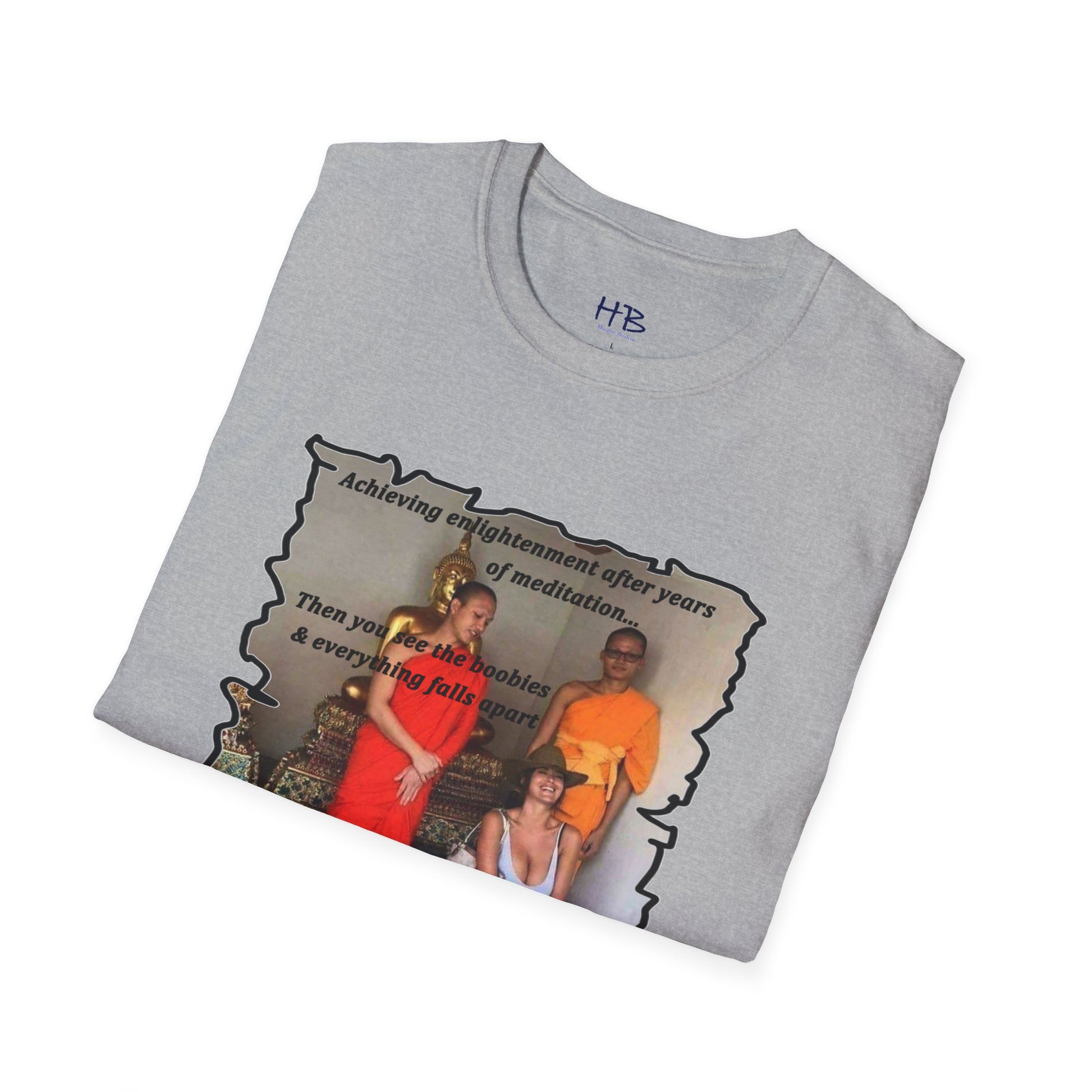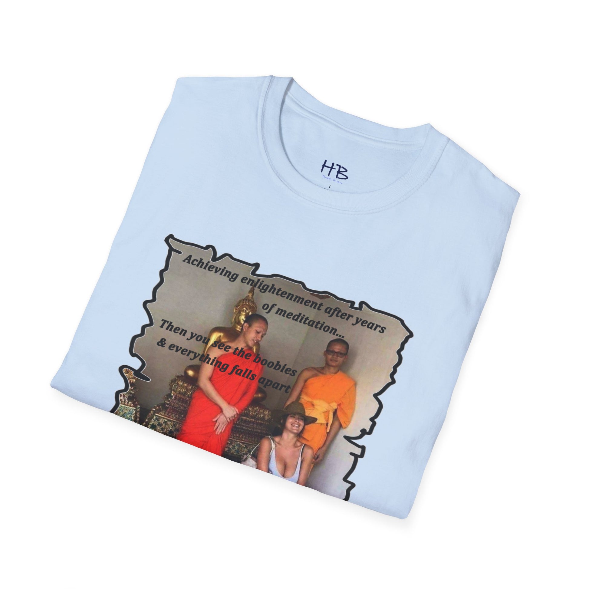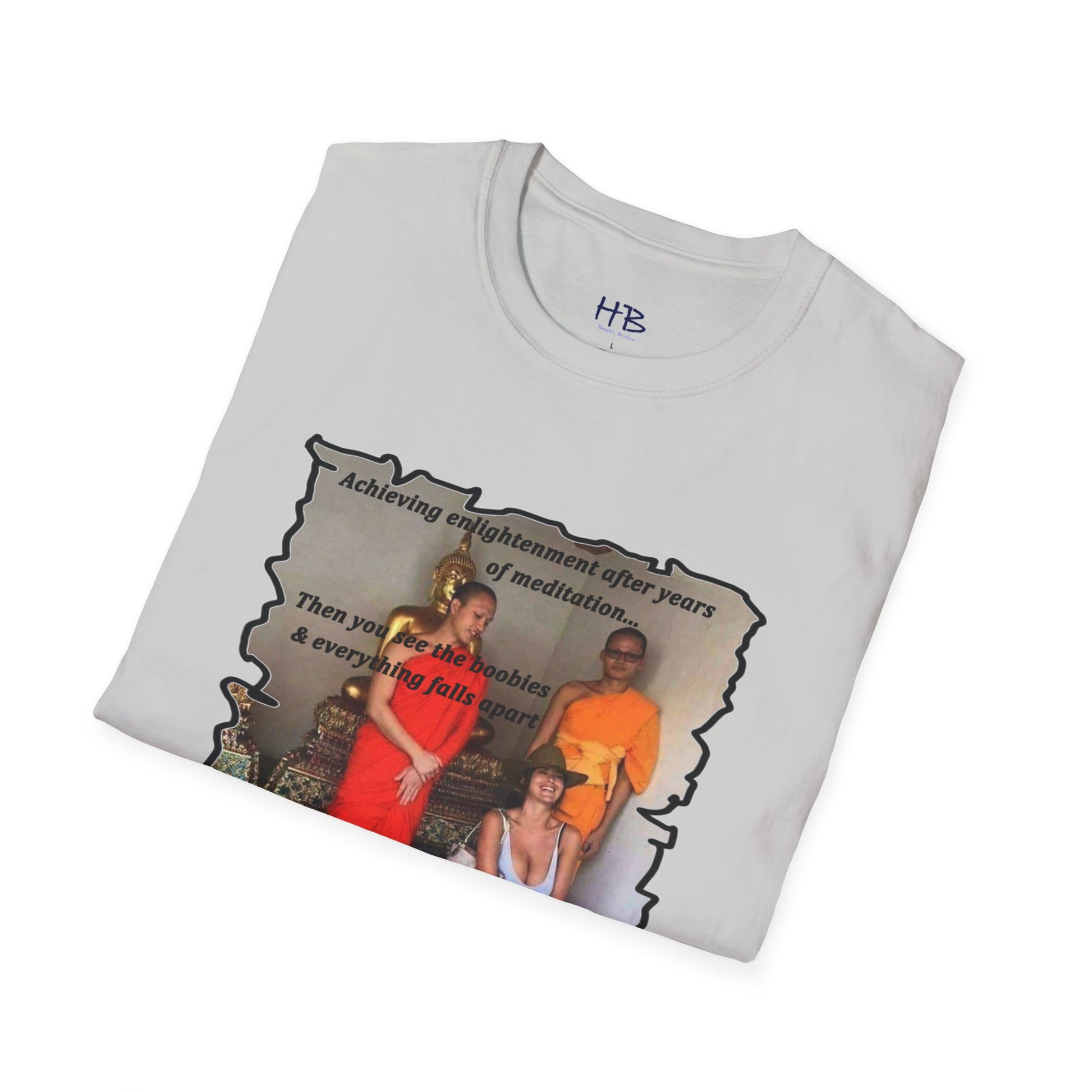 The text on the tee shirt reads "Achieving enlightenment after years of meditation... Then you see boobies & everything falls apart!!" The humorous phrase encapsulates the idea that even the most disciplined and focused individuals can be thrown off track by our natural instincts and desires.