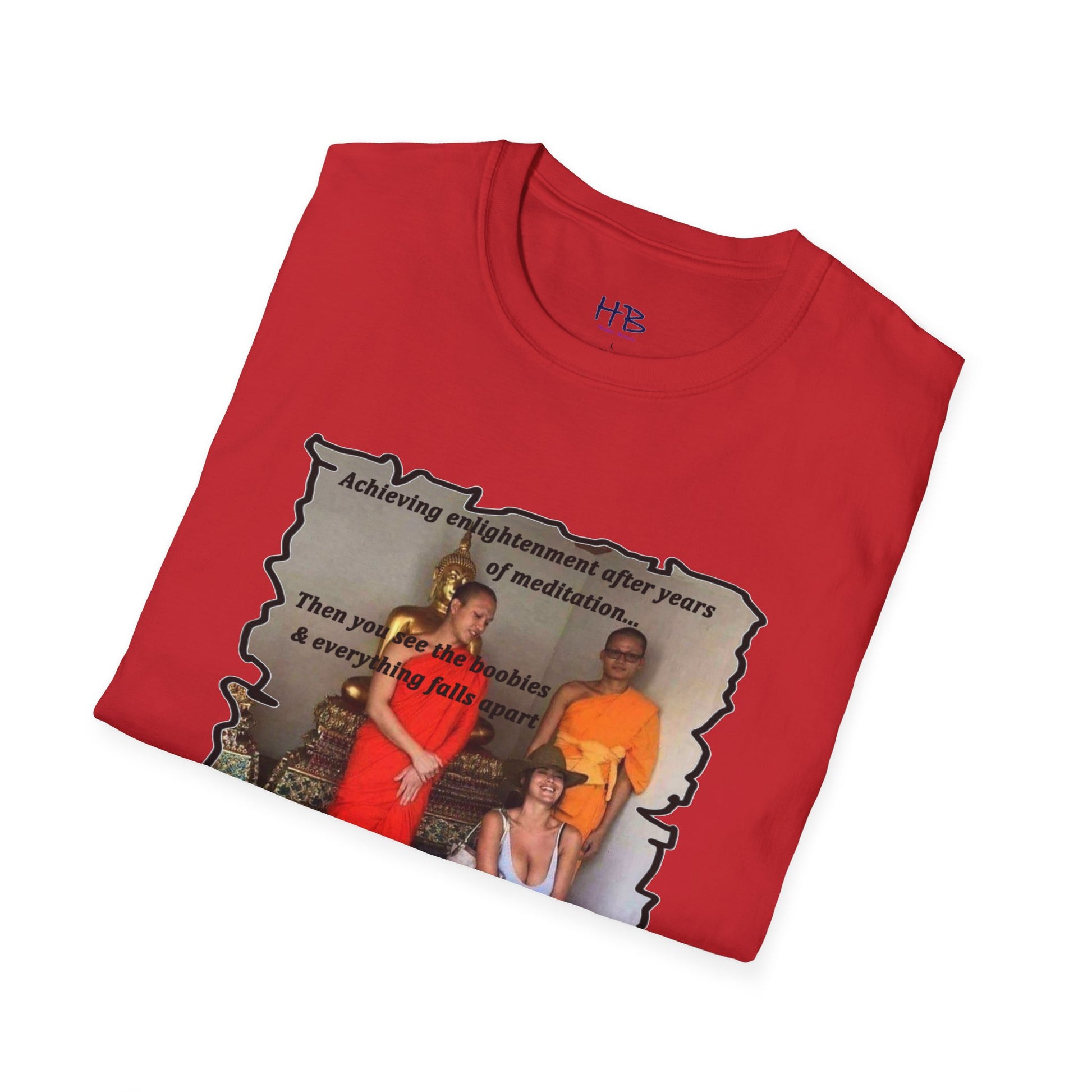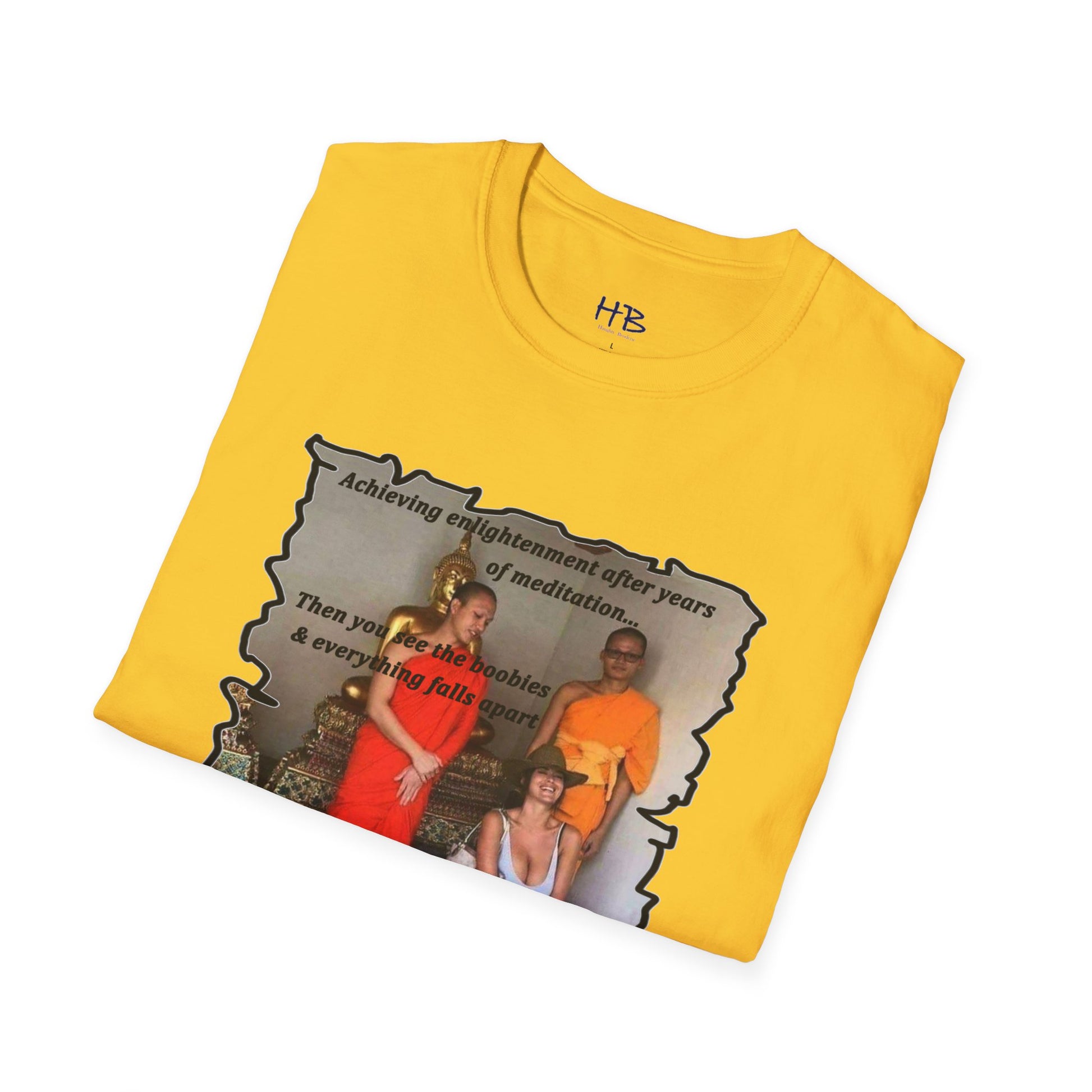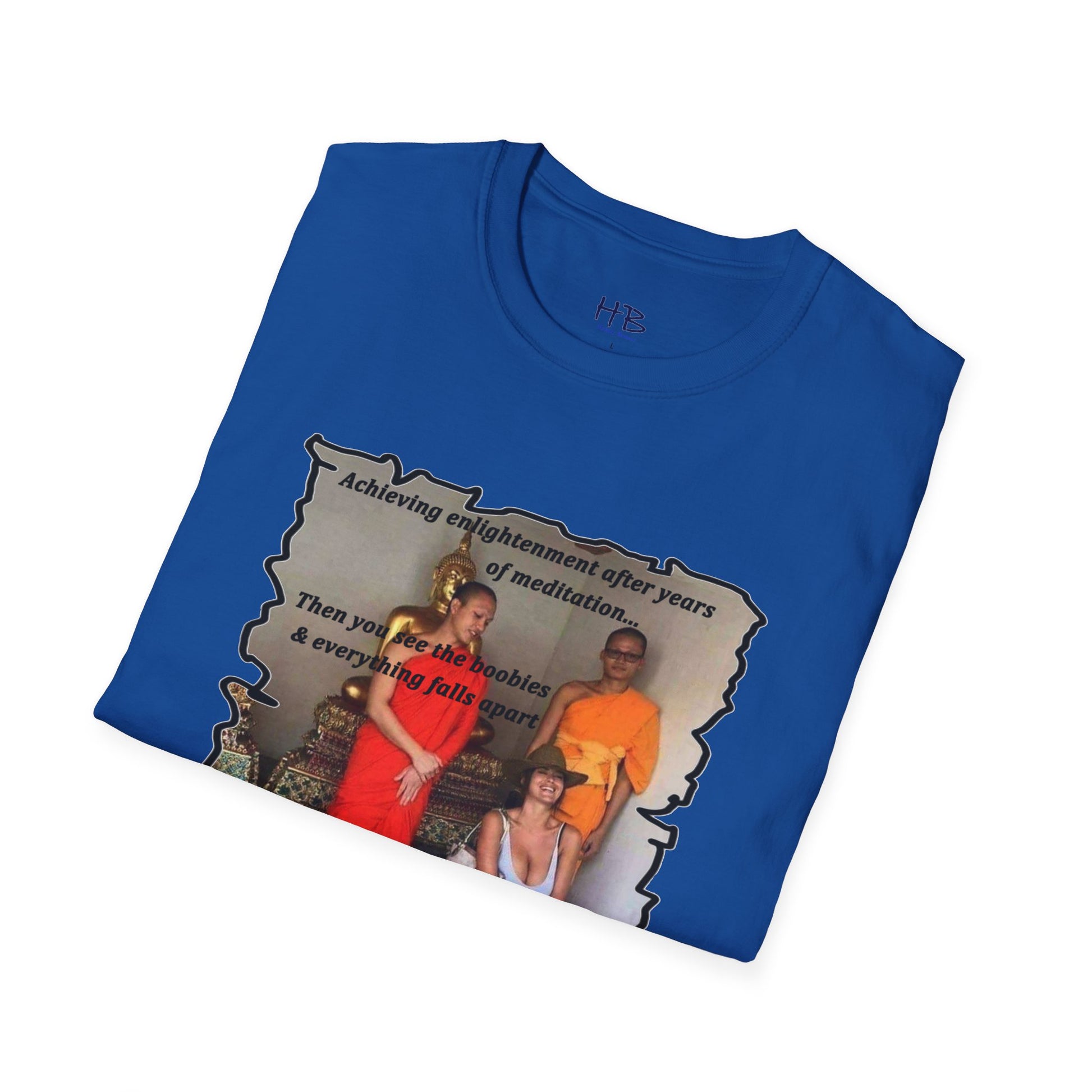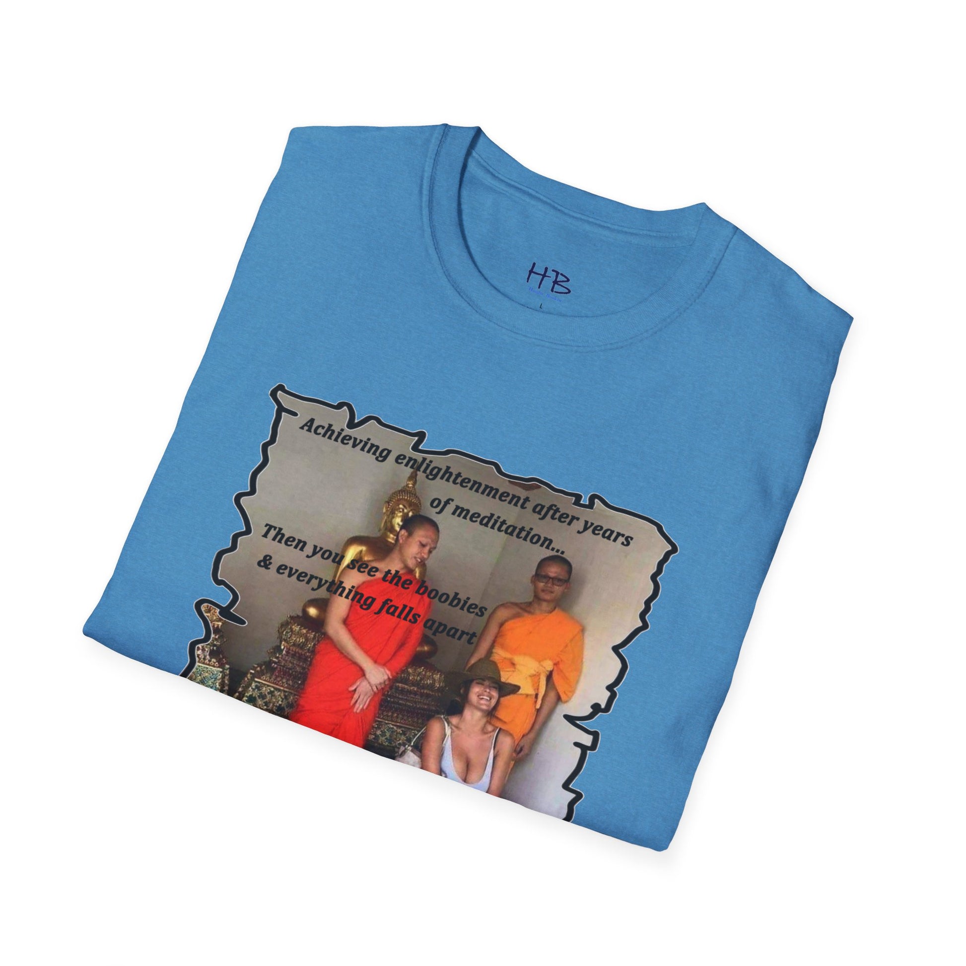 The text on the tee shirt reads "Achieving enlightenment after years of meditation... Then you see boobies & everything falls apart!!" The humorous phrase encapsulates the idea that even the most disciplined and focused individuals can be thrown off track by our natural instincts and desires.