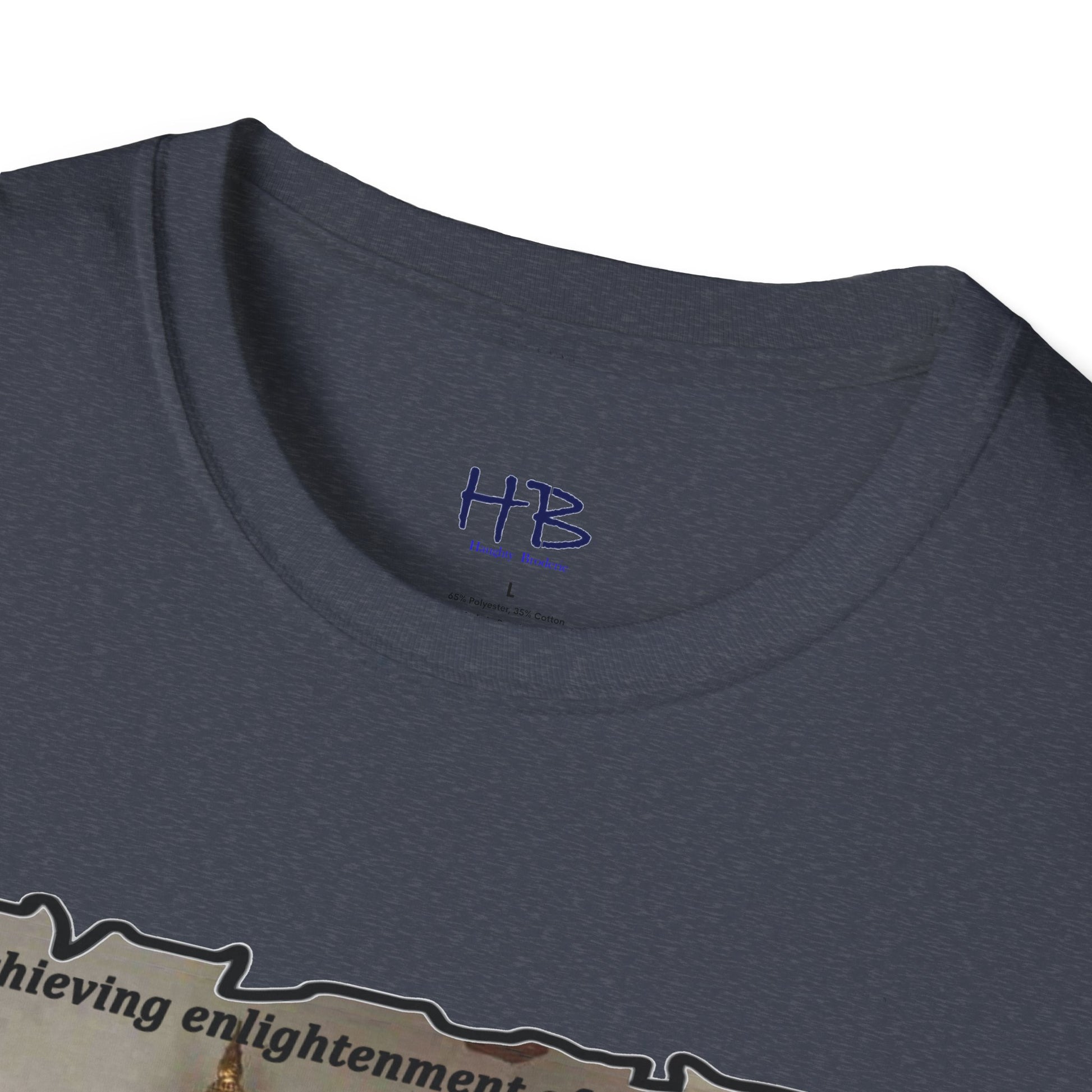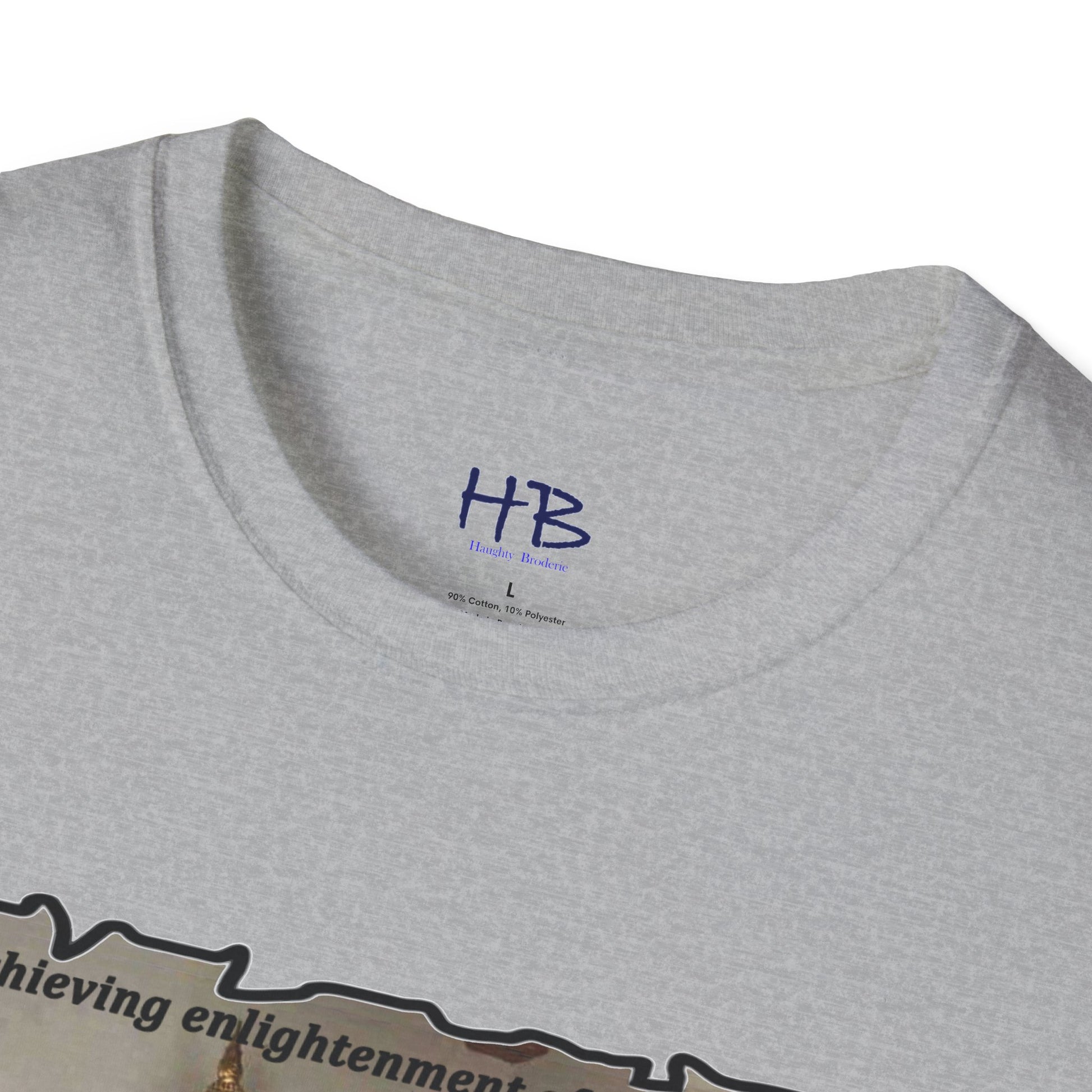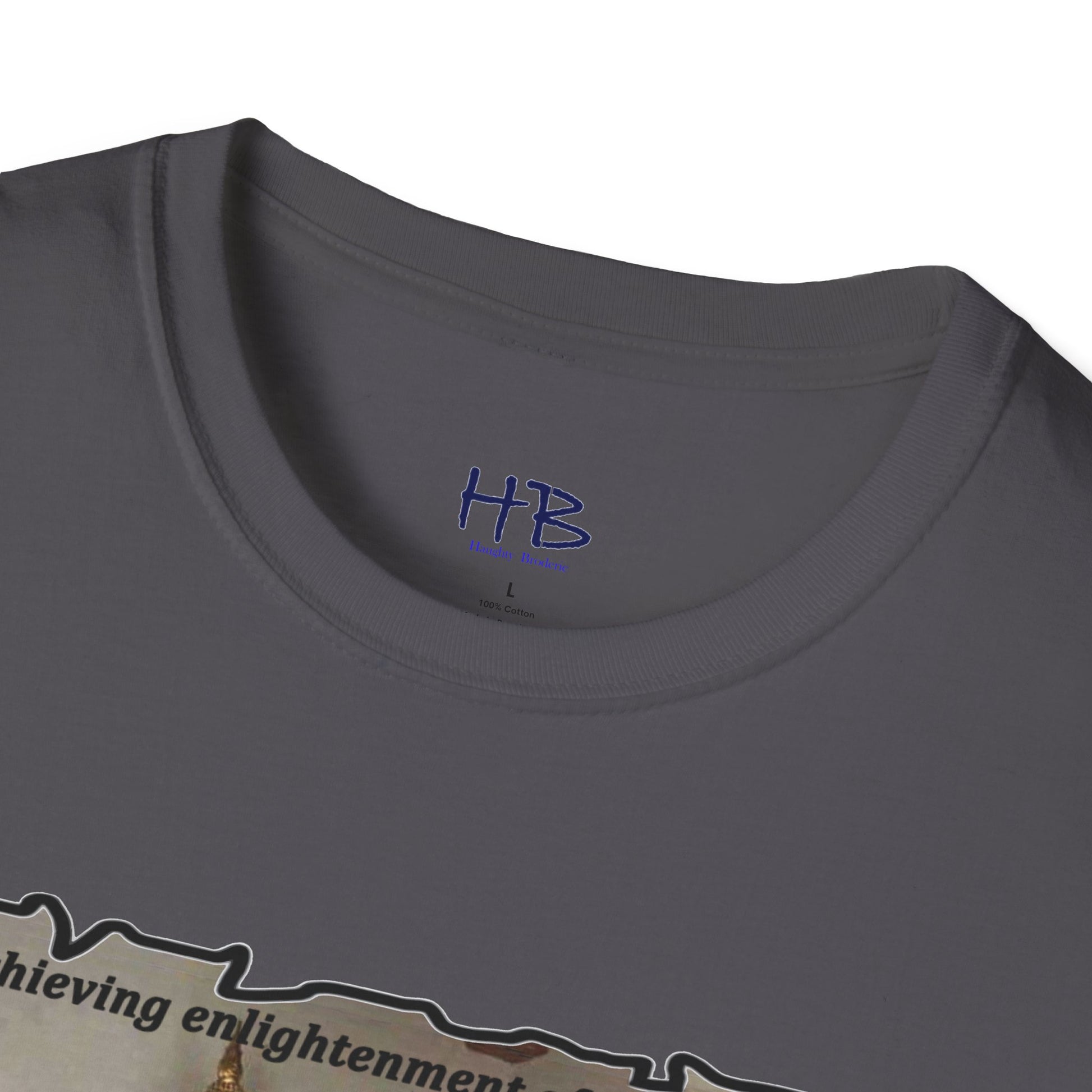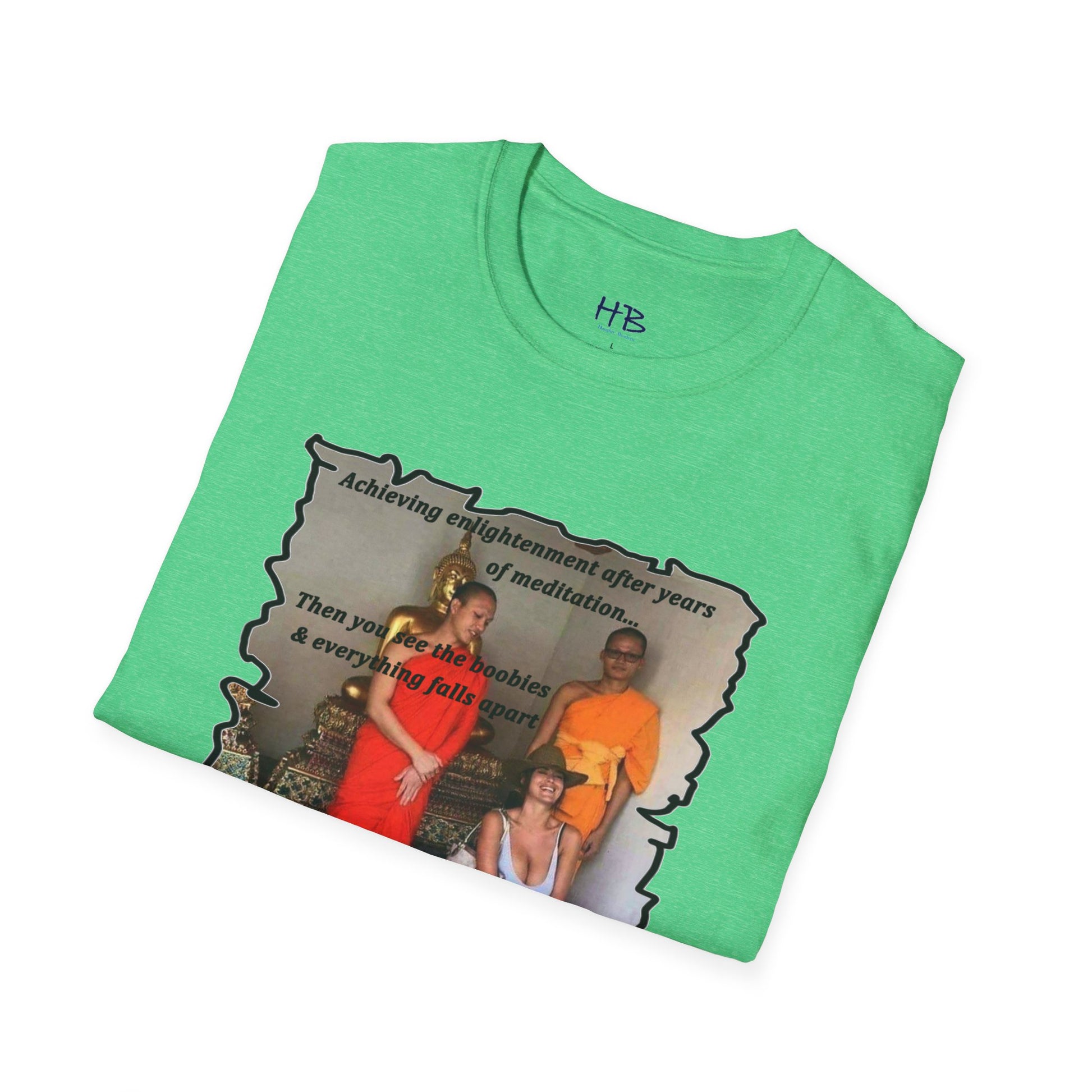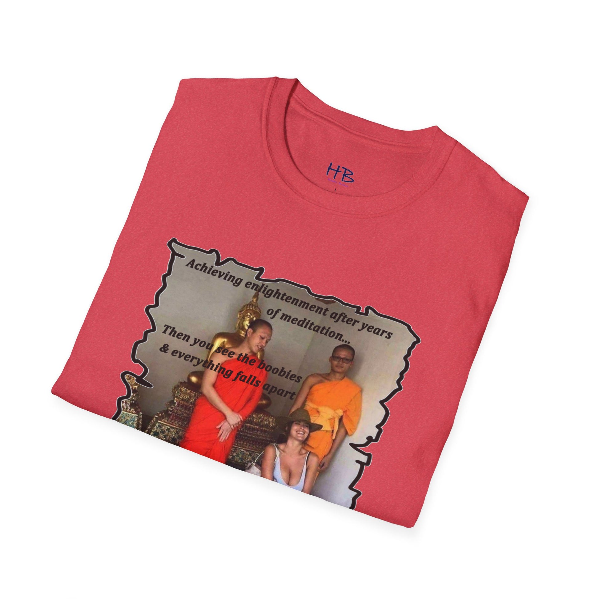 The text on the tee shirt reads "Achieving enlightenment after years of meditation... Then you see boobies & everything falls apart!!" The humorous phrase encapsulates the idea that even the most disciplined and focused individuals can be thrown off track by our natural instincts and desires.