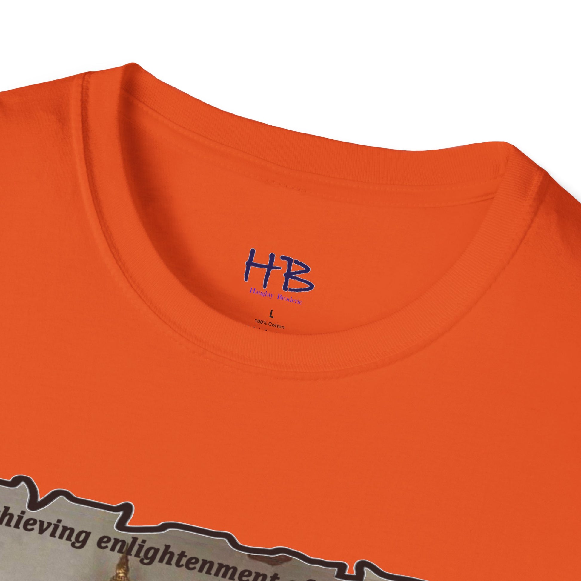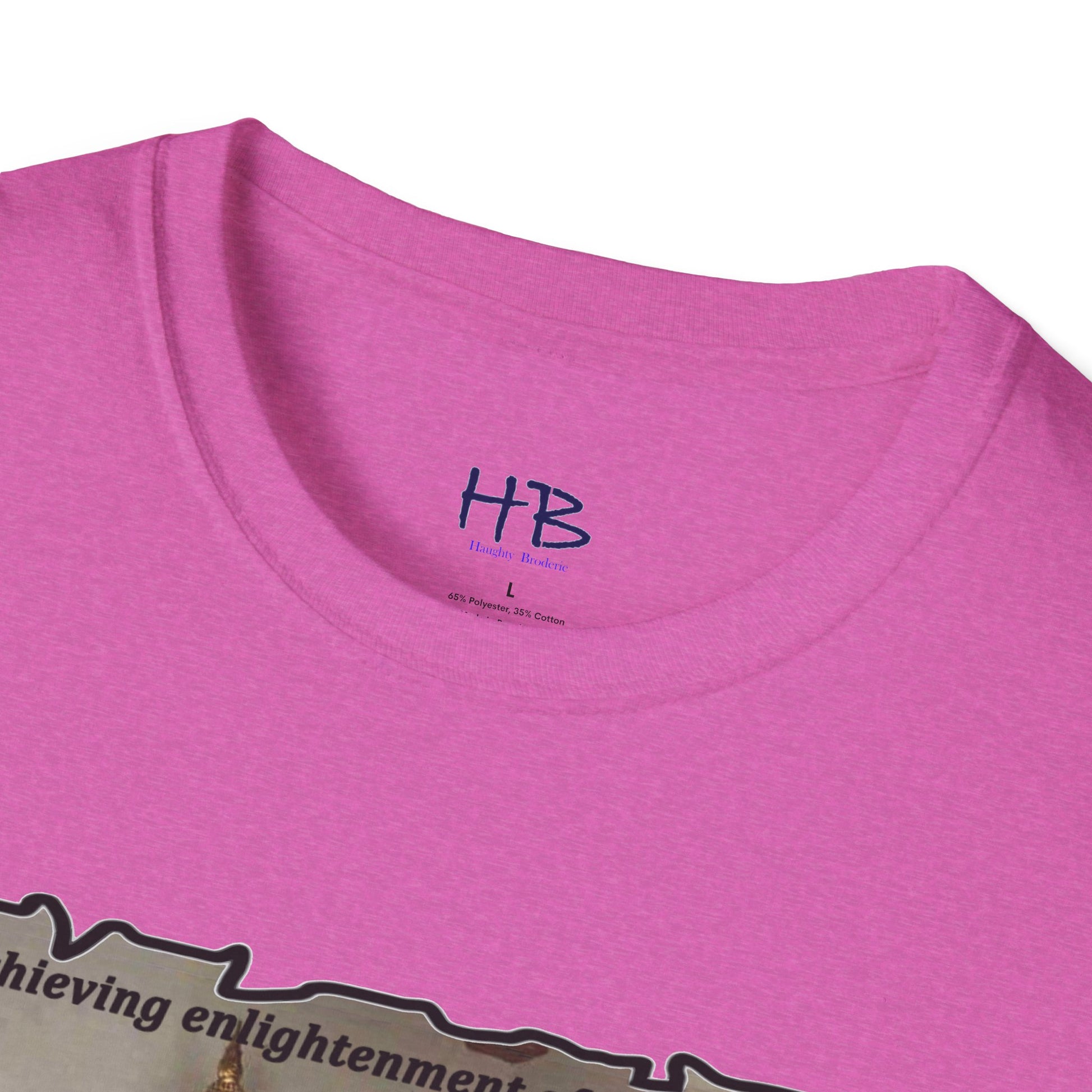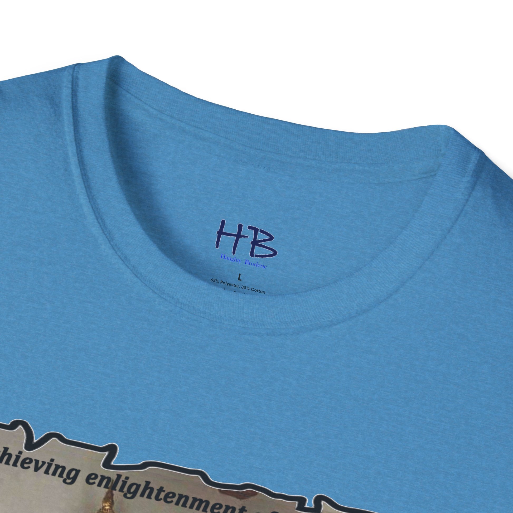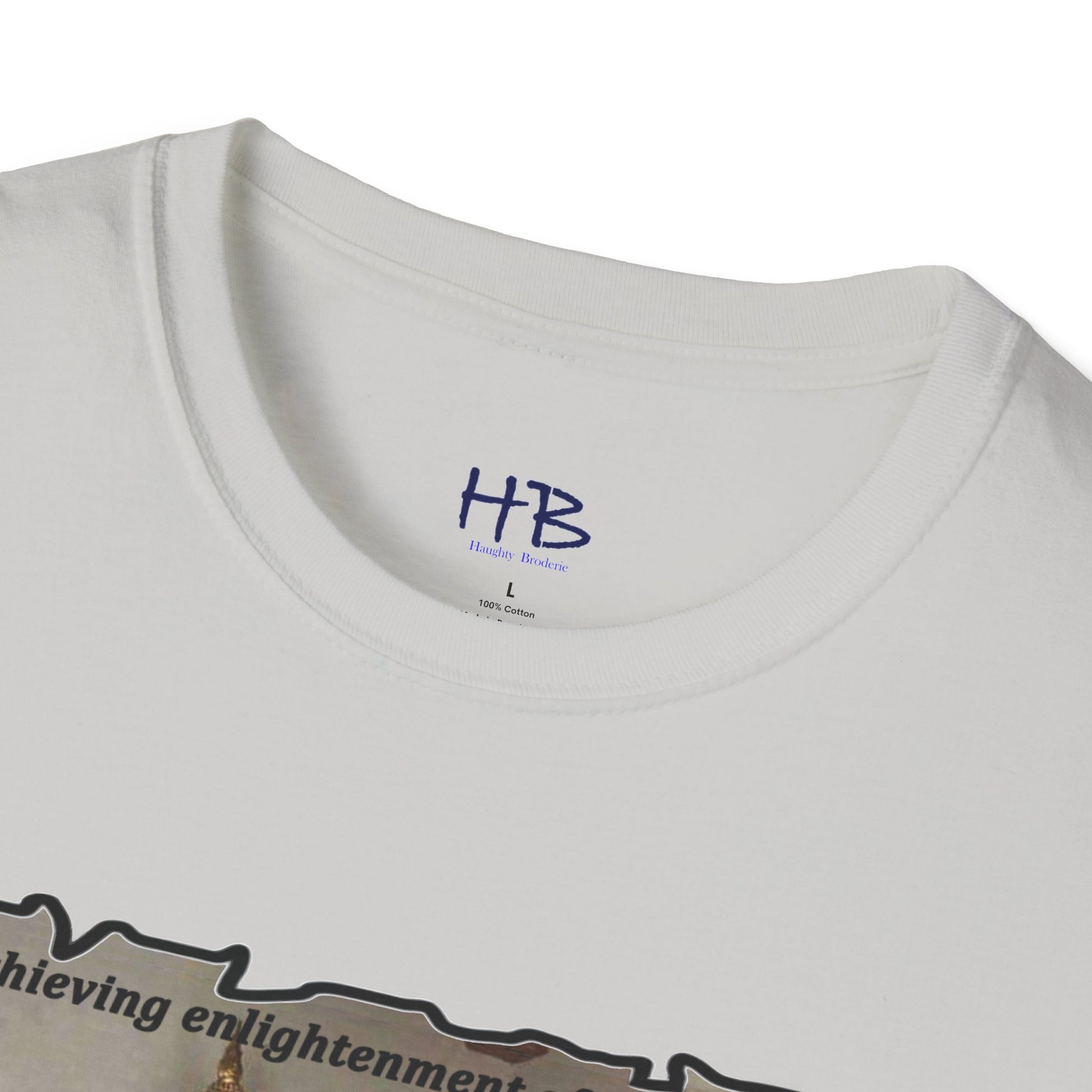 The text on the tee shirt reads "Achieving enlightenment after years of meditation... Then you see boobies & everything falls apart!!" The humorous phrase encapsulates the idea that even the most disciplined and focused individuals can be thrown off track by our natural instincts and desires.
