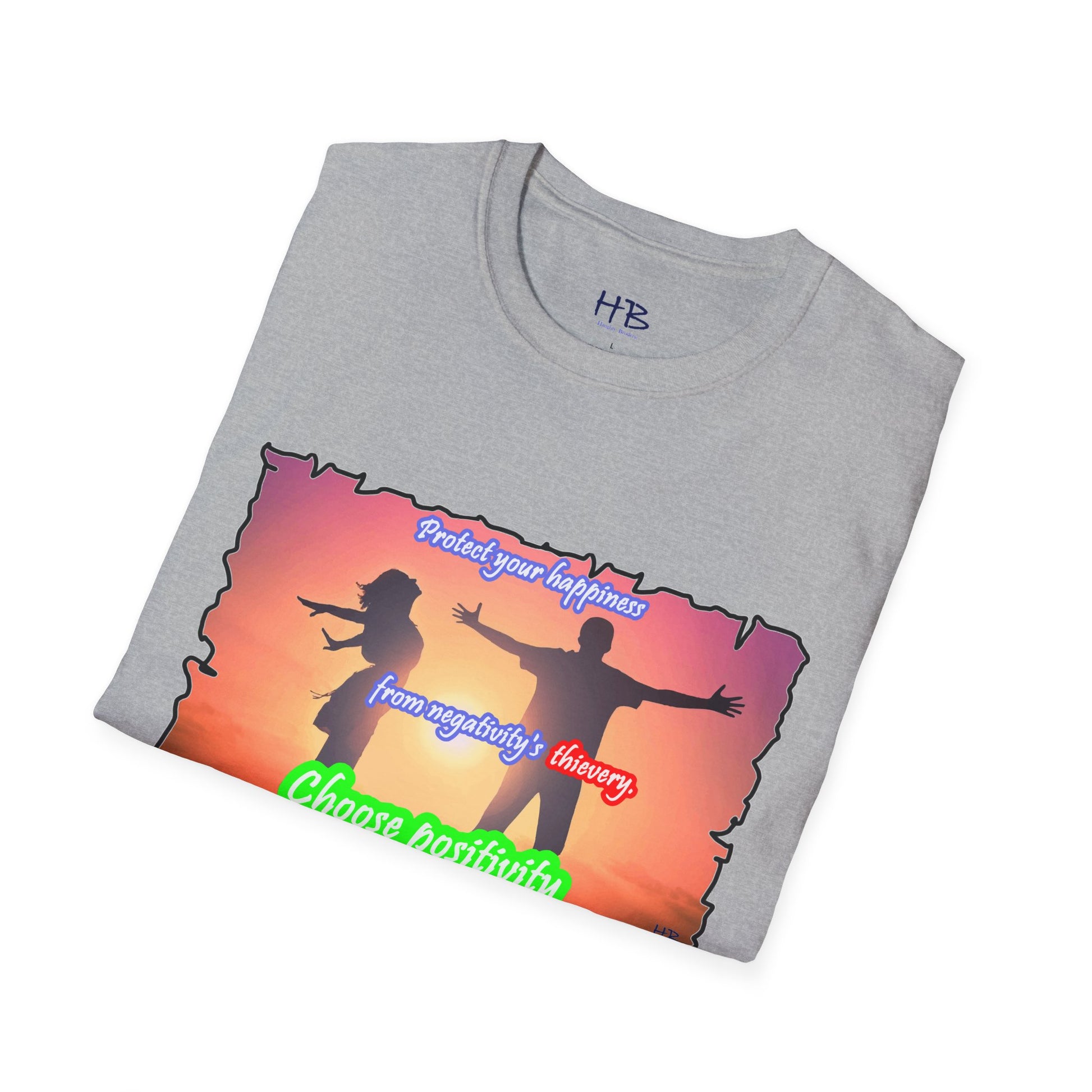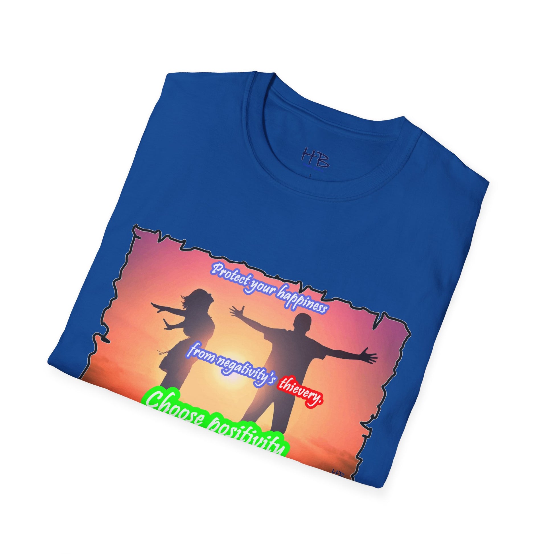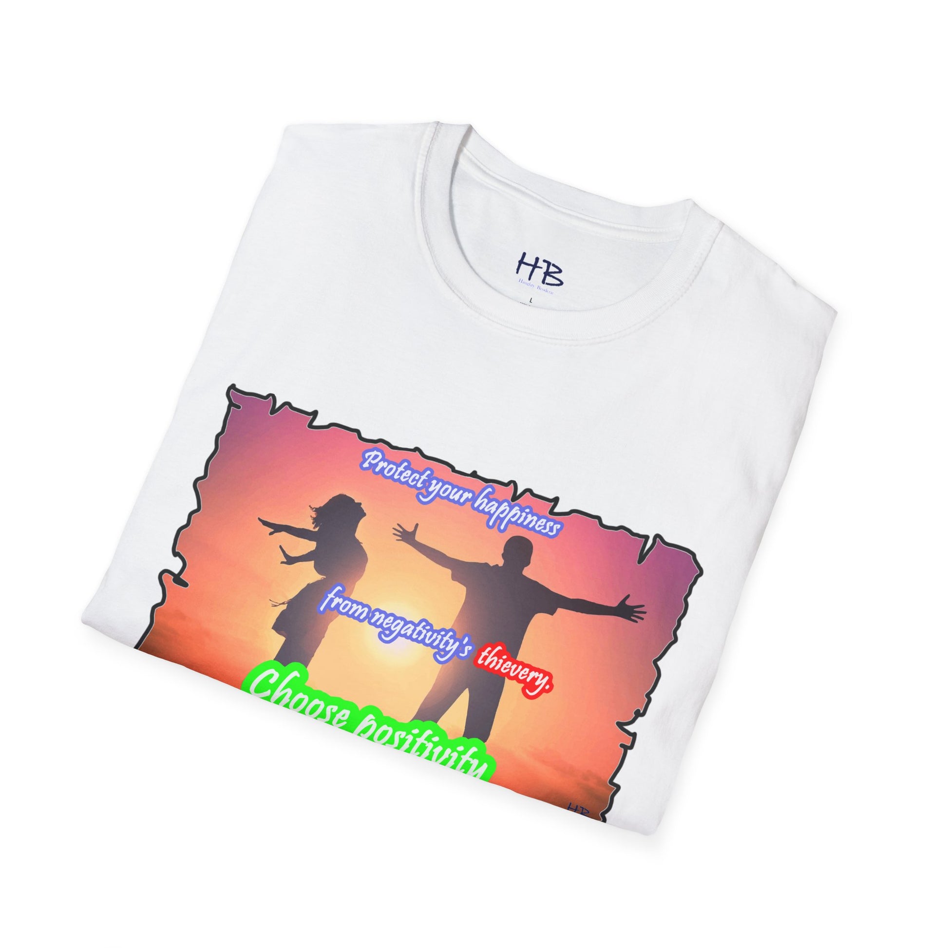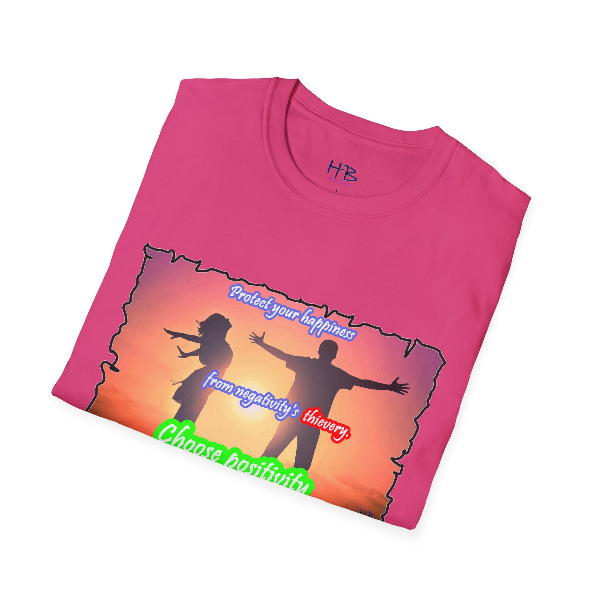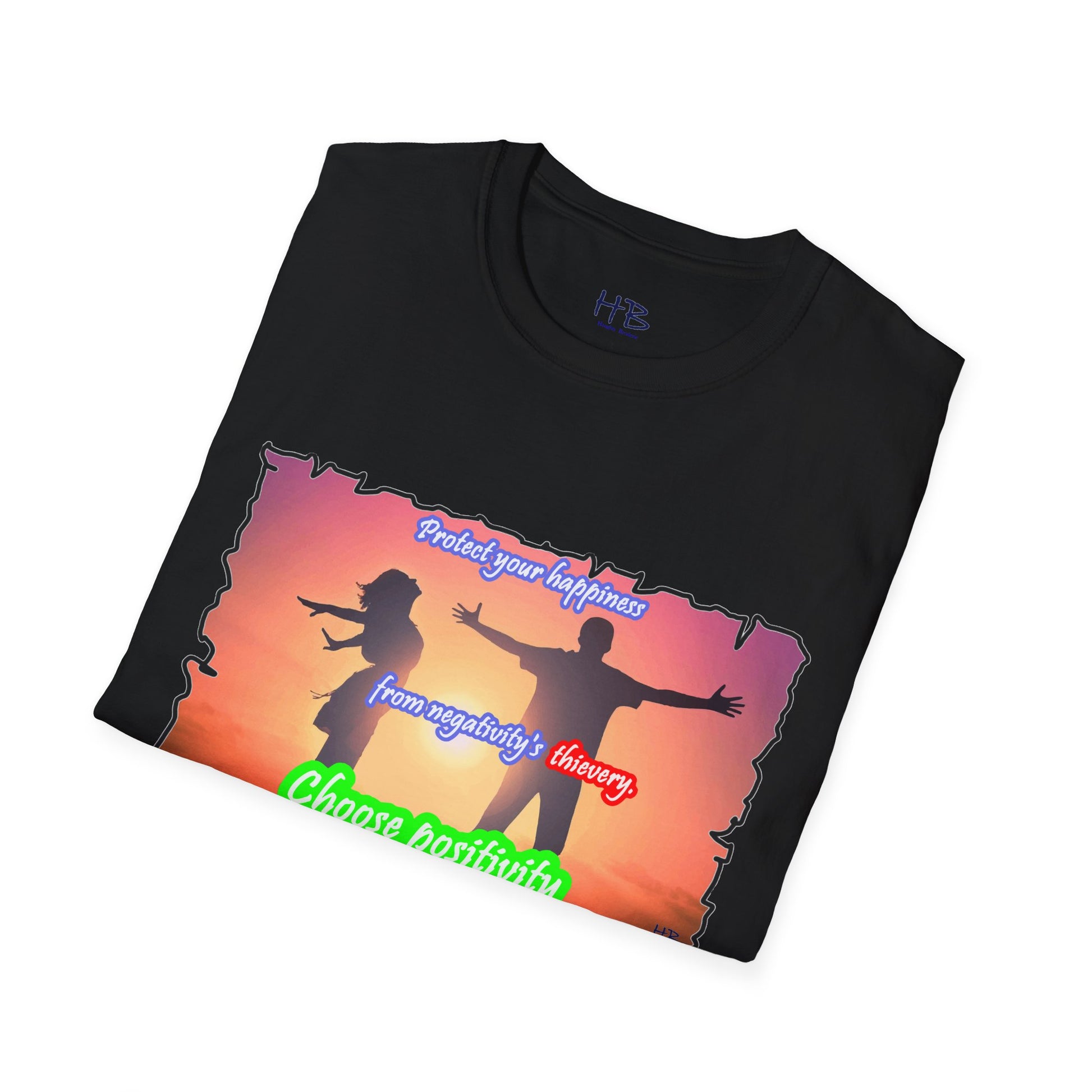 Introducing our latest addition to the tee shirt collection, featuring a stunning and vibrant depiction of a pink and purple sunset as the backdrop. Within the image, a couple stands with arms wide open, facing the vast ocean ahead. Emblazoned across the front of the tee shirt is an empowering message that reads, "Protect your happiness from negativity's thievery. Choose positivity."