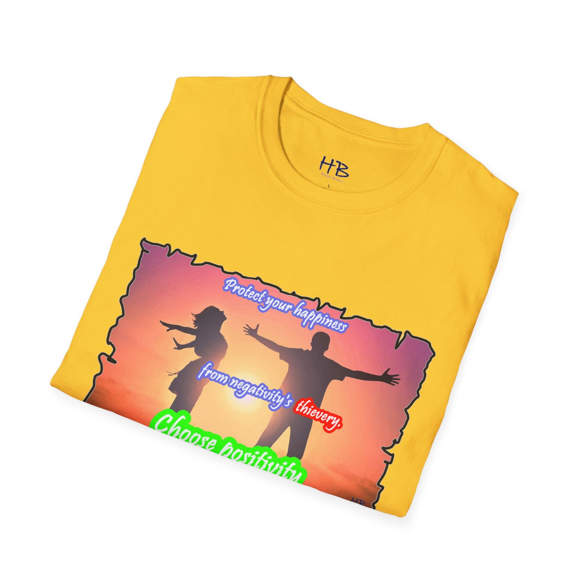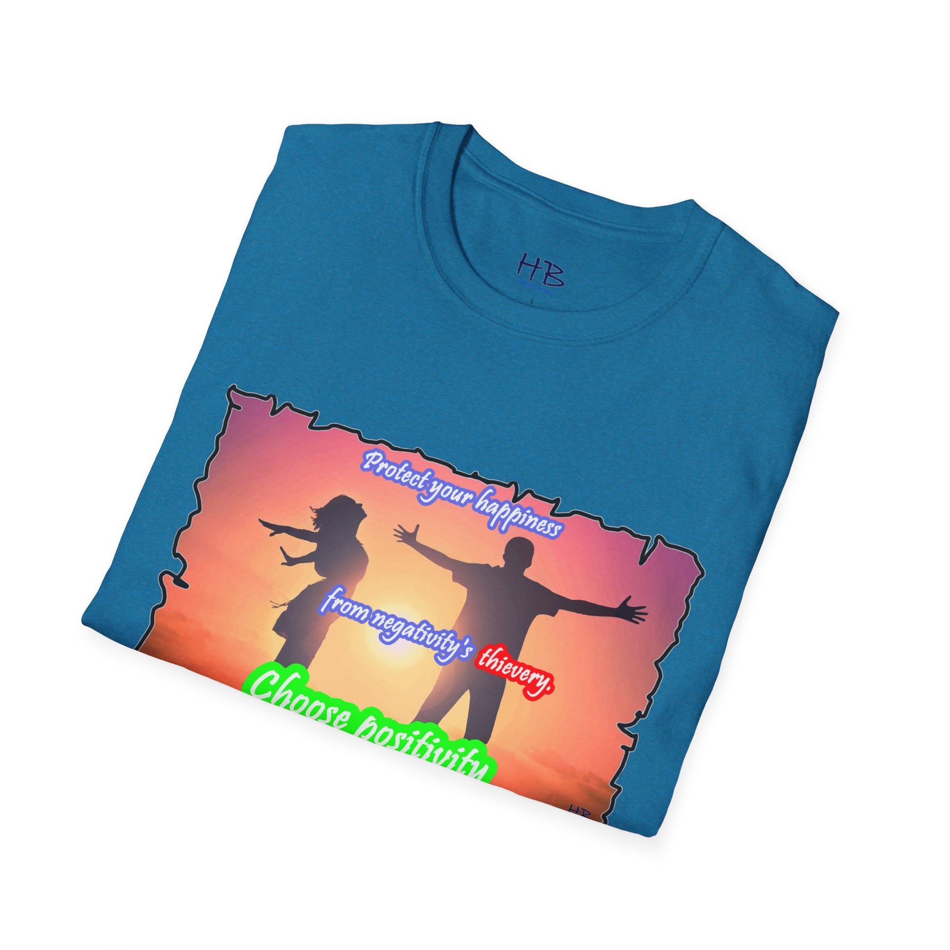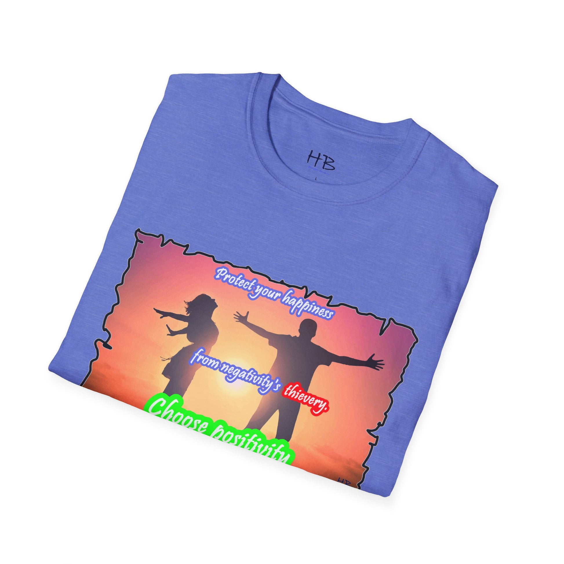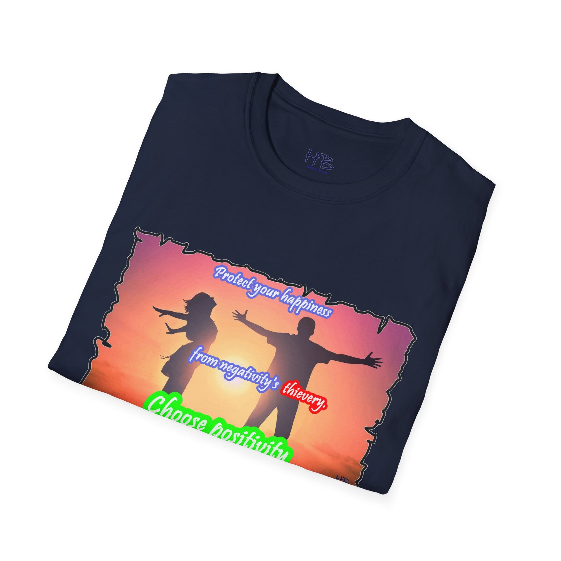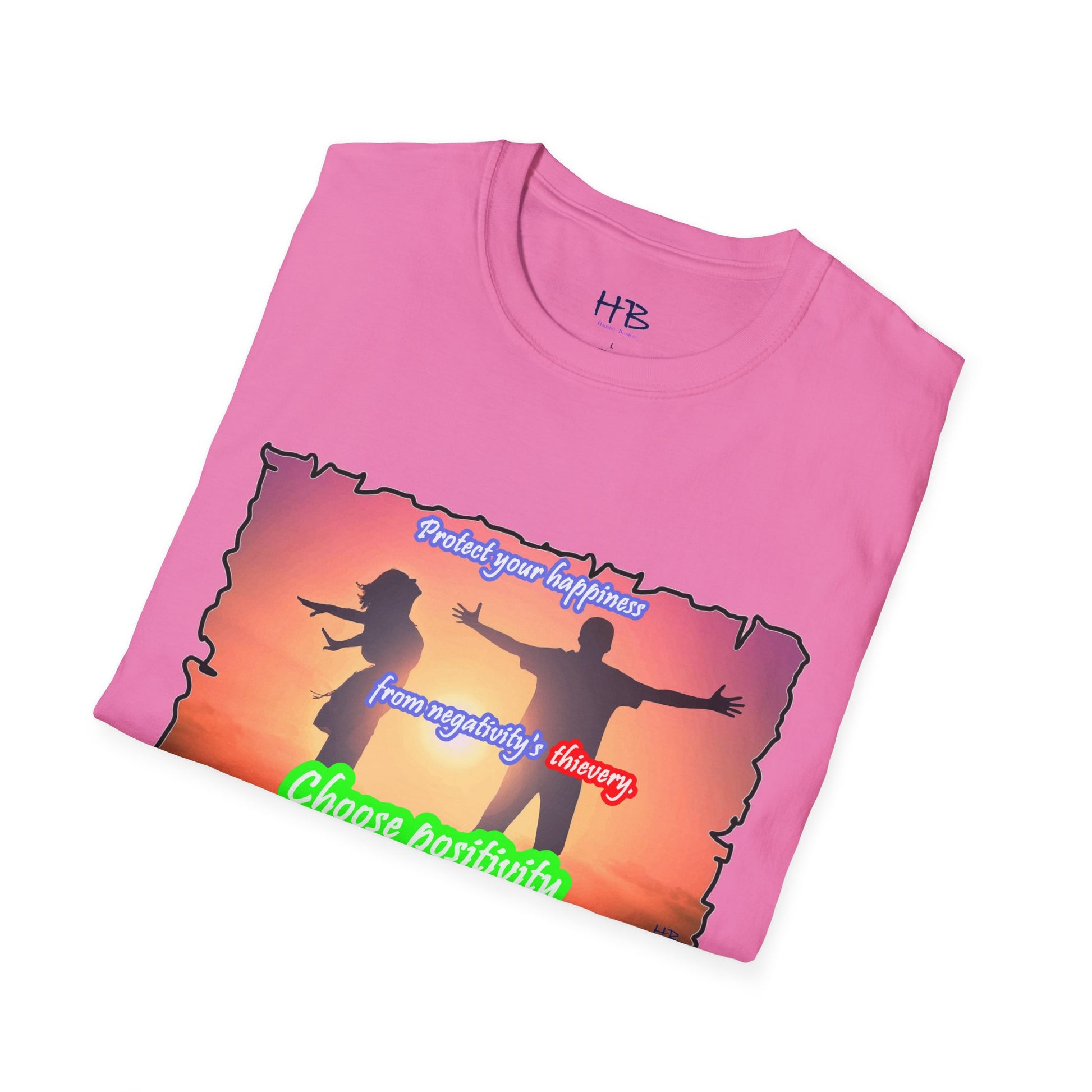 Introducing our latest addition to the tee shirt collection, featuring a stunning and vibrant depiction of a pink and purple sunset as the backdrop. Within the image, a couple stands with arms wide open, facing the vast ocean ahead. Emblazoned across the front of the tee shirt is an empowering message that reads, "Protect your happiness from negativity's thievery. Choose positivity."