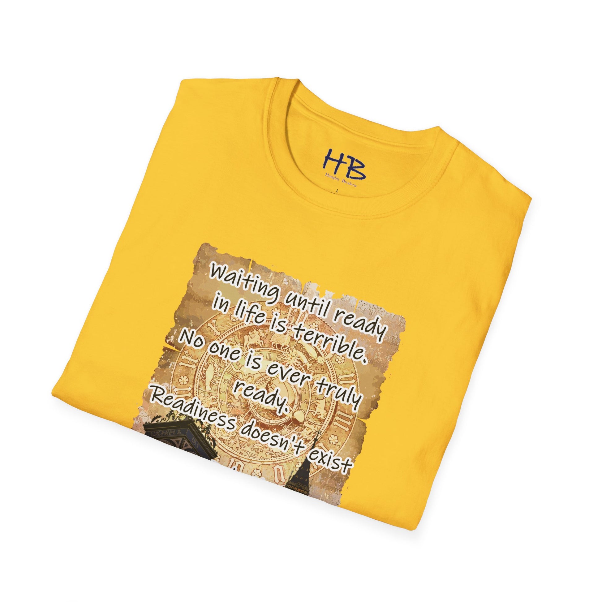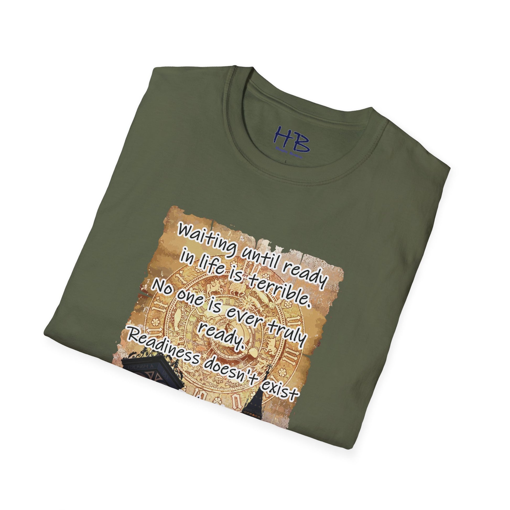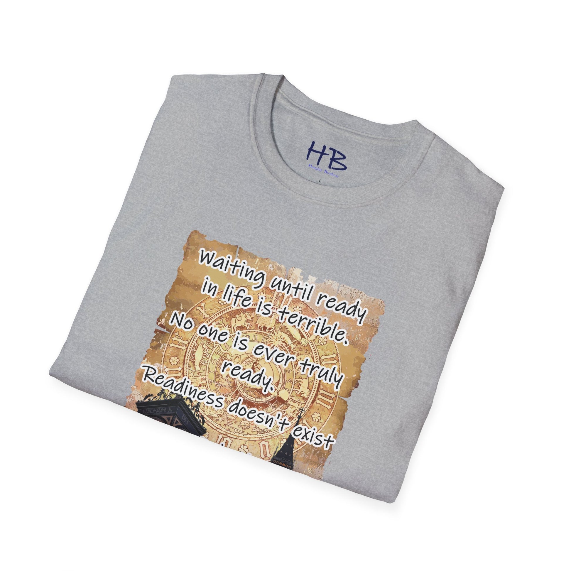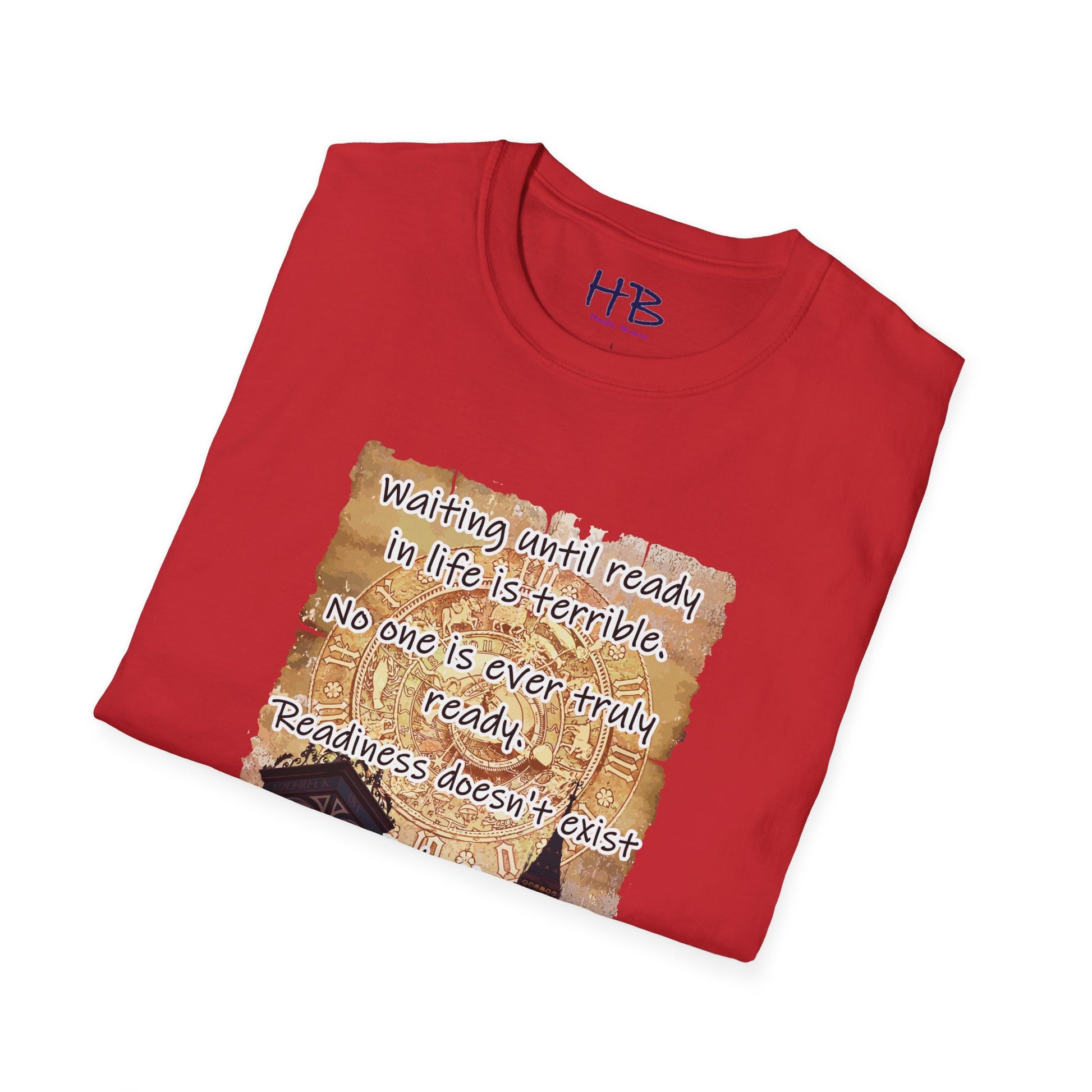 Imagine strolling through the bustling city streets, the vibrant design of our tee catching the eye of passersby. As they gaze upon the image, a sense of curiosity and intrigue envelops them. They are drawn to the profound message embedded within the design—waiting until ready is a futile endeavor.