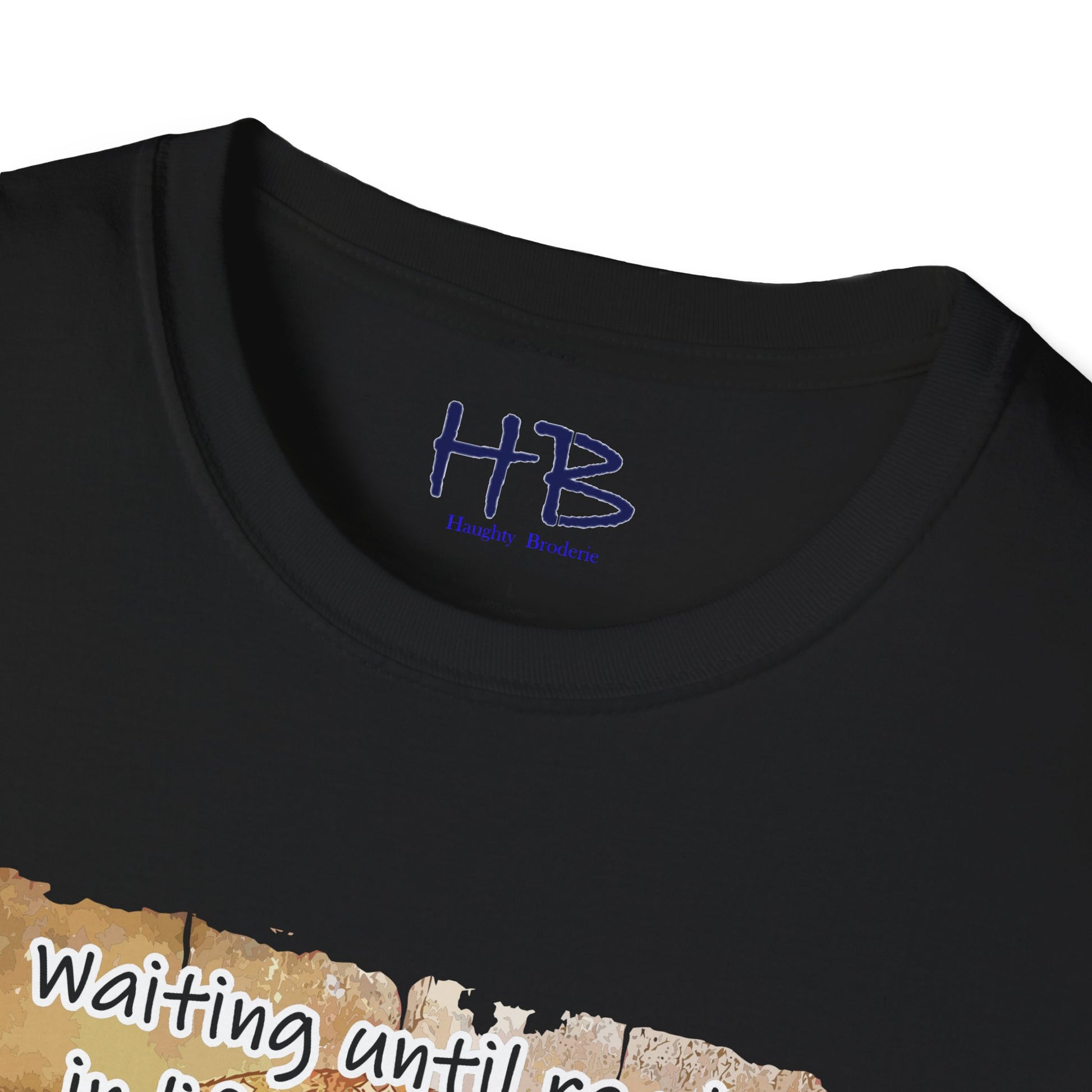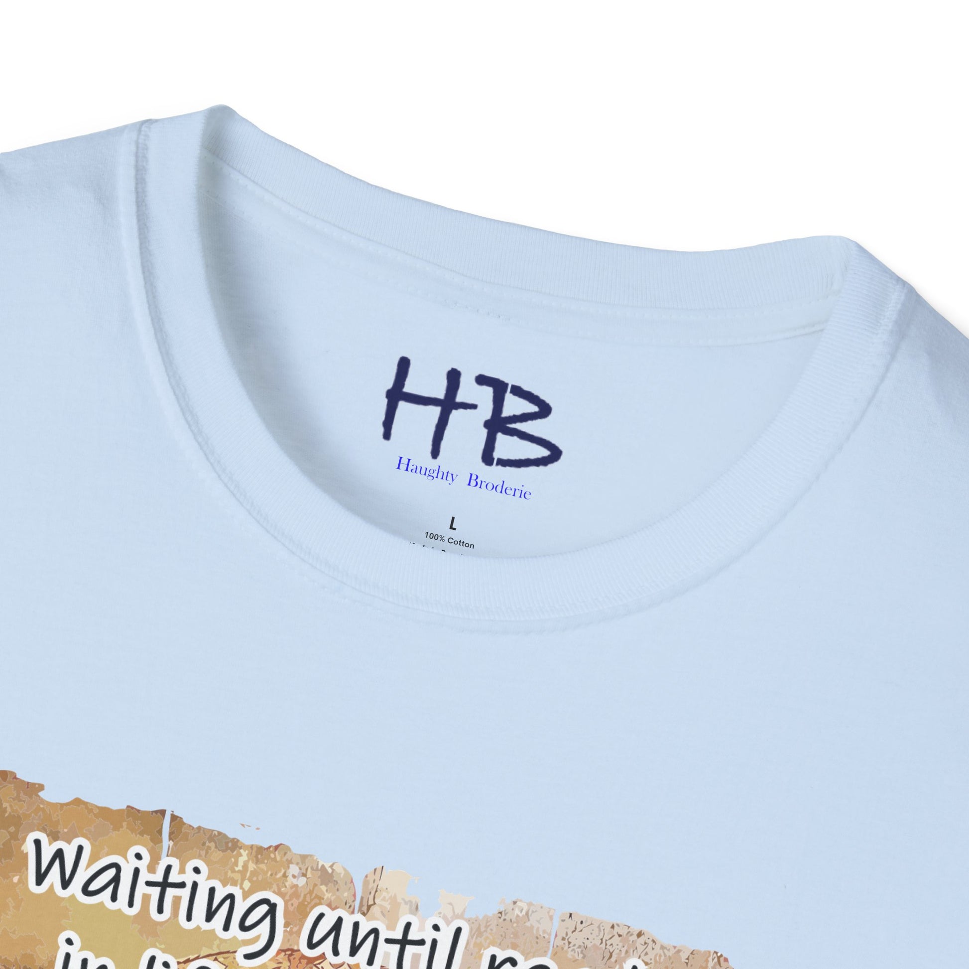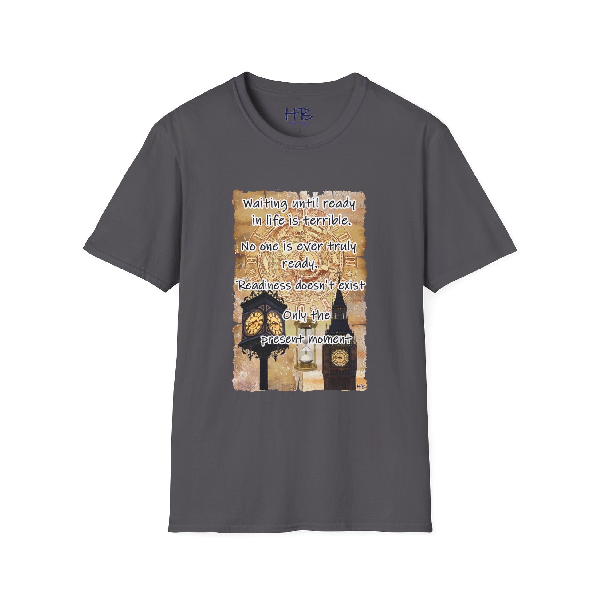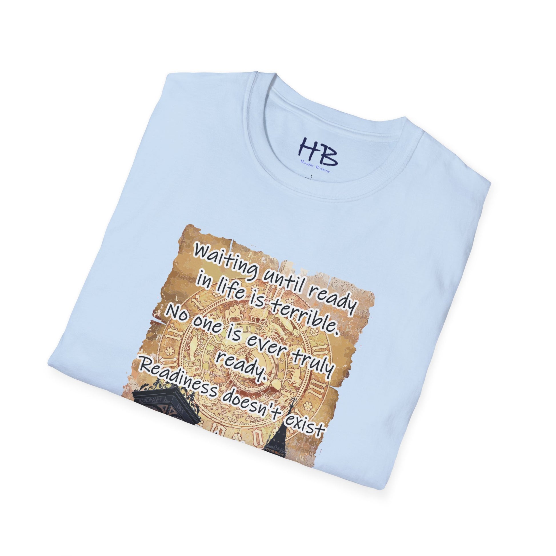 Imagine strolling through the bustling city streets, the vibrant design of our tee catching the eye of passersby. As they gaze upon the image, a sense of curiosity and intrigue envelops them. They are drawn to the profound message embedded within the design—waiting until ready is a futile endeavor.