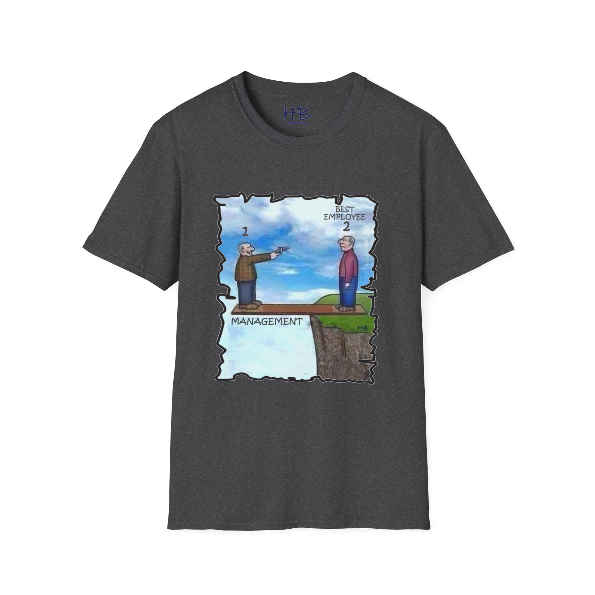 On one end, a short, smirking man wearing a suit stands confidently on the tip of a wooden board, symbolizing the management. The number "1" above his head signifies his perceived importance, while the word "Management" below him emphasizes his role. He holds a gun, depicting the power dynamics often seen in traditional workplaces.