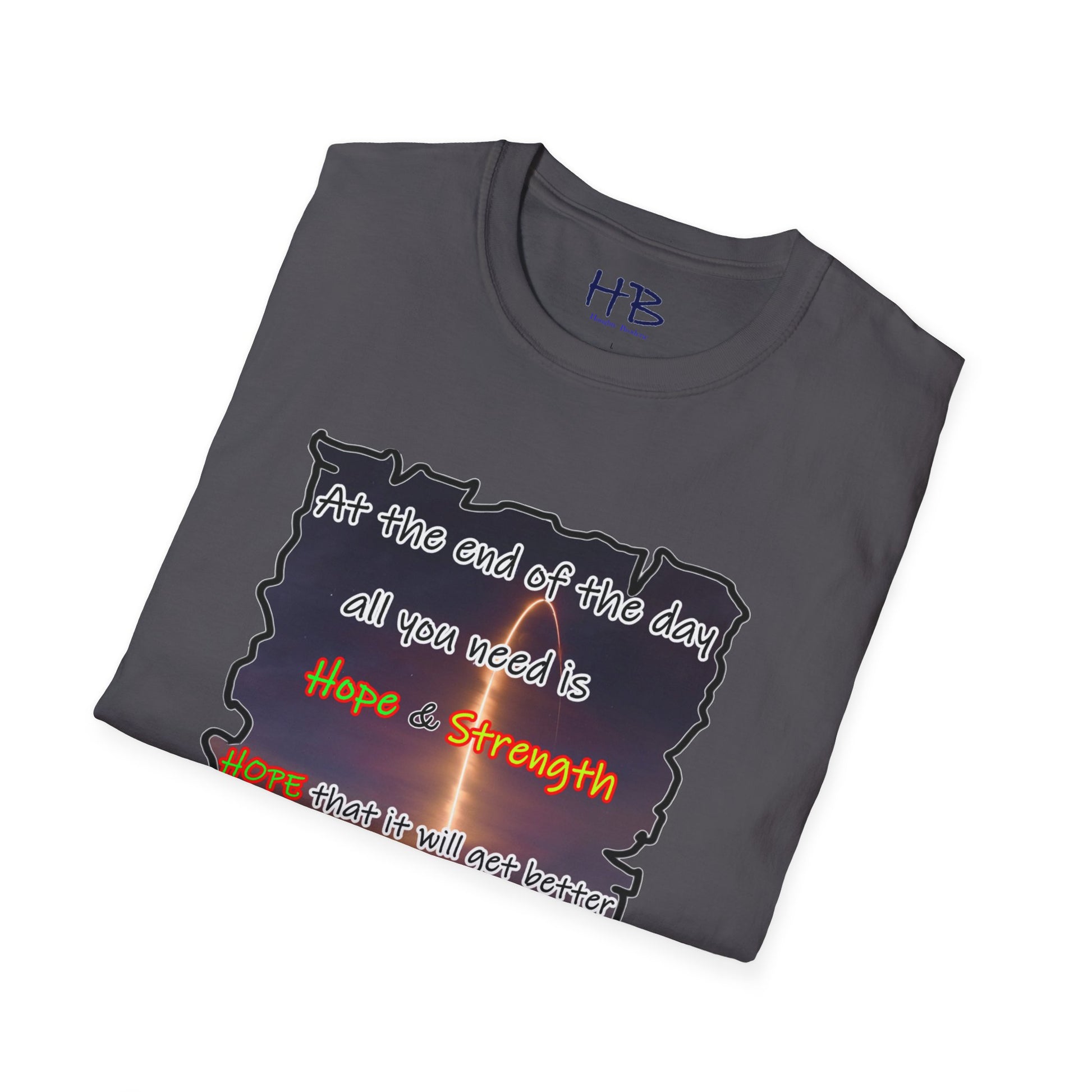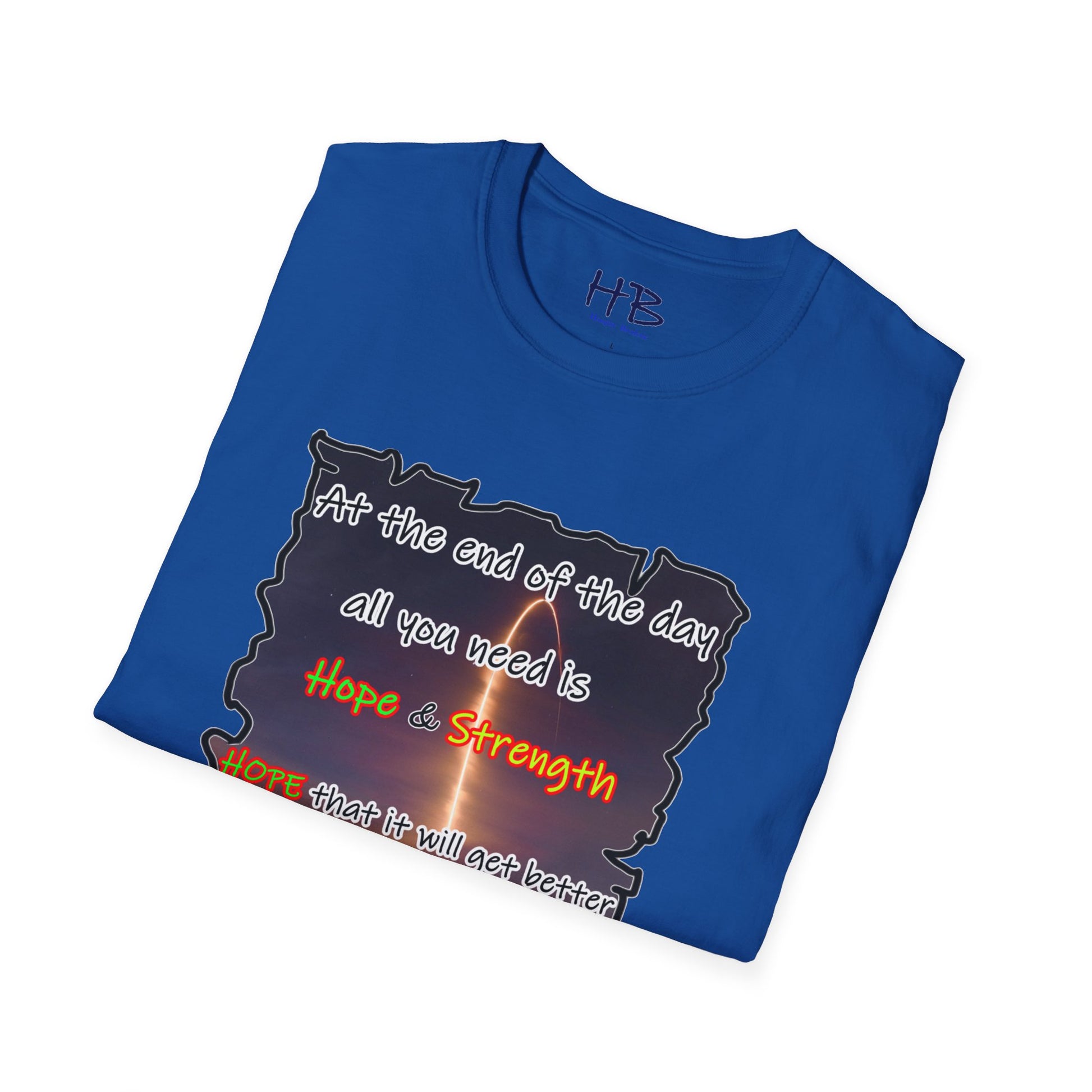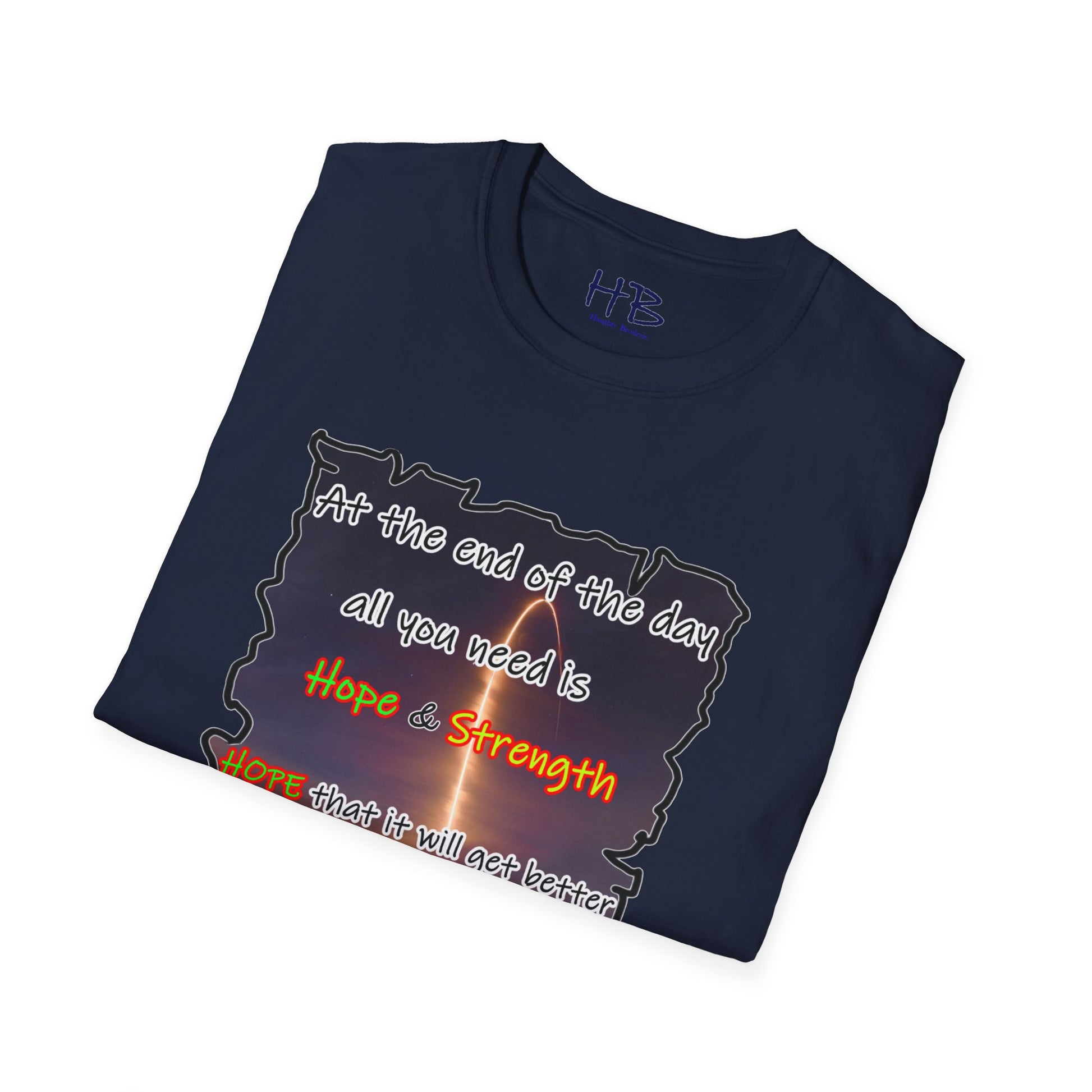 Introducing our latest creation, a mesmerizing garment that transports you into the depths of a celestial landscape. Picture a dark sky, adorned with countless stars, where a radiant flare descends gracefully like a shooting star. This captivating image is accompanied by a profound message that resonates with the human spirit: "At the end of the day, all you need is Hope and Strength. Hope that it will get better, and Strength to hold on until it does."
