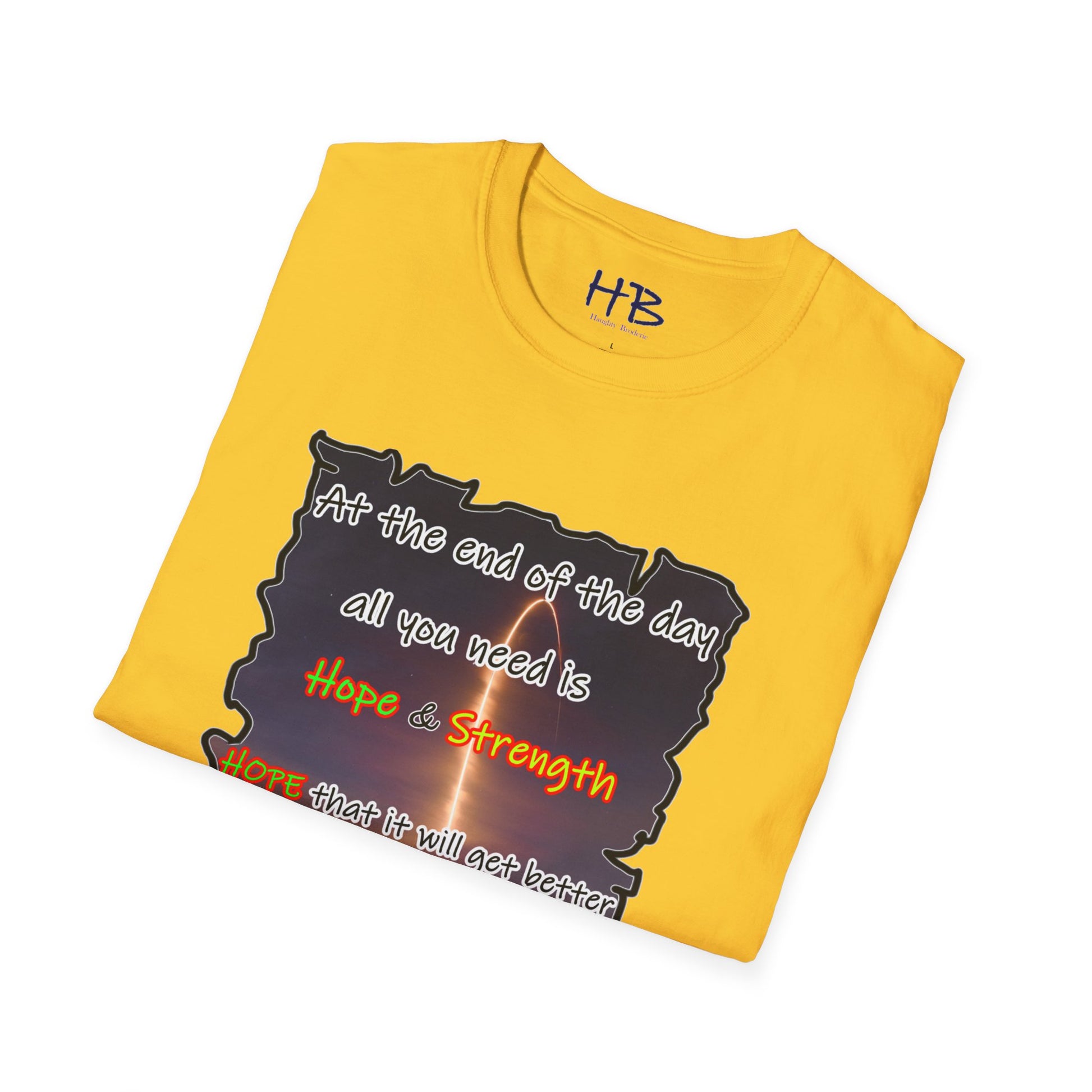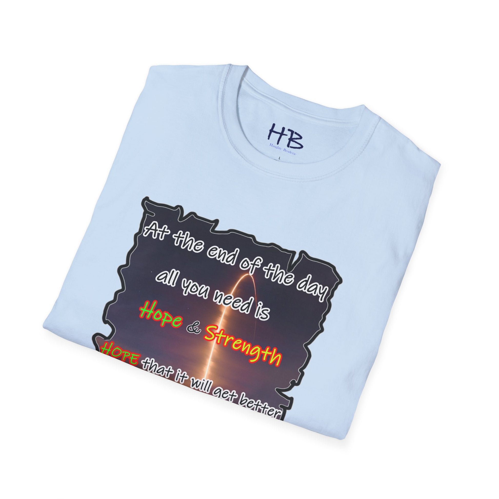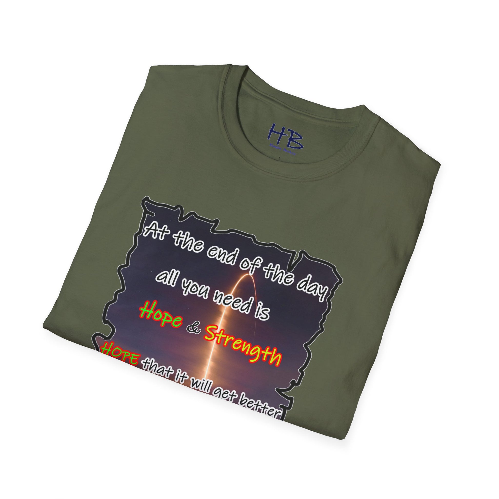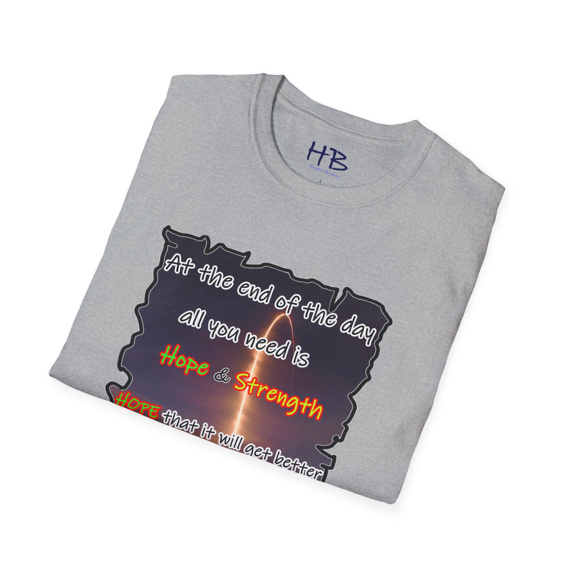 Introducing our latest creation, a mesmerizing garment that transports you into the depths of a celestial landscape. Picture a dark sky, adorned with countless stars, where a radiant flare descends gracefully like a shooting star. This captivating image is accompanied by a profound message that resonates with the human spirit: "At the end of the day, all you need is Hope and Strength. Hope that it will get better, and Strength to hold on until it does."