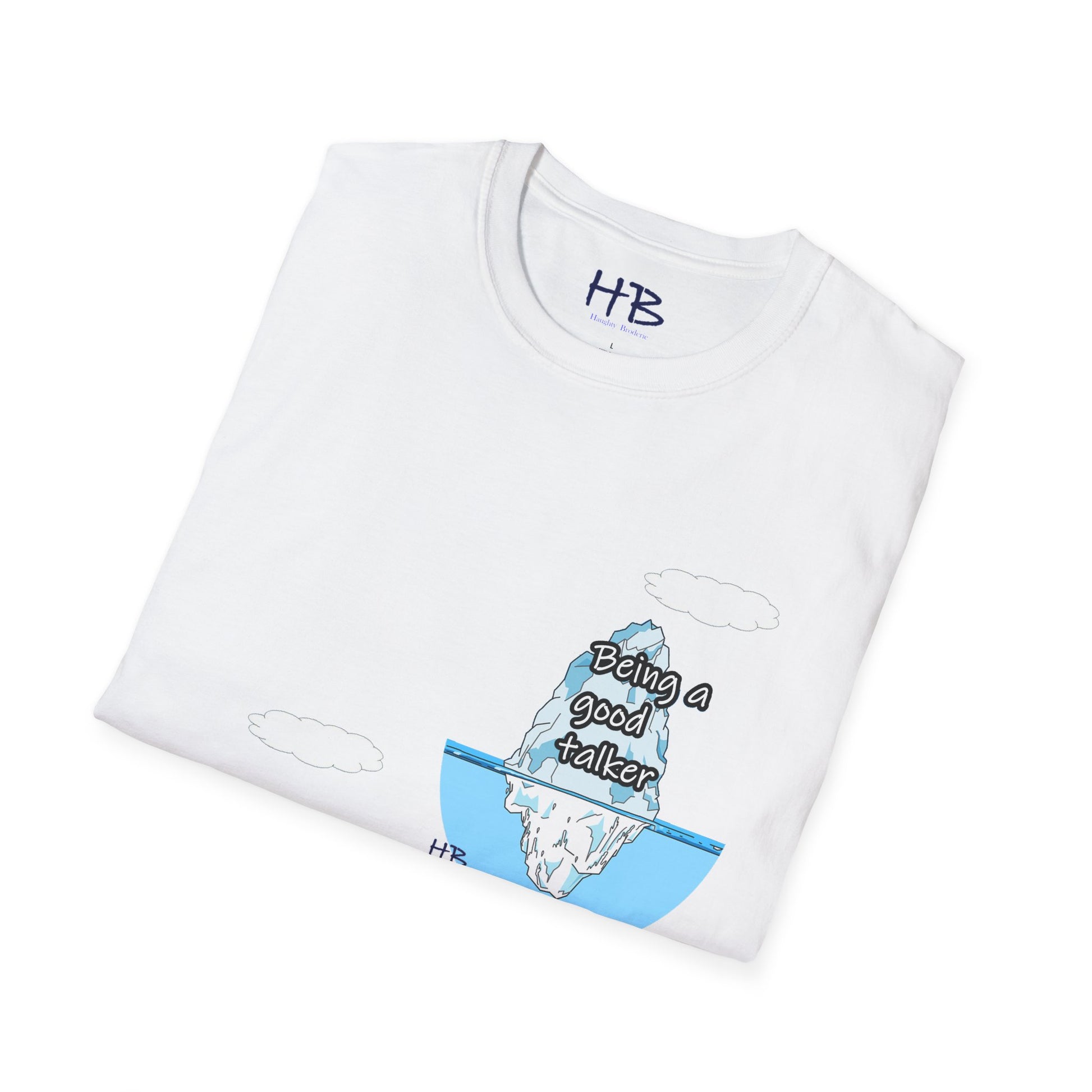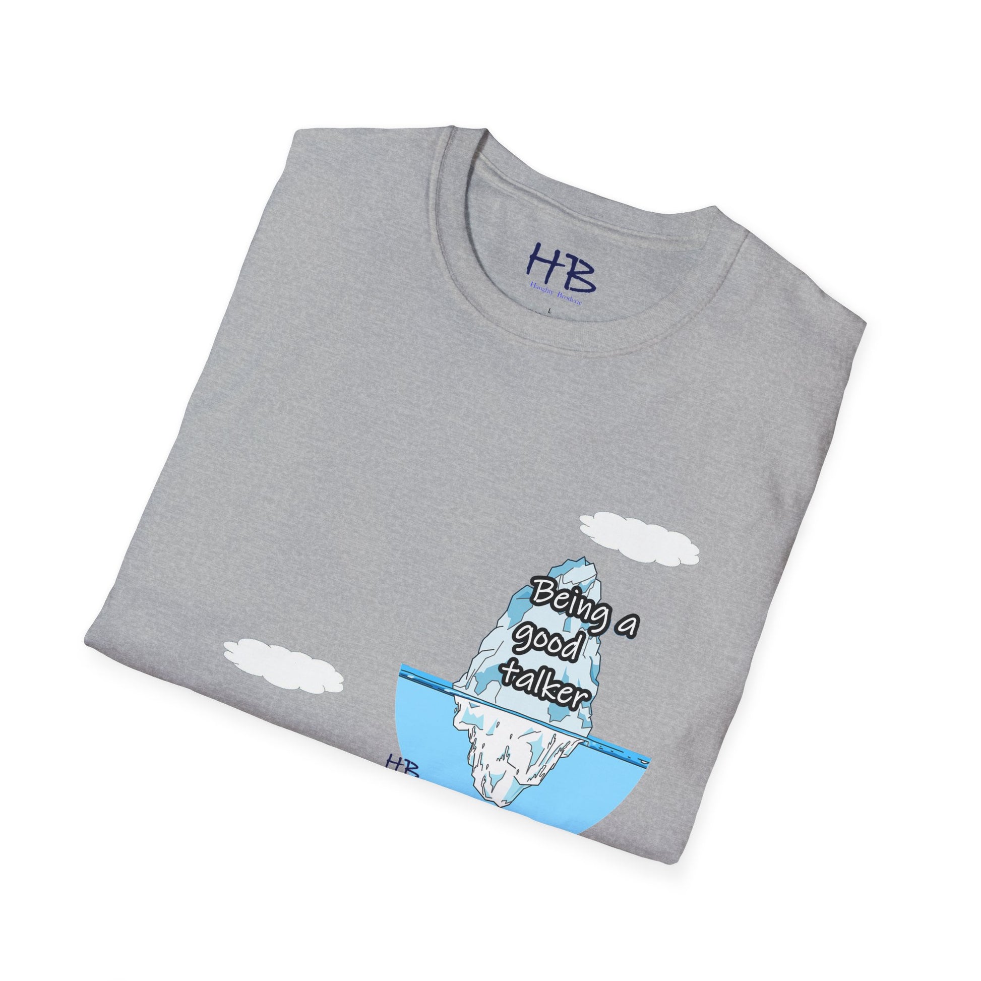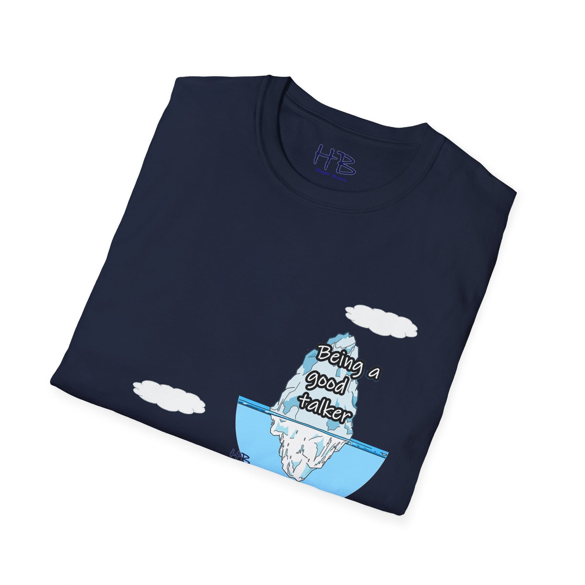 Embark on a journey of self-discovery and interpersonal growth as you proudly wear a tee shirt featuring two majestic icebergs. The first iceberg, gracefully emerging above the water's surface, symbolizes the art of being a good talker. The subtle yet powerful message is conveyed through its imposing presence, mirroring the importance of articulation in our daily lives.