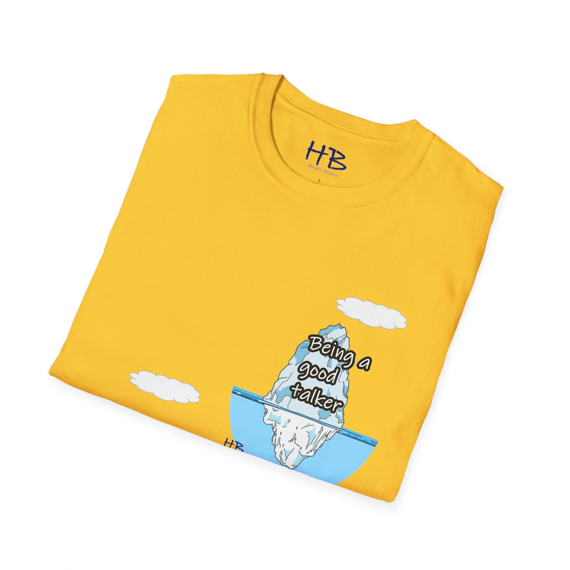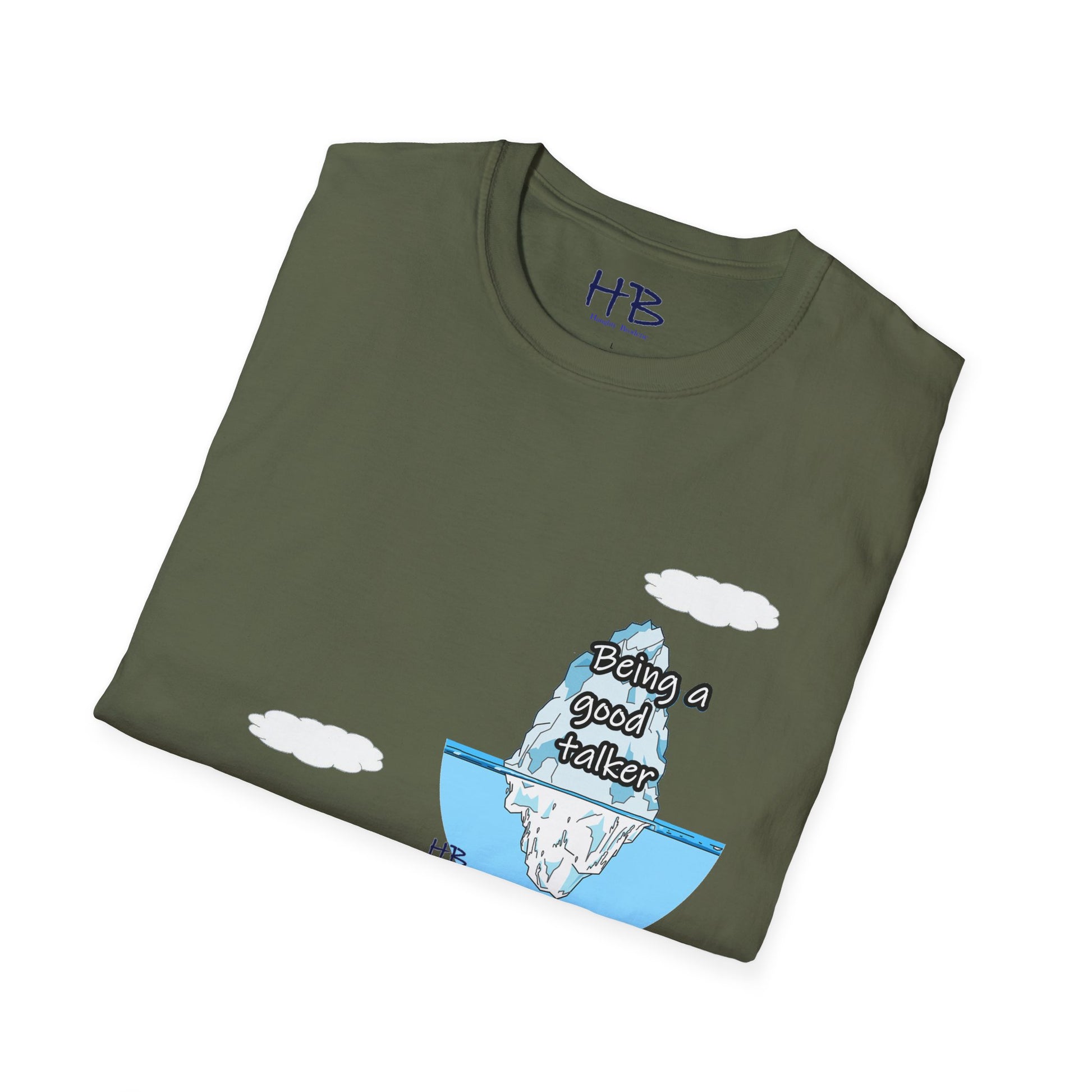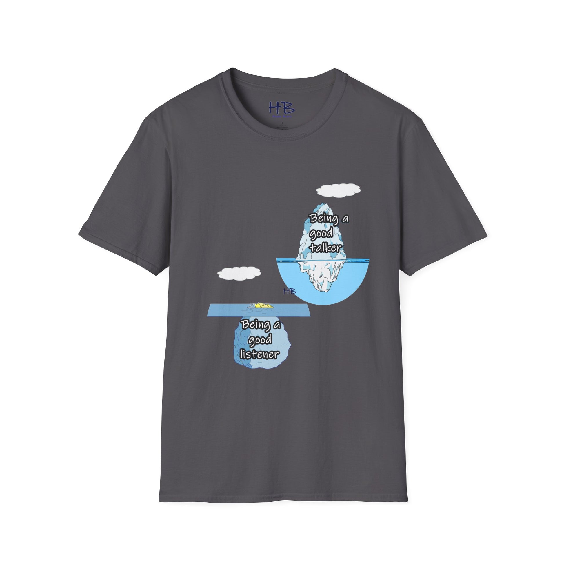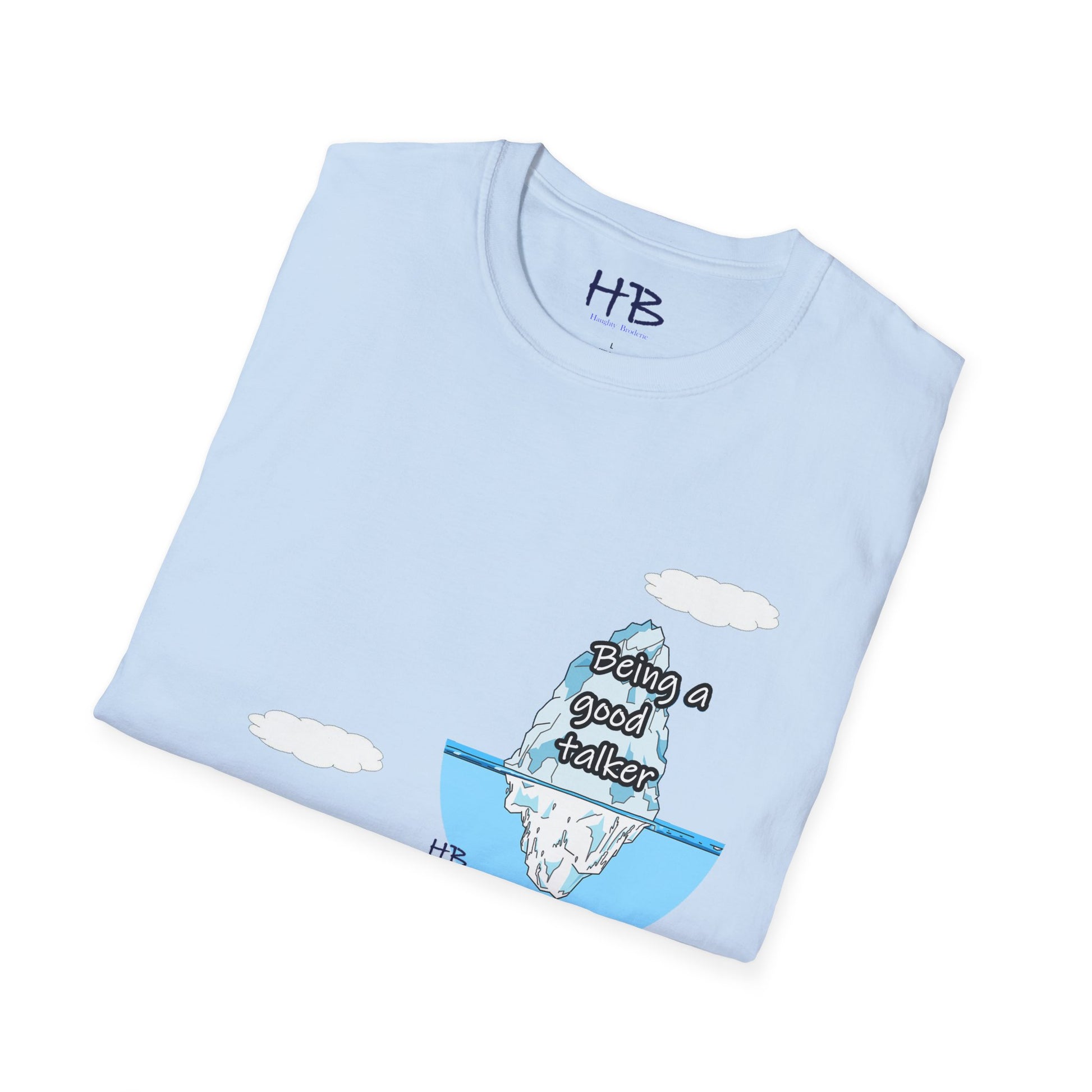 Embark on a journey of self-discovery and interpersonal growth as you proudly wear a tee shirt featuring two majestic icebergs. The first iceberg, gracefully emerging above the water's surface, symbolizes the art of being a good talker. The subtle yet powerful message is conveyed through its imposing presence, mirroring the importance of articulation in our daily lives.