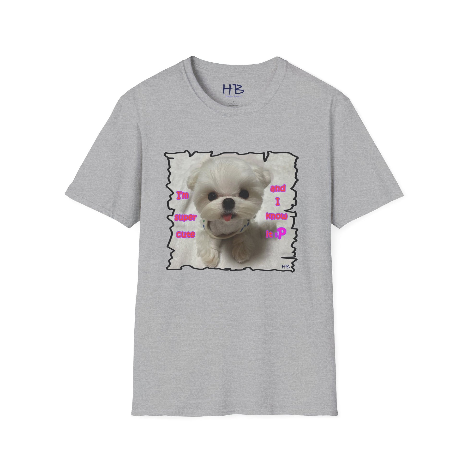 The design of this shirt is sure to make heads turn, featuring a charming pup who is clearly comfortable in front of the camera. The text "I'm super cute, and I know it :P" adds a touch of humor to the design and highlights the playful nature of the shirt.