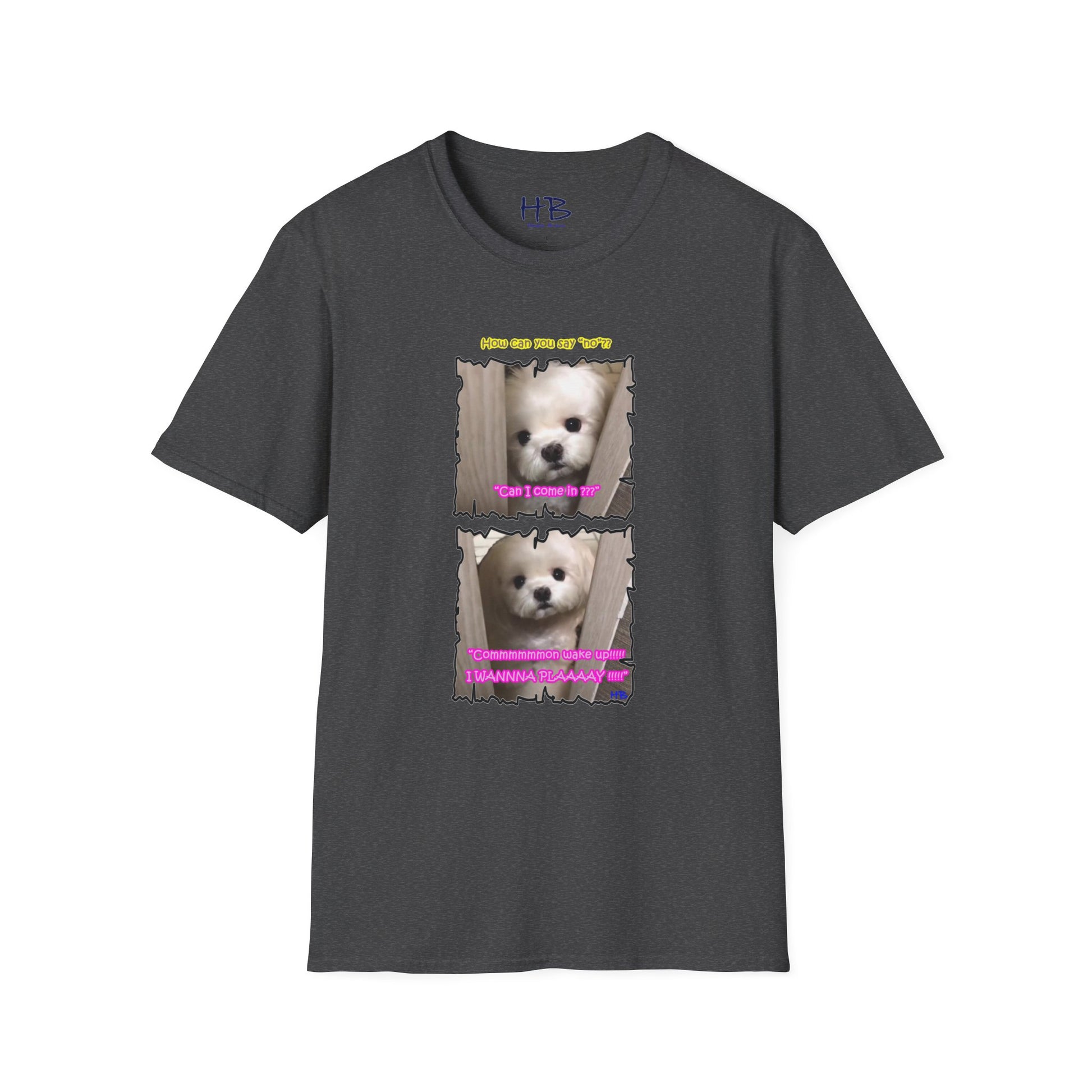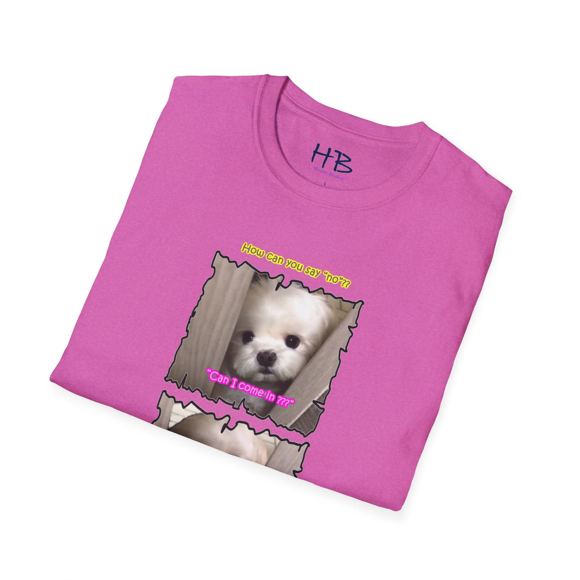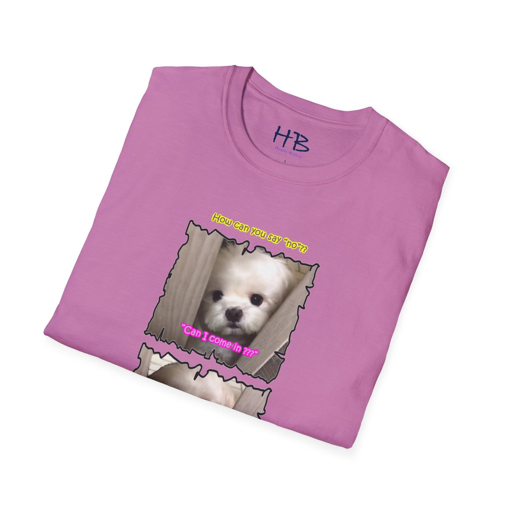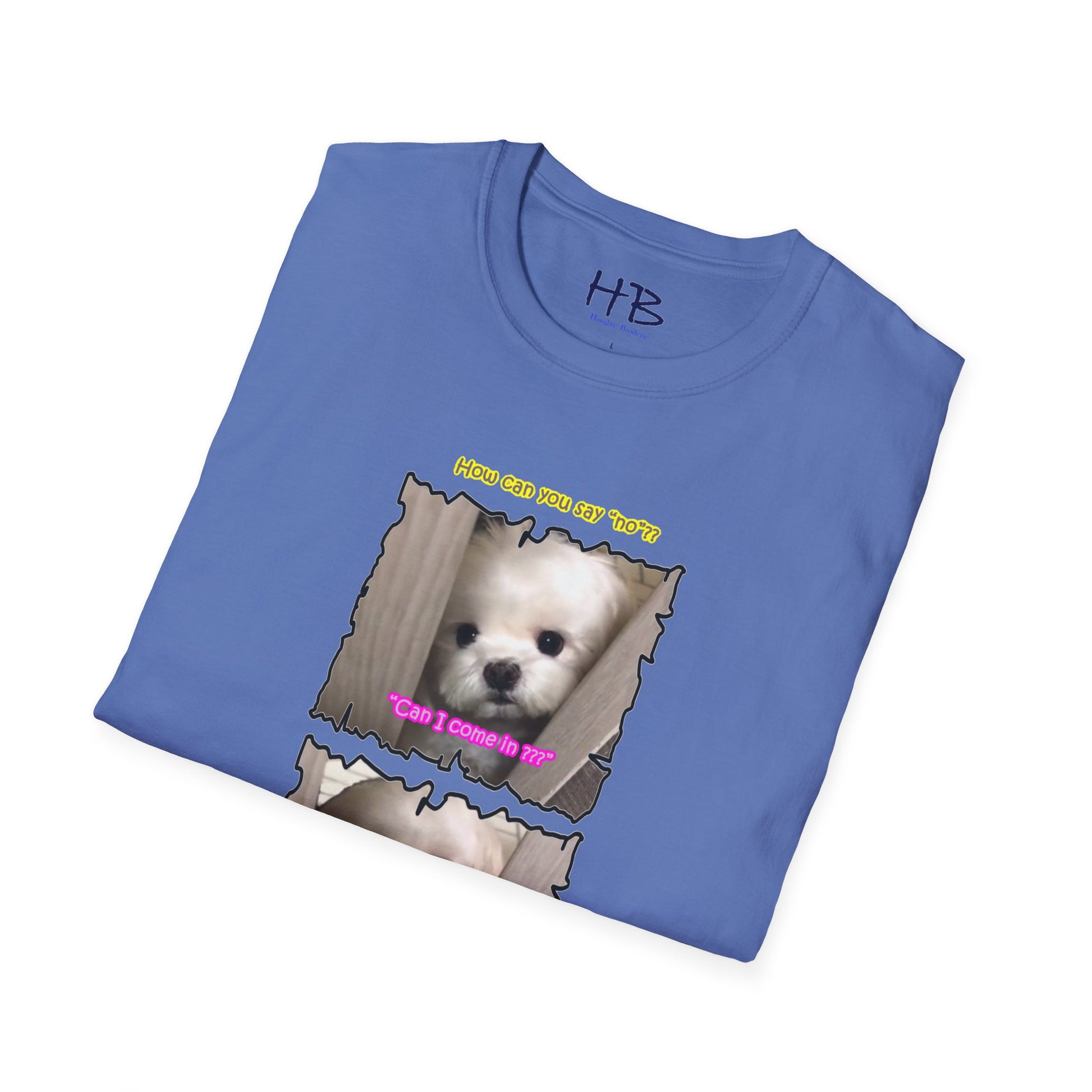 Introducing our latest tee shirt design, perfect for all dog lovers out there! Have you ever seen a more adorable creature than a bichon maltese? This tee shirt features an image of the cutest baby bichon maltese peeking inside a wooden door with its gigantic timid cute black eyes and poking miniature nose. The top of the image reads "How can you say no??" because we know it's impossible to resist the charm of this little pup.