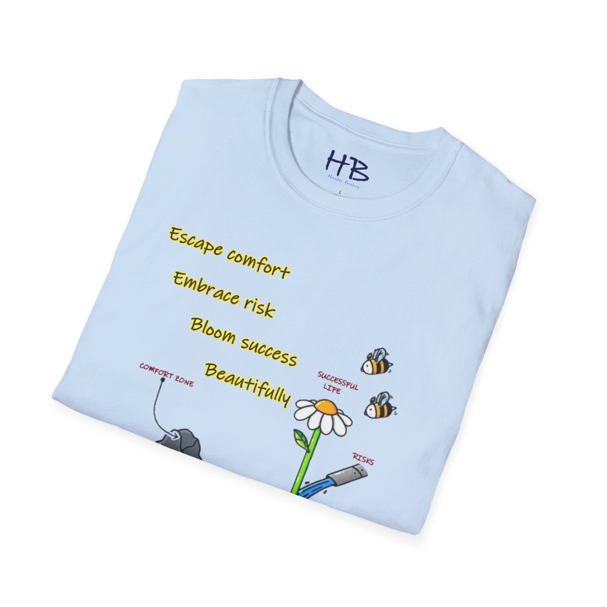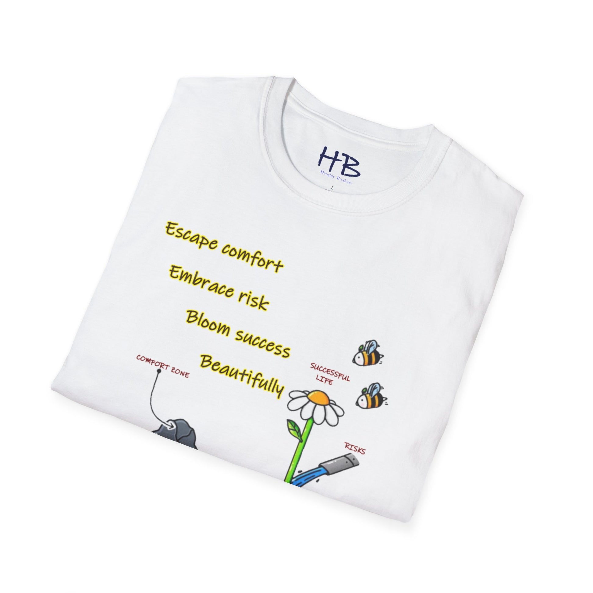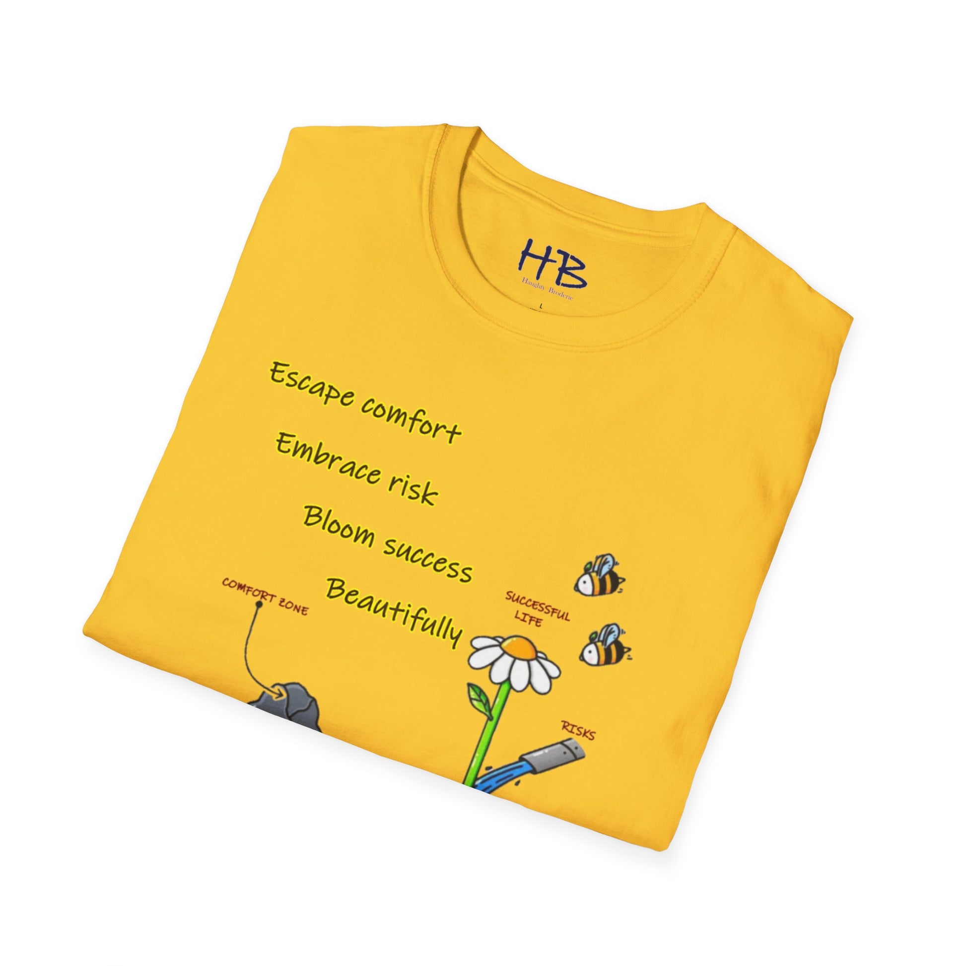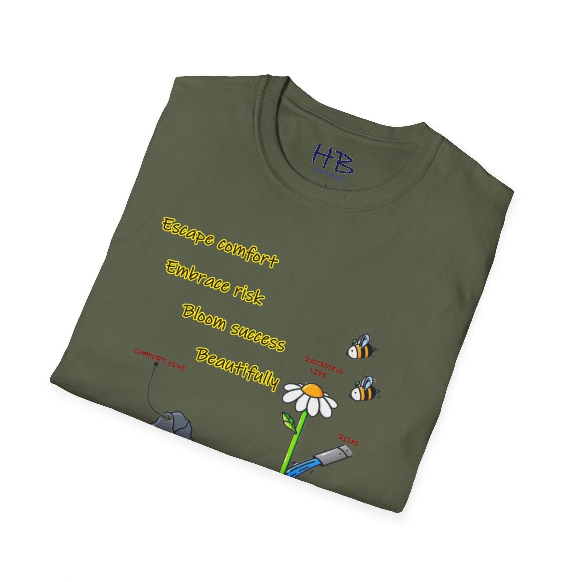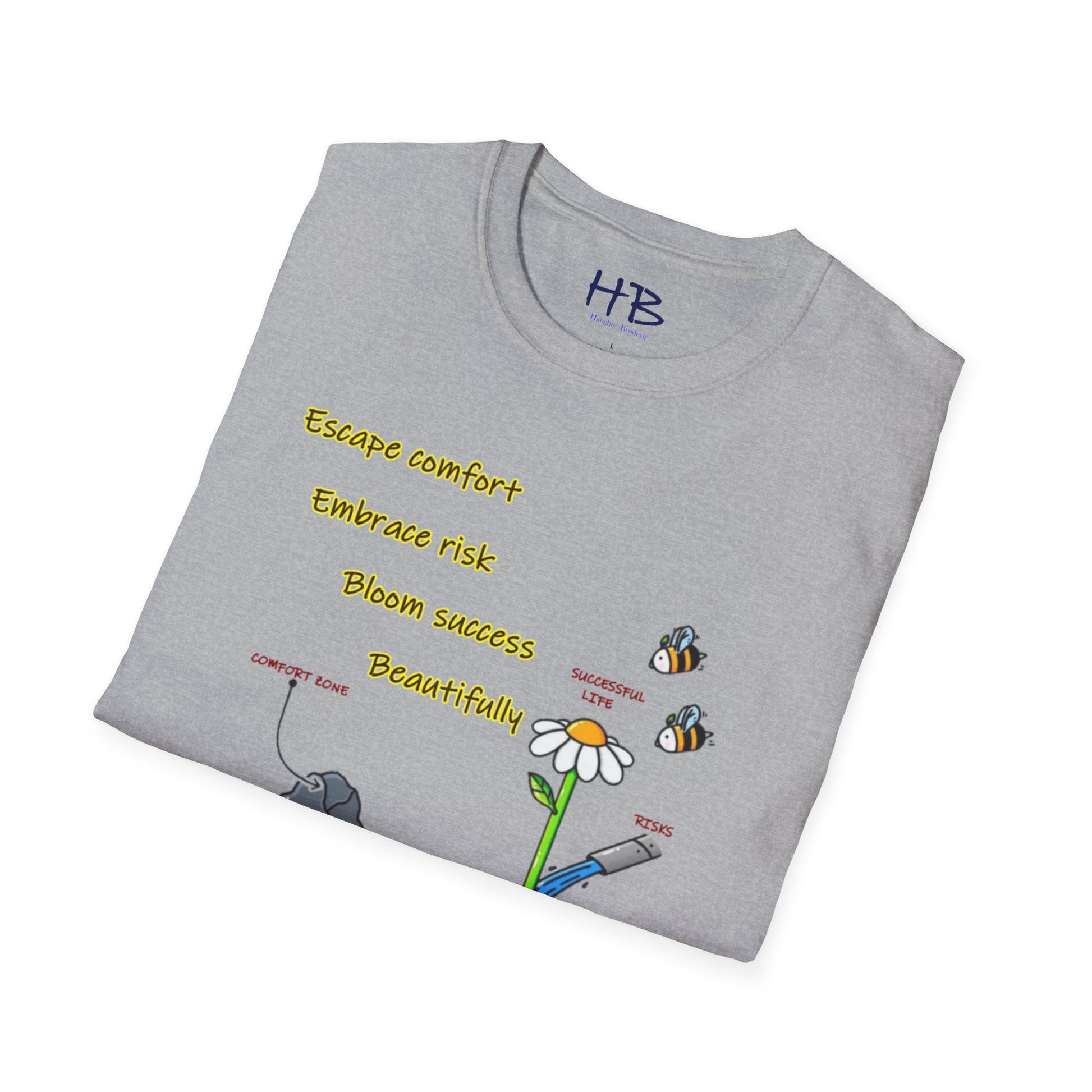 Etched beneath this vibrant tableau are words to live by: "Escape comfort, Embrace risk, bloom success beautifully." Wear this emblem of resilience and ambition, inviting admiration and consensus from those attuned to the resonances of achievement. As you embrace the dynamic interplay of imagery and text, you not only don a garment but also embody a philosophy—a manifesto for a life lived boldly, outside the confines of the ordinary.