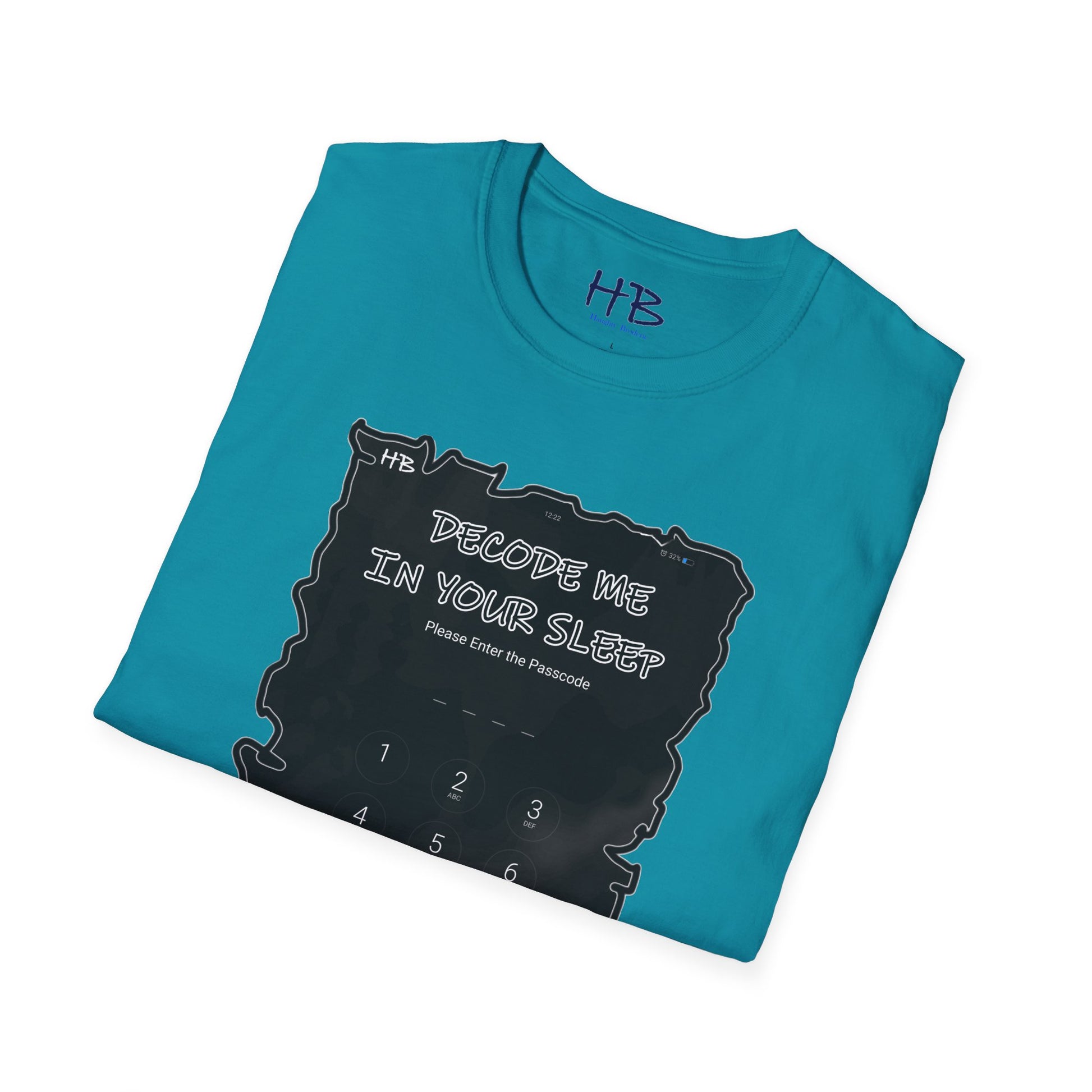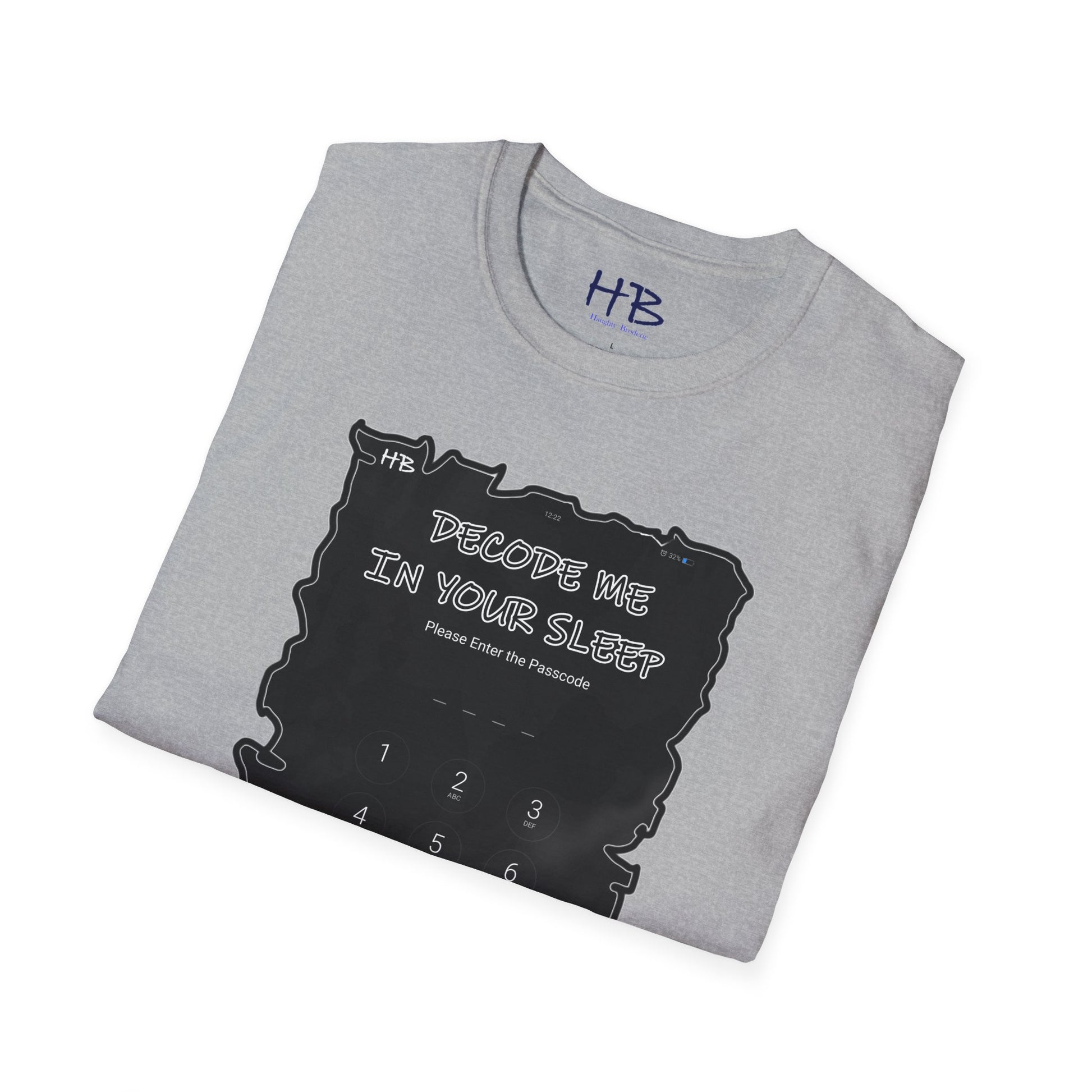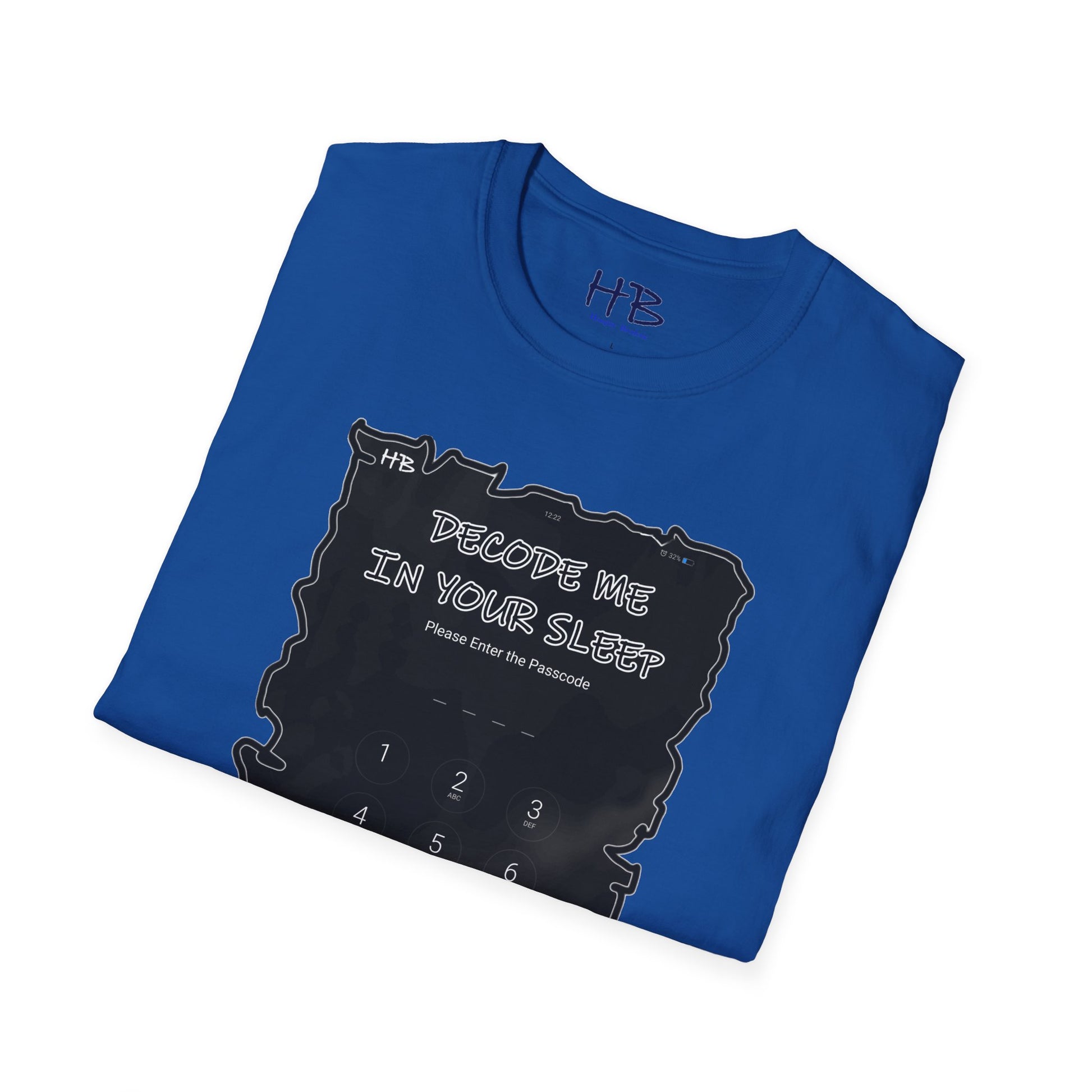 Step into a realm of intriguing mystique with our Decode Me In Your Sleep T-shirt, a wearable masterpiece that transcends the ordinary. Picture this: a captivating scene captured within the confines of a smartphone screen, a digital doorway to an enigmatic universe. The passcode, a key to unlock not just a device but an entire personality. "DECODE ME IN YOUR SLEEP" boldly etched across the screen, inviting curious gazes to delve into the depths of the wearer's persona.
