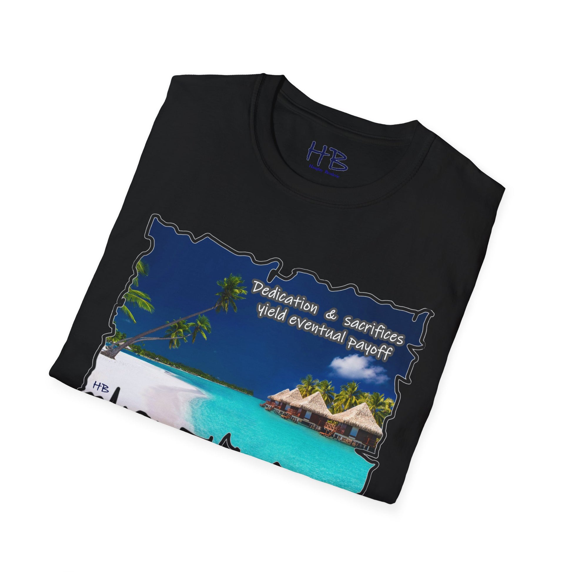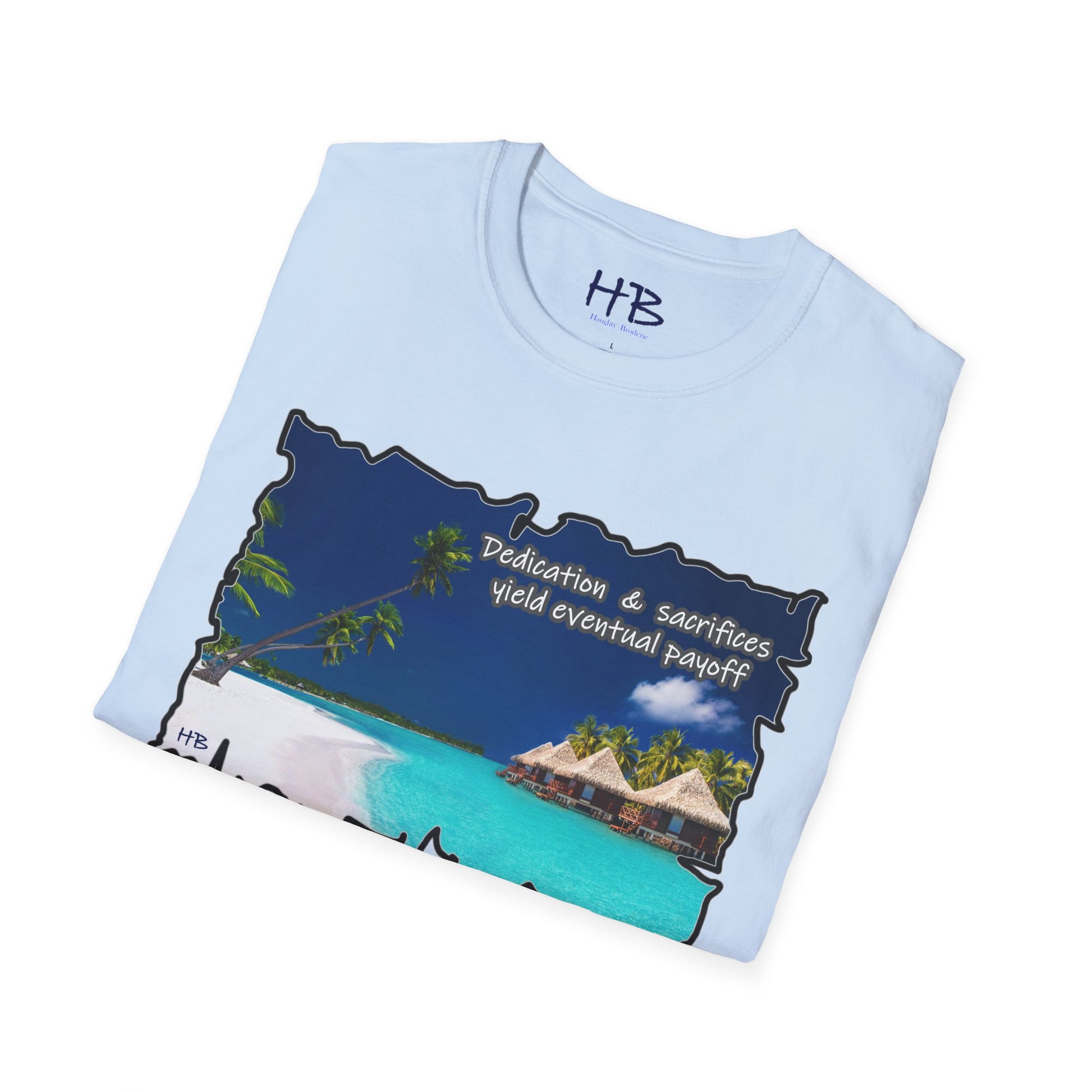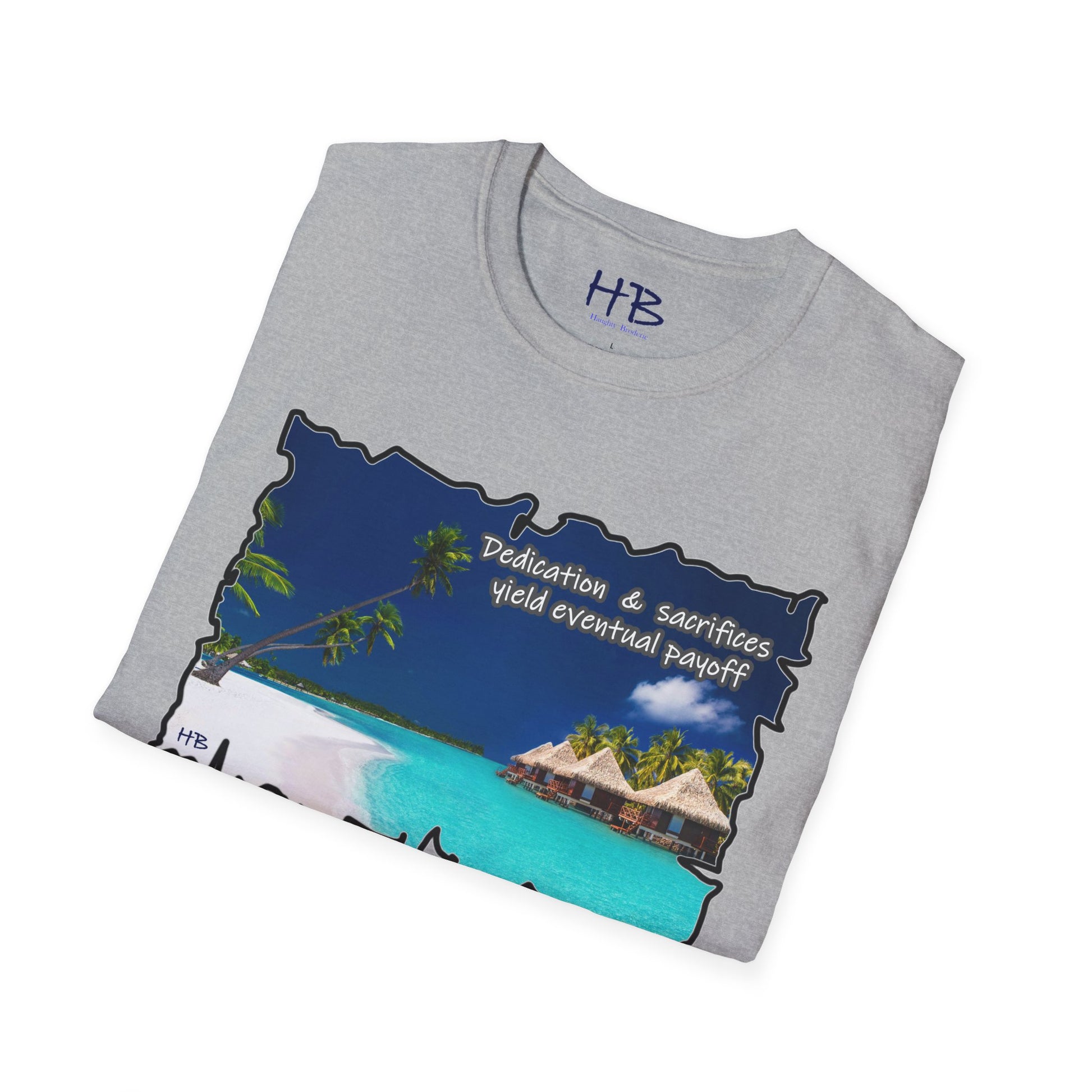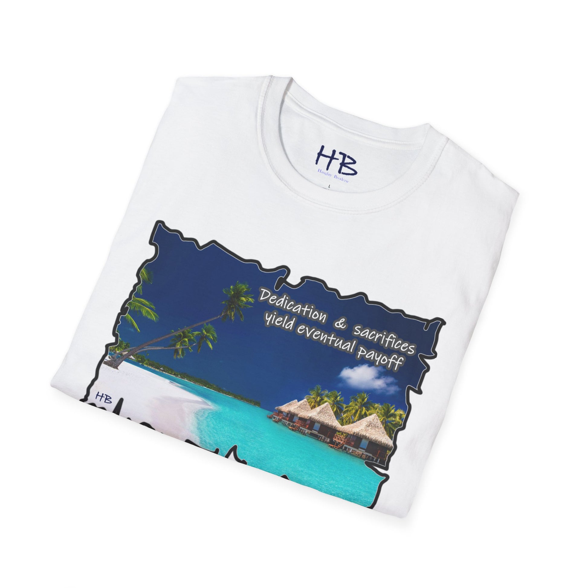 This t-shirt is more than a garment; it's a portal to a world where hard work meets its ultimate reward. The image, a testament to the allure of an expensive destination, portrays the very essence of a sought-after retreat, a place where individuals toil throughout the year with unwavering determination, yearning for the privilege of dipping their toes into the baby blue ocean and feeling the soft embrace of the immaculate white sand beneath their feet. The high-rise resort, standing tall as a symbol of luxury, promises an experience akin to royalty, where the dedicated are treated as kings.