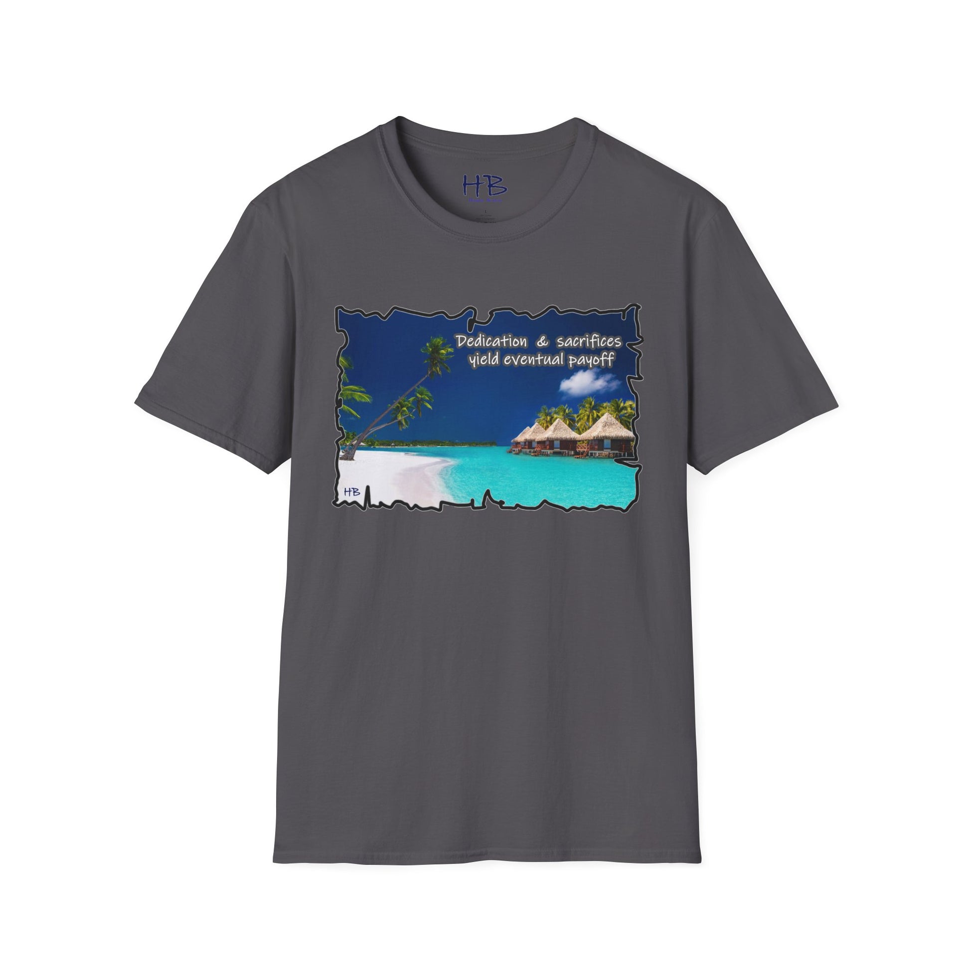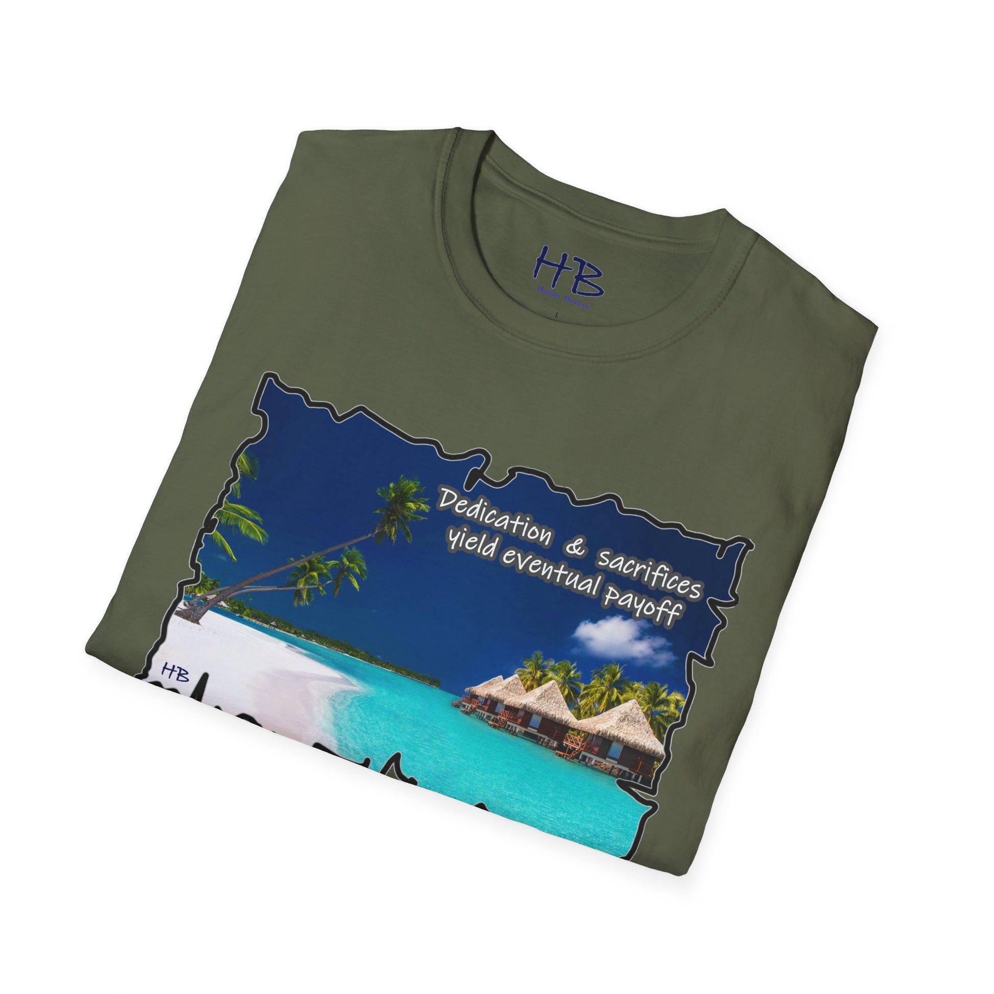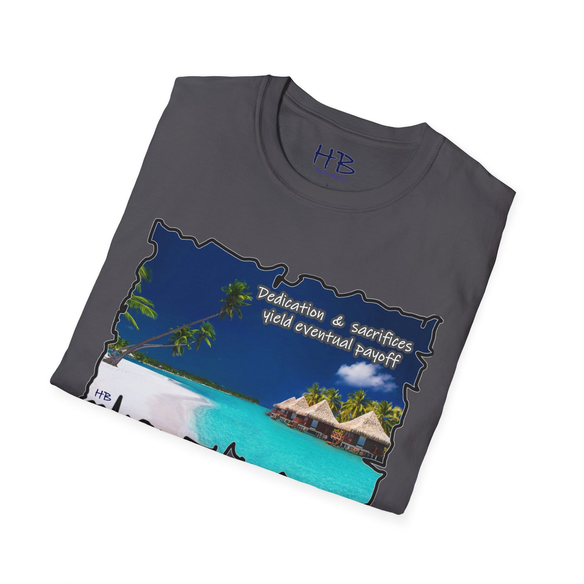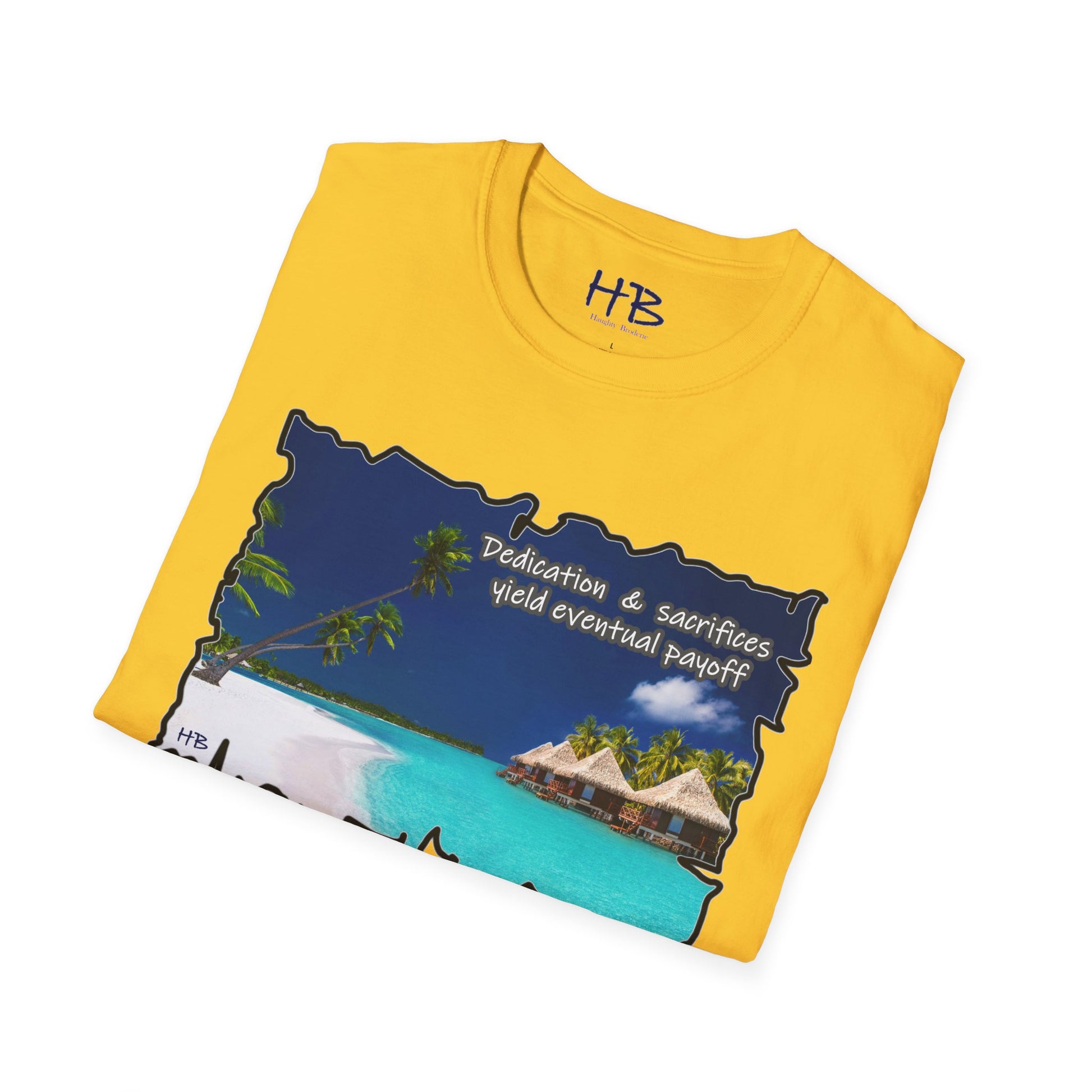 This t-shirt is more than a garment; it's a portal to a world where hard work meets its ultimate reward. The image, a testament to the allure of an expensive destination, portrays the very essence of a sought-after retreat, a place where individuals toil throughout the year with unwavering determination, yearning for the privilege of dipping their toes into the baby blue ocean and feeling the soft embrace of the immaculate white sand beneath their feet. The high-rise resort, standing tall as a symbol of luxury, promises an experience akin to royalty, where the dedicated are treated as kings.