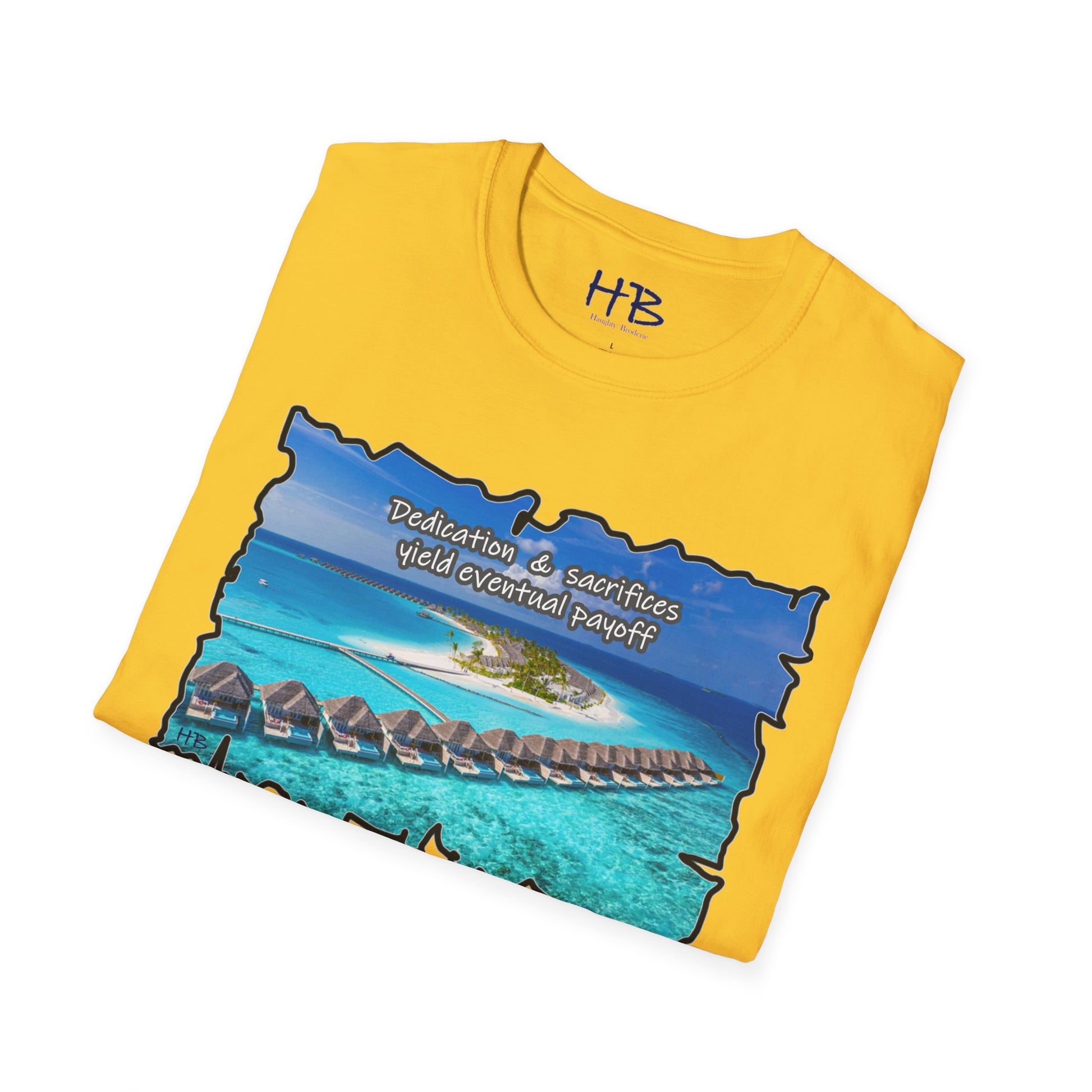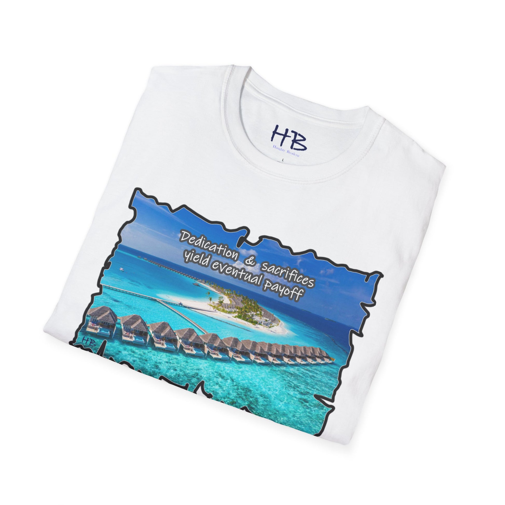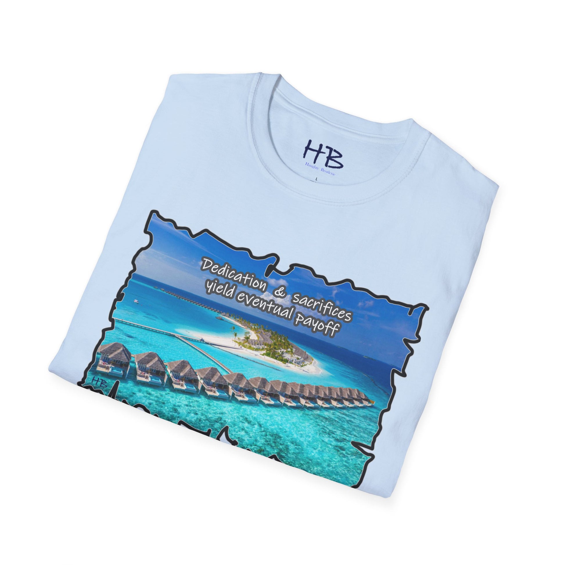 This wearable masterpiece extends beyond mere fabric; it encapsulates the yearning for an exclusive retreat, a destination reserved for those who toil diligently throughout the year. The subtle palette of light blues, pristine whites, and the golden glow of luxury resorts narrates a tale of dedication and sacrifice, manifesting in the lavish rewards of a dream fulfilled. The phrase "Dedication & sacrifices yield eventual payoff" elegantly etched onto the canvas serves as a constant reminder that persistence and hard work pave the path to desired destinations.