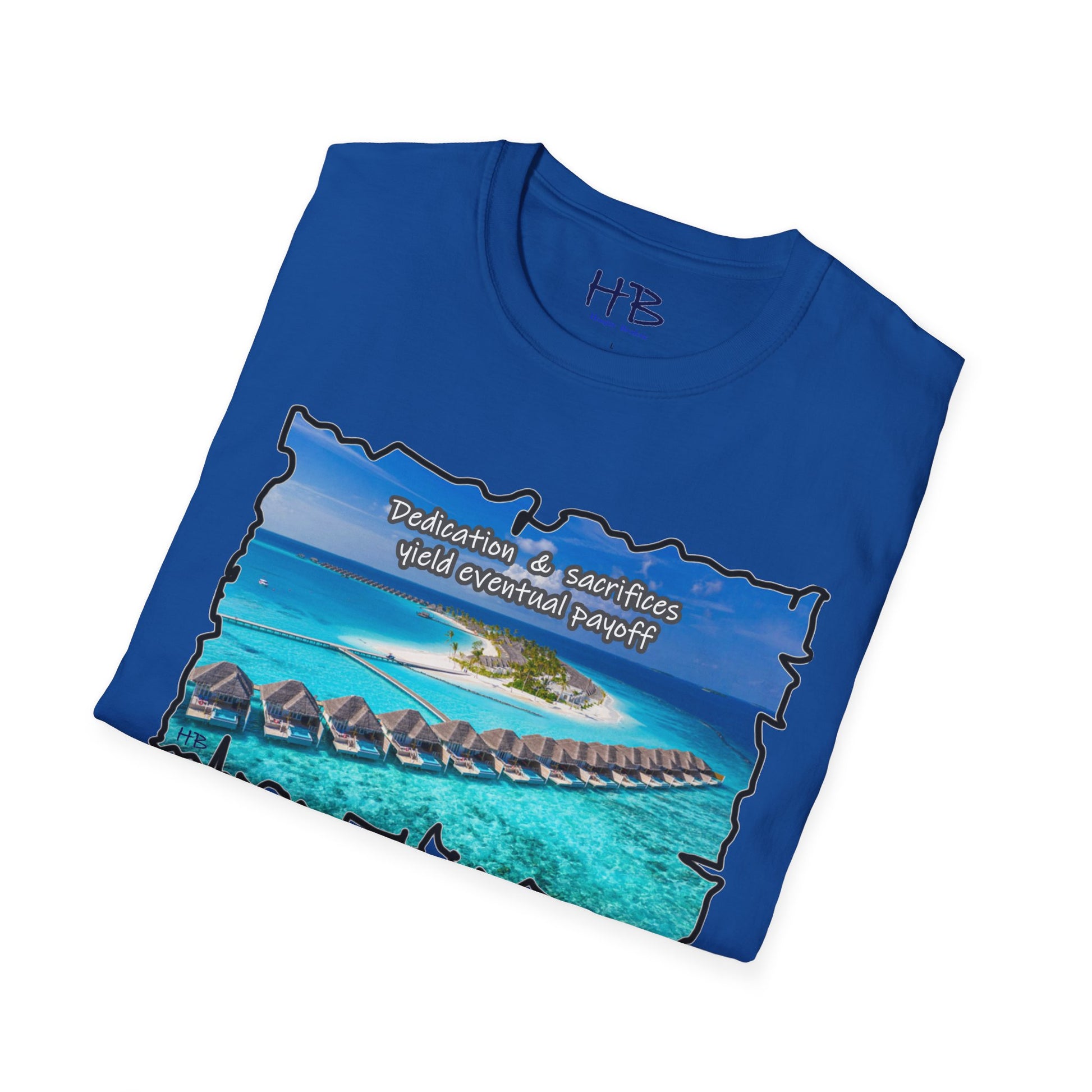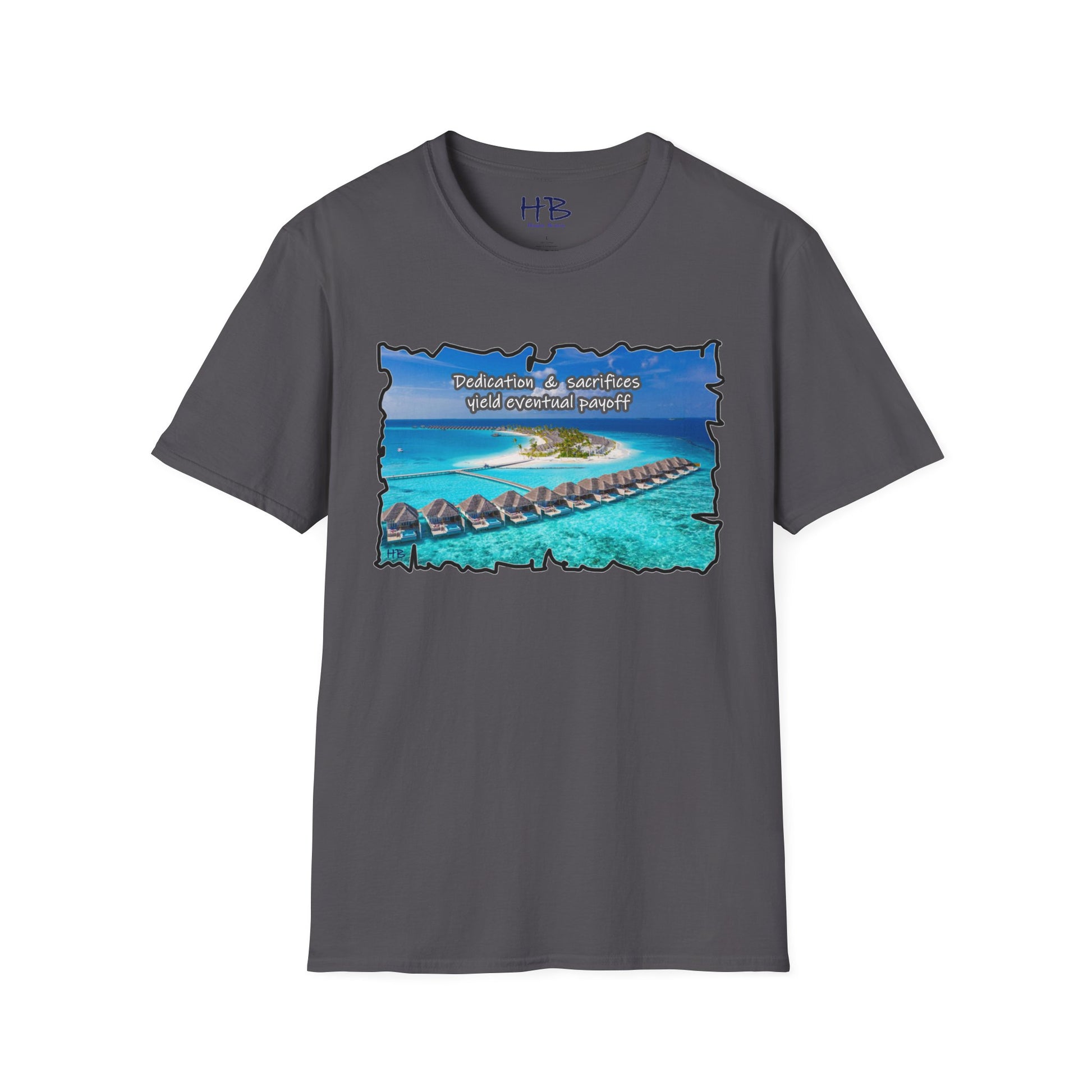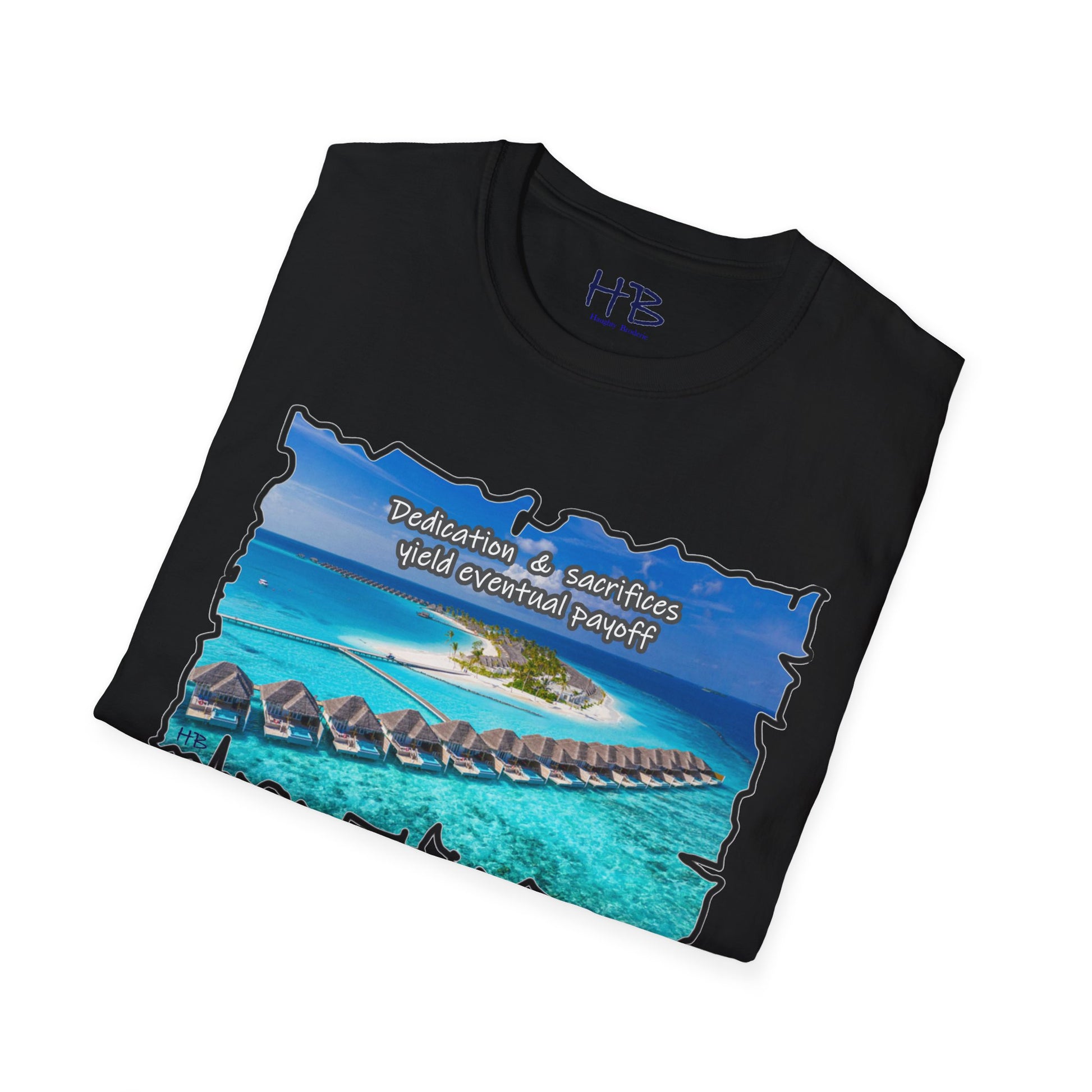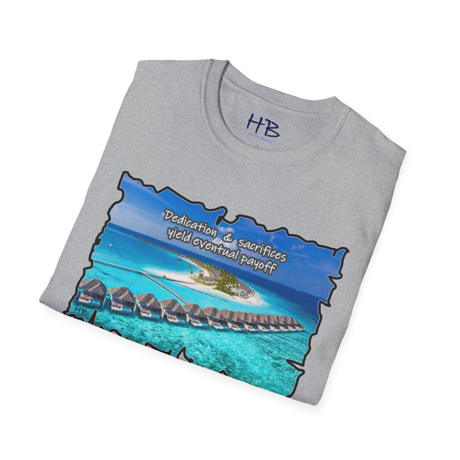 This wearable masterpiece extends beyond mere fabric; it encapsulates the yearning for an exclusive retreat, a destination reserved for those who toil diligently throughout the year. The subtle palette of light blues, pristine whites, and the golden glow of luxury resorts narrates a tale of dedication and sacrifice, manifesting in the lavish rewards of a dream fulfilled. The phrase "Dedication & sacrifices yield eventual payoff" elegantly etched onto the canvas serves as a constant reminder that persistence and hard work pave the path to desired destinations.