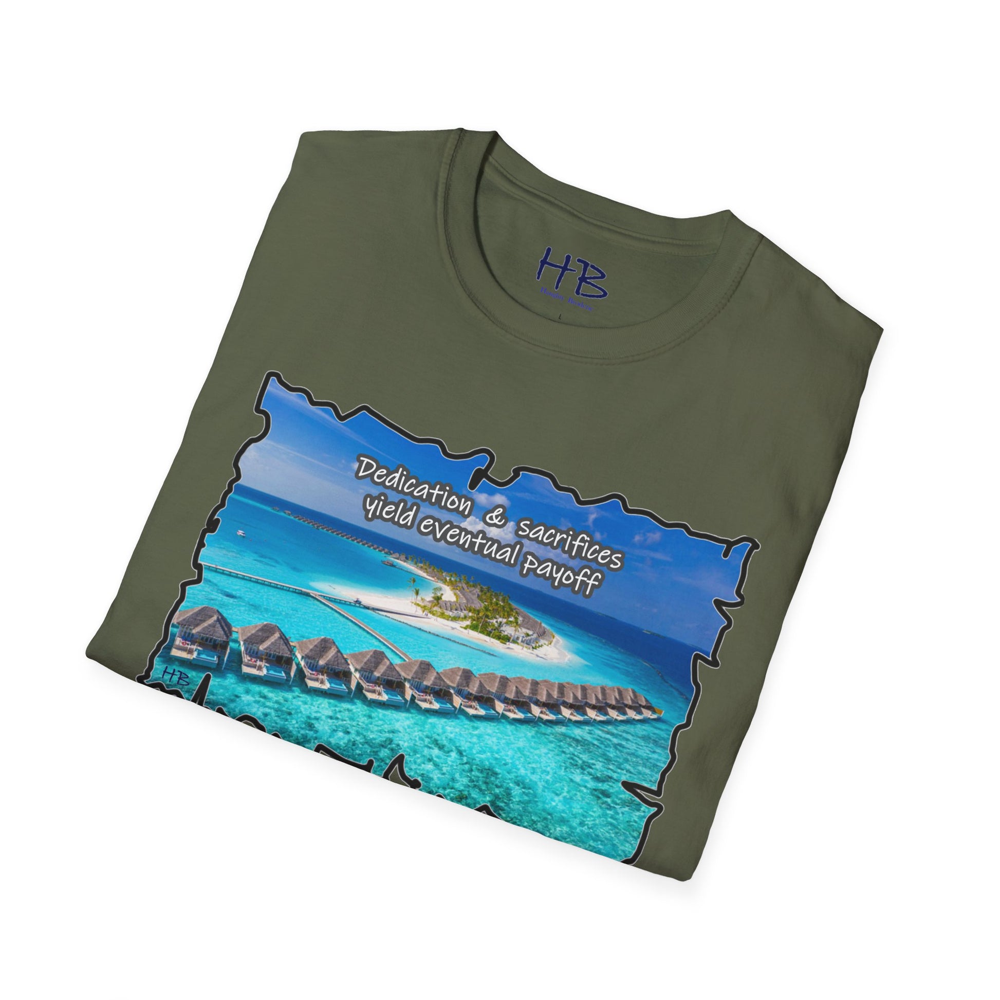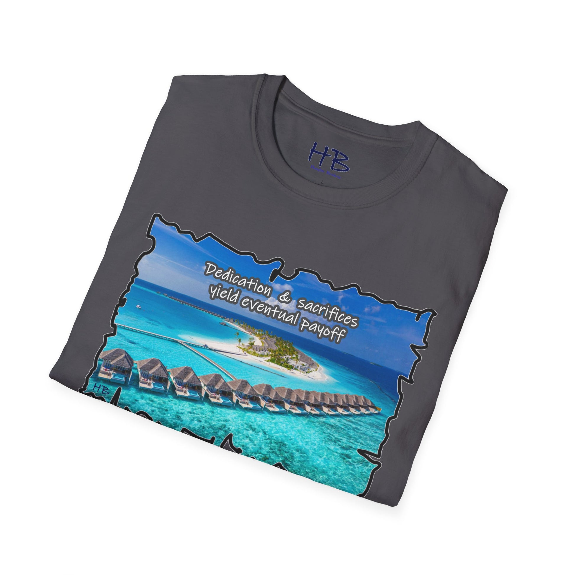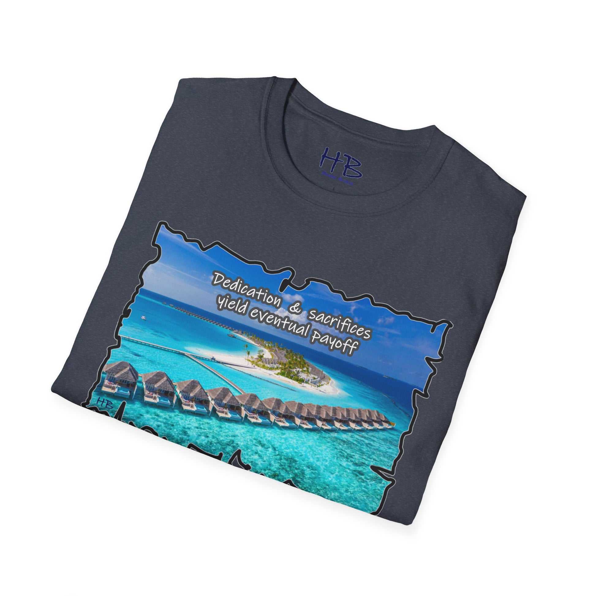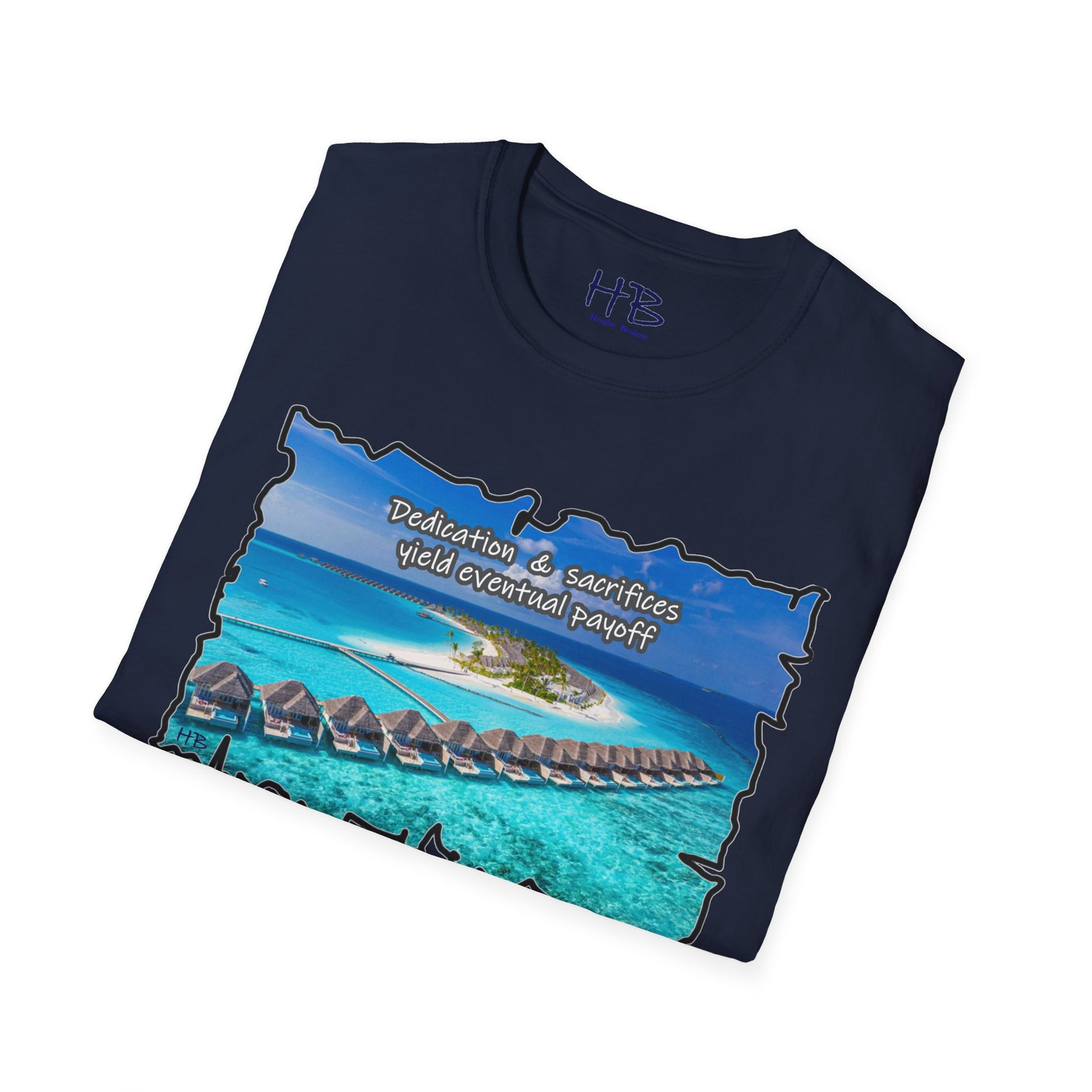 Embark on a visual journey with our exclusive Paradise Aspiration T-Shirt, an embodiment of opulence and aspiration that beckons the soul. Picture this: a celestial haven in the Maldives, where azure waters gently caress the shores of a petite sandy isle, cradling it in a cocoon of tranquility. Above, the heavens mirror the ocean's hue, presenting a crystal clear sky that frames a row of ethereal overwater bungalows. These floating sanctuaries, perched above the mesmerizing Indian Ocean, create an idyllic panorama that captures the essence of a luxurious escape.
