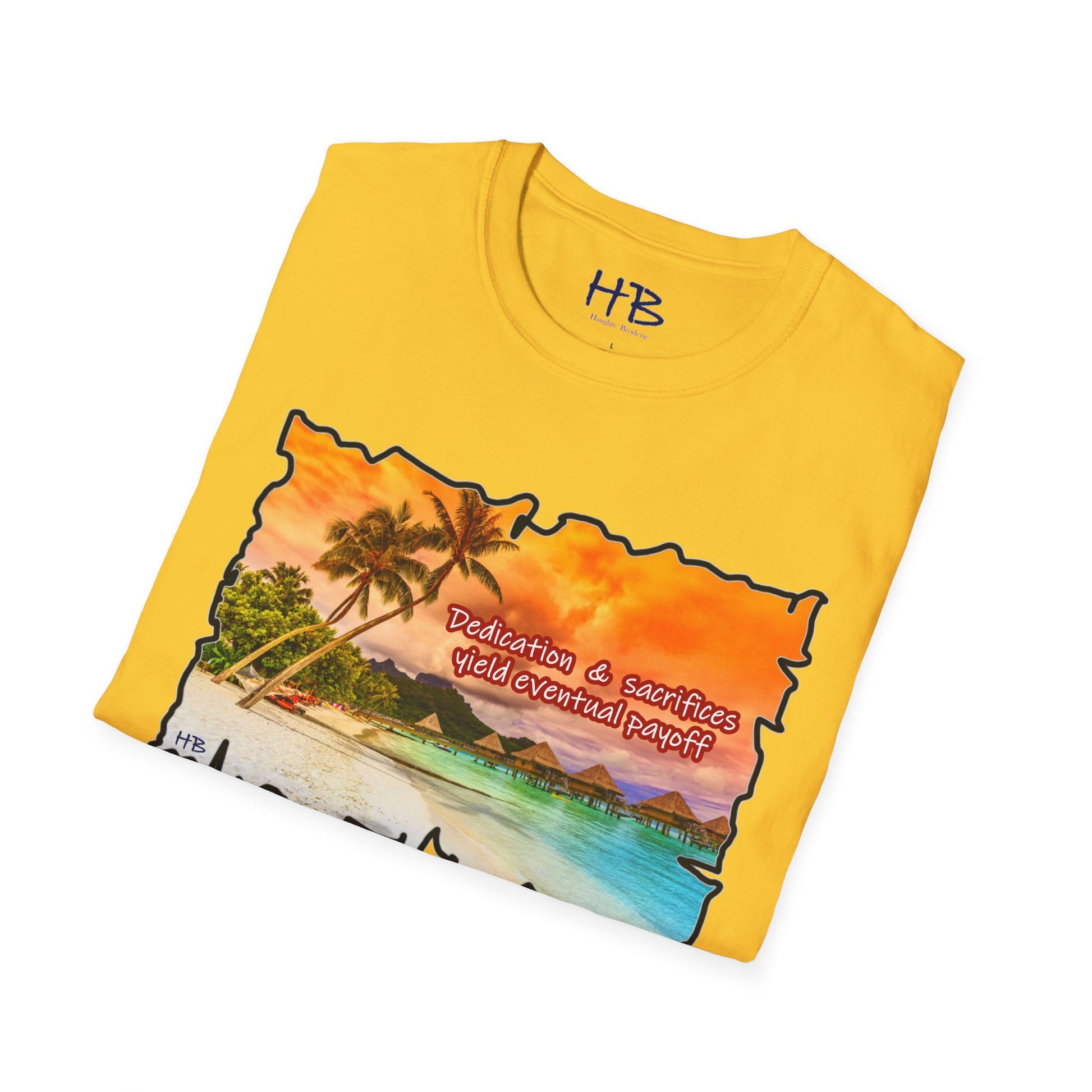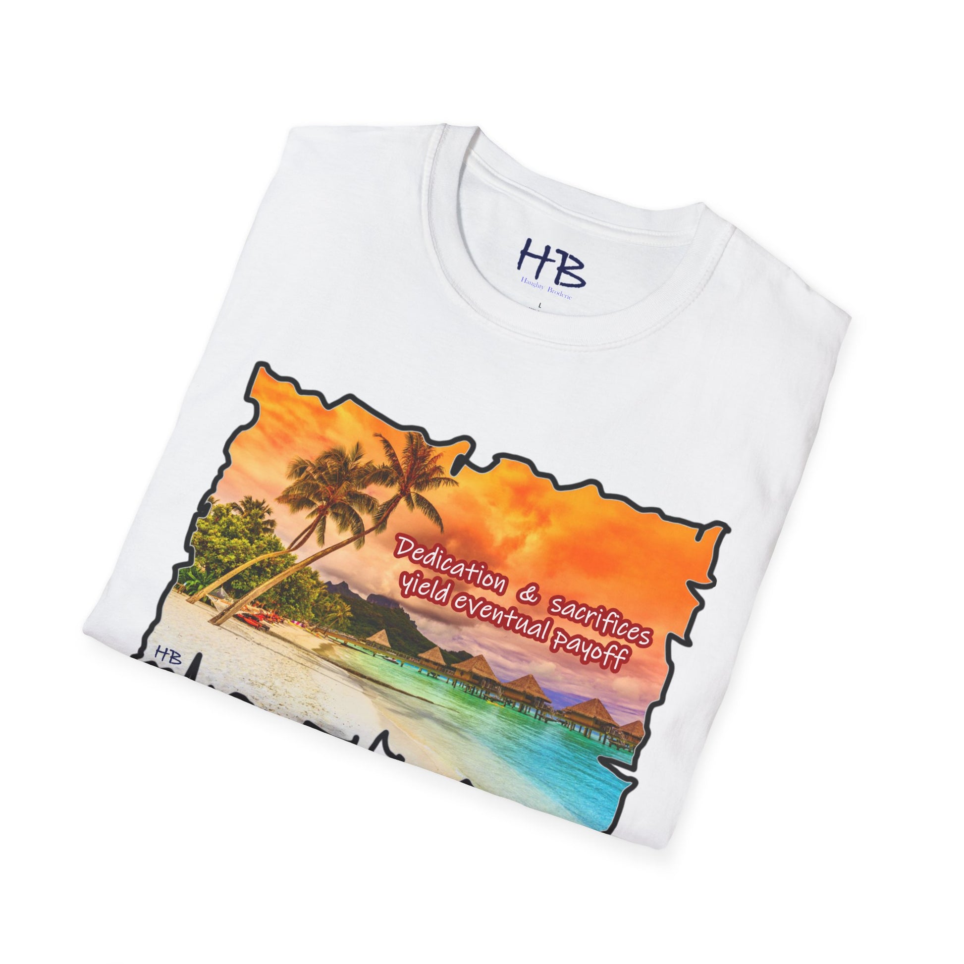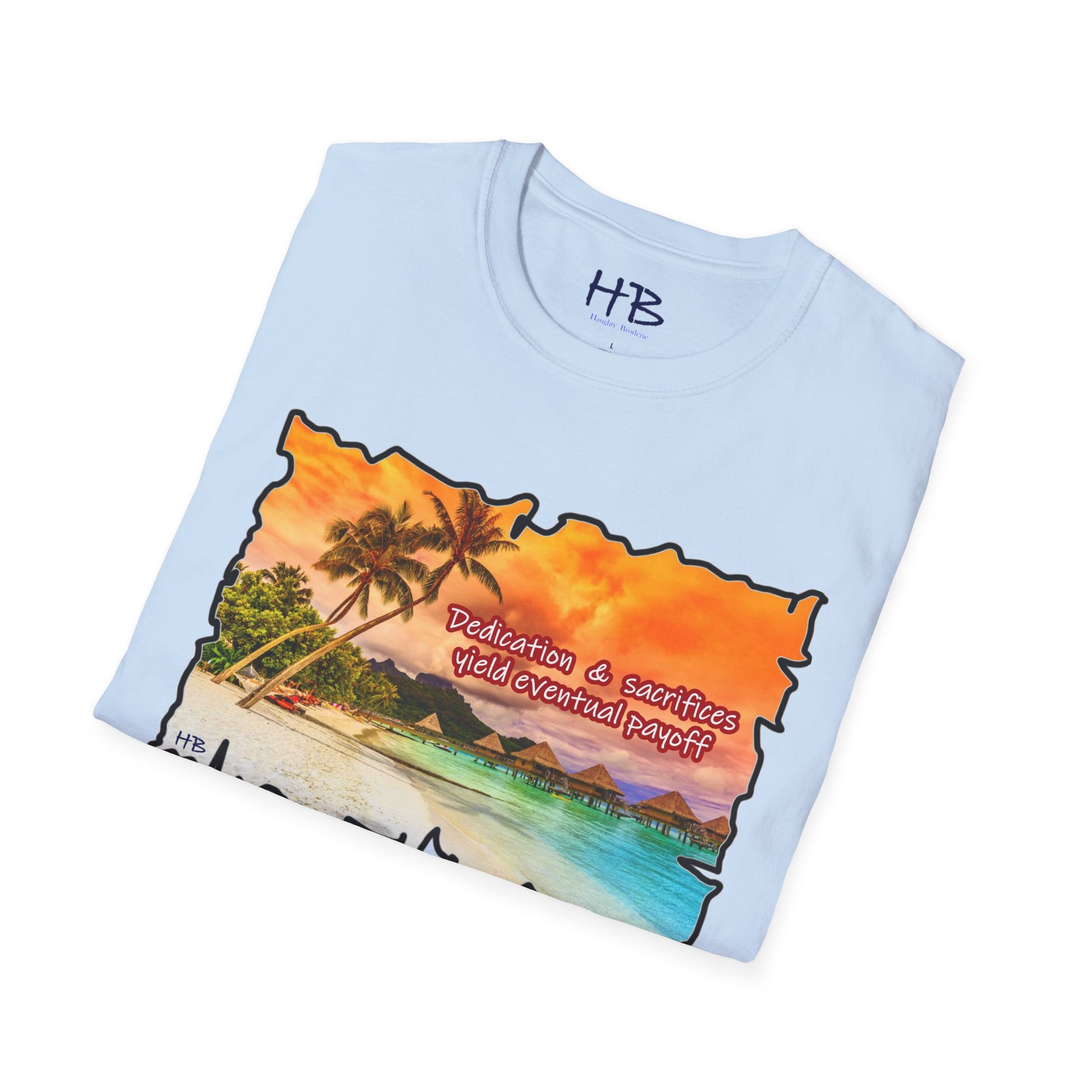 Wearing this t-shirt is not just adorning oneself with fabric; it's embracing a mindset of resilience, determination, and the pursuit of aspirations. Each detail on this shirt mirrors the coveted paradise – from the delicate baby blue shades of the ocean to the lush green mountains cradling the floating bungalows, symbolizing the fruits of relentless dedication.