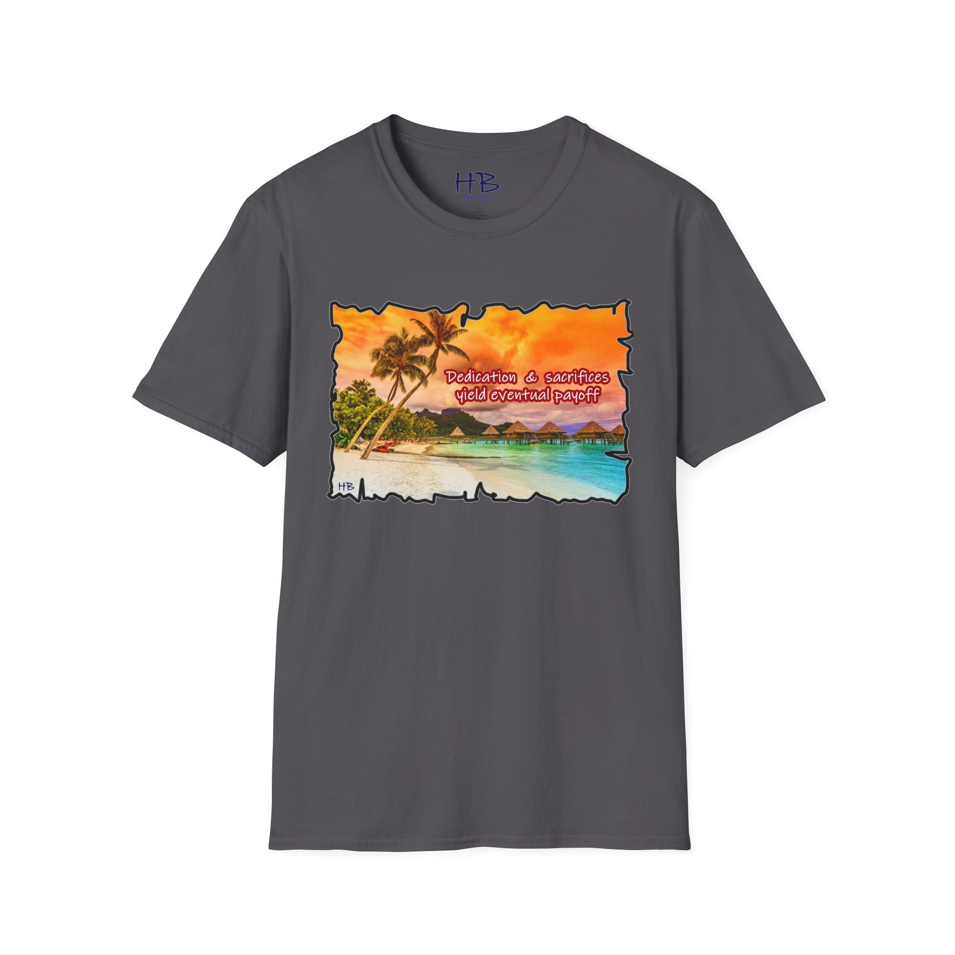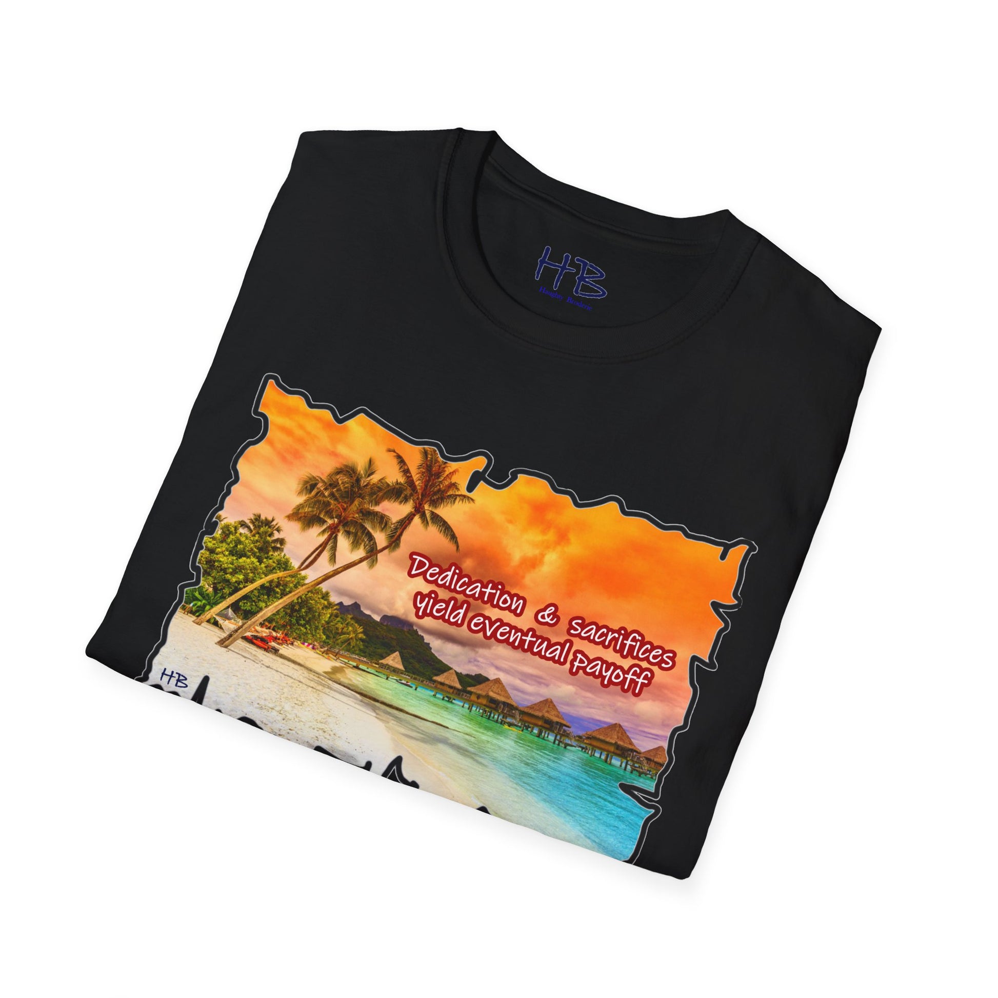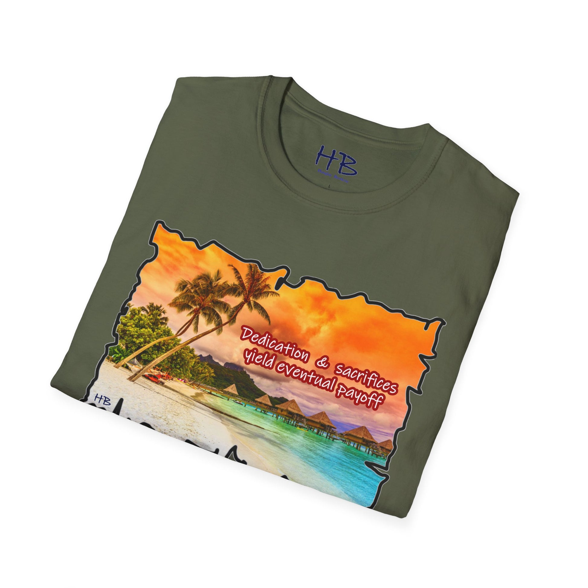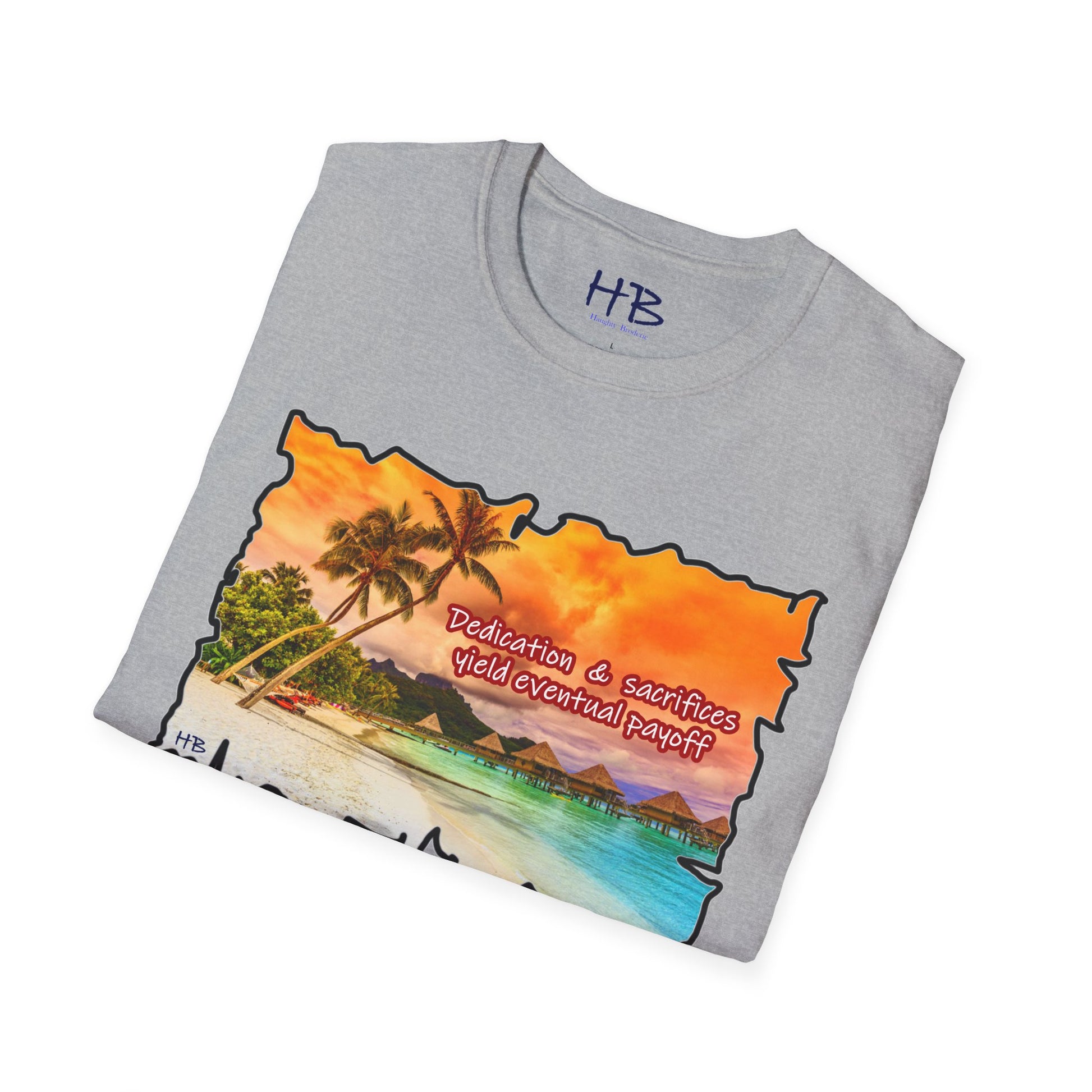 Wearing this t-shirt is not just adorning oneself with fabric; it's embracing a mindset of resilience, determination, and the pursuit of aspirations. Each detail on this shirt mirrors the coveted paradise – from the delicate baby blue shades of the ocean to the lush green mountains cradling the floating bungalows, symbolizing the fruits of relentless dedication.