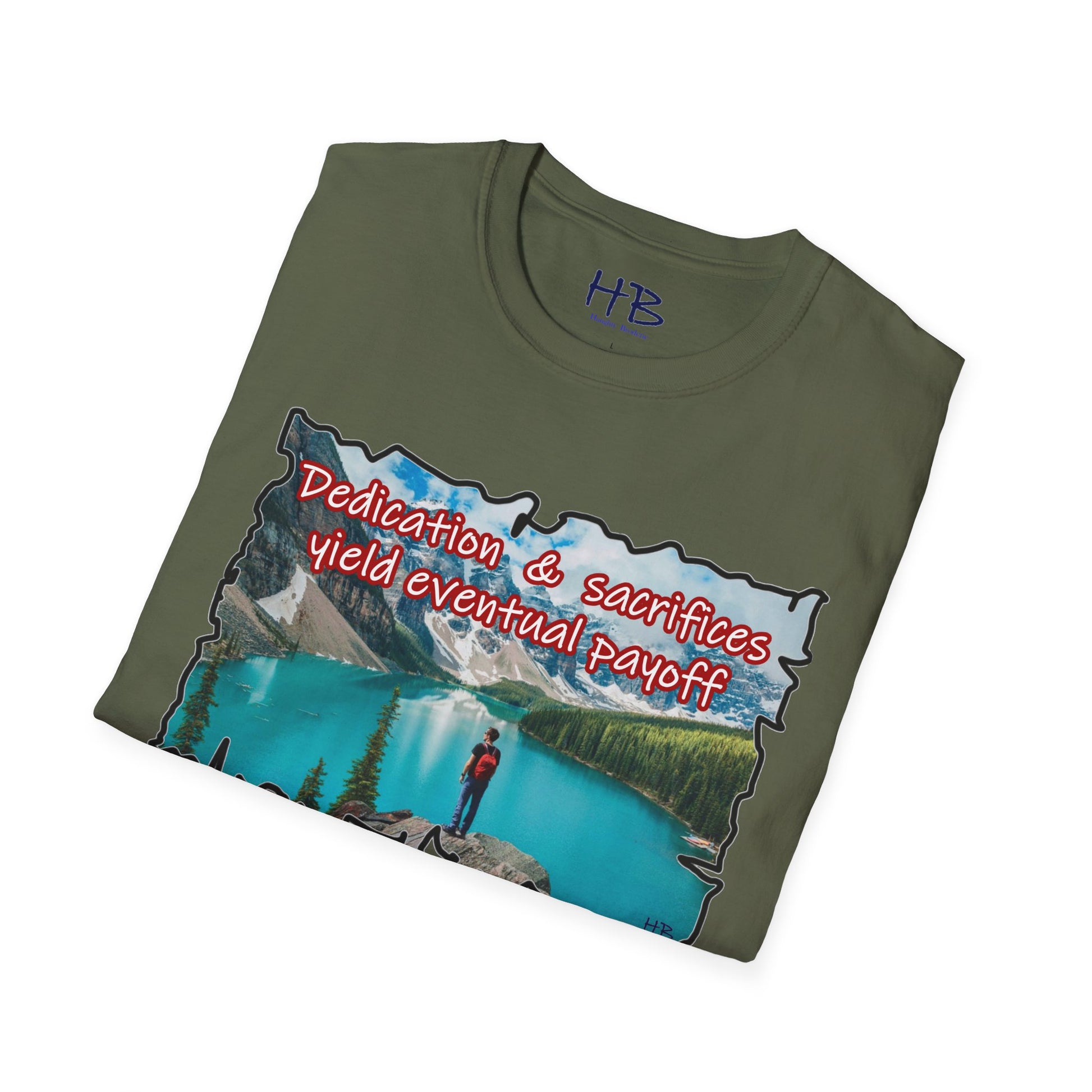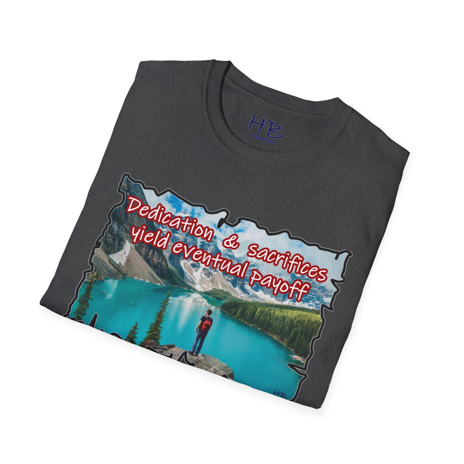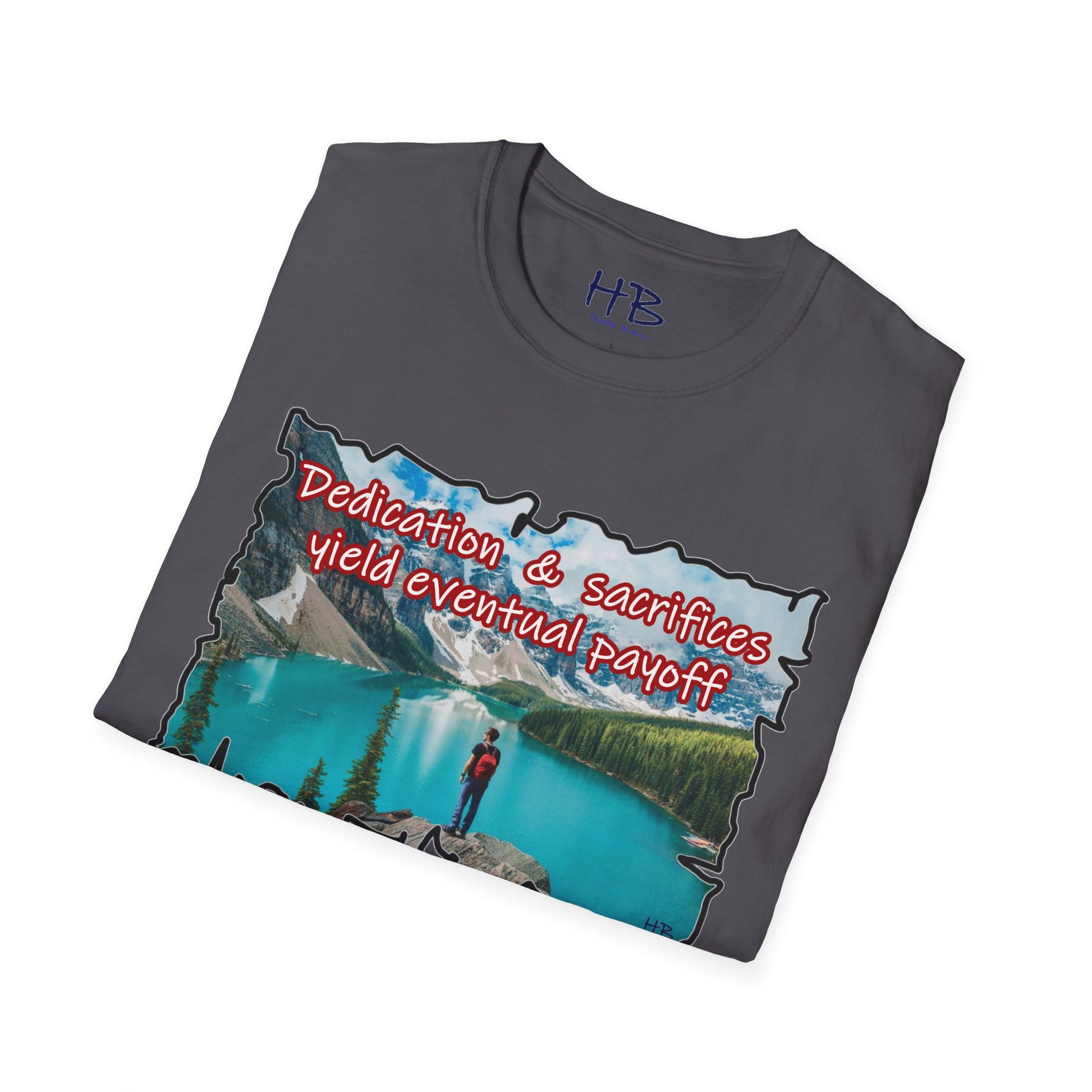 The crystalline waters reflect the sky's gentle hues, inviting you to dive into a world where tranquility meets triumph. Each ripple whispers tales of commitment and hard work, resonating with the essence of the phrase emblazoned across the shirt: "Dedication & sacrifices yield eventual payoff." This isn't just a tee; it's a wearable mantra, a source of inspiration for those who pursue their dreams with unyielding determination.