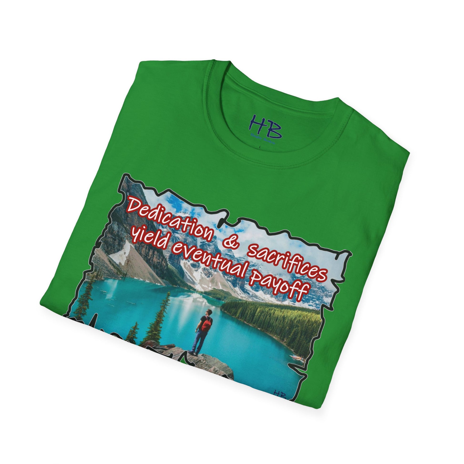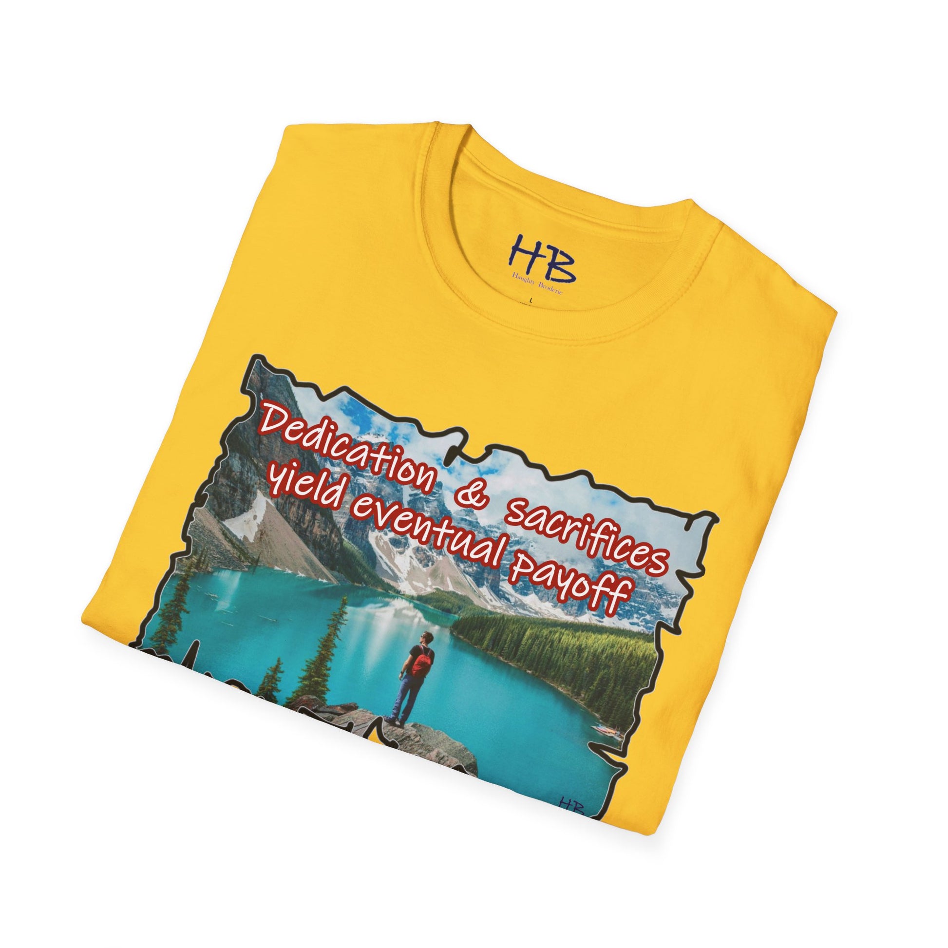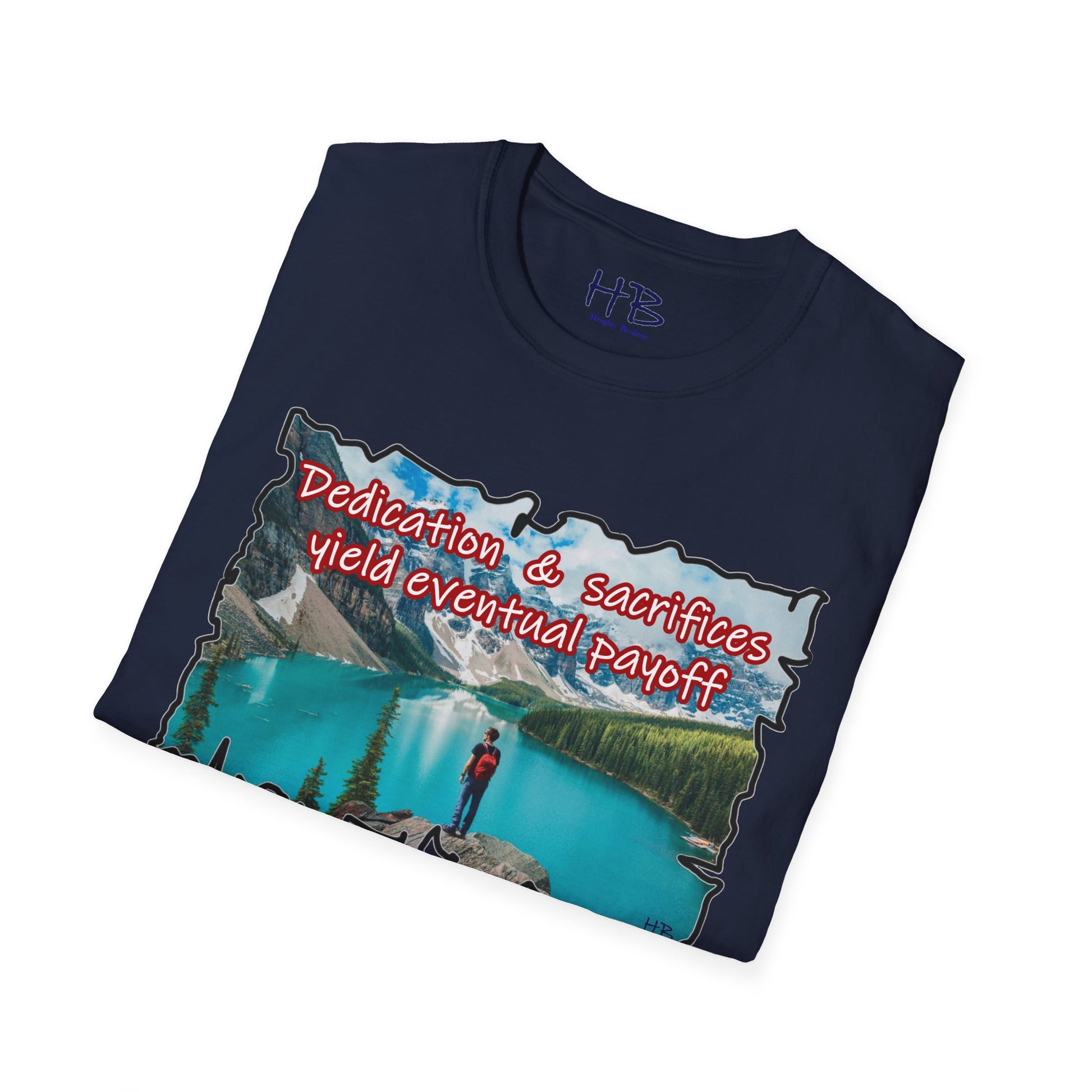 The crystalline waters reflect the sky's gentle hues, inviting you to dive into a world where tranquility meets triumph. Each ripple whispers tales of commitment and hard work, resonating with the essence of the phrase emblazoned across the shirt: "Dedication & sacrifices yield eventual payoff." This isn't just a tee; it's a wearable mantra, a source of inspiration for those who pursue their dreams with unyielding determination.