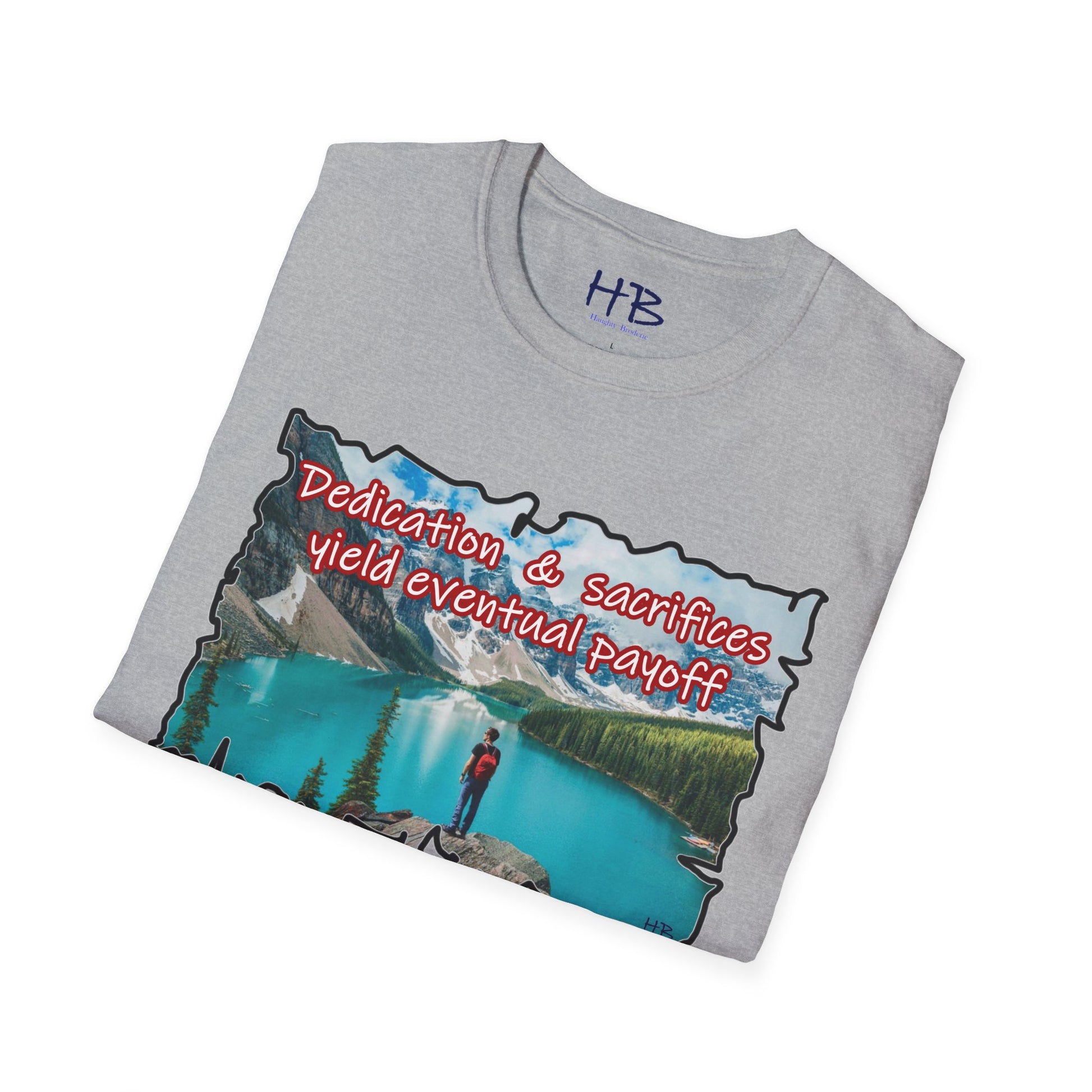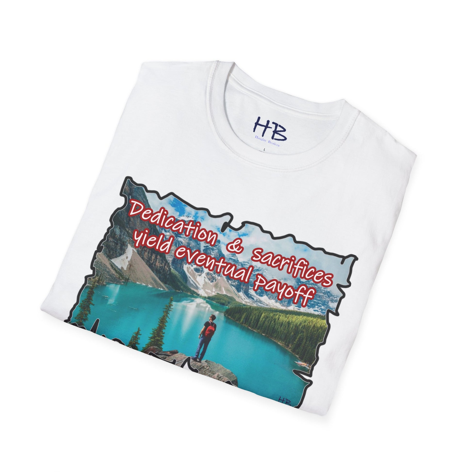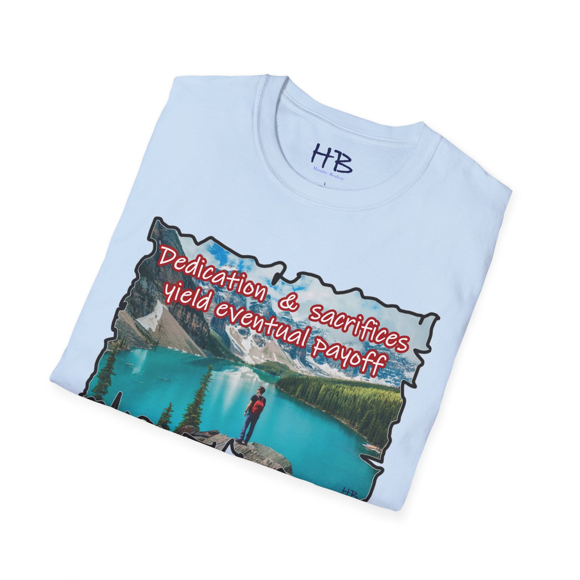 Embark on a visual journey with our breathtaking Dedication Tee, a wearable masterpiece that encapsulates the allure of an opulent paradise—an exclusive retreat that mirrors the aspirations of those who toil tirelessly for their dreams. Picture this: an azure baby blue lake, cradled within the embrace of majestic mountains and verdant forests. This ethereal tableau is more than just an image; it's a testament to the fruits of relentless dedication and unwavering sacrifice.