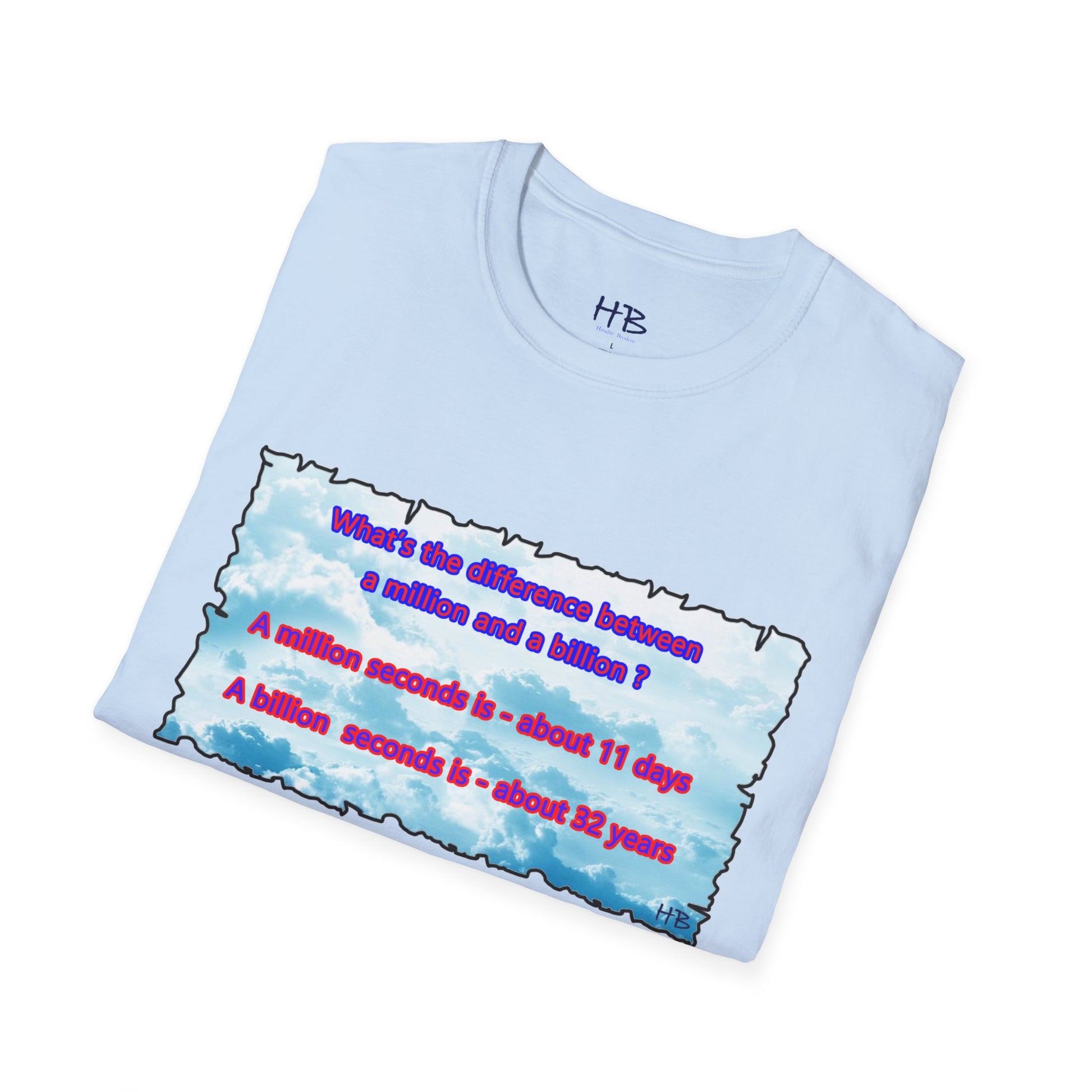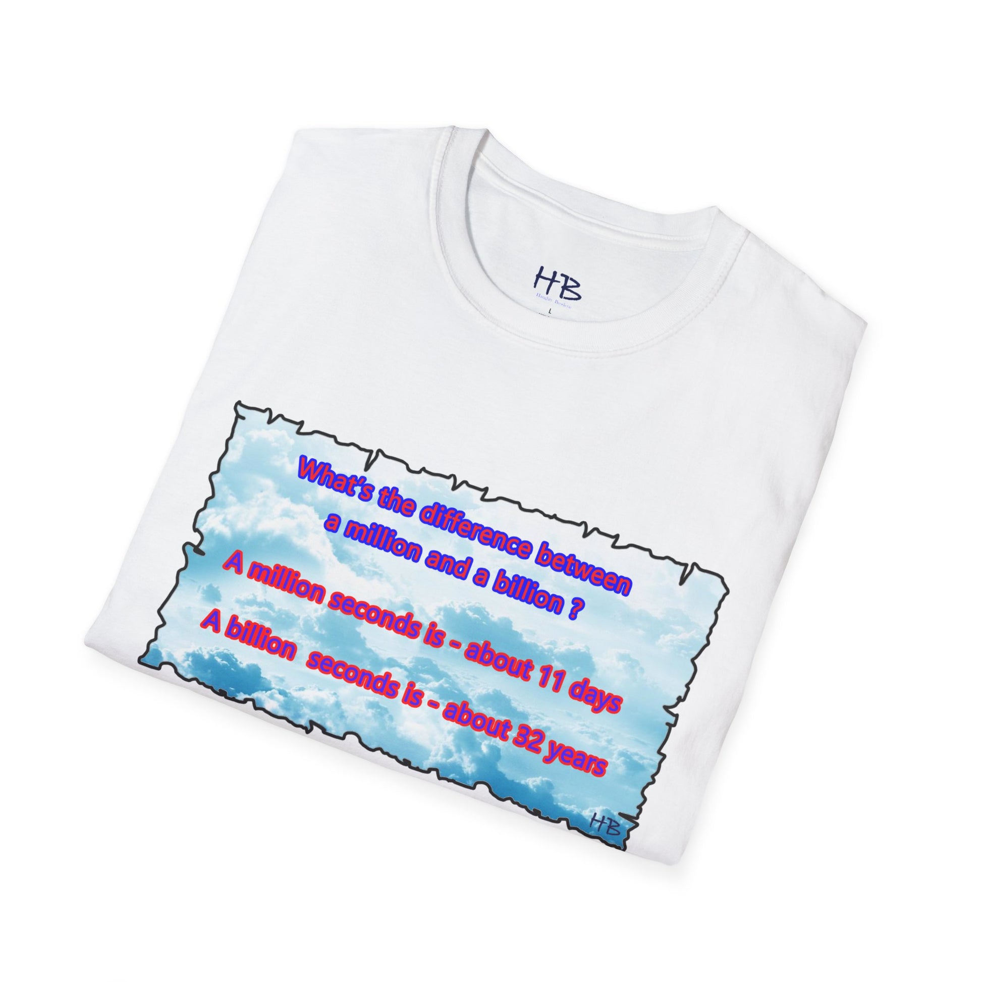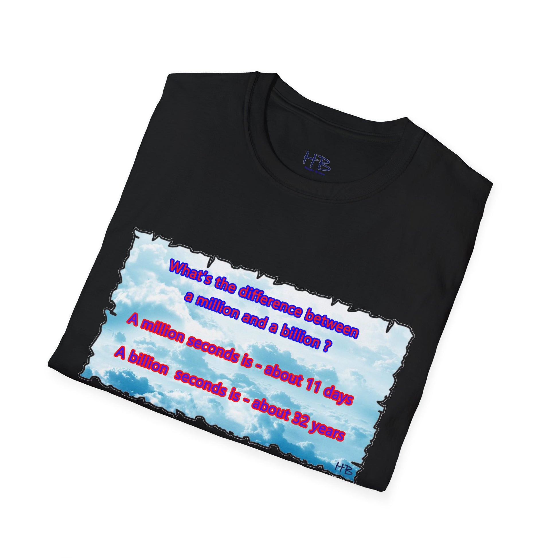 Introducing our captivating t-shirt featuring a mesmerizing sky adorned with fluffy clouds and an intriguing question that asks, "What sets apart a million from a billion?" This stylish tee is an absolute must-have for anyone eager to showcase their fascination with numbers and the cosmos.
