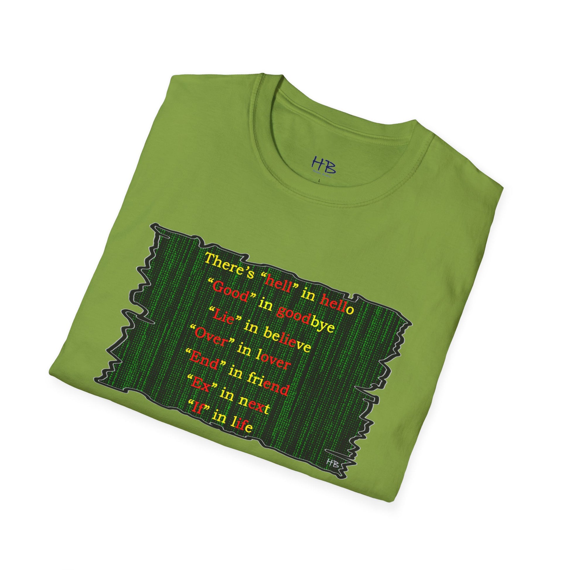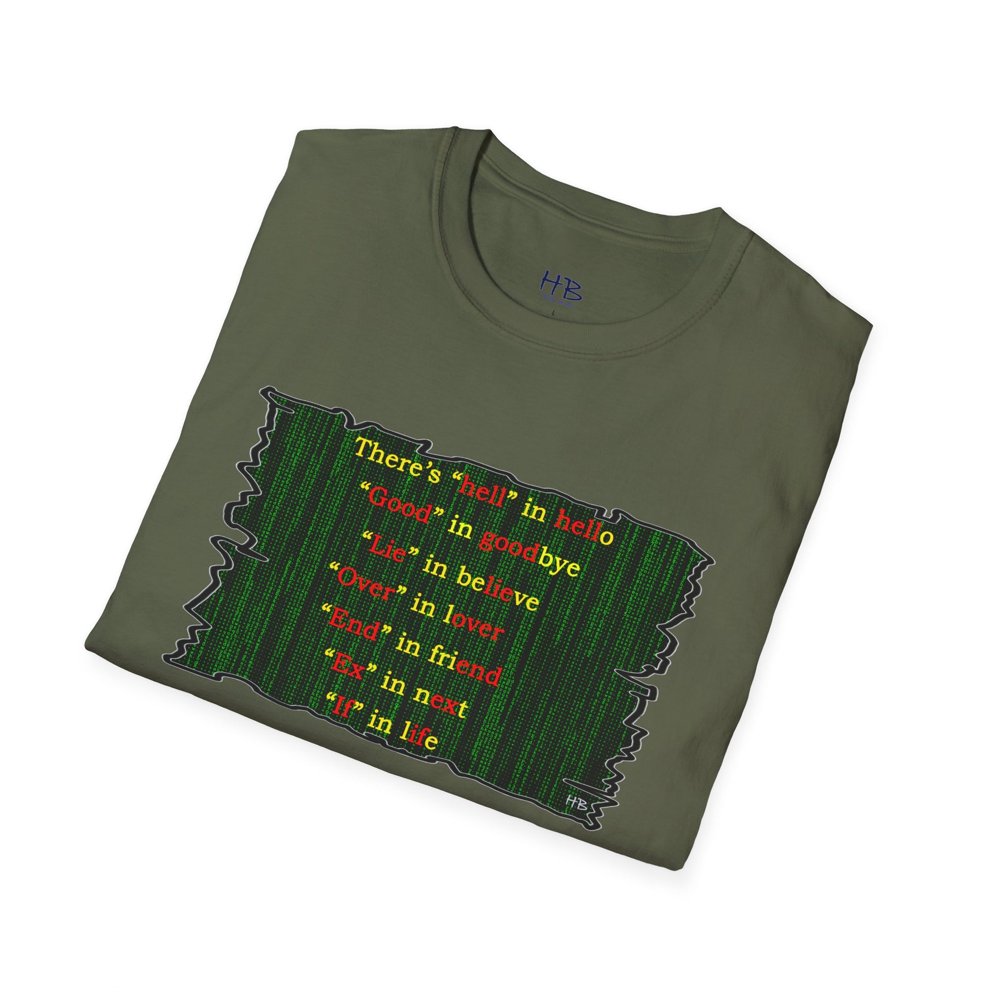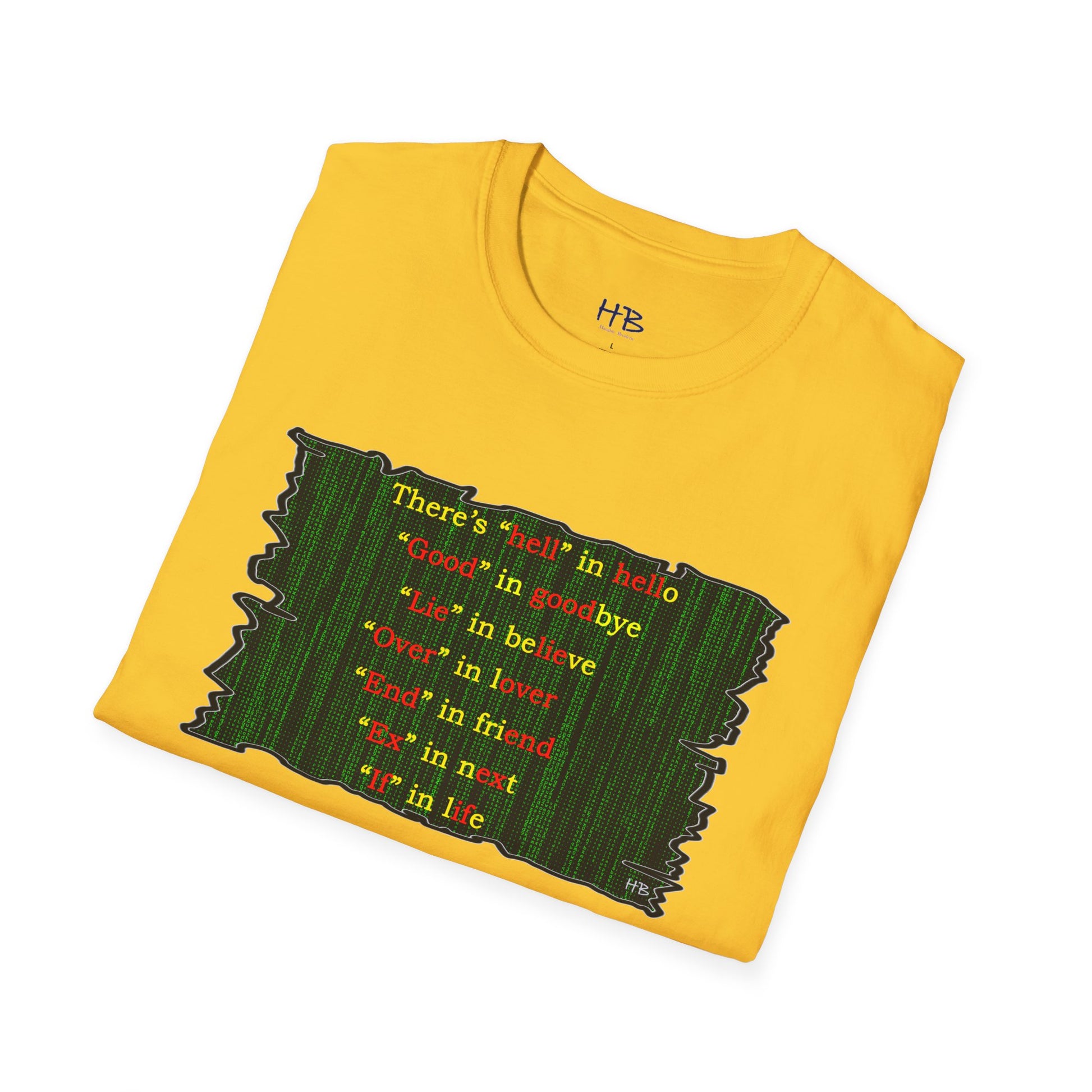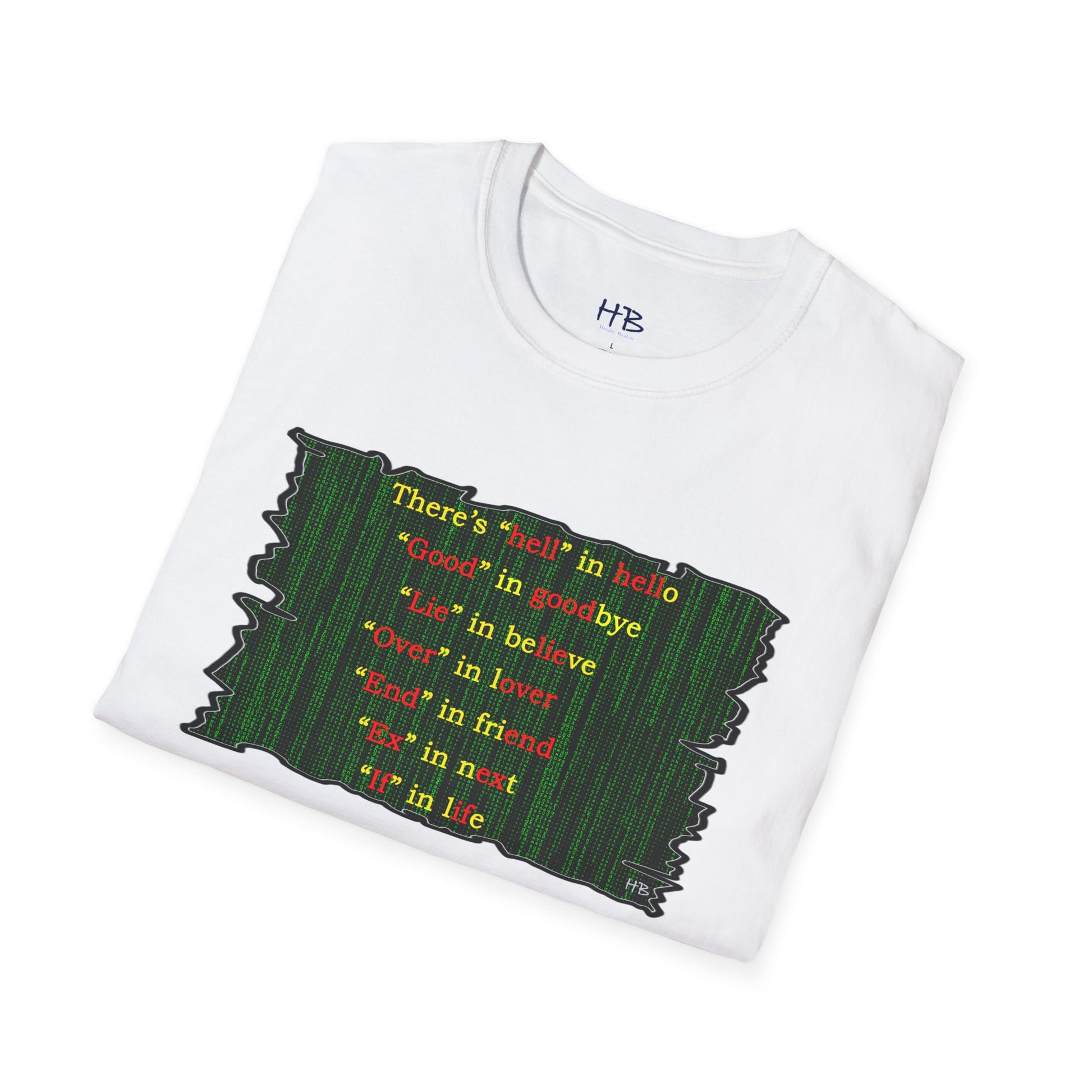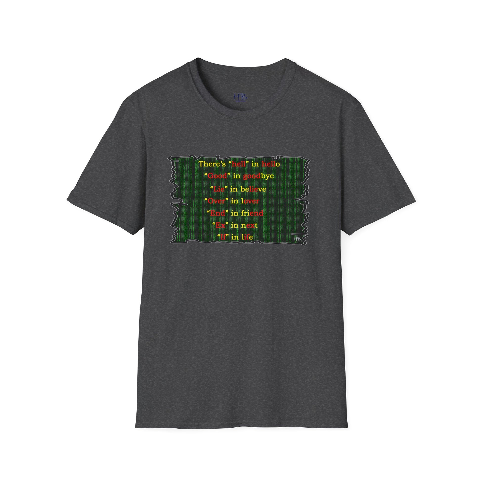 Introducing a tee shirt that will pique your interest with its witty play on words. The design on this shirt showcases a vibrant green matrix background with a thought-provoking message. The text boldly proclaims the hidden words in everyday words such as "hell" in hello, "good" in goodbye, "lie" in believe, "over" in lover, "end" in friend, "ex" in next, and "if" in life.