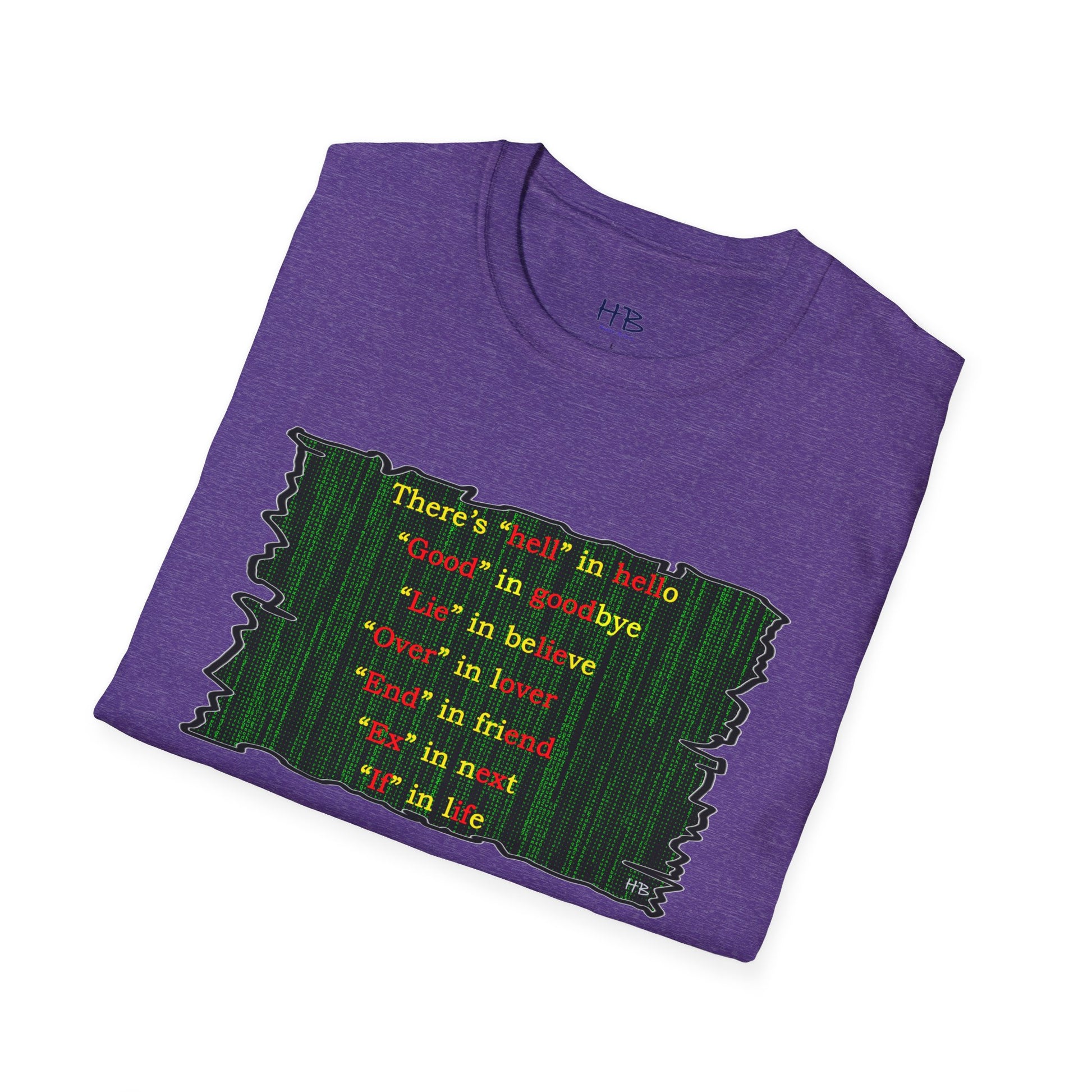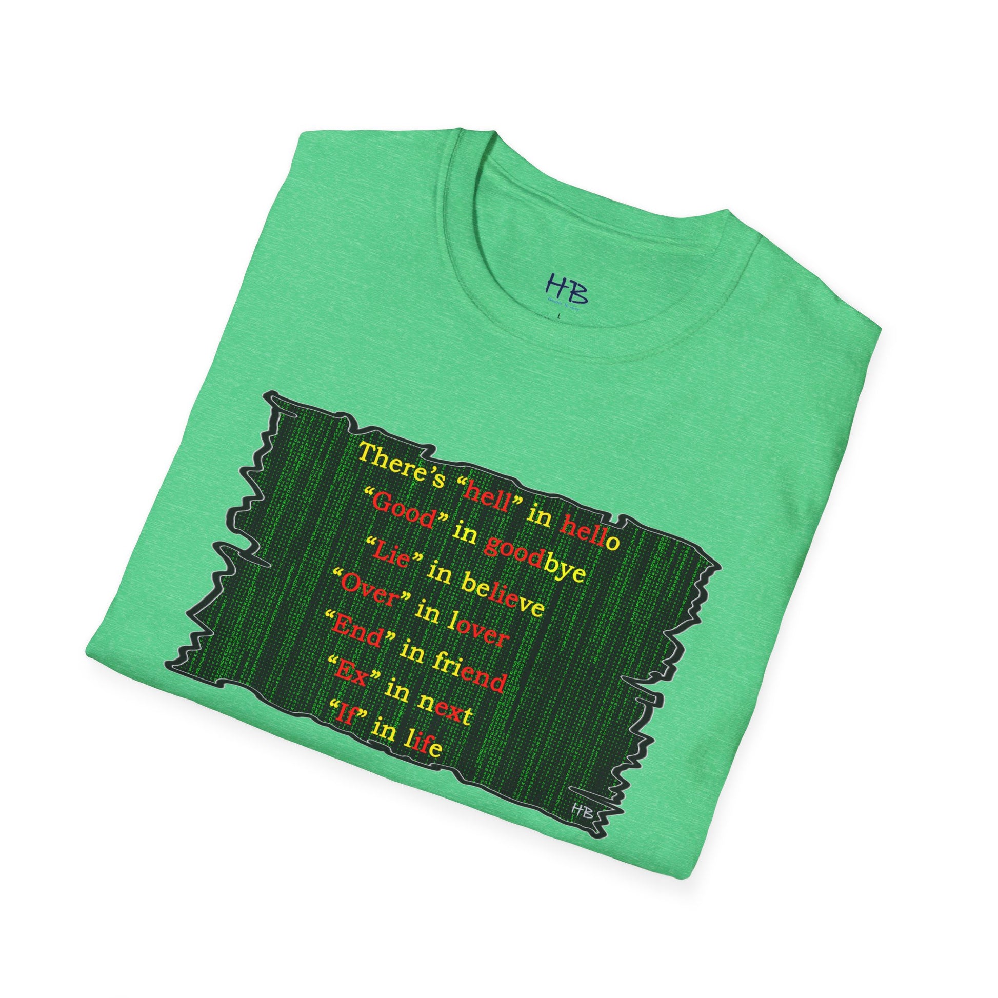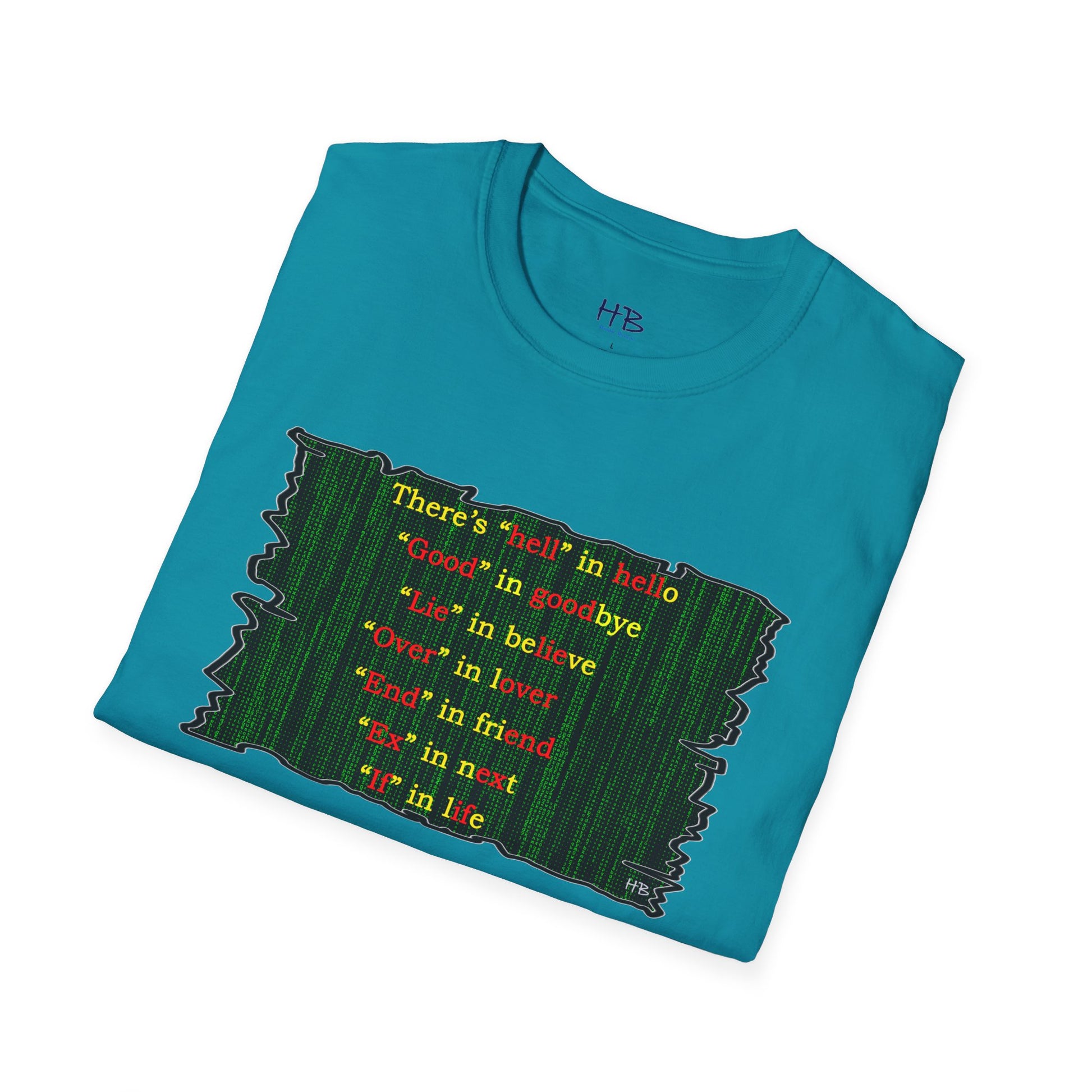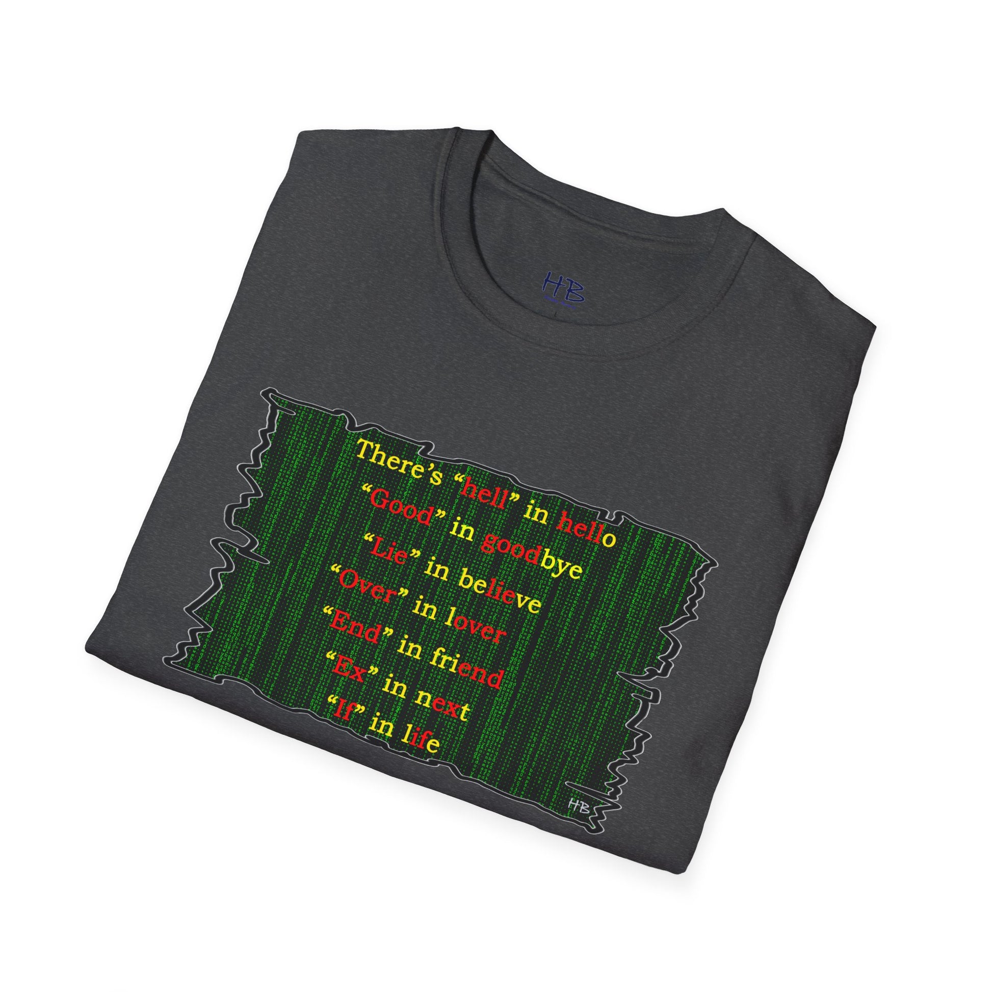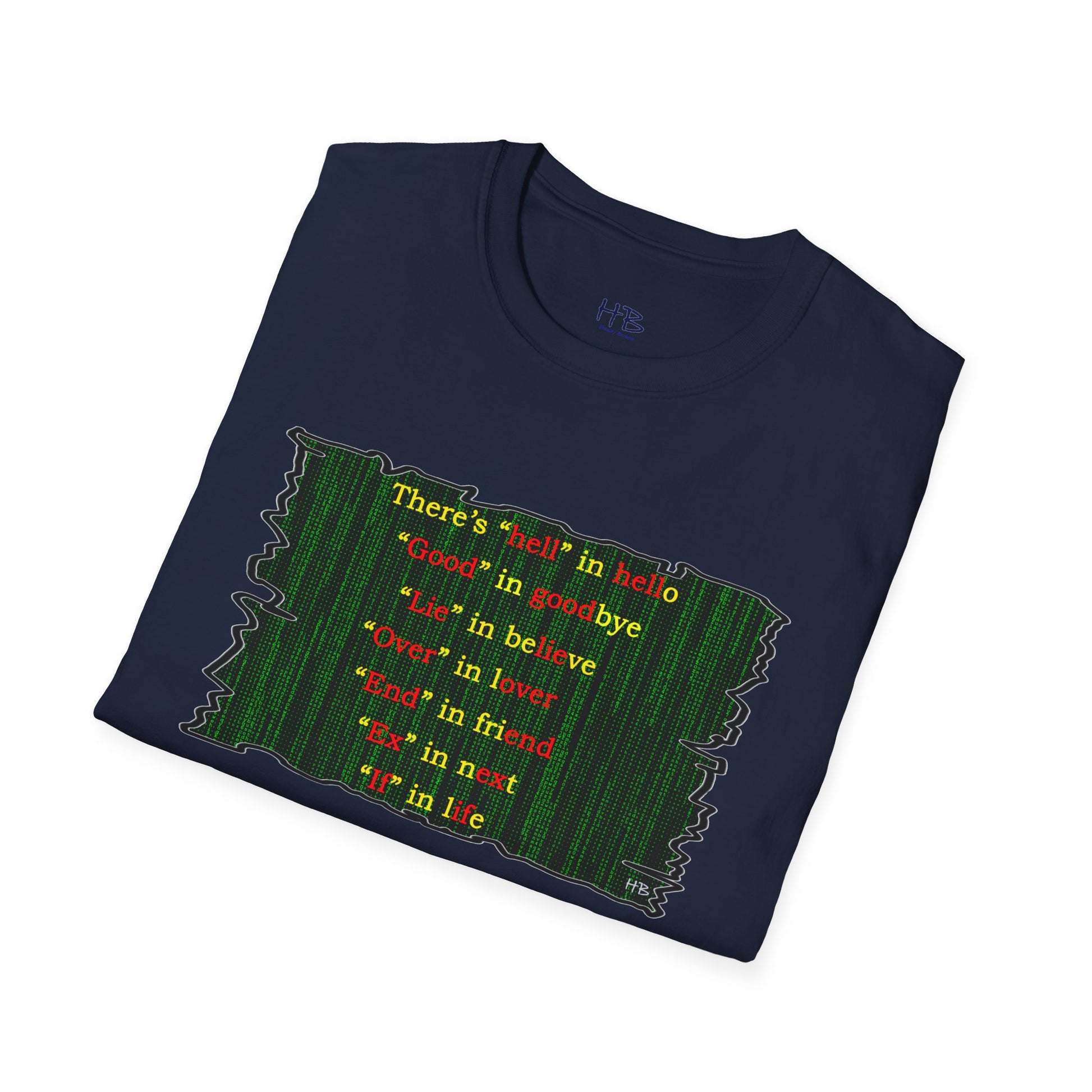 Introducing a tee shirt that will pique your interest with its witty play on words. The design on this shirt showcases a vibrant green matrix background with a thought-provoking message. The text boldly proclaims the hidden words in everyday words such as "hell" in hello, "good" in goodbye, "lie" in believe, "over" in lover, "end" in friend, "ex" in next, and "if" in life.