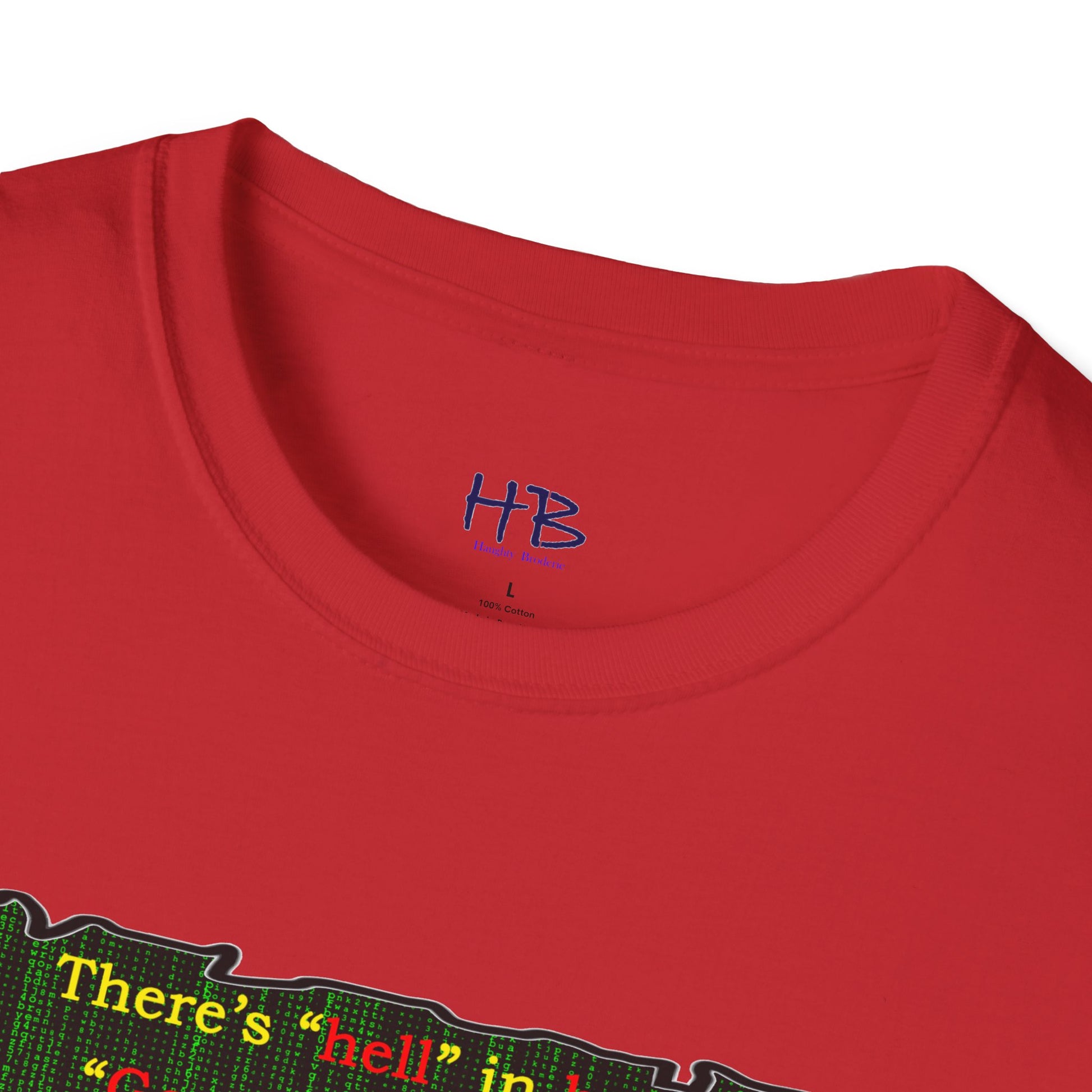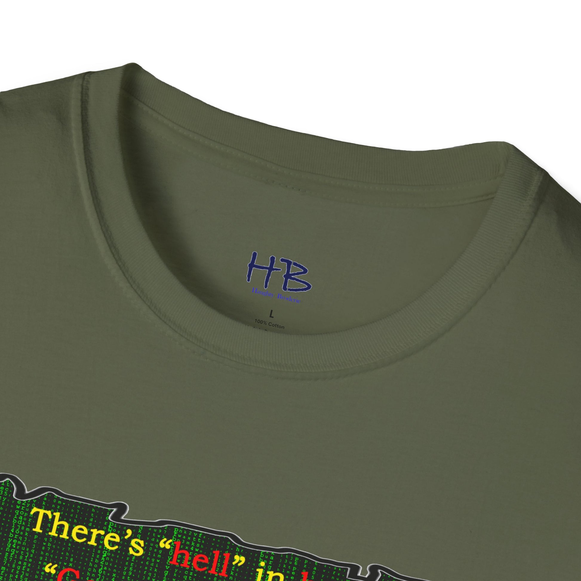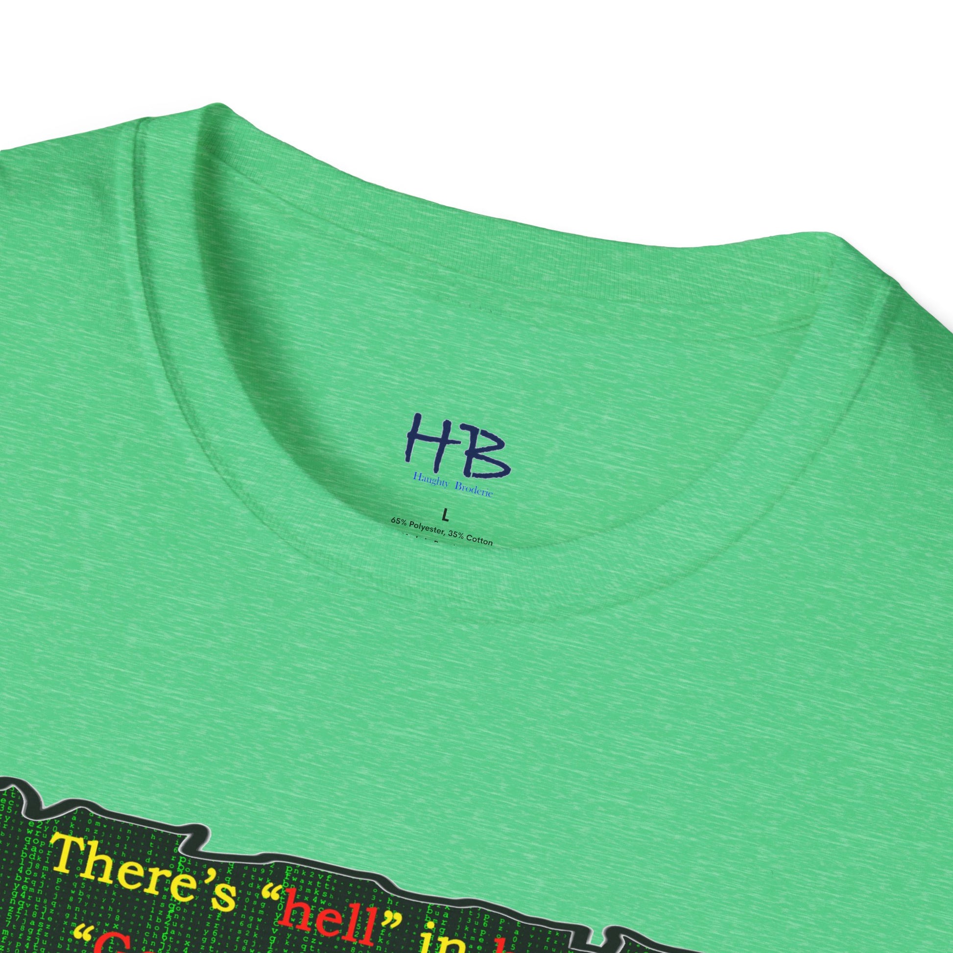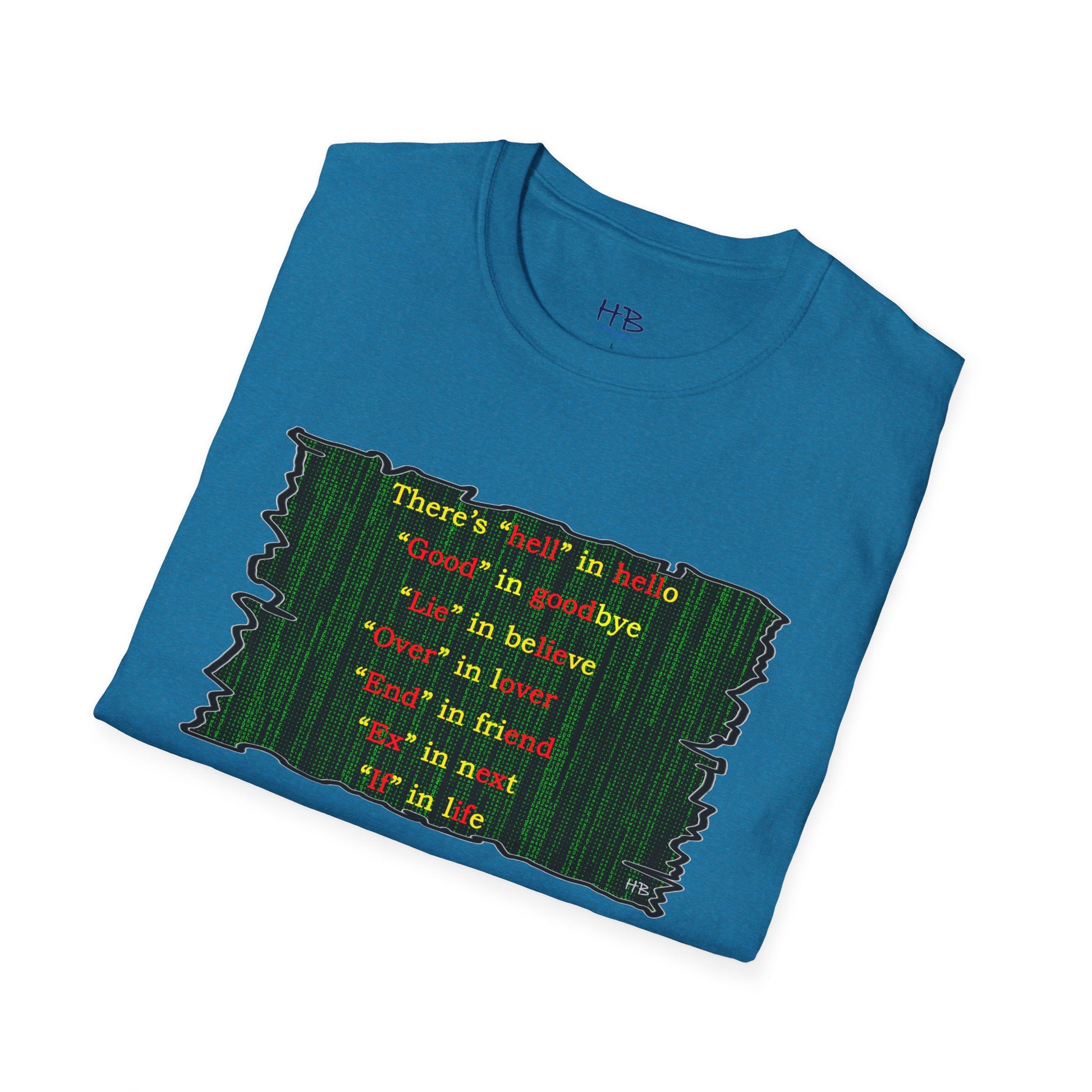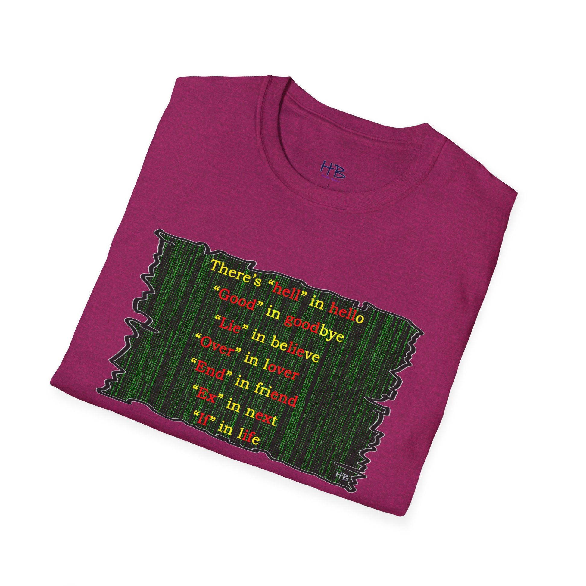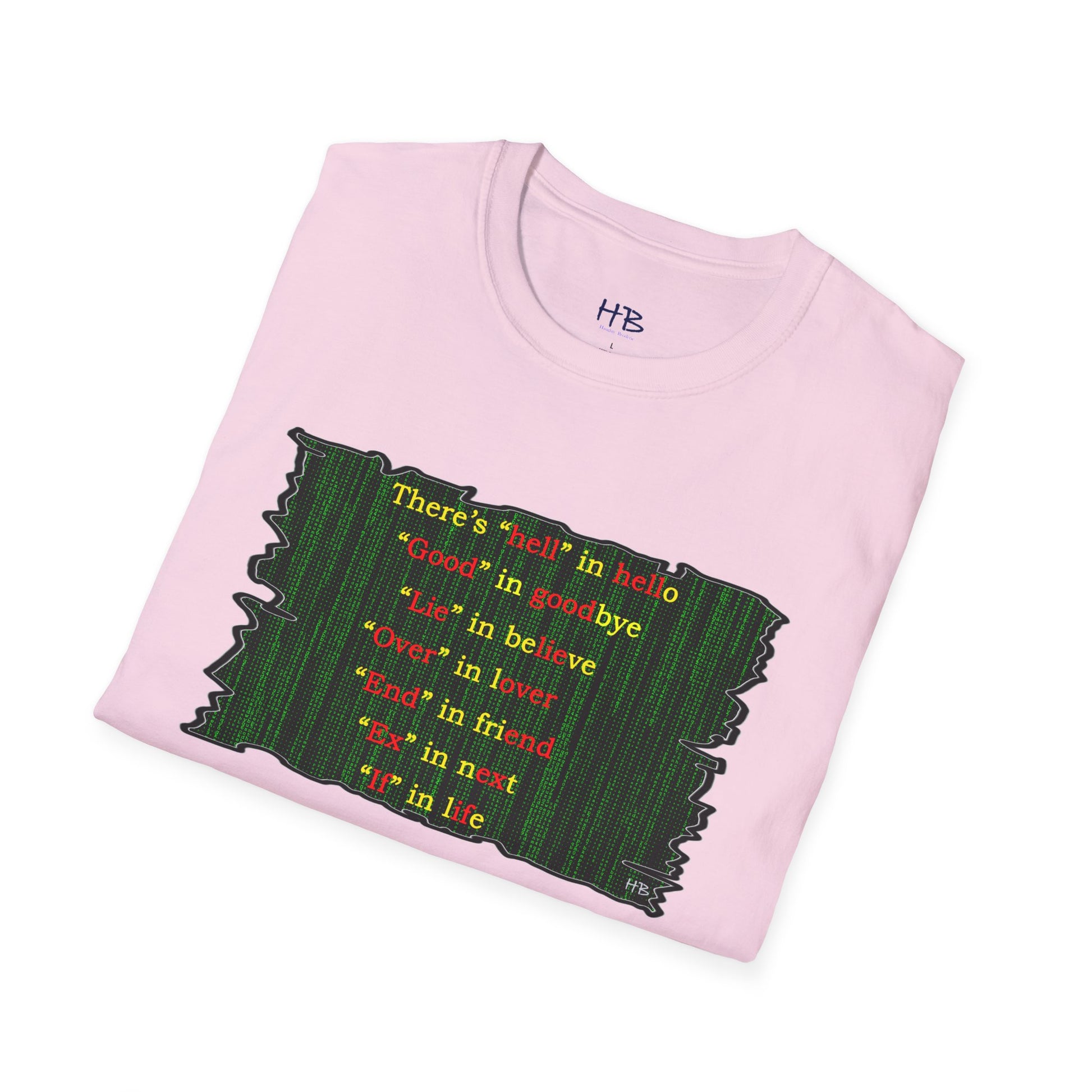 Introducing a tee shirt that will pique your interest with its witty play on words. The design on this shirt showcases a vibrant green matrix background with a thought-provoking message. The text boldly proclaims the hidden words in everyday words such as "hell" in hello, "good" in goodbye, "lie" in believe, "over" in lover, "end" in friend, "ex" in next, and "if" in life.