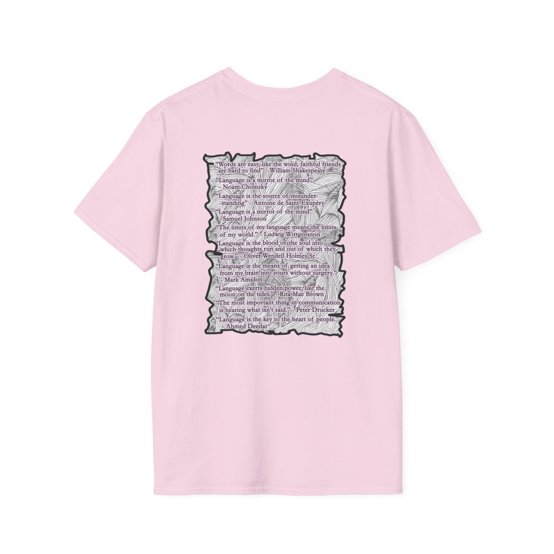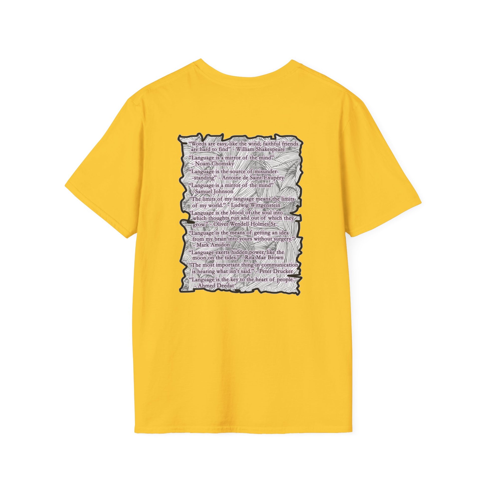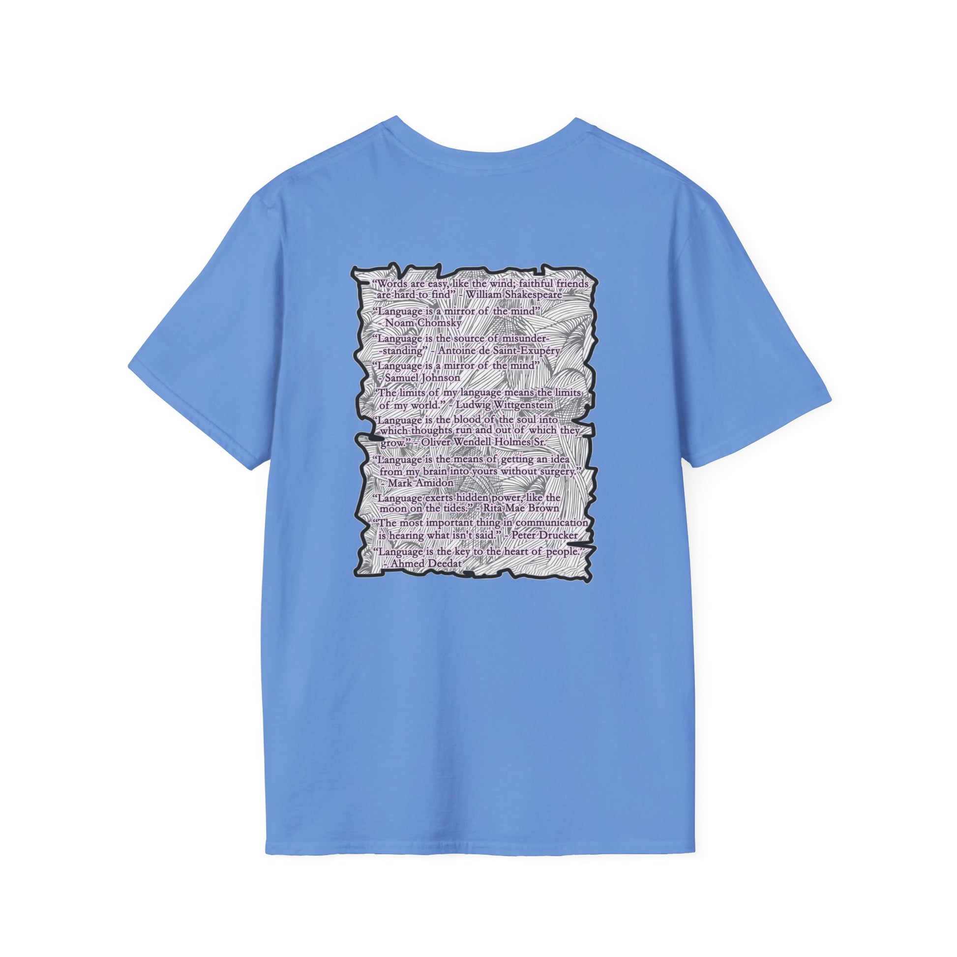To add to the intrigue, the back of the tee shirt features quotes from renowned linguists such as William Shakespeare, Chomsky, and Samuel Johnson, along with a couple of humorous riddles about language.