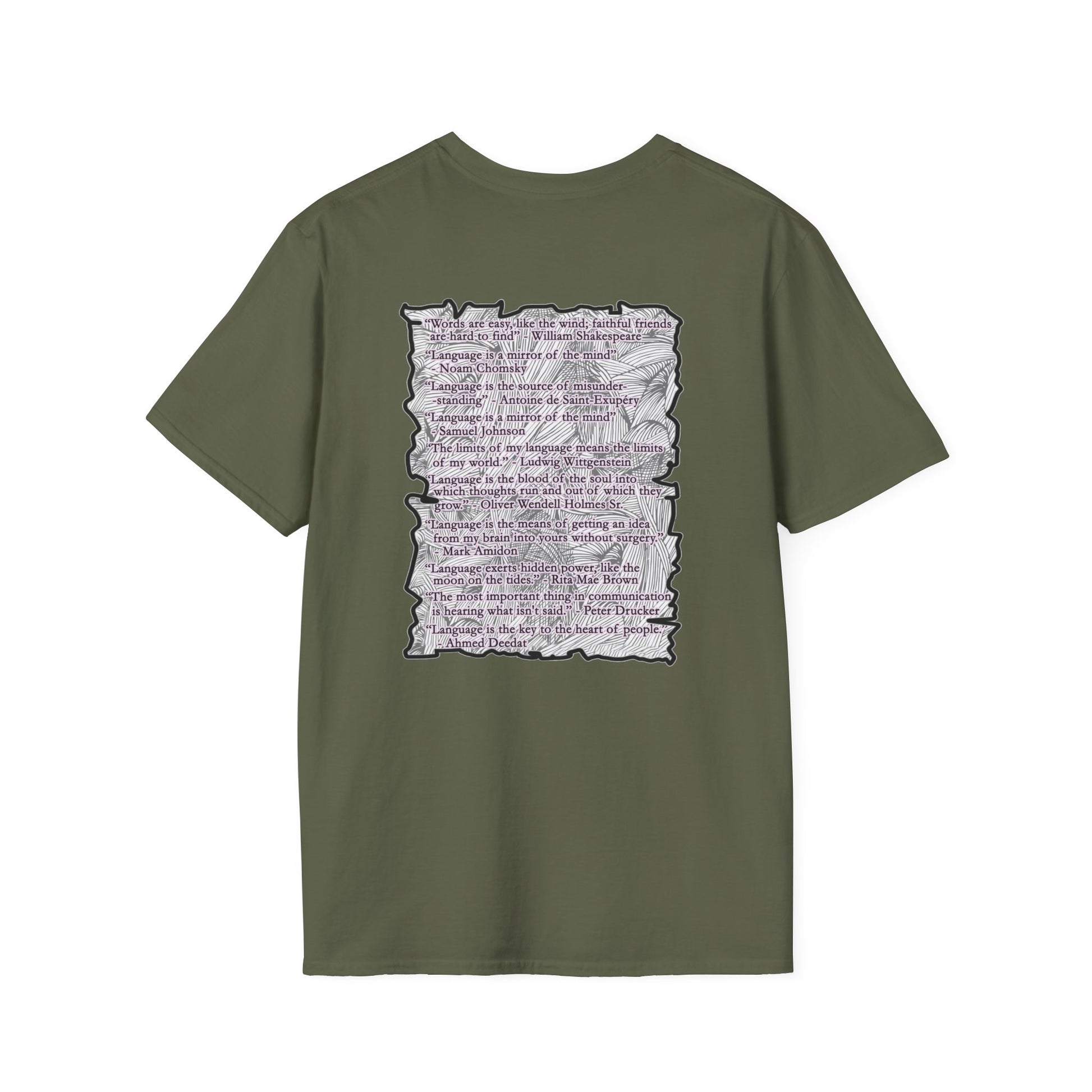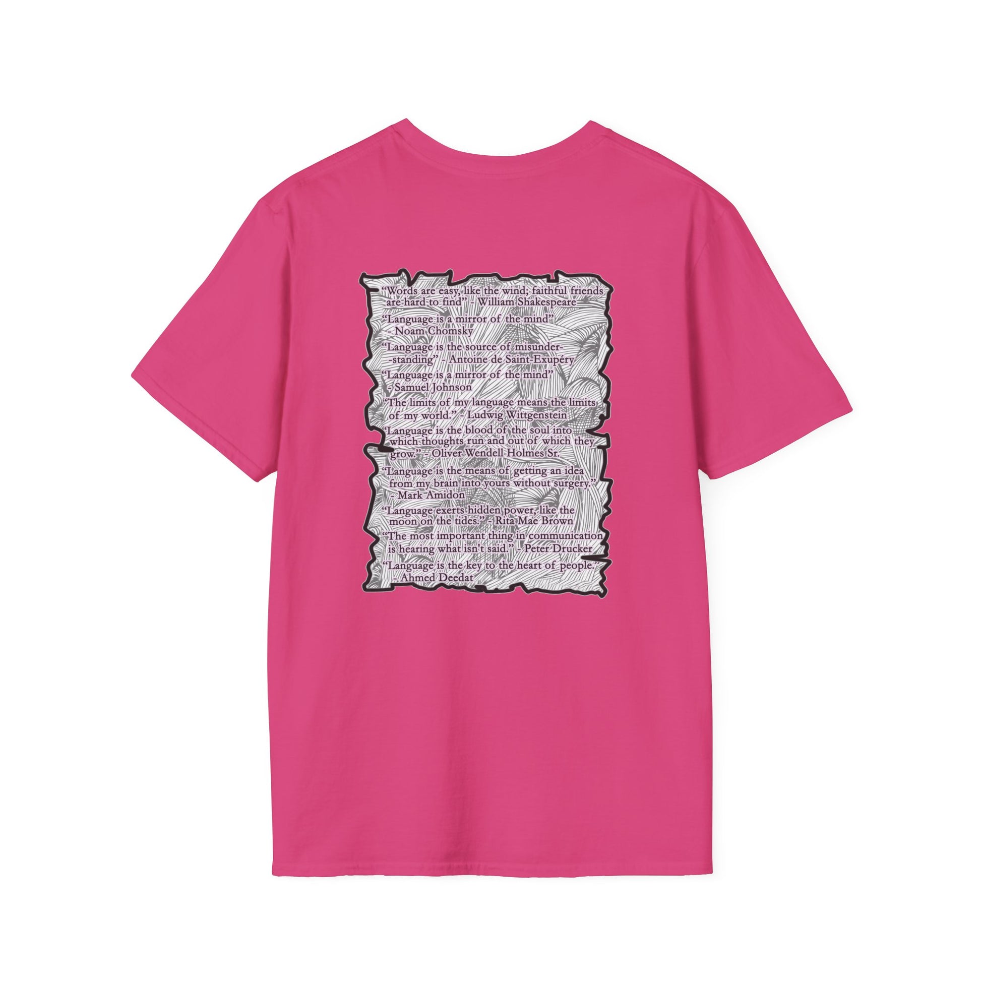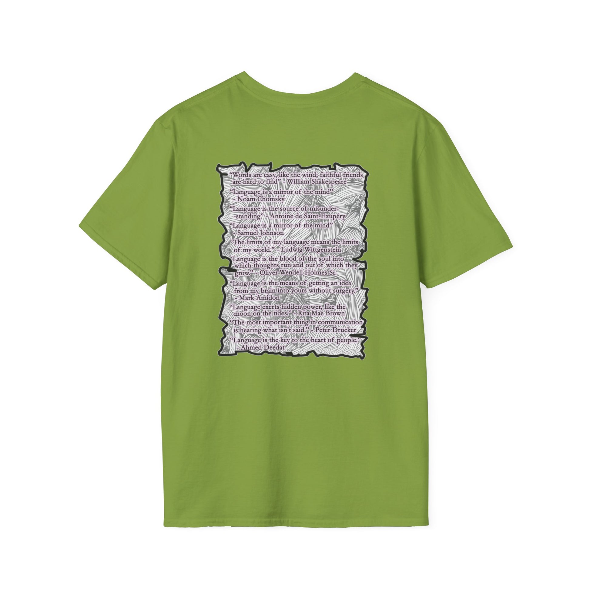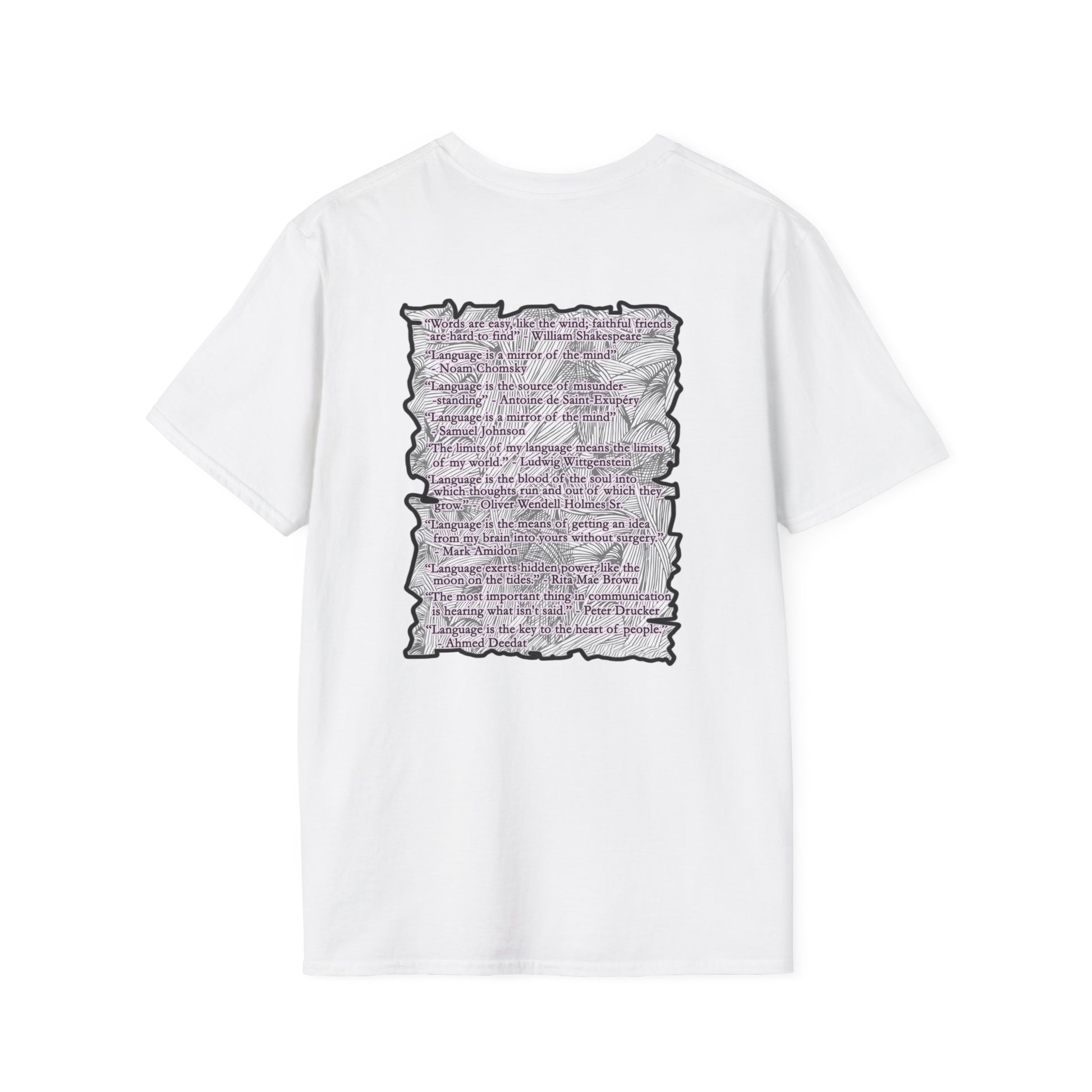 To add to the intrigue, the back of the tee shirt features quotes from renowned linguists such as William Shakespeare, Chomsky, and Samuel Johnson, along with a couple of humorous riddles about language.