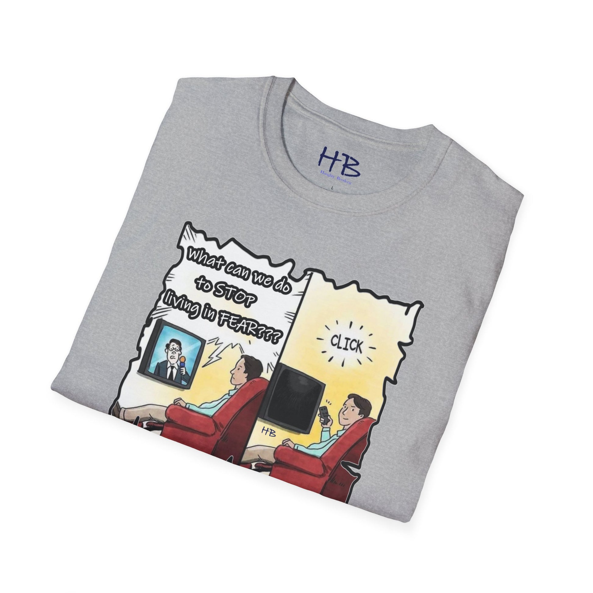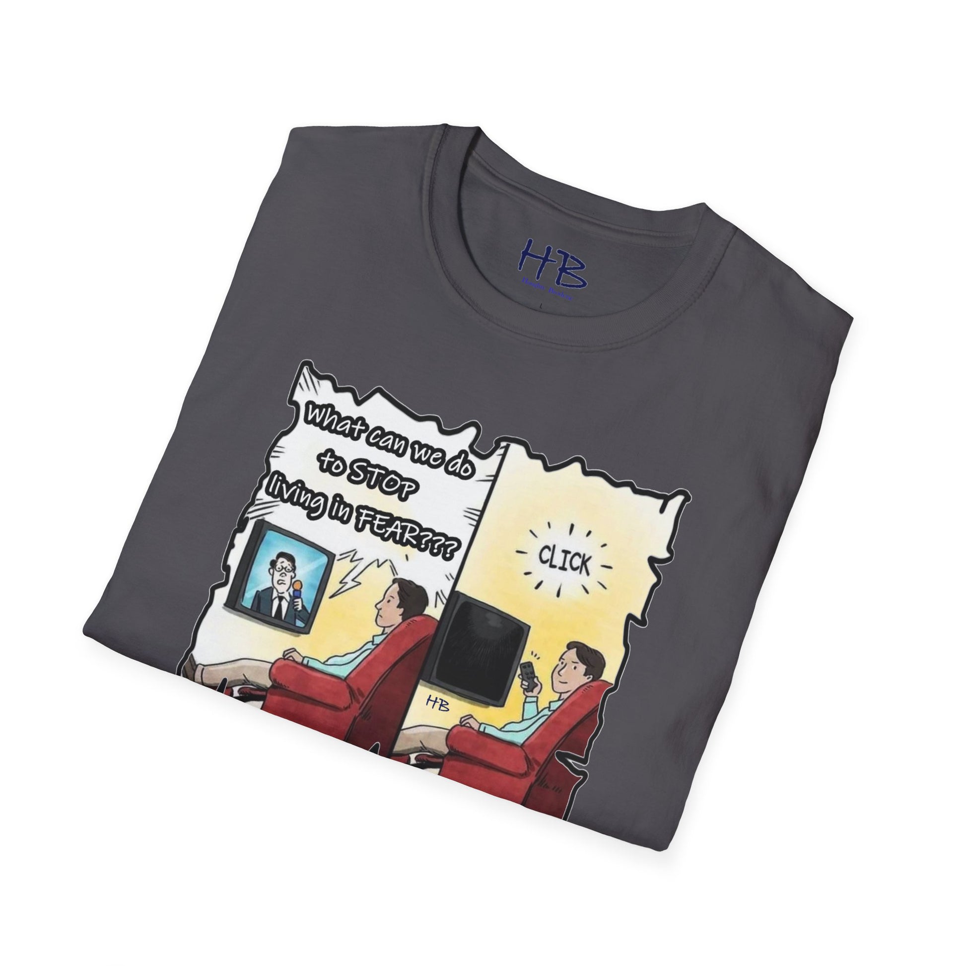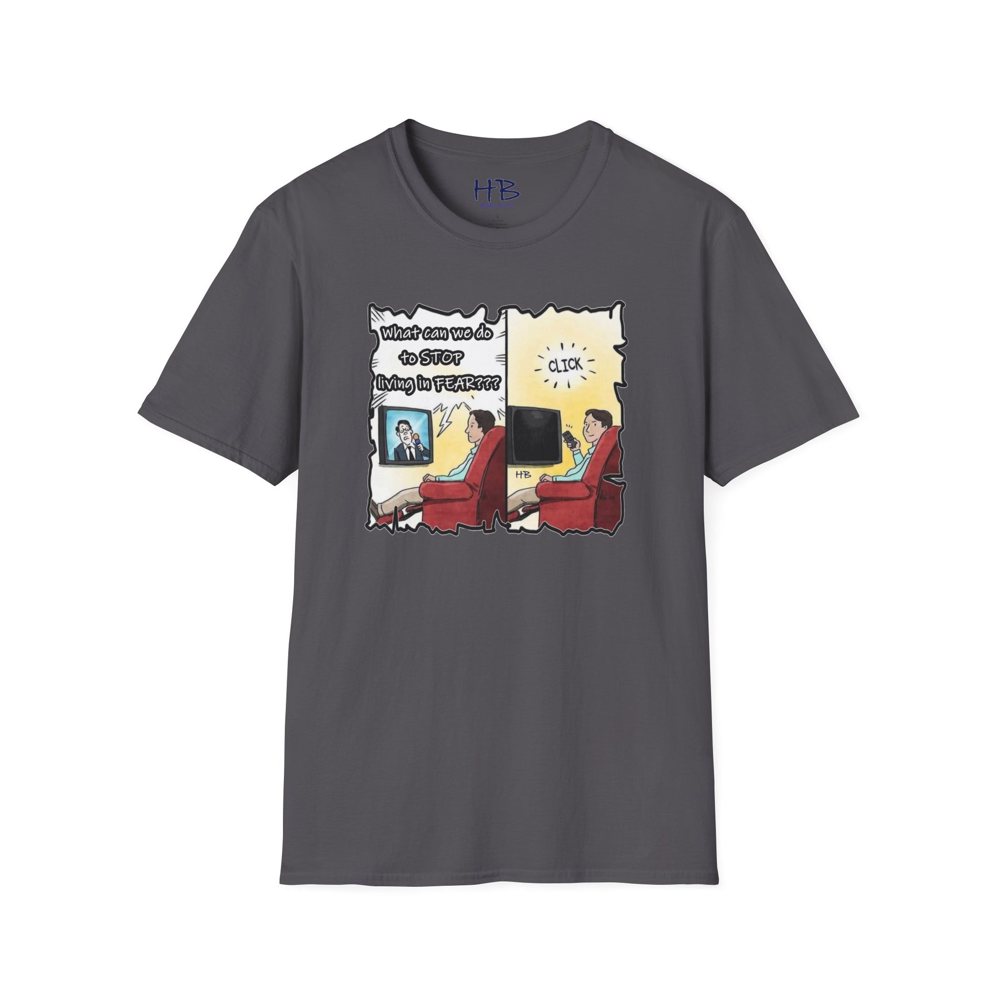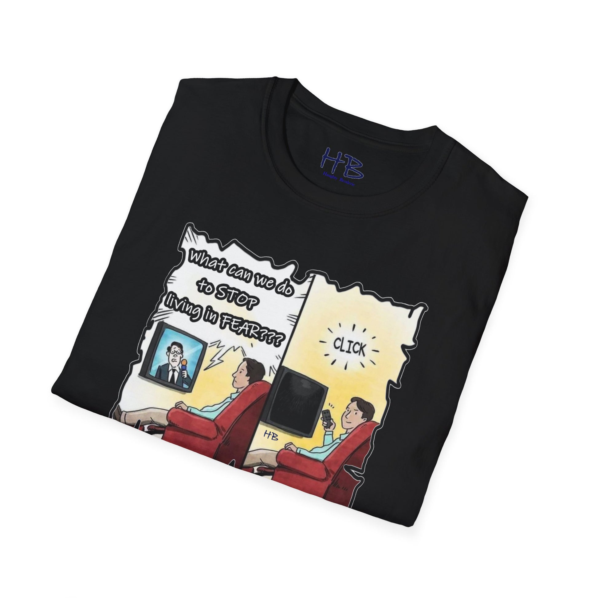 Introducing our revolutionary statement tee, a powerful emblem of freedom from fear and stress. Picture this: A man, initially distressed by the barrage of negative news on television, takes control of his narrative with a simple "CLICK." The transformation is profound as he turns off the source of anxiety, reclaiming his peace of mind.