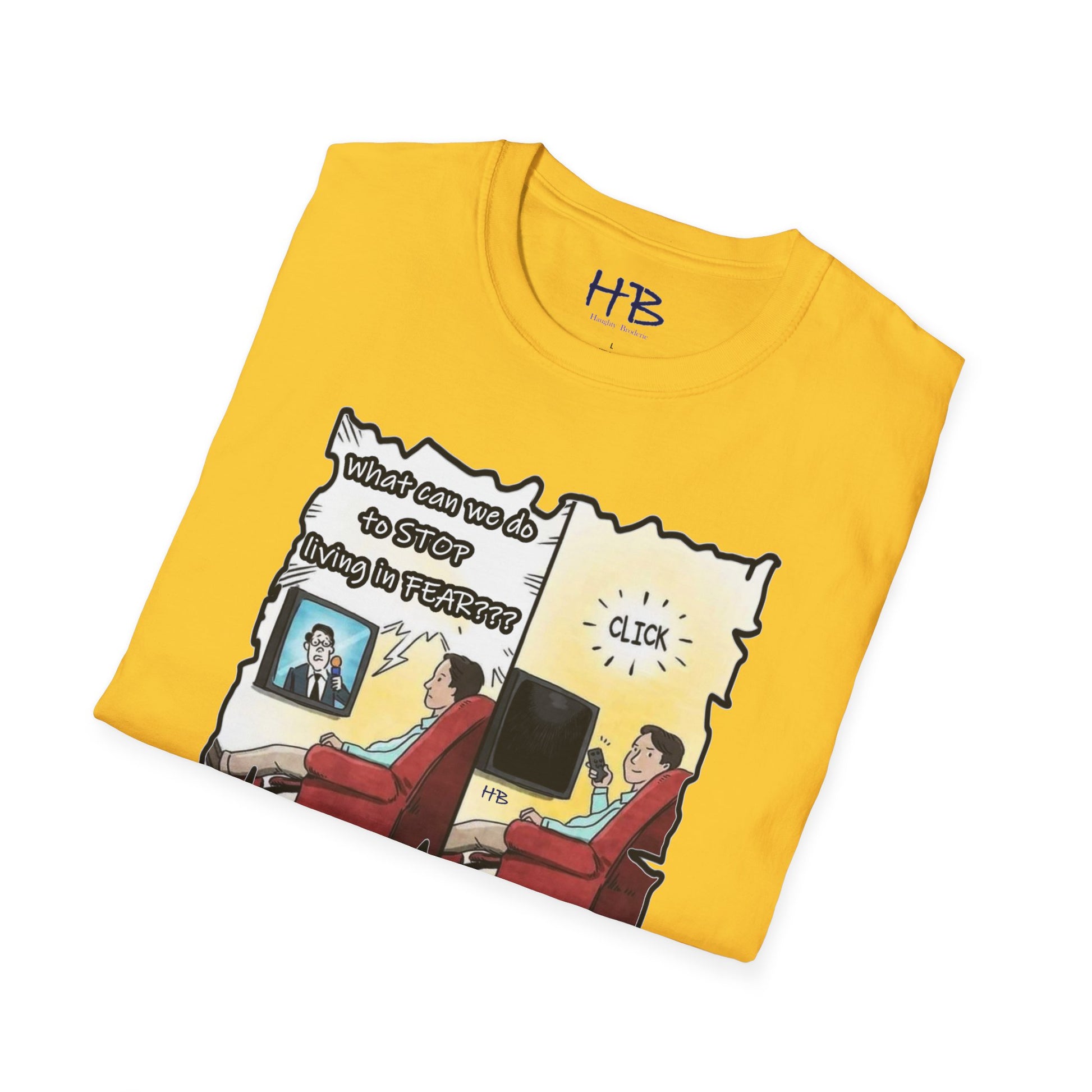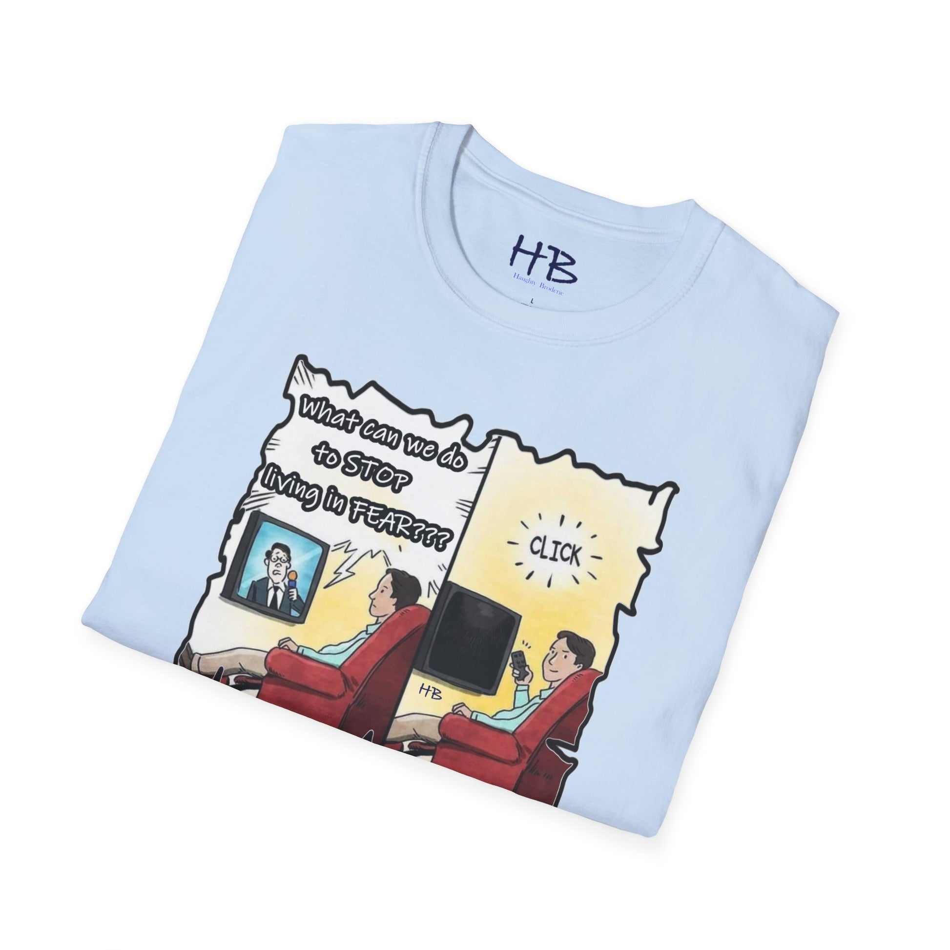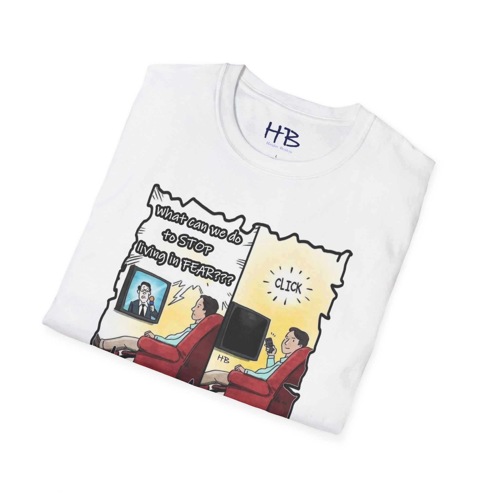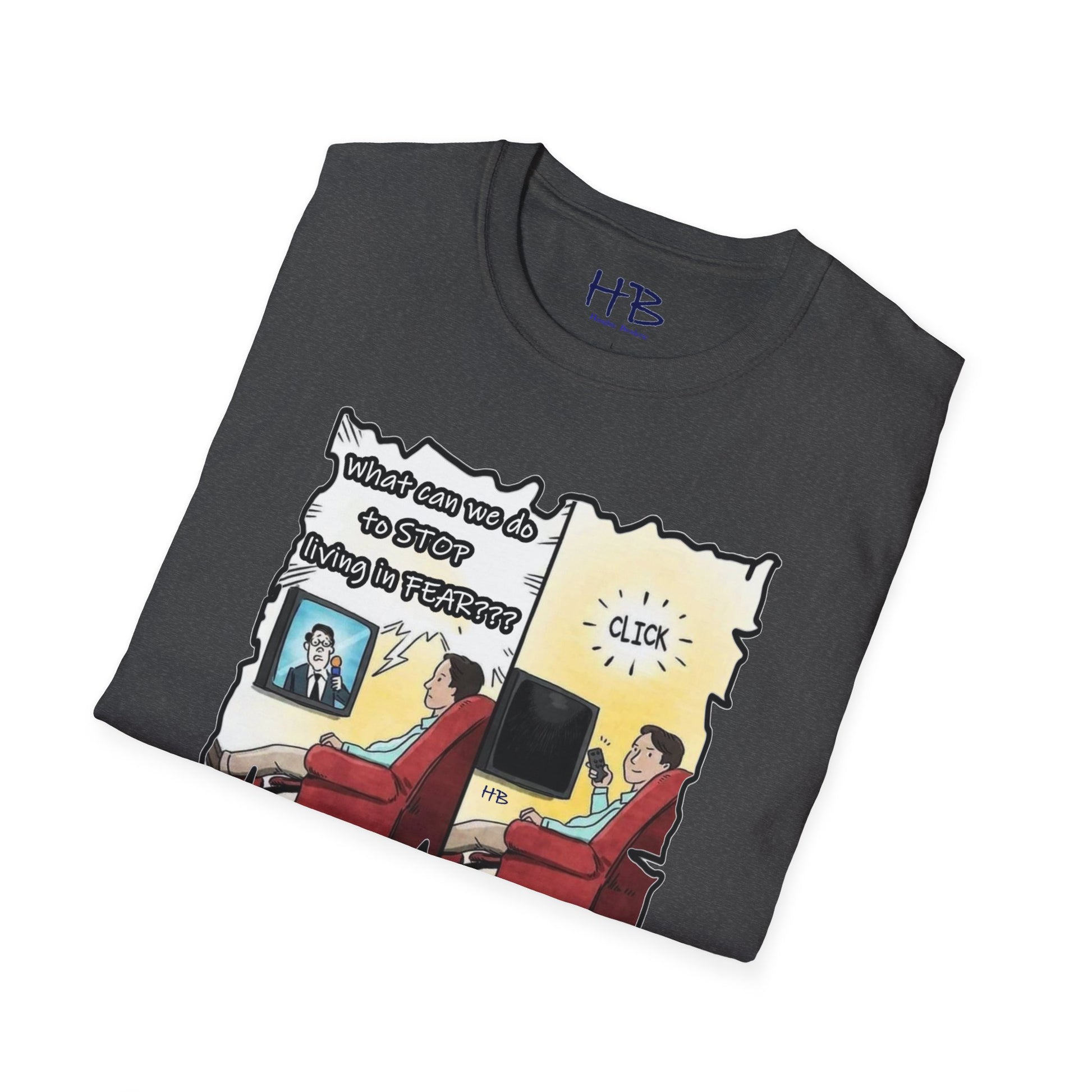 Introducing our revolutionary statement tee, a powerful emblem of freedom from fear and stress. Picture this: A man, initially distressed by the barrage of negative news on television, takes control of his narrative with a simple "CLICK." The transformation is profound as he turns off the source of anxiety, reclaiming his peace of mind.