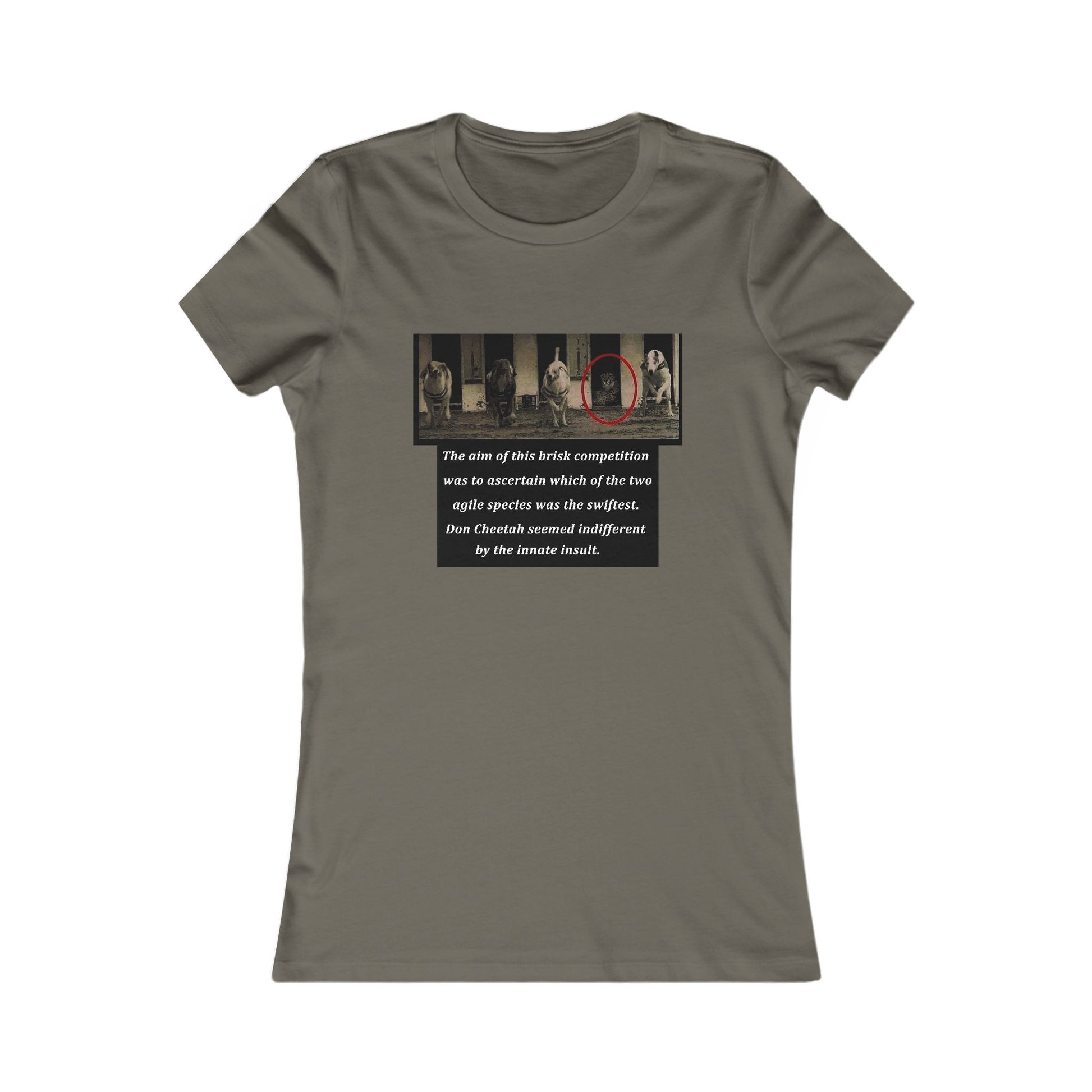 Introducing our latest tee shirt design that will surely catch your attention! The front of this tee shirt boasts a thrilling Whippet dog race with an added twist. The organizers decided to include a cheetah in the competition to determine which of these speedy creatures is the fastest. However, it seems like the cheetah, named Don Cheetah, wasn't bothered at all and didn't even move a muscle. The text on the tee shirt describes the intention of this competition - to find out which agile species is the most swift. Despite this, Don Cheetah remains indifferent and unaffected by the innate insult.