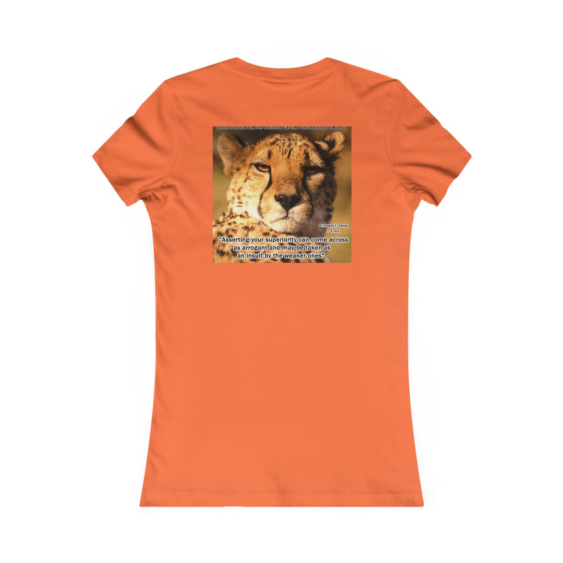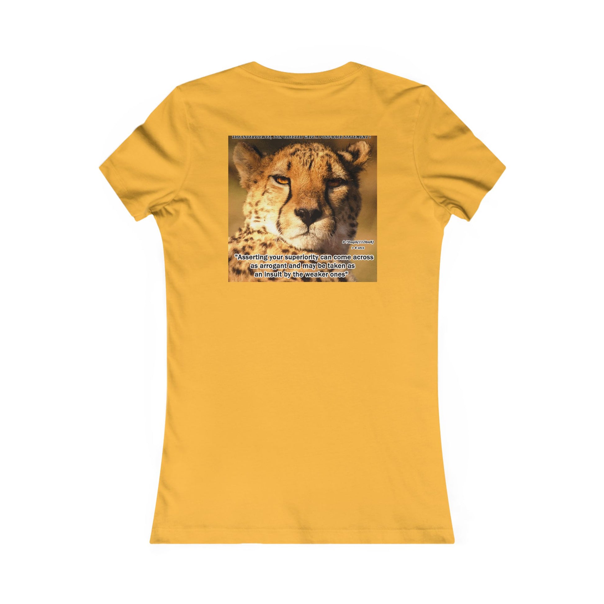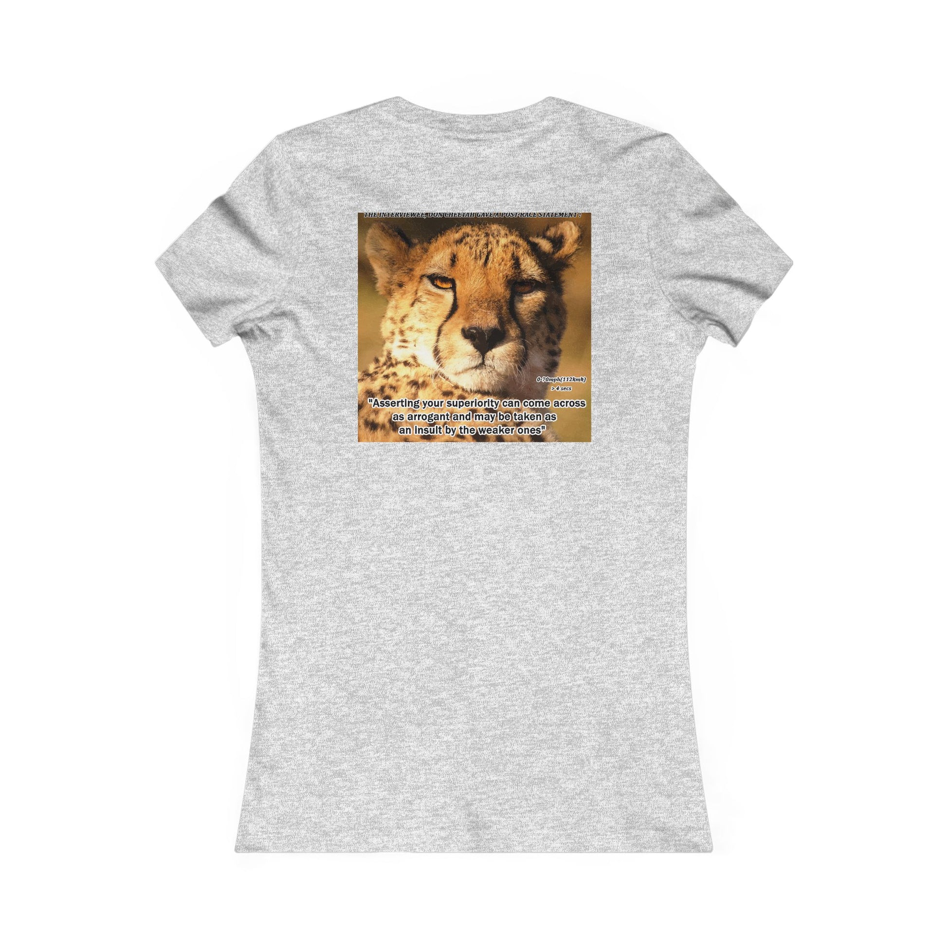 But wait, there's more! The back of the tee shirt showcases the charming face of Don Cheetah being interviewed about why it didn't participate in the race. The accompanying text on the tee shirt delivers an insightful statement made by the interviewee, "Asserting your superiority can come across as arrogant and maybe be taken as an insult by the weaker ones."