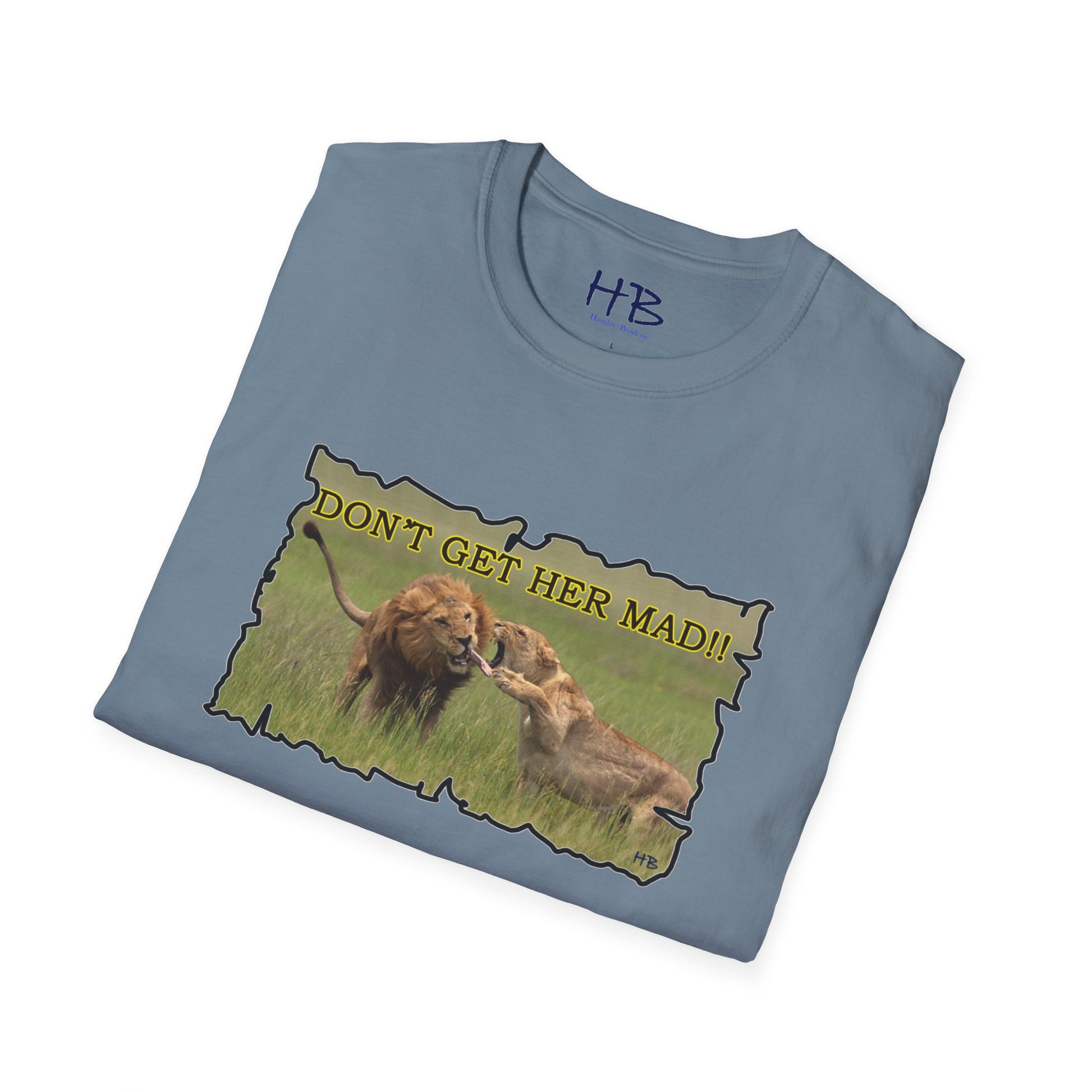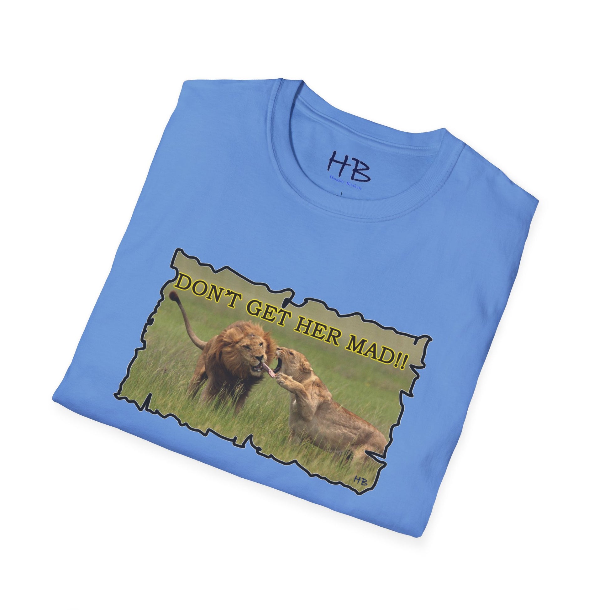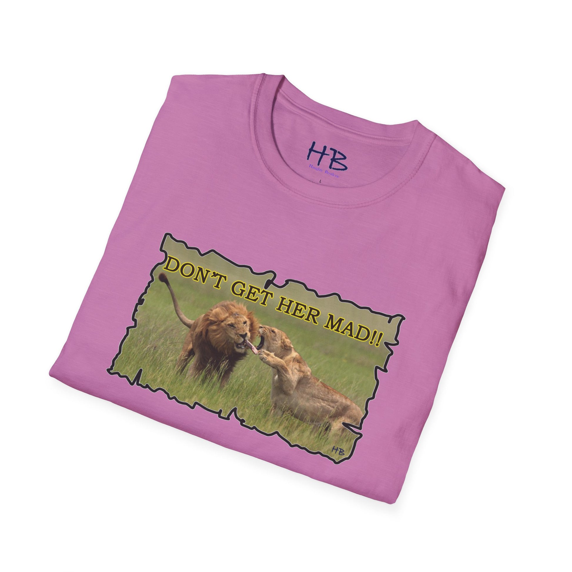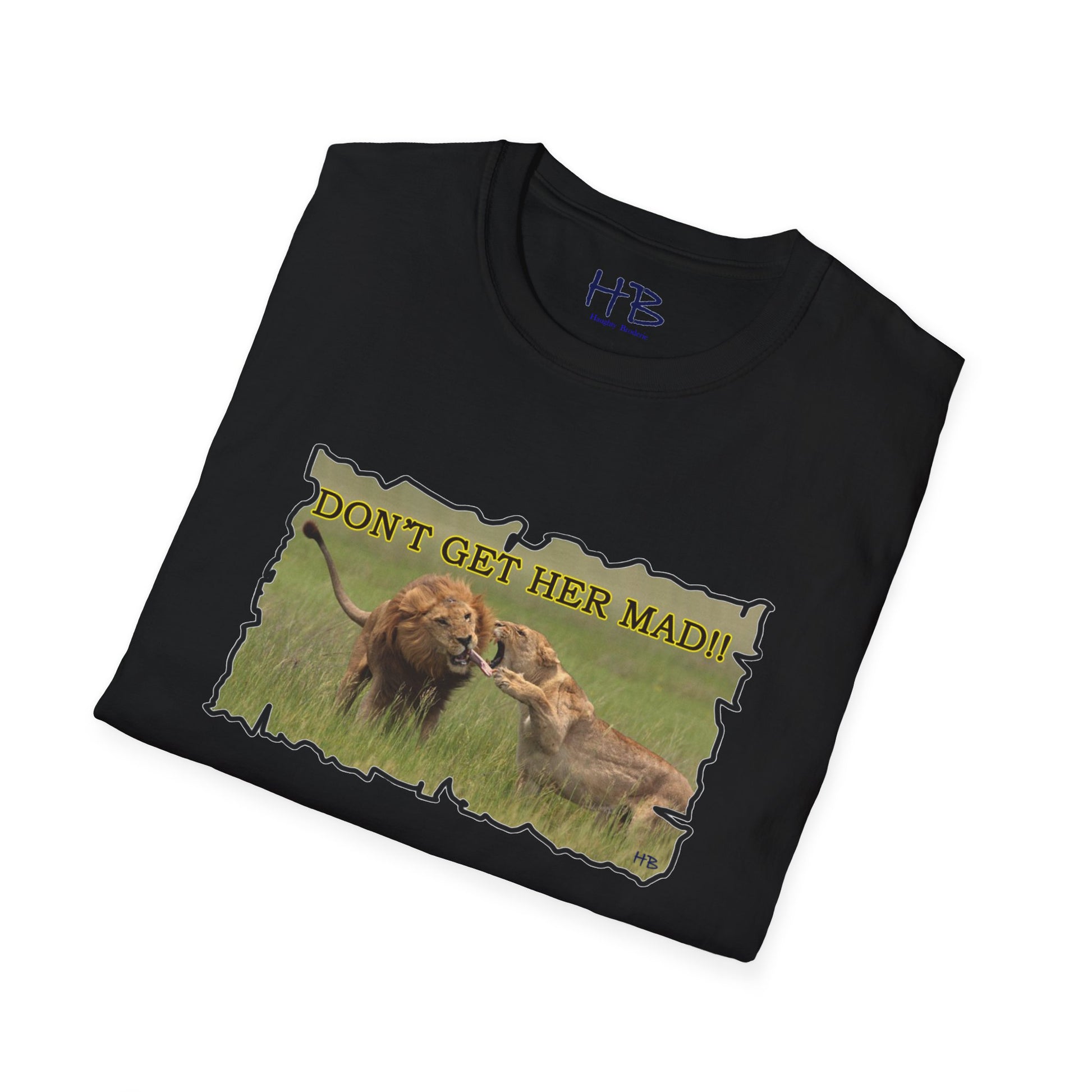 Introducing our "Don't Get Her Mad" tee shirt, designed to showcase the raw power and intensity of the animal kingdom. Featuring a striking image of a lionesse with her teeth bared and face very close to a lion's face, this tee shirt captures the ferocity and courage of these majestic creatures. With her left paw's sharp claws ripping the lion's tongue, the lionesse radiates a commanding presence as the lion howls in agony and pain. This powerful image serves as a warning to anyone who dares to underestimate the strength and determination of women. The bold text, "Don't Get Her Mad," reinforces this message, urging men to think twice before crossing their wives or girlfriends. The lionesse's fierce gaze and sharp claws serve as a reminder of the consequences that can come from angering a woman. This tee shirt is the perfect choice for anyone who wants to make a statement and showcase their own strength and determination. Made from high-quality materials, it is both comfortable and durable, ensuring that it can withstand even the most intense battles. So whether you're facing down your own challenges or simply want to feel powerful and confident, this tee shirt is the perfect choice. With its bold design and powerful message, it is sure to become a wardrobe favorite for anyone who wants to make a statement and embrace their own inner lionesse. "Don't Get Her Mad: Embrace the Strength of Women" Don't mess with her; Beware the wrath of a woman; She's a force to be reckoned with; Don't underestimate her strength; Her roar is louder than yours; Mess with her, and you'll regret it; She's a fierce protector; Don't provoke her anger; Her bite is worse than her bark.