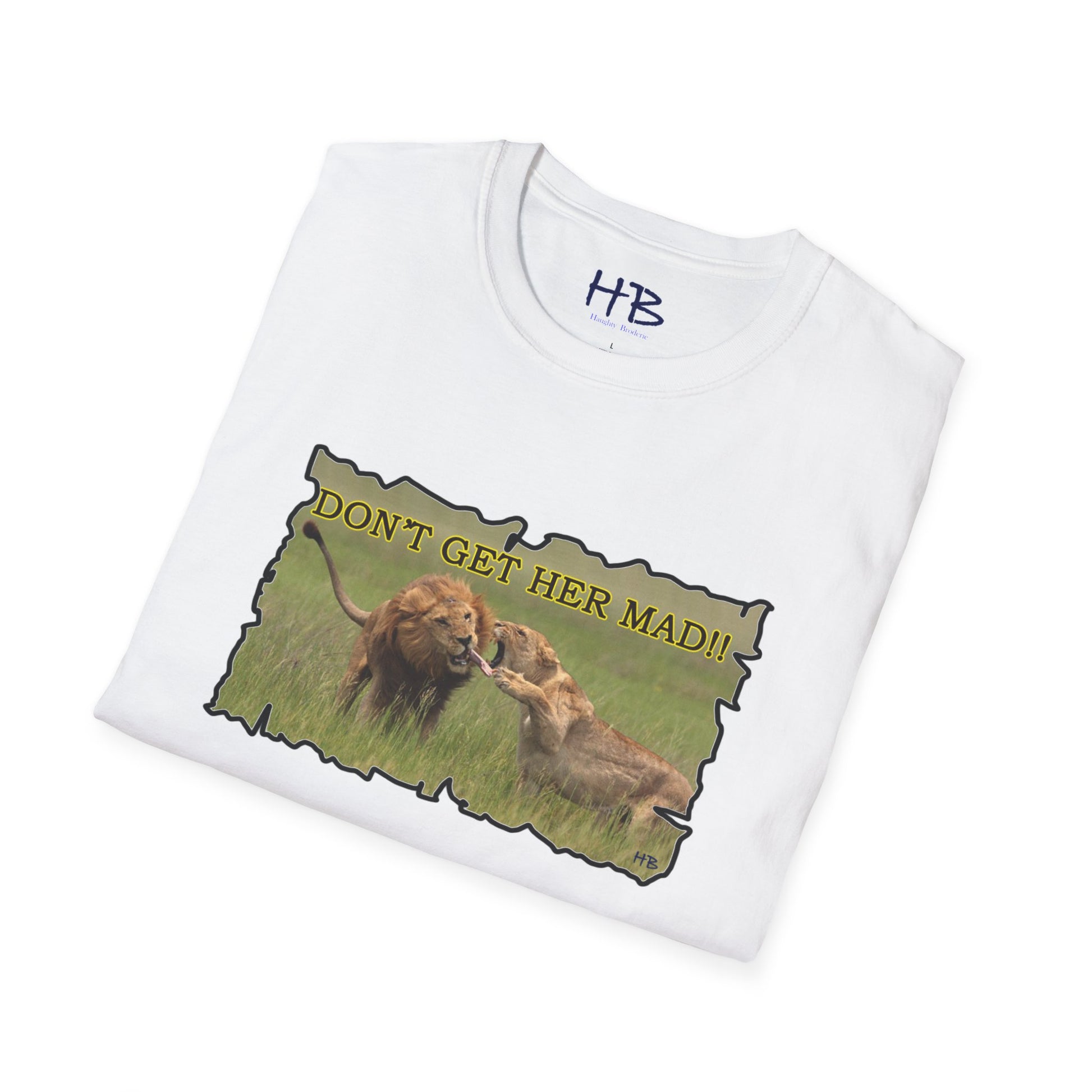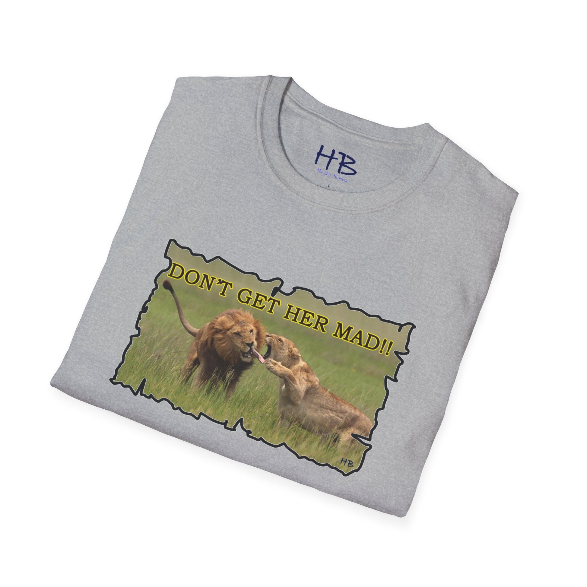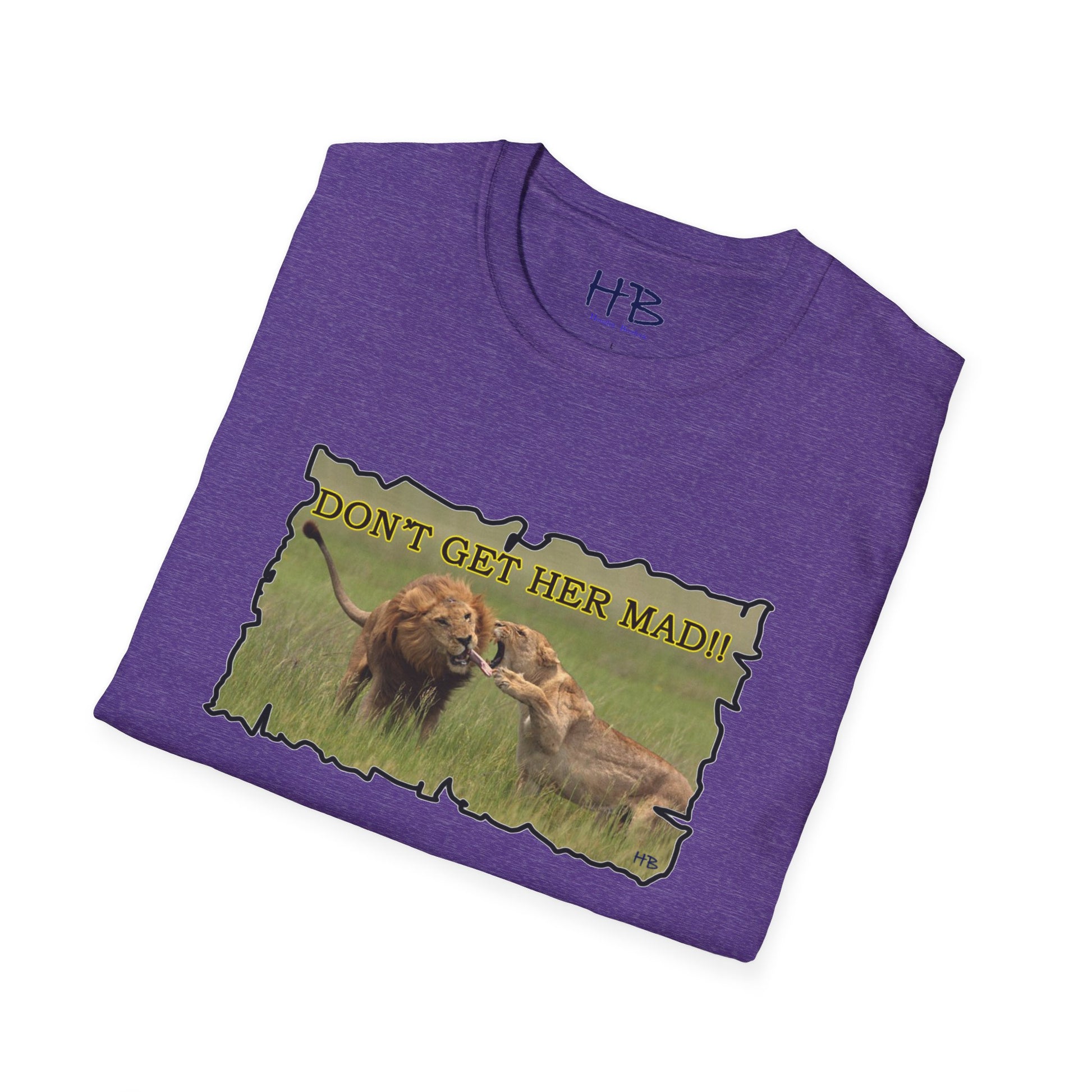 Introducing our "Don't Get Her Mad" tee shirt, designed to showcase the raw power and intensity of the animal kingdom. Featuring a striking image of a lionesse with her teeth bared and face very close to a lion's face, this tee shirt captures the ferocity and courage of these majestic creatures. With her left paw's sharp claws ripping the lion's tongue, the lionesse radiates a commanding presence as the lion howls in agony and pain. This powerful image serves as a warning to anyone who dares to underestimate the strength and determination of women. The bold text, "Don't Get Her Mad," reinforces this message, urging men to think twice before crossing their wives or girlfriends. The lionesse's fierce gaze and sharp claws serve as a reminder of the consequences that can come from angering a woman. This tee shirt is the perfect choice for anyone who wants to make a statement and showcase their own strength and determination. Made from high-quality materials, it is both comfortable and durable, ensuring that it can withstand even the most intense battles. So whether you're facing down your own challenges or simply want to feel powerful and confident, this tee shirt is the perfect choice. With its bold design and powerful message, it is sure to become a wardrobe favorite for anyone who wants to make a statement and embrace their own inner lionesse. "Don't Get Her Mad: Embrace the Strength of Women" Don't mess with her; Beware the wrath of a woman; She's a force to be reckoned with; Don't underestimate her strength; Her roar is louder than yours; Mess with her, and you'll regret it; She's a fierce protector; Don't provoke her anger; Her bite is worse than her bark.