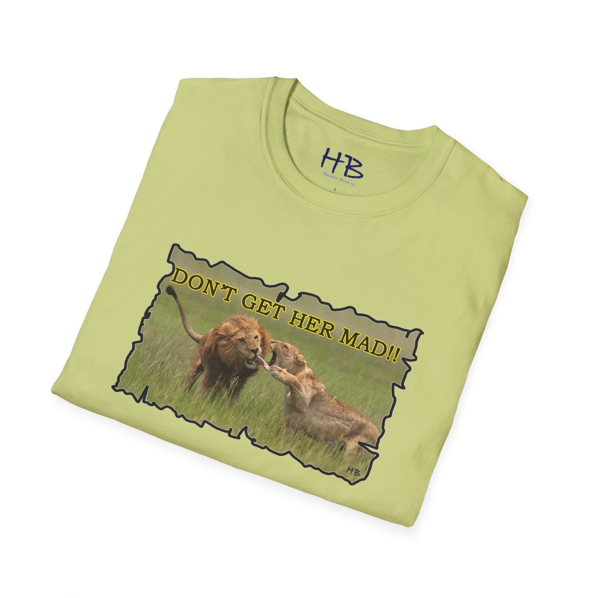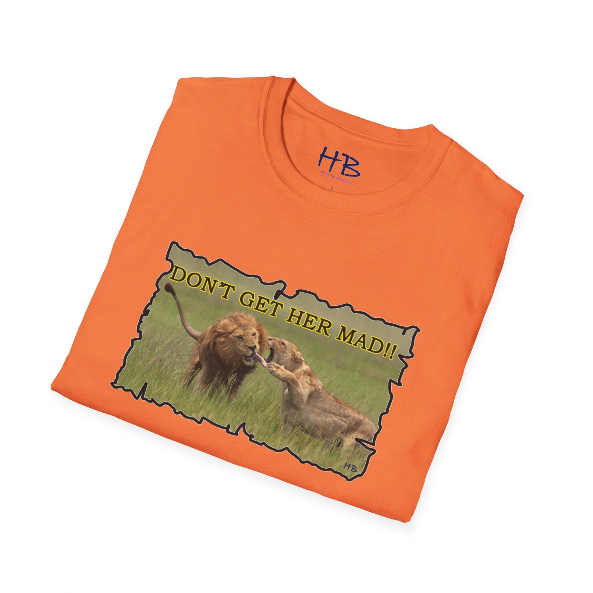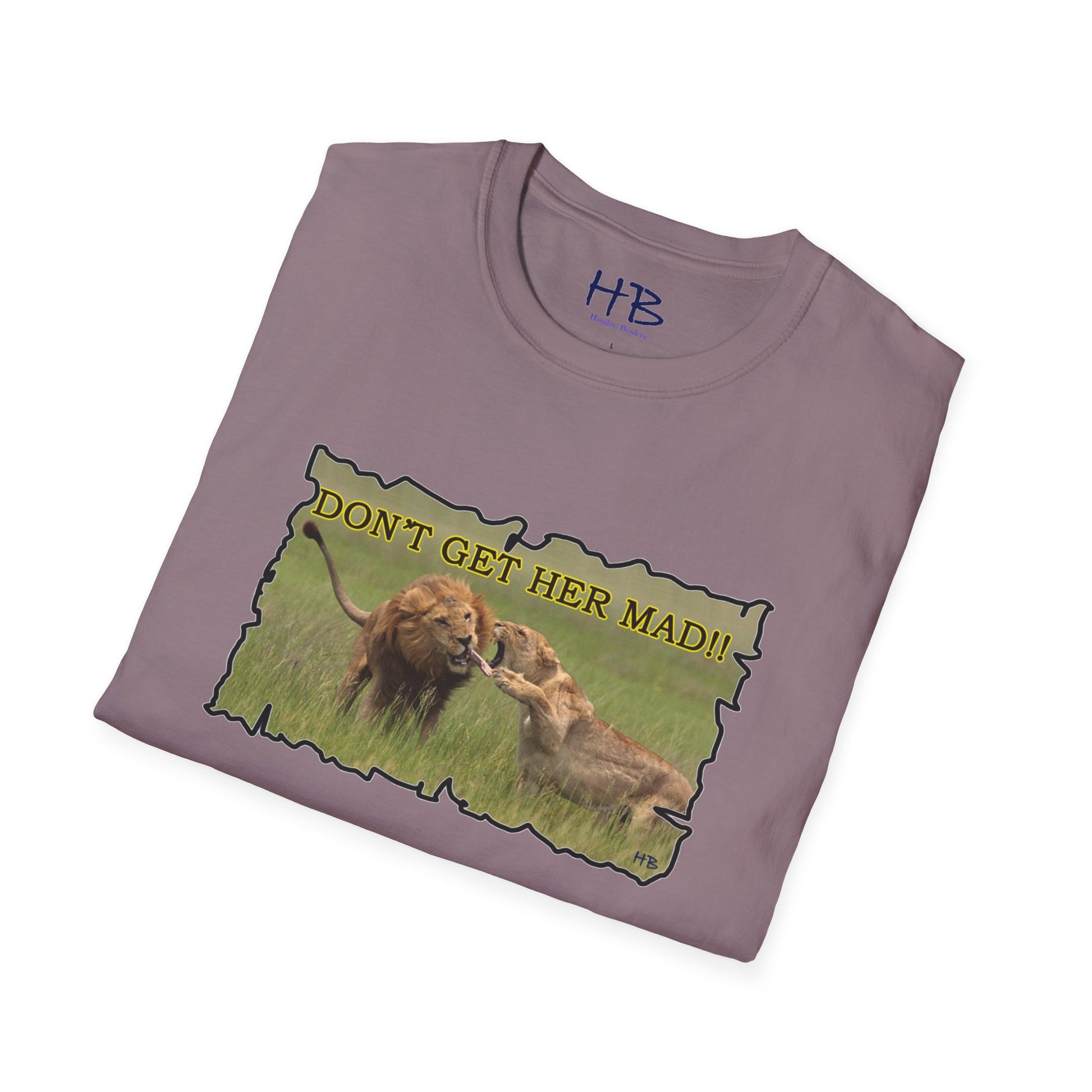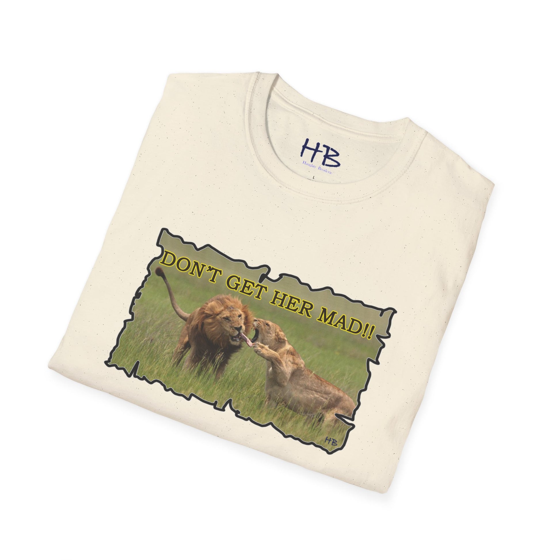Introducing our "Don't Get Her Mad" tee shirt, designed to showcase the raw power and intensity of the animal kingdom. Featuring a striking image of a lionesse with her teeth bared and face very close to a lion's face, this tee shirt captures the ferocity and courage of these majestic creatures. With her left paw's sharp claws ripping the lion's tongue, the lionesse radiates a commanding presence as the lion howls in agony and pain. This powerful image serves as a warning to anyone who dares to underestimate the strength and determination of women. The bold text, "Don't Get Her Mad," reinforces this message, urging men to think twice before crossing their wives or girlfriends. The lionesse's fierce gaze and sharp claws serve as a reminder of the consequences that can come from angering a woman. This tee shirt is the perfect choice for anyone who wants to make a statement and showcase their own strength and determination. Made from high-quality materials, it is both comfortable and durable, ensuring that it can withstand even the most intense battles. So whether you're facing down your own challenges or simply want to feel powerful and confident, this tee shirt is the perfect choice. With its bold design and powerful message, it is sure to become a wardrobe favorite for anyone who wants to make a statement and embrace their own inner lionesse. "Don't Get Her Mad: Embrace the Strength of Women" Don't mess with her; Beware the wrath of a woman; She's a force to be reckoned with; Don't underestimate her strength; Her roar is louder than yours; Mess with her, and you'll regret it; She's a fierce protector; Don't provoke her anger; Her bite is worse than her bark.