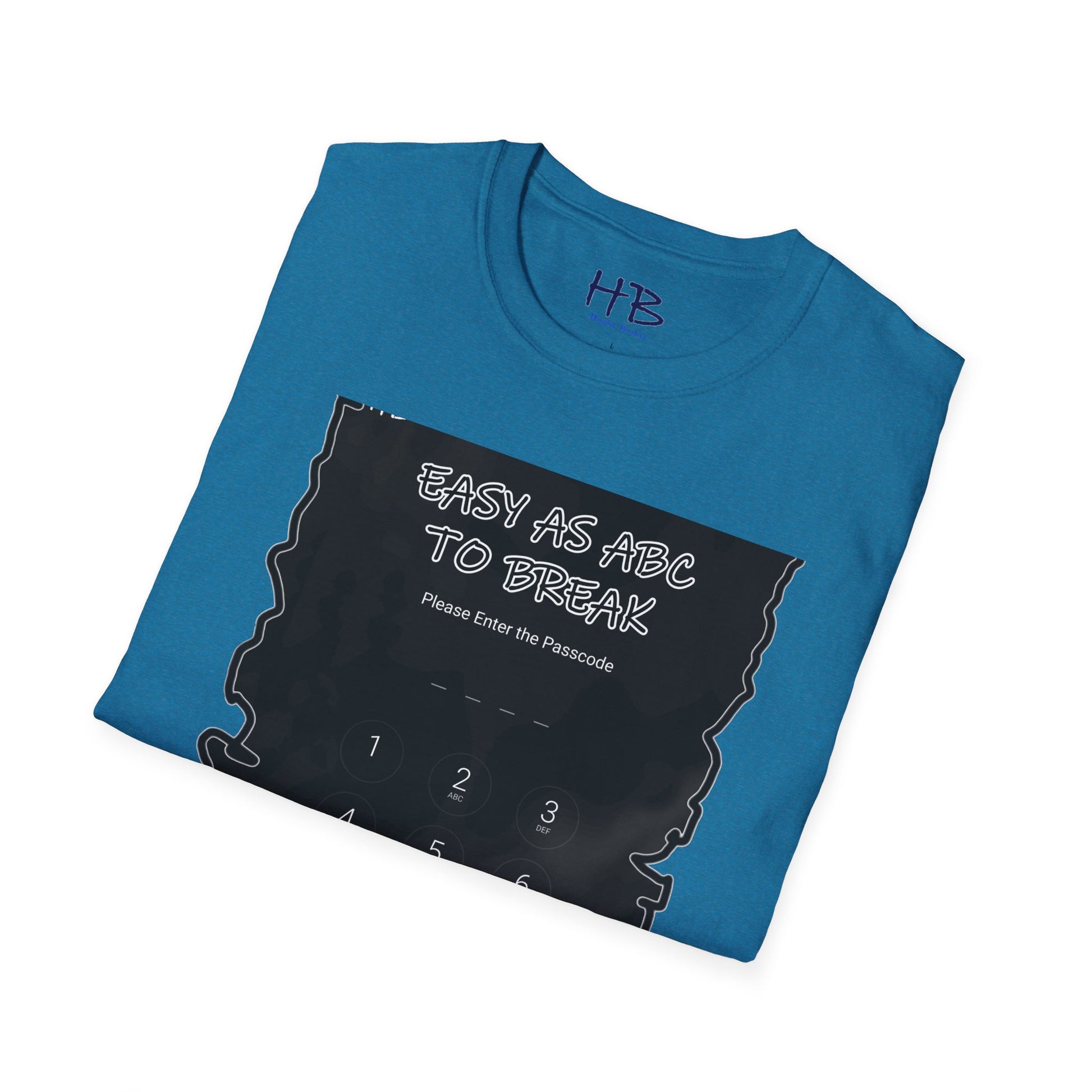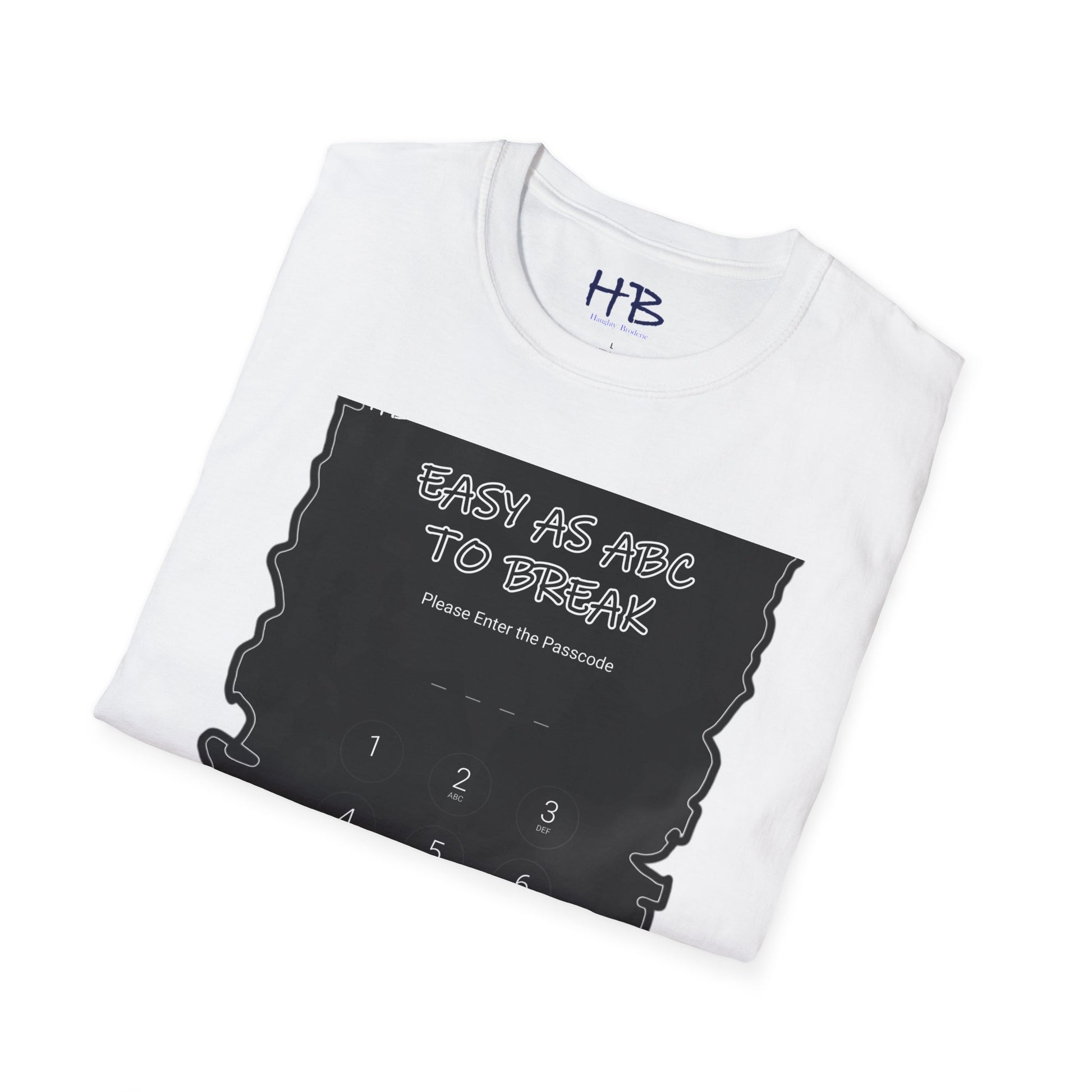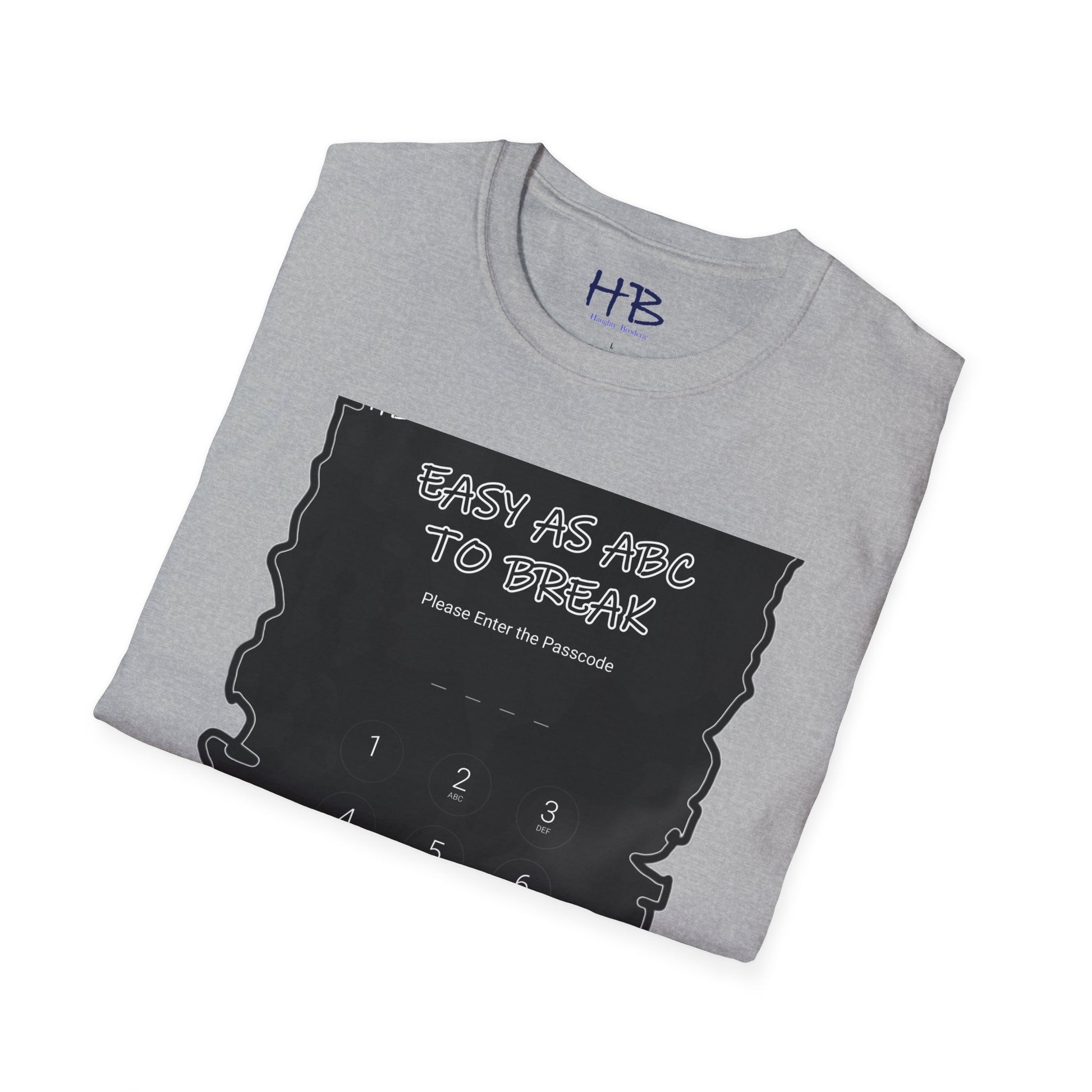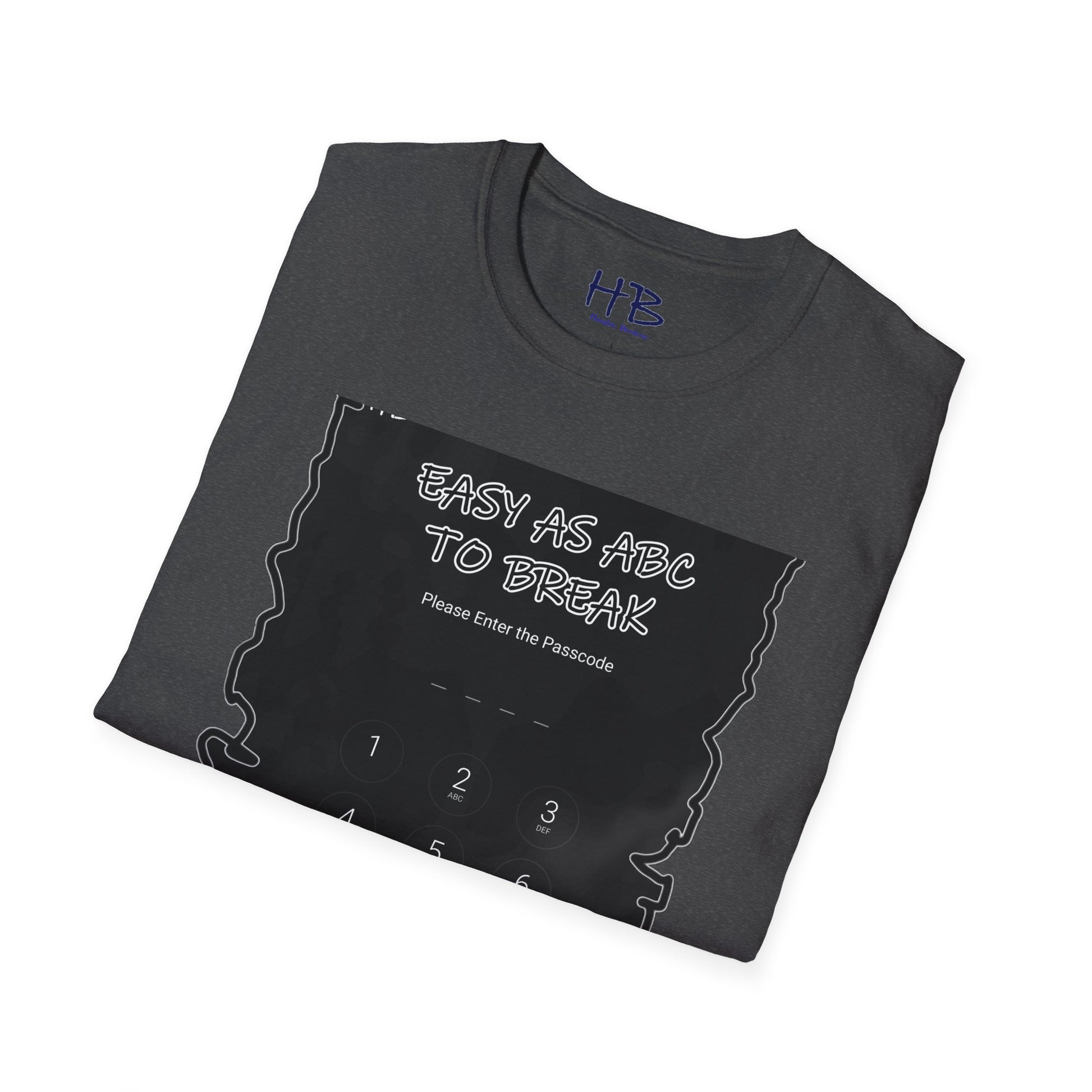 Introducing our "Cipher Harmony" T-shirt, a sartorial symphony that seamlessly melds style and wit. The front and center of this captivating garment feature a dynamic screenshot of a smartphone, its digital veil guarded by a passcode, a gateway to the wearer's unique world. The cleverly crafted text, "Easy as ABC to break," sprawls across the image, an invitation to decipher not just the code but the persona behind it. This shirt is more than fabric and ink; it's a narrative, an emblem of approachability in a digital age.