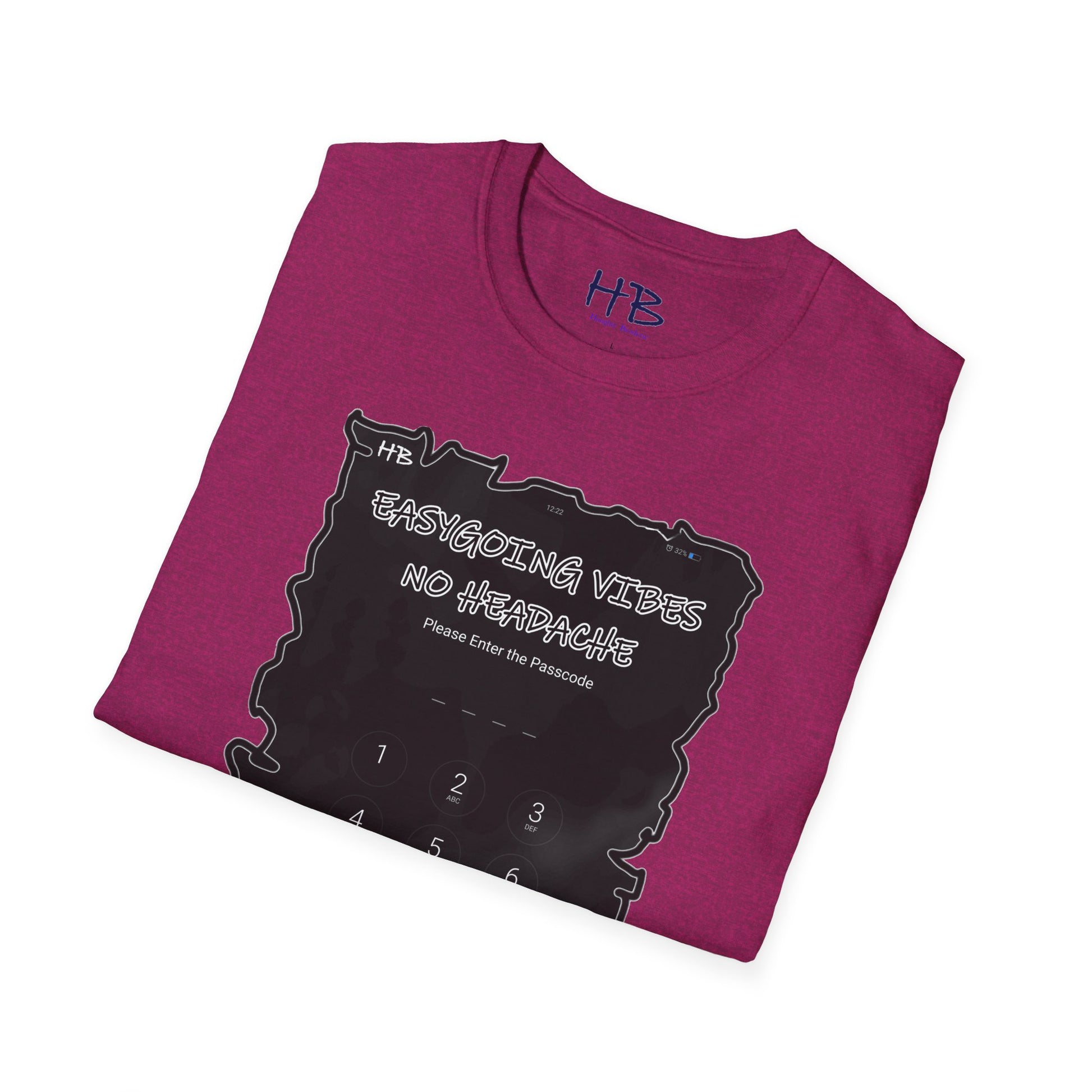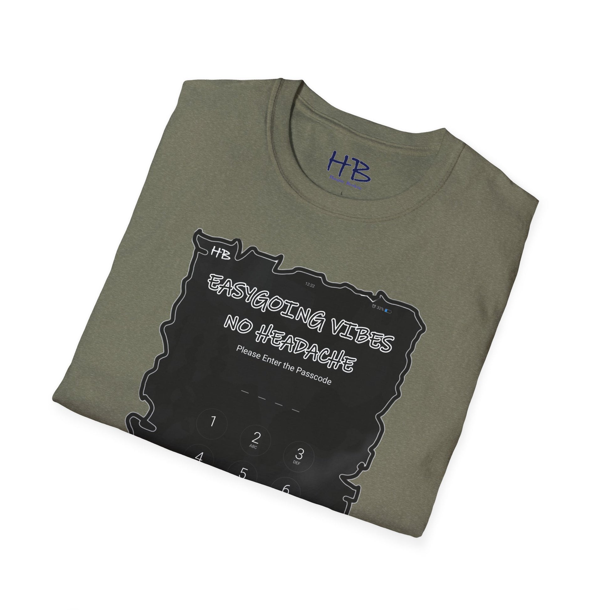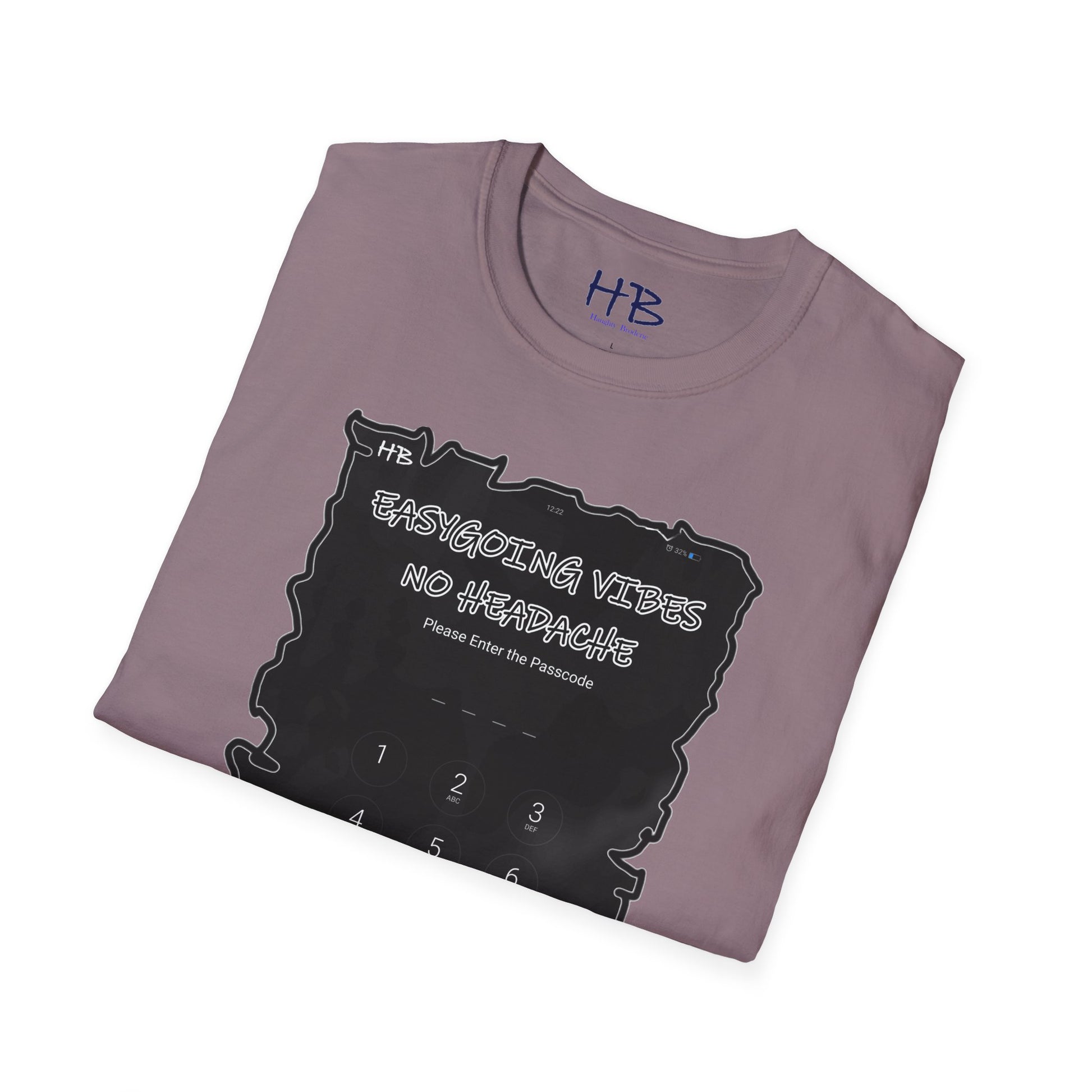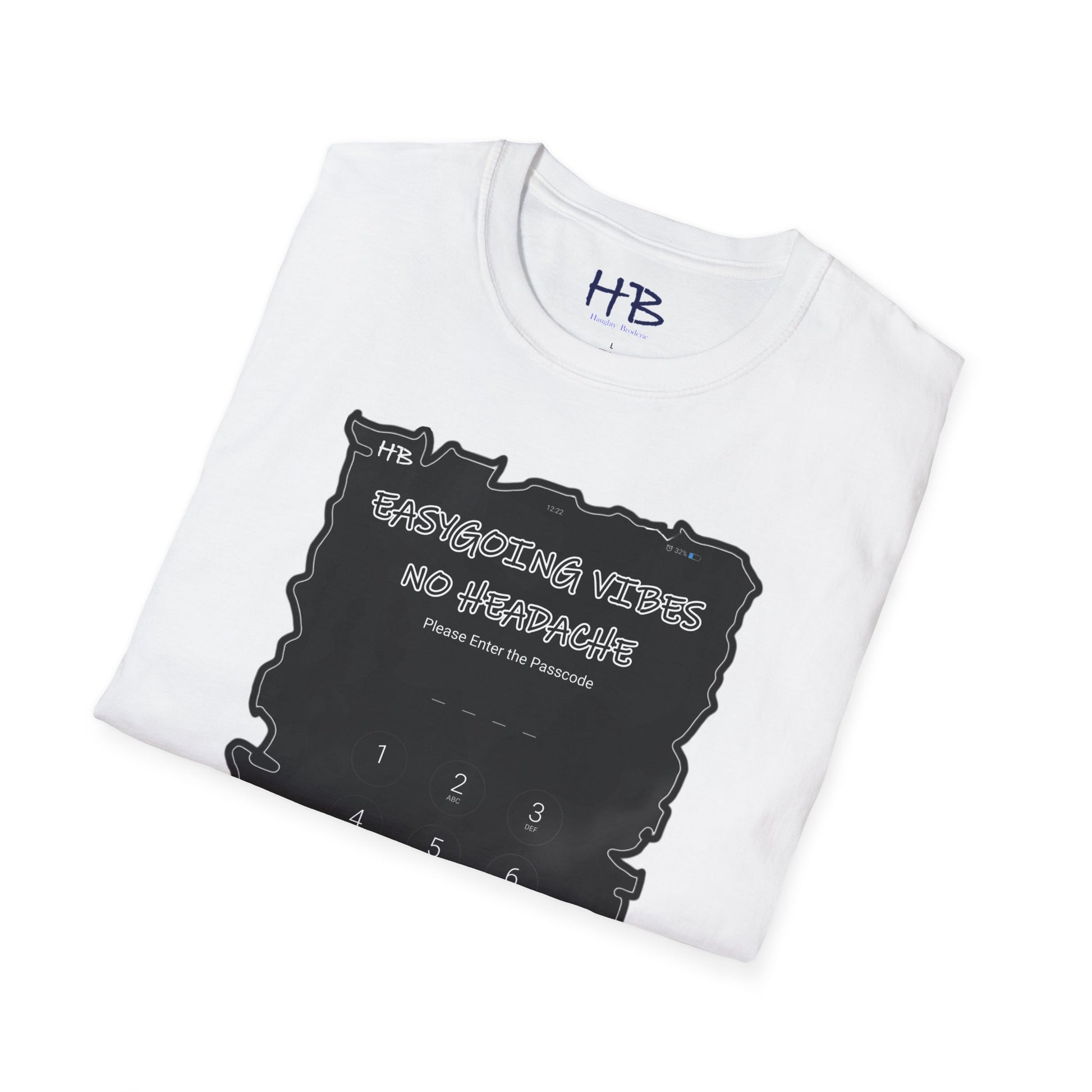 Step into a realm of effortless charm with our Easygoing Vibes T-shirt, a wearable ode to the simplicity of connection in the digital age. The captivating image on this garment is a snapshot of a smartphone screen, a modern-day canvas where the passcode becomes a bridge between privacy and approachability. Unlocking this device reveals the words "EASYGOING VIBES, NO HEADACHE" – a secret code that transcends the digital realm and extends into the real world.