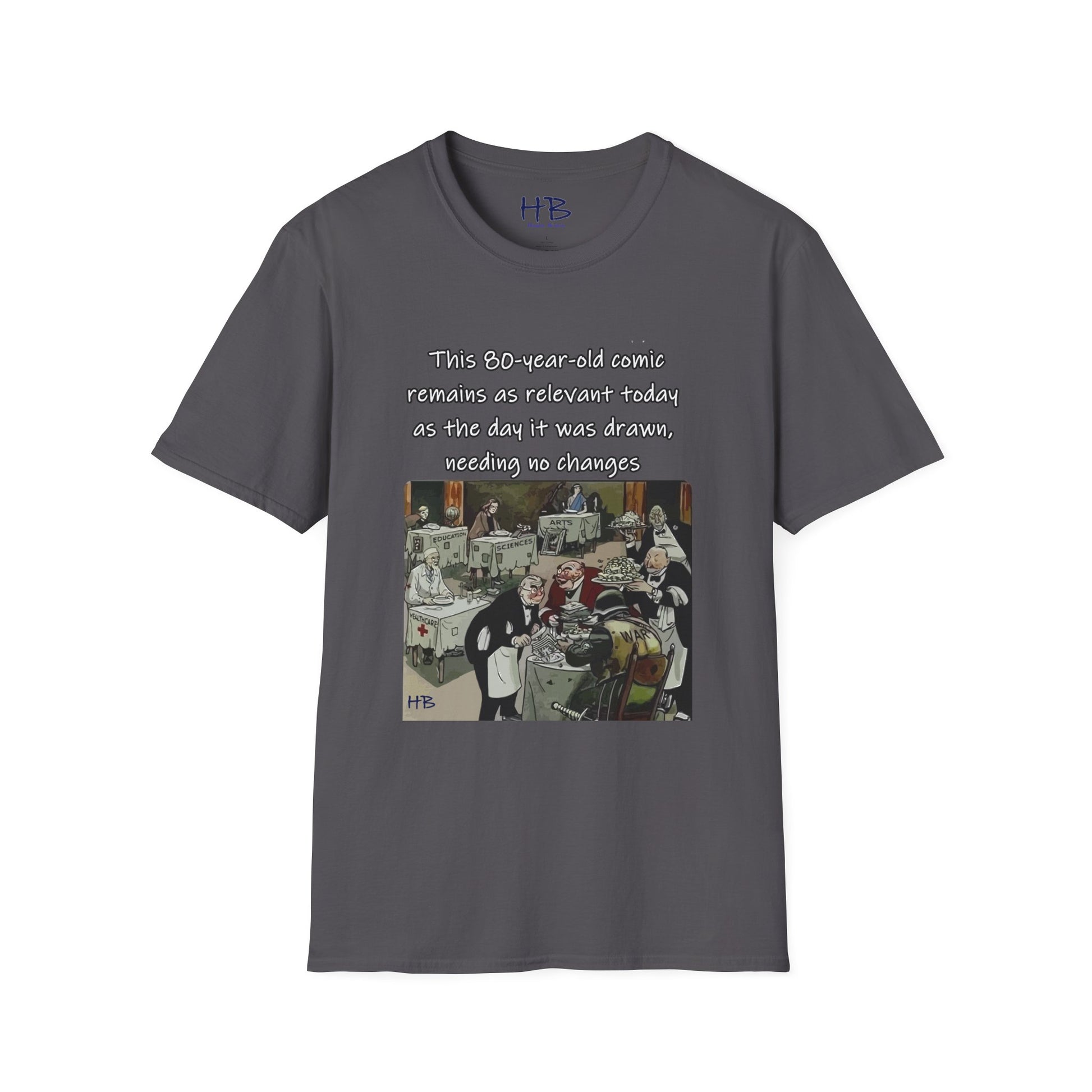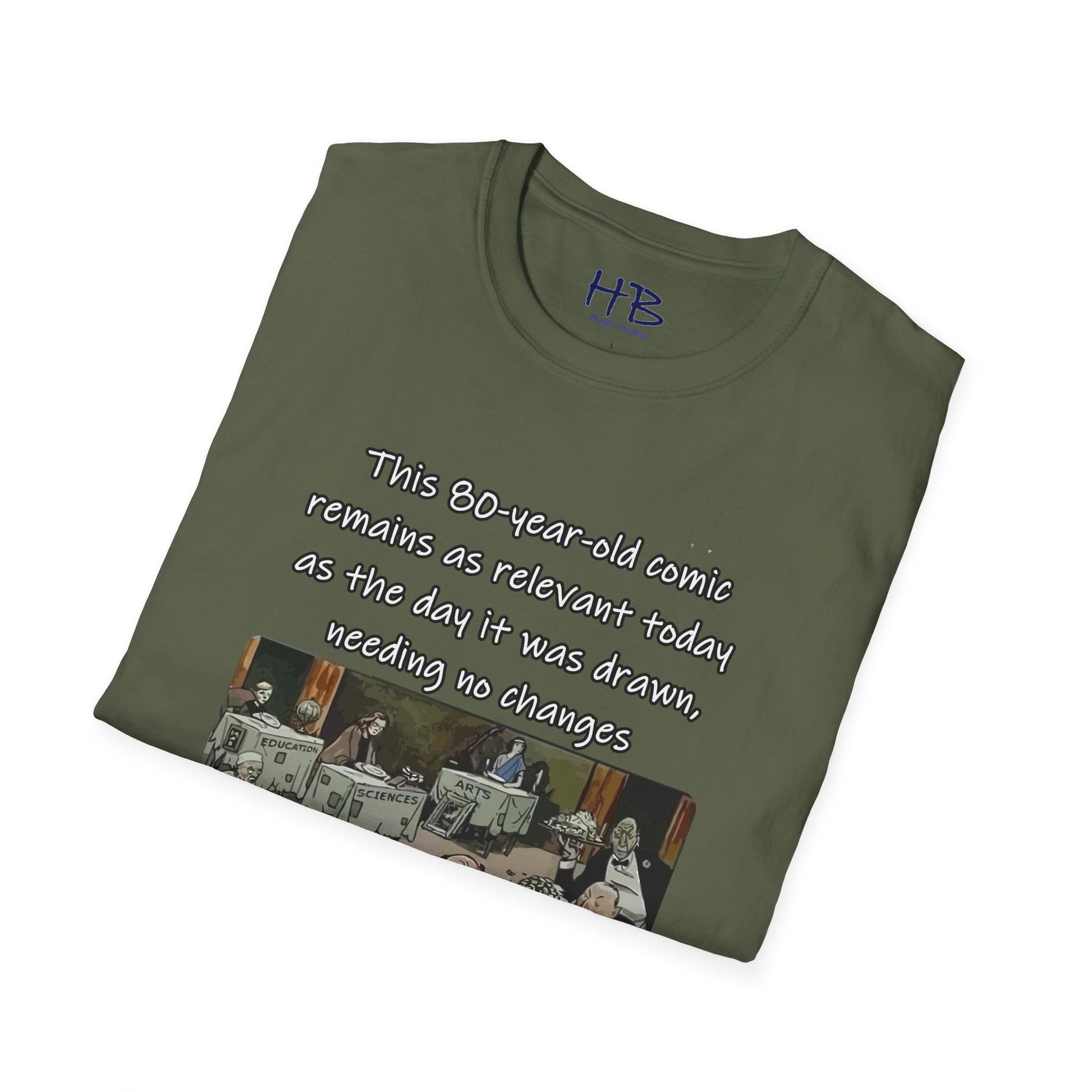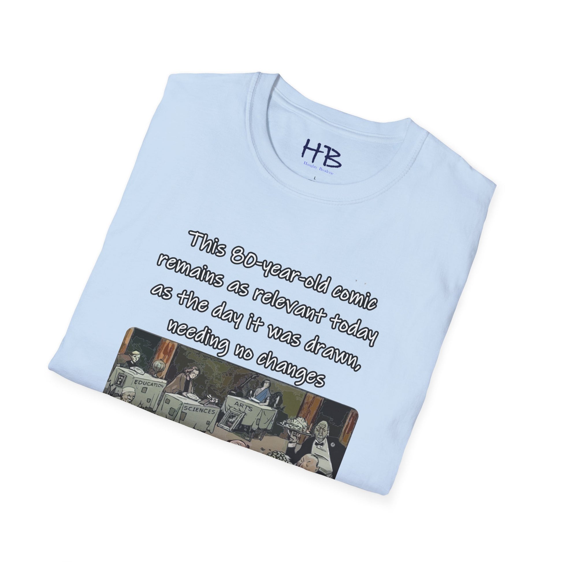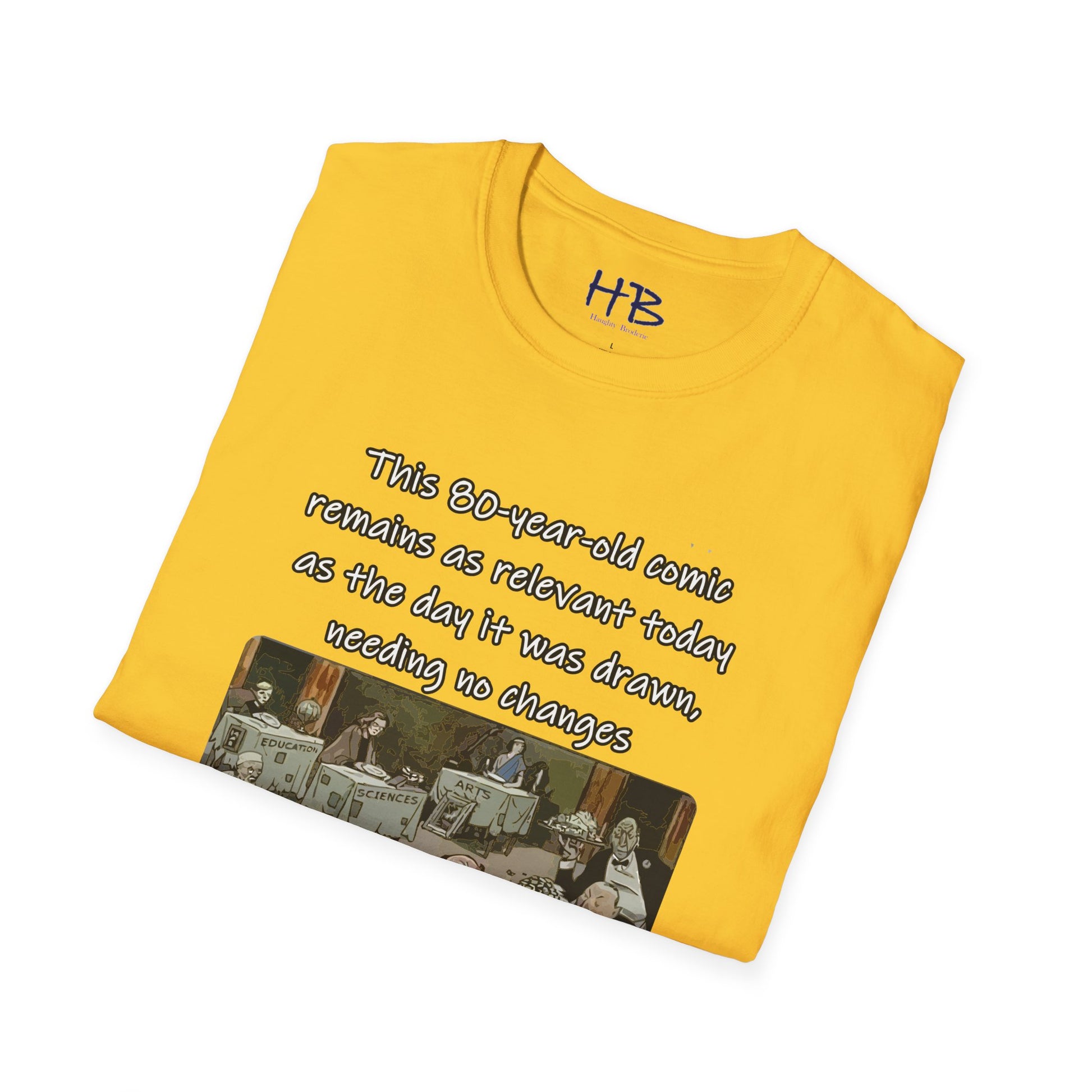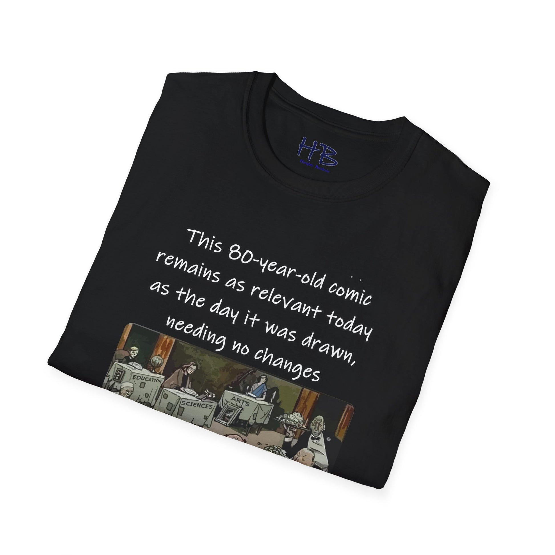 Embark on a sartorial journey that transcends mere fashion with this profound t-shirt, featuring an image that speaks volumes about our contemporary socio-economic landscape. A vintage-inspired illustration, reminiscent of an 80-year-old comic, unfolds a compelling narrative within a bustling restaurant. Five tables, each personifying a societal pillar – Education, Sciences, Art, and Healthcare – stand with empty plates, yearning for the sustenance they deserve.