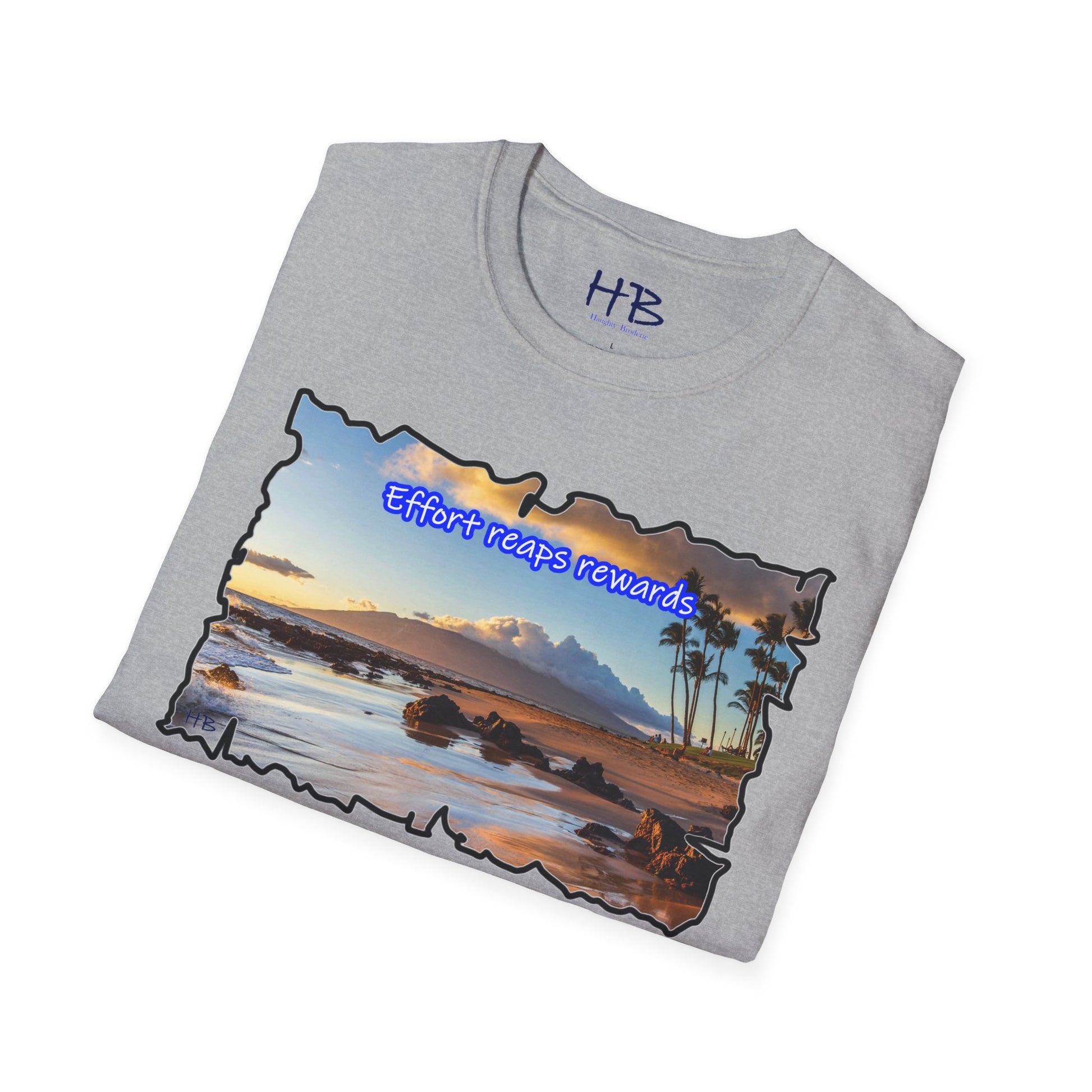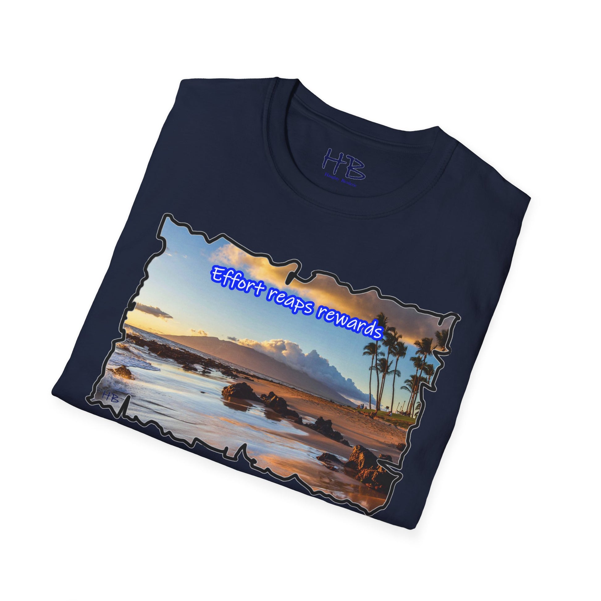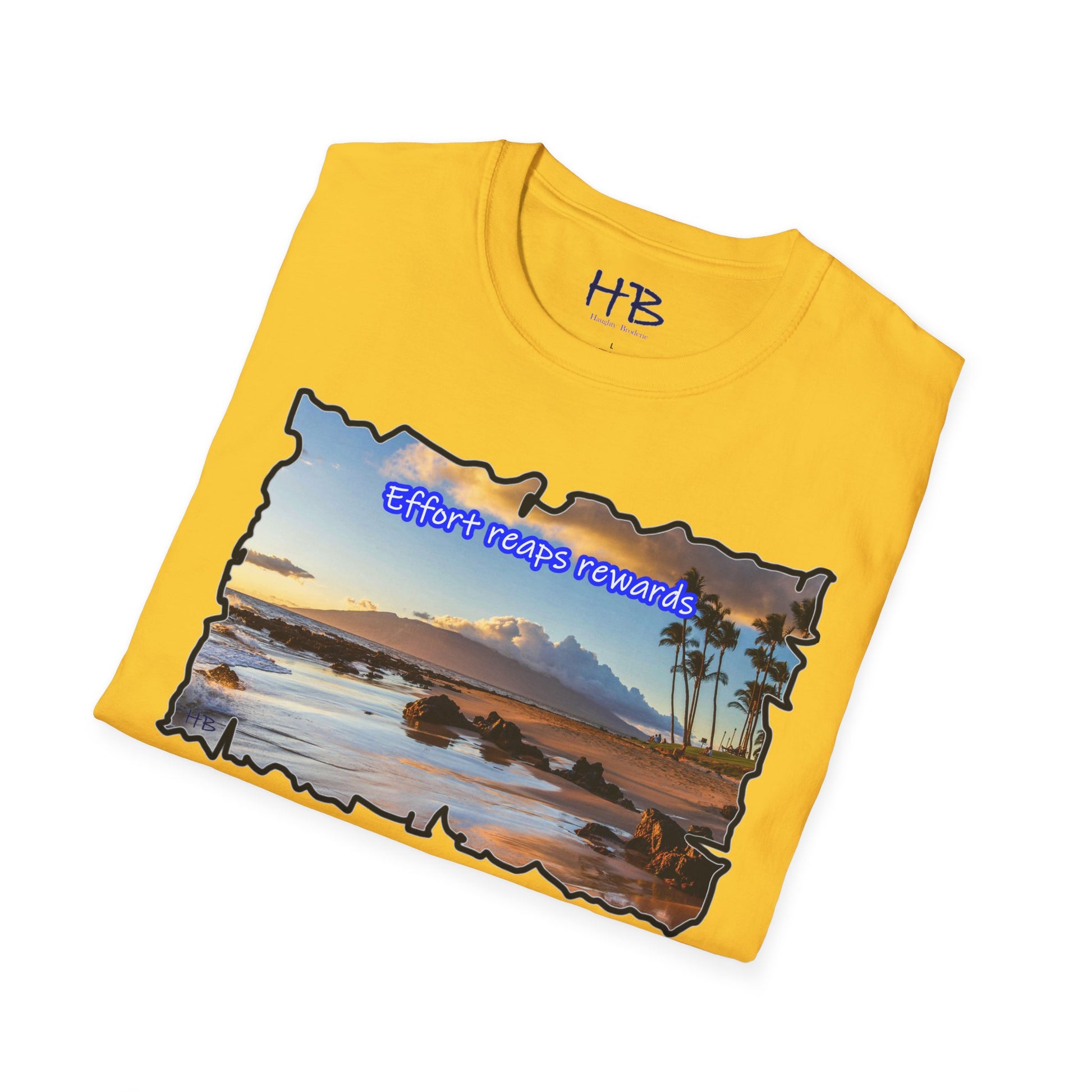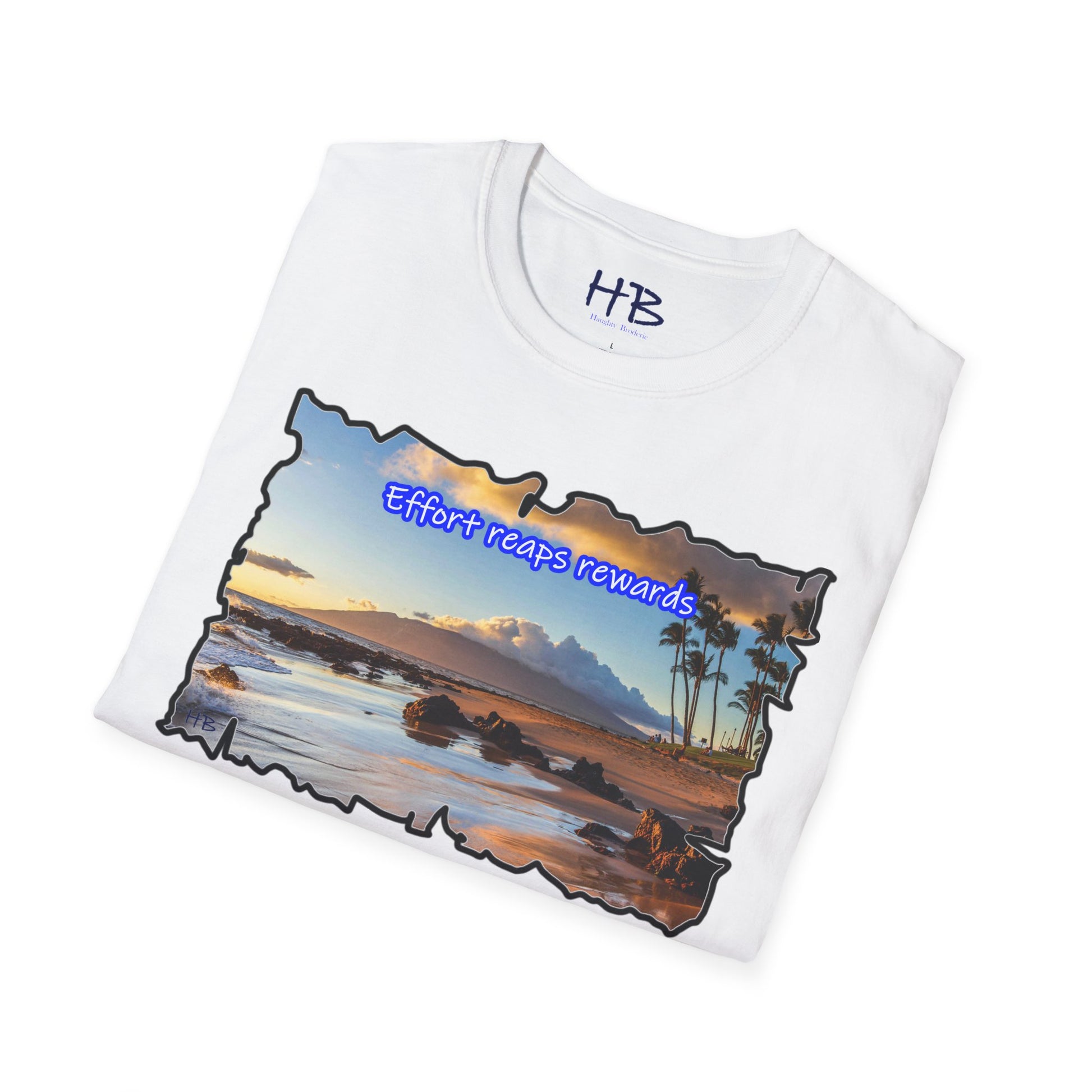 Picture yourself strolling along the shore, waves tenderly caressing the rocks scattered on the sand, creating a harmonious symphony of nature's beauty. The image is not just a feast for the eyes; it's a visual testament to the phrase proudly emblazoned across this extraordinary piece: "Effort reaps rewards." A reminder that hard work yields the ultimate prize—an idyllic island escape where the toil of the year transforms into a well-deserved vacation paradise.